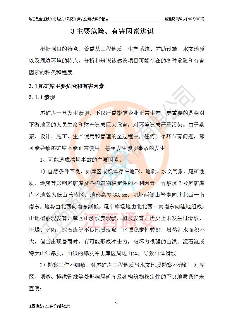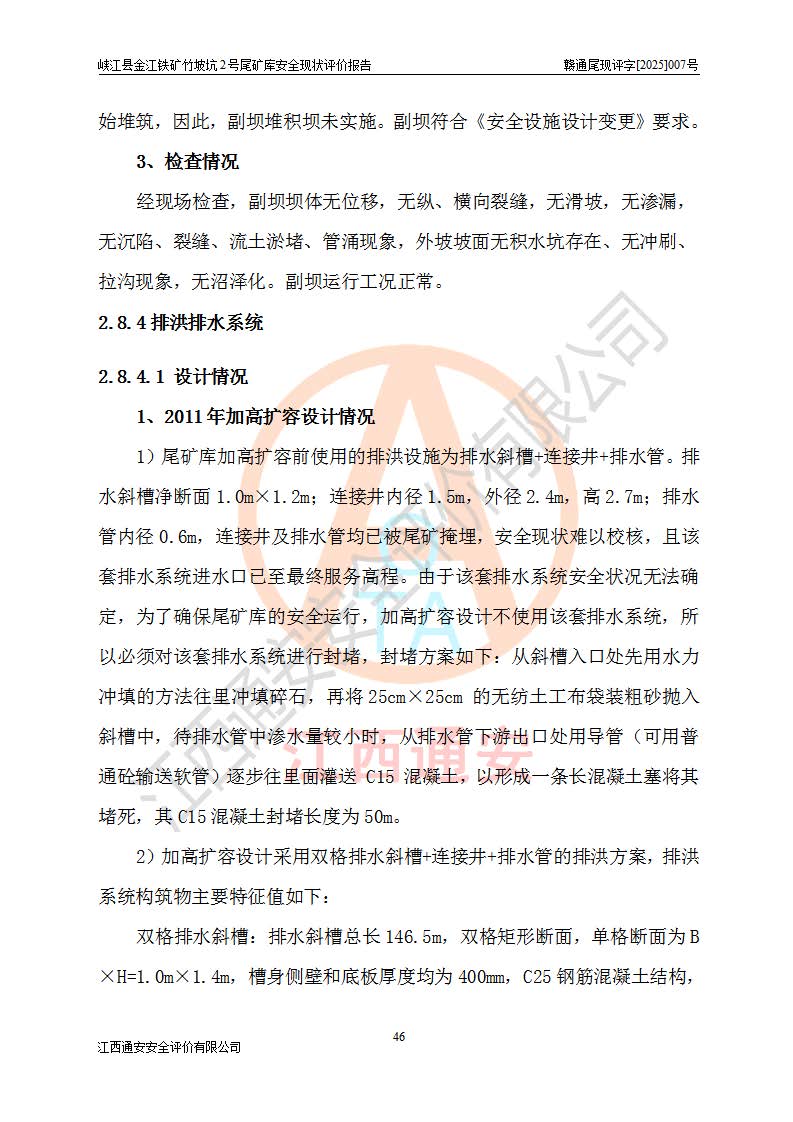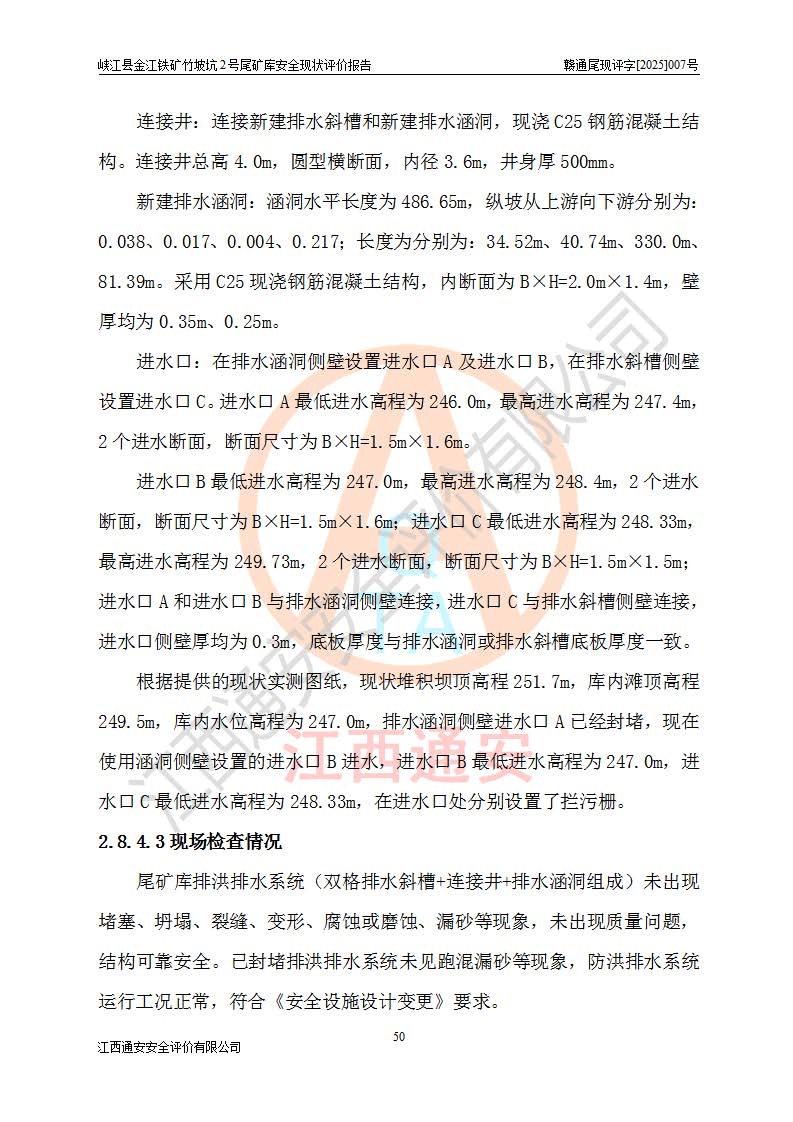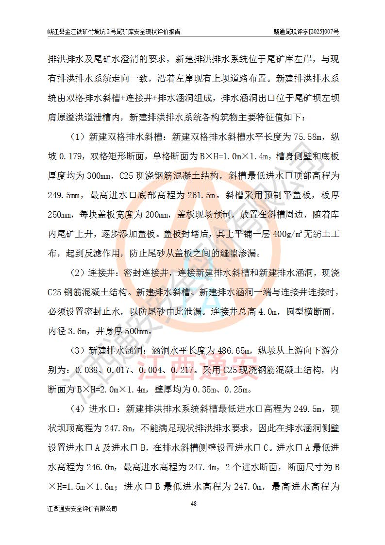 项目简介 | 峡江县金江铁矿成立于2004年5月9日,投资人为汪润生,为个人独资企业,住所为江西省吉安市峡江县金江乡黑虎村委二龙山,经营范围为铁矿露天/地下开采,铁精粉加工销售,废石尾砂加工销售。竹坡坑2号尾矿库位于峡江县金江乡黑虎村,靠近新余市与峡江县交界处,距峡江县城直线距离43**,距新余市良山镇直线距离8**,现状尾矿坝坝顶中部地理坐标:北纬X:27°35′47.96″,东经Y:114°53′41.06″,有公路相通市内外,交通方便。 峡江县金江铁矿竹坡坑2号尾矿库原设计尾矿坝为碾压土坝,采用风化土料一次性筑坝,总坝高26.0m,顶宽6.0m,坝顶高程为237.1m,坝轴线长94.5m,尾矿库库容为49.8×104m3。 2011年江西省冶金设计院有限责任公司对竹坡坑2号尾矿库进行加高扩容设计,2018年由原设计单位江西省冶金设计院有限责任公司对峡江县金江铁矿竹坡坑2号尾矿库加高扩容安全设施进行了设计变更。设计变更后竹坡坑2号尾矿库*终坝顶高程为263.0m,总坝高51.9m,尾矿库总库容为184.20×104m3,尾矿库为四等库。排洪系统采用双格斜槽+连接井+排水涵洞。 峡江县金江铁矿竹坡坑2号尾矿库于2022年5月20日取得江西省应急管理厅颁发的安全生产许可证,证书编号(赣)FM安许证字[2022]M1815号,有限期从2022年5月20日到2025年5月19日,为三年期。依照《非煤矿矿山企业安全生产许可证延期换证工作》的通知,根据***《安全生产许可证条例》、《江西省安全生产条例》、《非煤矿山安全生产许可证实施办法》、《江西省非煤矿矿山企业安全生产许可证办法》等规定的要求,受峡江县金江铁矿委托,我公司承担了竹坡坑2号尾矿库延期换证安全现状评价工作。 | |||