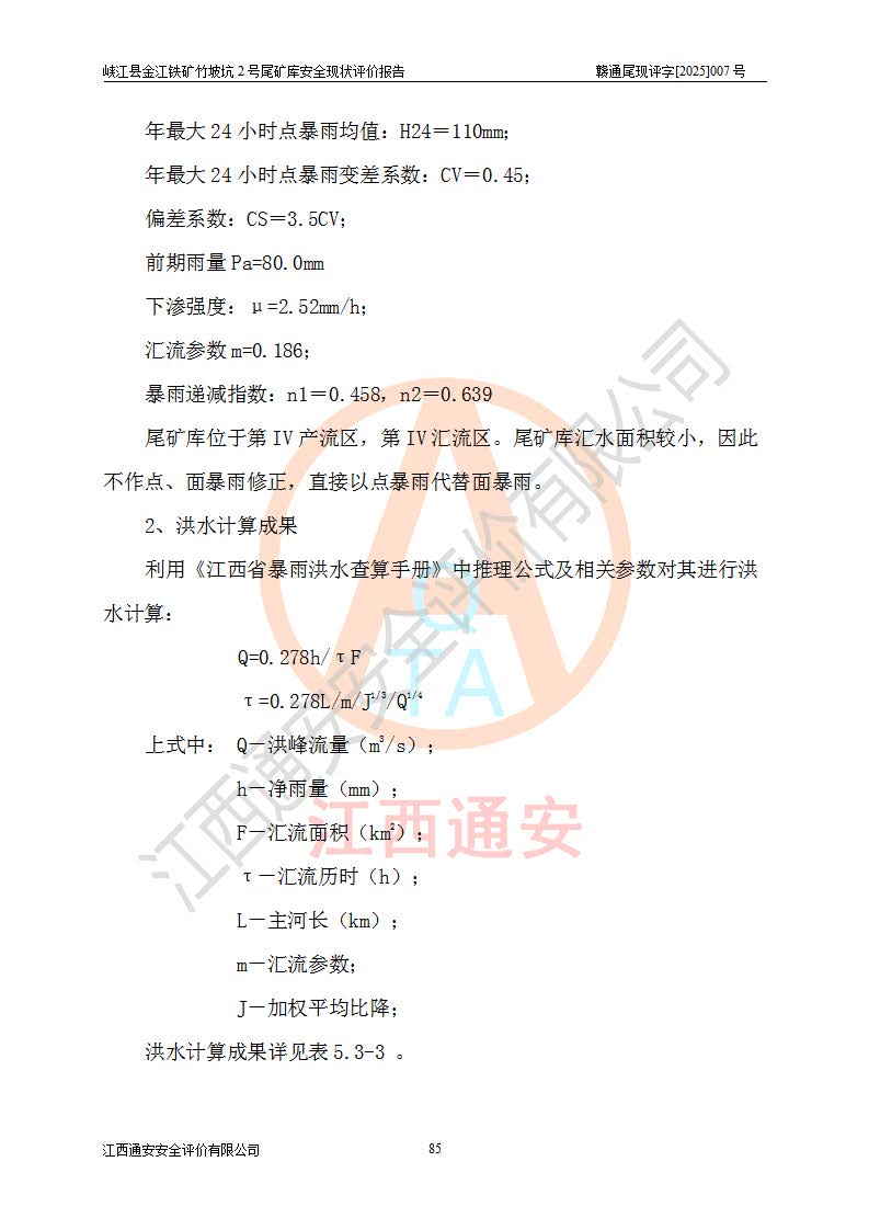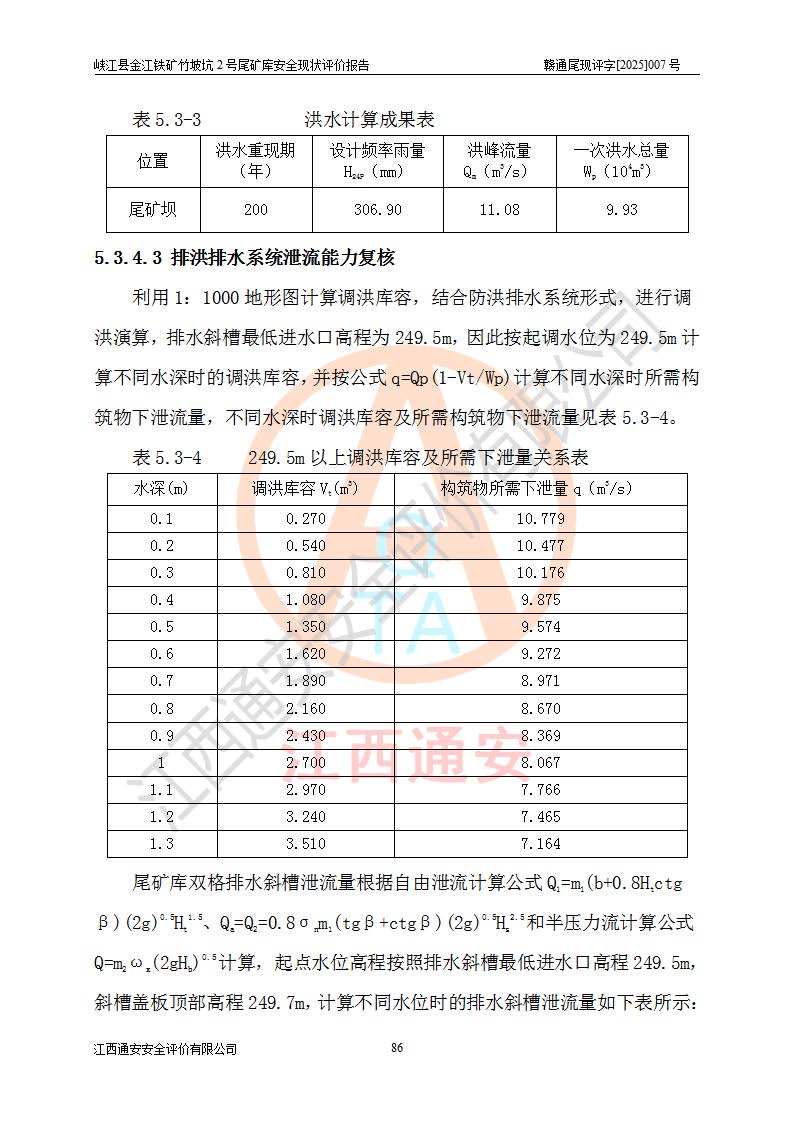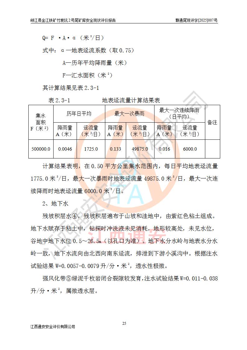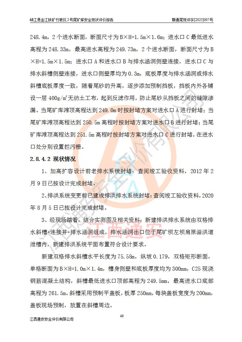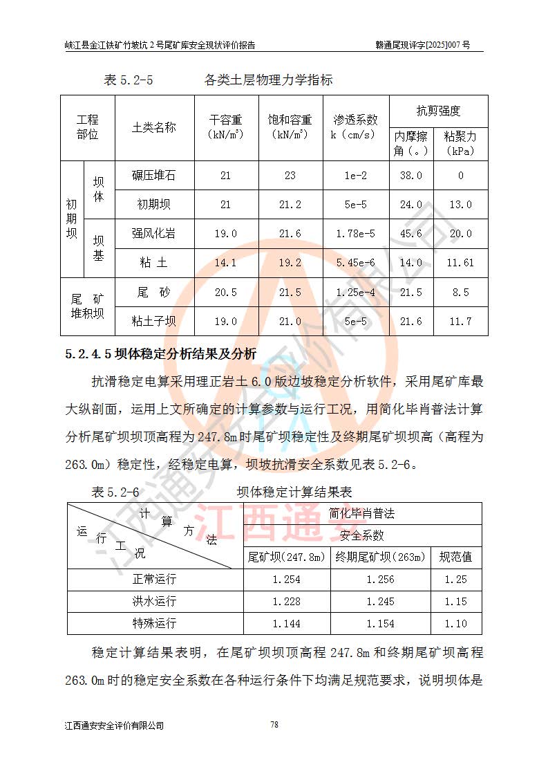 项目简介 | 峡江县金江铁矿成立于2004年5月9日,投资人为汪润生,为个人独资企业,住所为江西省吉安市峡江县金江乡黑虎村委二龙山,经营范围为铁矿露天/地下开采,铁精粉加工销售,废石尾砂加工销售。竹坡坑2号尾矿库位于峡江县金江乡黑虎村,靠近新余市与峡江县交界处,距峡江县城直线距离43**,距新余市良山镇直线距离8**,现状尾矿坝坝顶中部地理坐标:北纬X:27°35′47.96″,东经Y:114°53′41.06″,有公路相通市内外,交通方便。 峡江县金江铁矿竹坡坑2号尾矿库原设计尾矿坝为碾压土坝,采用风化土料一次性筑坝,总坝高26.0m,顶宽6.0m,坝顶高程为237.1m,坝轴线长94.5m,尾矿库库容为49.8×104m3。 2011年江西省冶金设计院有限责任公司对竹坡坑2号尾矿库进行加高扩容设计,2018年由原设计单位江西省冶金设计院有限责任公司对峡江县金江铁矿竹坡坑2号尾矿库加高扩容安全设施进行了设计变更。设计变更后竹坡坑2号尾矿库*终坝顶高程为263.0m,总坝高51.9m,尾矿库总库容为184.20×104m3,尾矿库为四等库。排洪系统采用双格斜槽+连接井+排水涵洞。 峡江县金江铁矿竹坡坑2号尾矿库于2022年5月20日取得江西省应急管理厅颁发的安全生产许可证,证书编号(赣)FM安许证字[2022]M1815号,有限期从2022年5月20日到2025年5月19日,为三年期。依照《非煤矿矿山企业安全生产许可证延期换证工作》的通知,根据***《安全生产许可证条例》、《江西省安全生产条例》、《非煤矿山安全生产许可证实施办法》、《江西省非煤矿矿山企业安全生产许可证办法》等规定的要求,受峡江县金江铁矿委托,我公司承担了竹坡坑2号尾矿库延期换证安全现状评价工作。 | |||