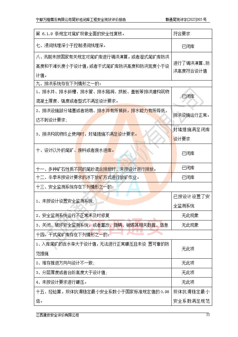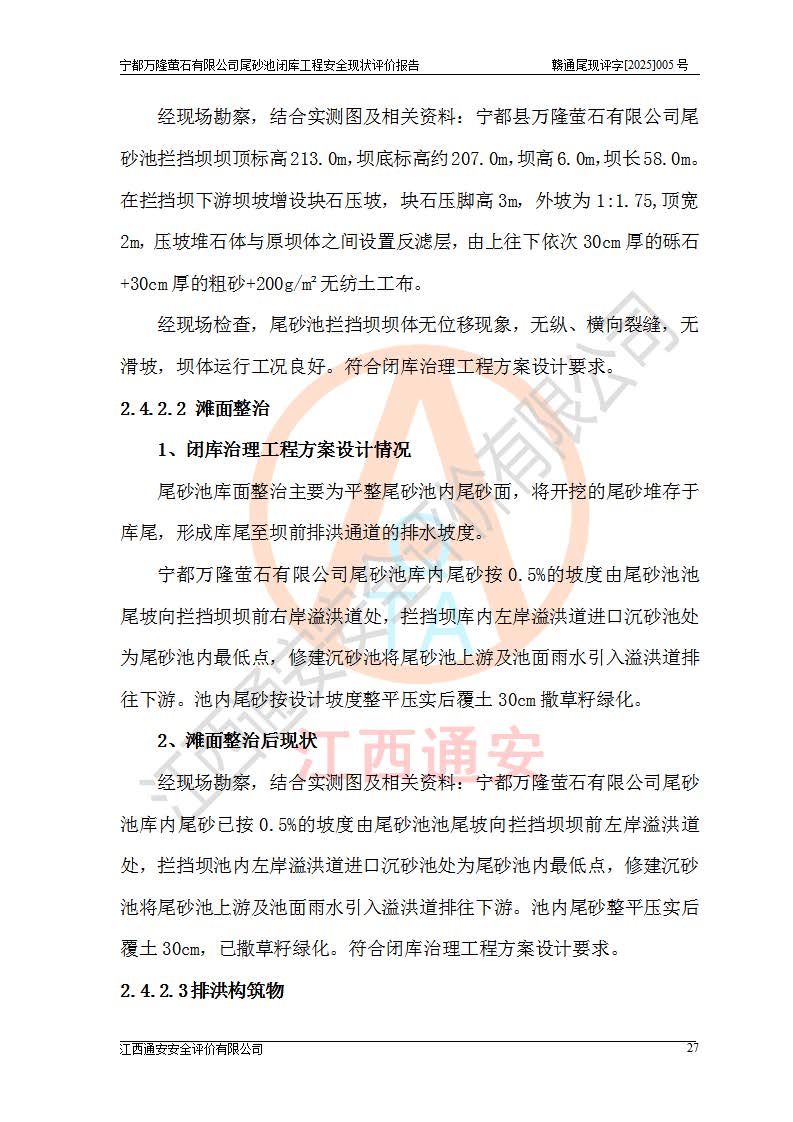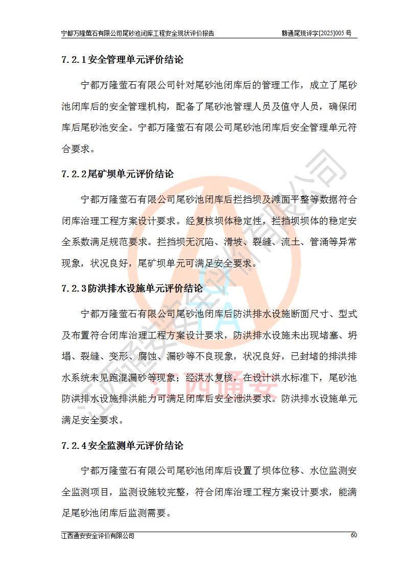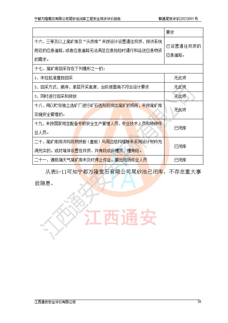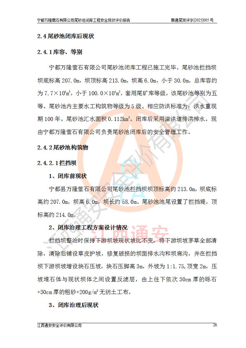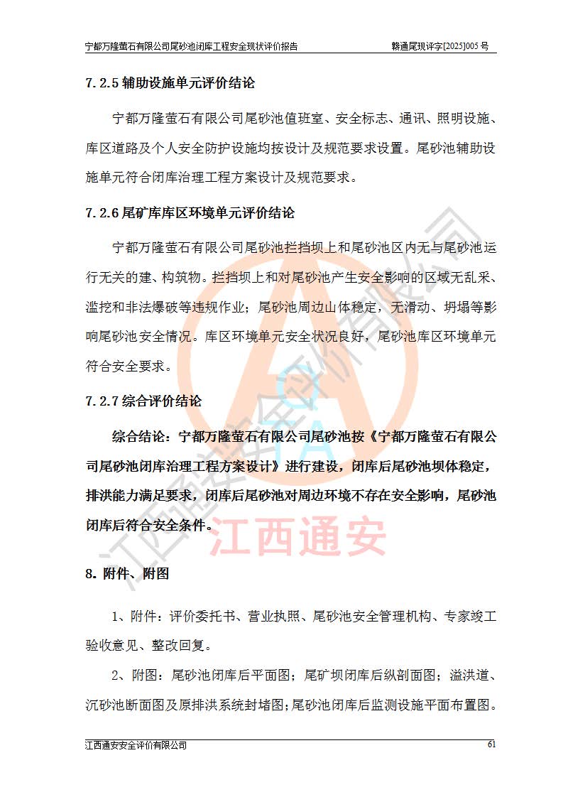 评价结论 | 宁都万隆萤石有限公司尾砂池按《宁都万隆萤石有限公司尾砂池闭库治理工程方案设计》进行建设,闭库后尾砂池坝体稳定,排洪能力满足要求,闭库后尾砂池对周边环境不存在安全影响,尾砂池闭库后符合安全条件。 | |||
