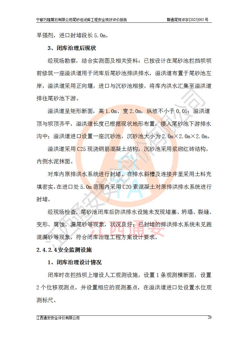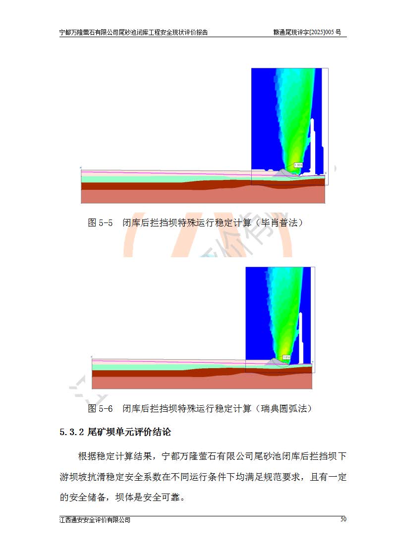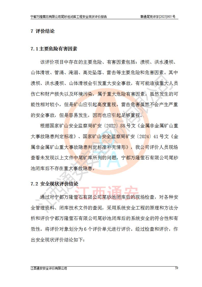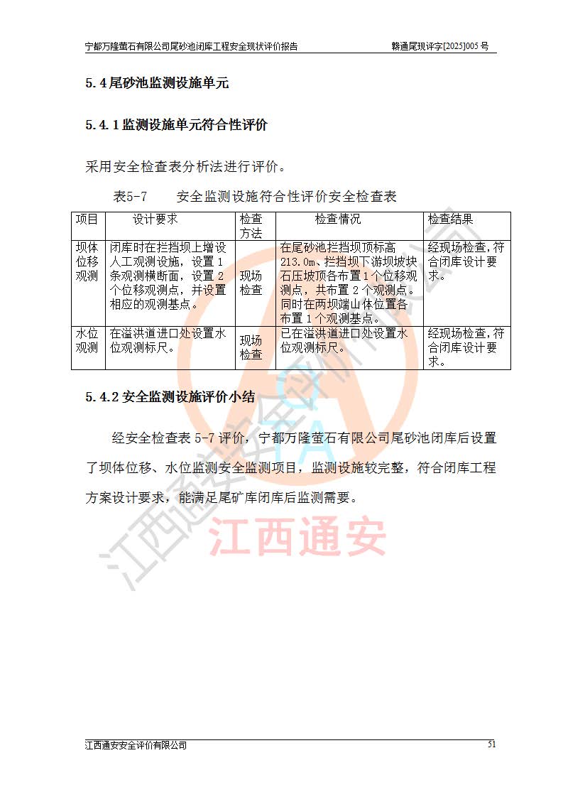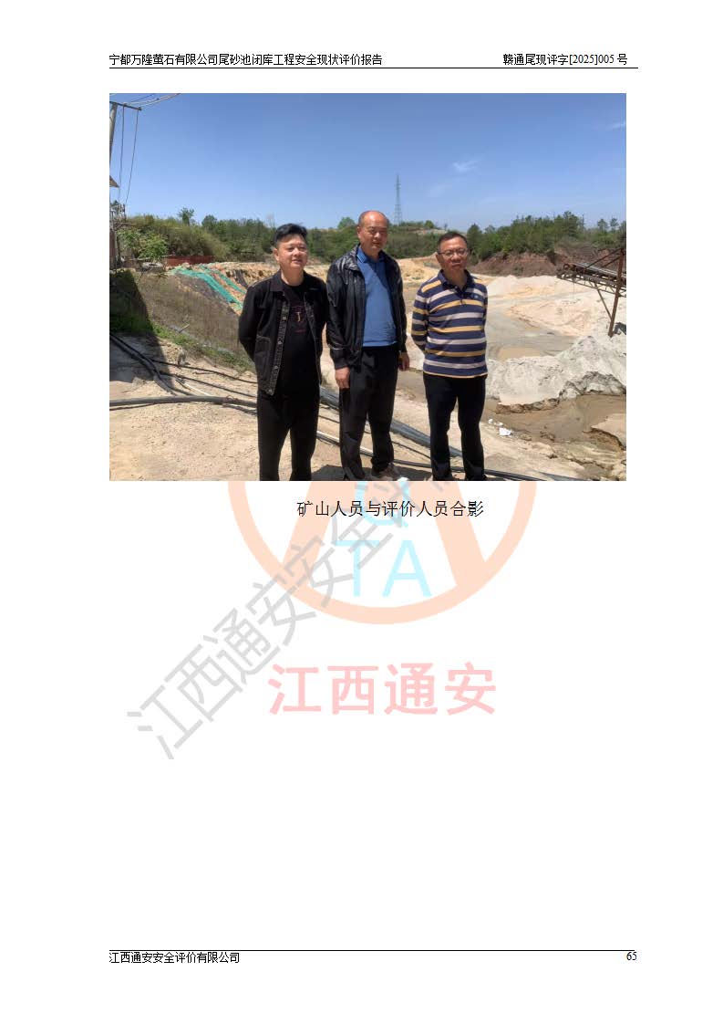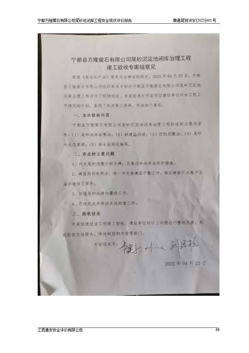 评价结论 | 宁都万隆萤石有限公司尾砂池按《宁都万隆萤石有限公司尾砂池闭库治理工程方案设计》进行建设,闭库后尾砂池坝体稳定,排洪能力满足要求,闭库后尾砂池对周边环境不存在安全影响,尾砂池闭库后符合安全条件。 | |||