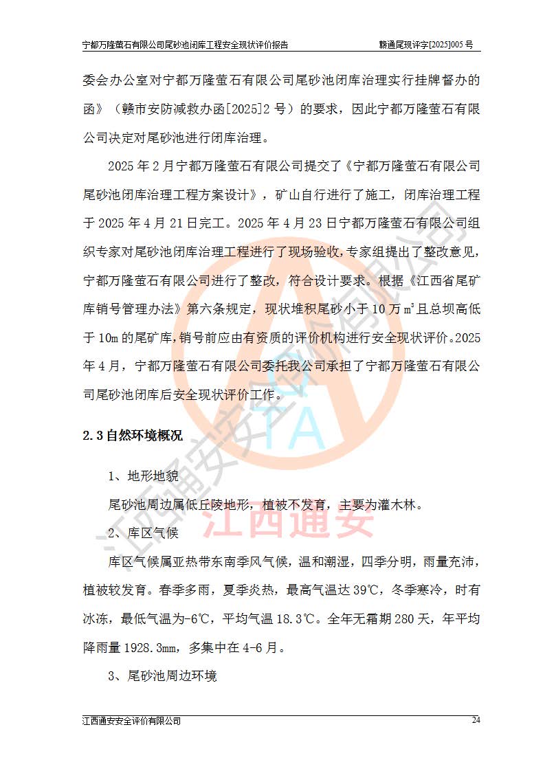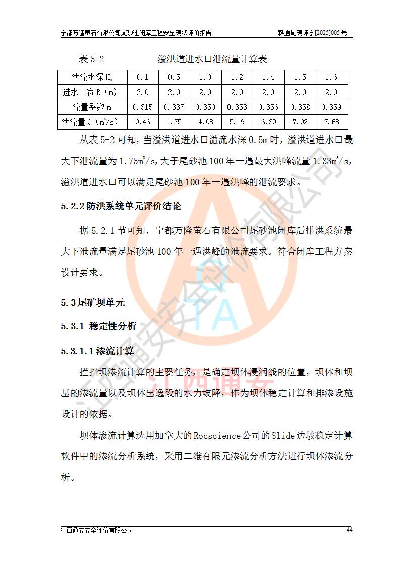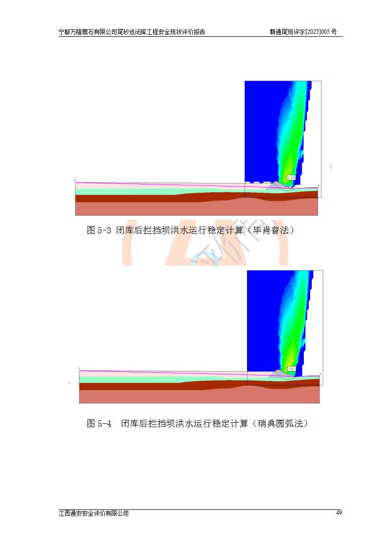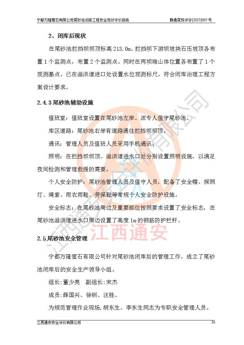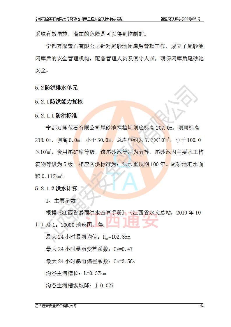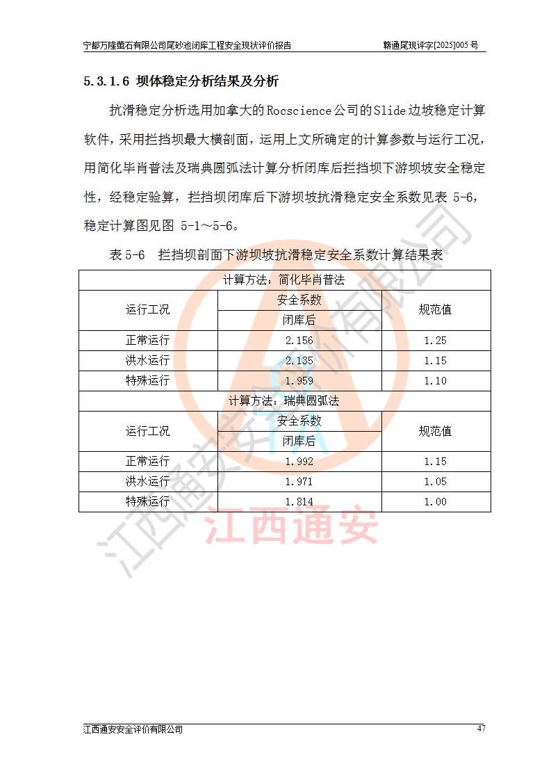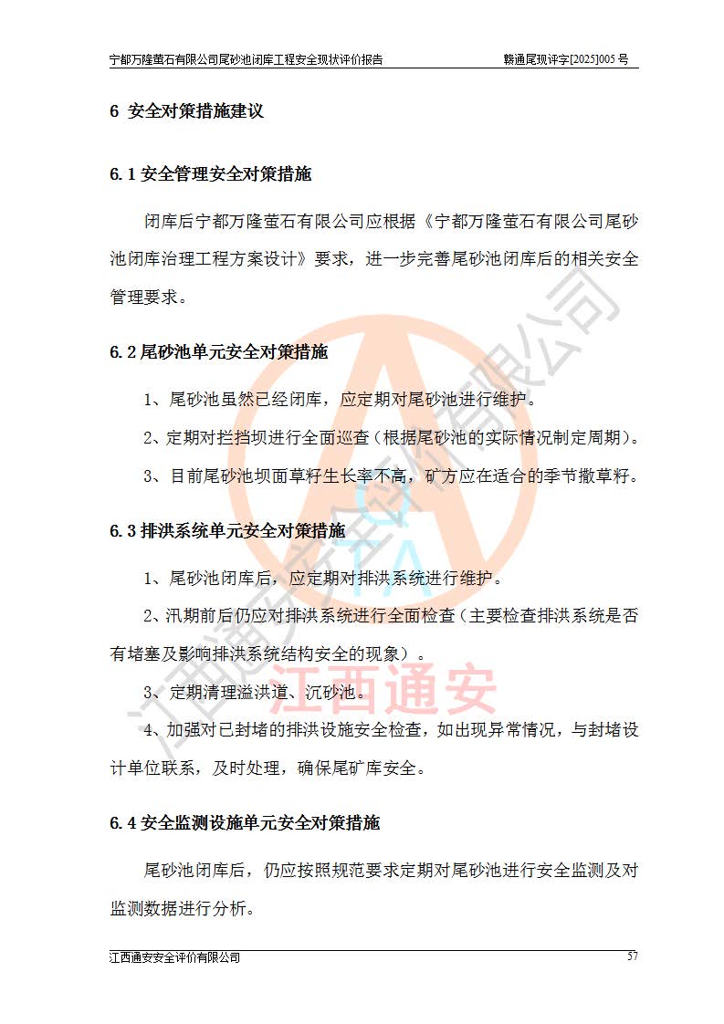评价结论 | 宁都万隆萤石有限公司尾砂池按《宁都万隆萤石有限公司尾砂池闭库治理工程方案设计》进行建设,闭库后尾砂池坝体稳定,排洪能力满足要求,闭库后尾砂池对周边环境不存在安全影响,尾砂池闭库后符合安全条件。 | |||