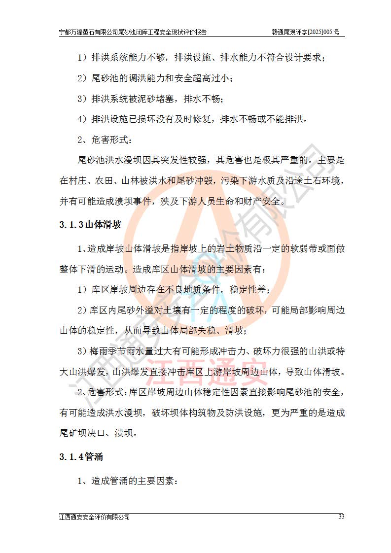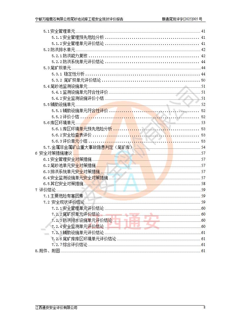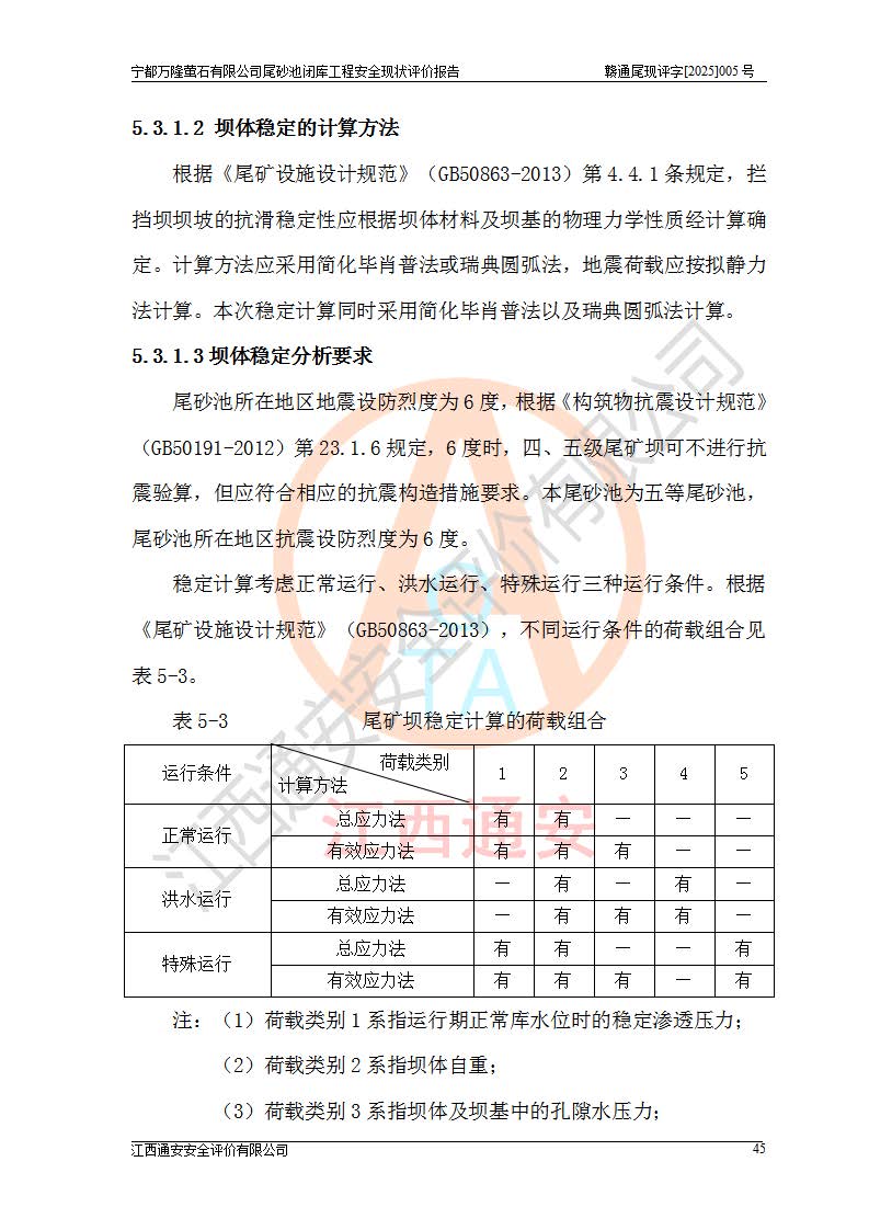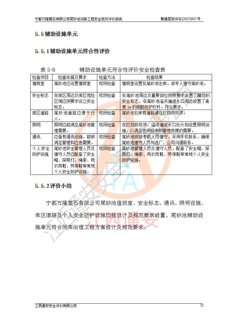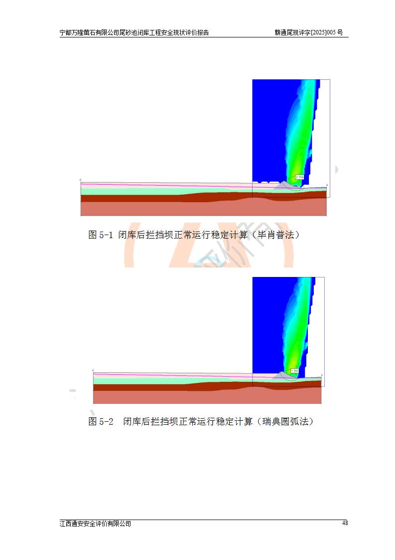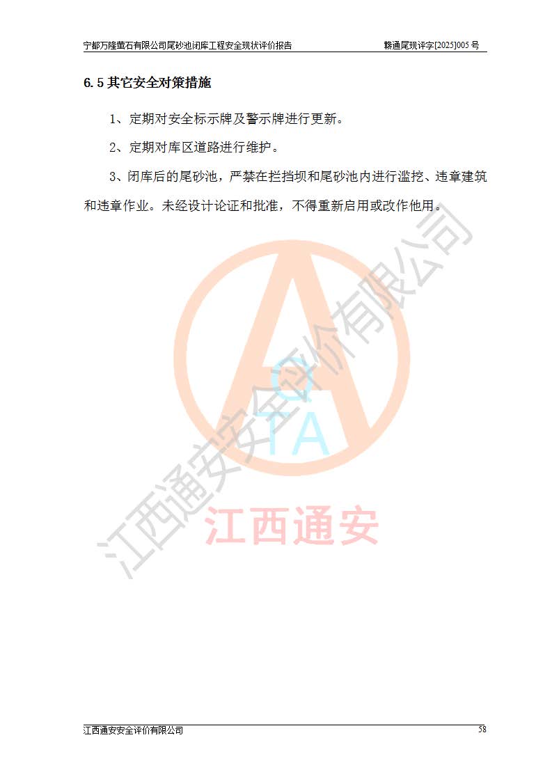 评价结论 | 宁都万隆萤石有限公司尾砂池按《宁都万隆萤石有限公司尾砂池闭库治理工程方案设计》进行建设,闭库后尾砂池坝体稳定,排洪能力满足要求,闭库后尾砂池对周边环境不存在安全影响,尾砂池闭库后符合安全条件。 | |||