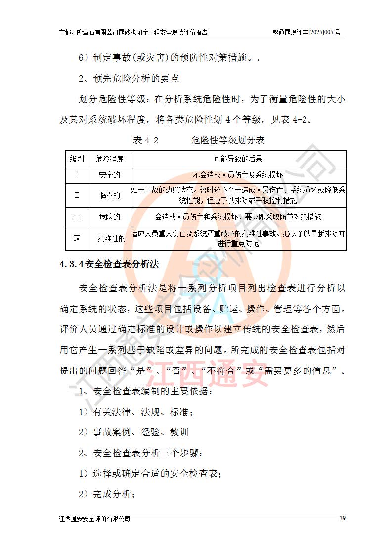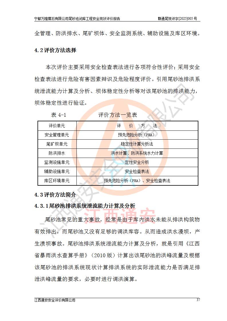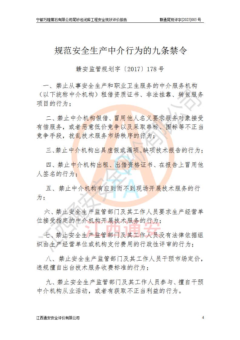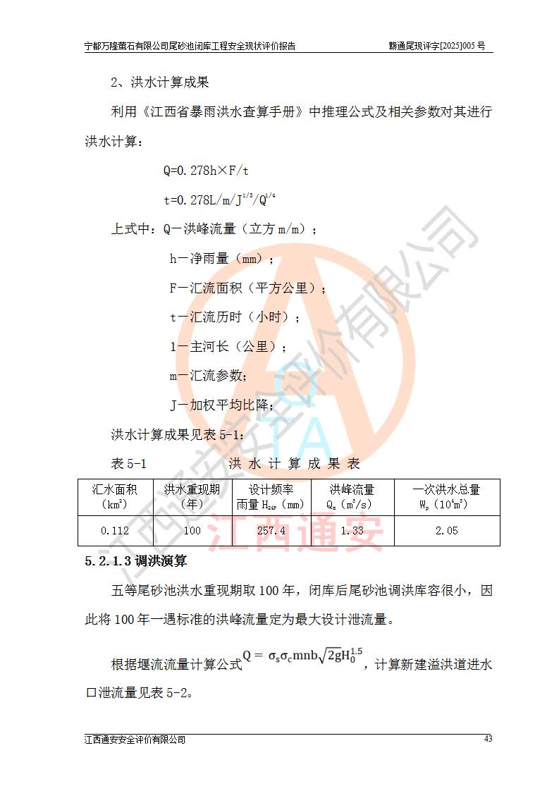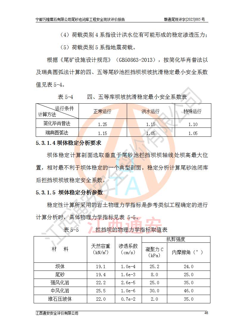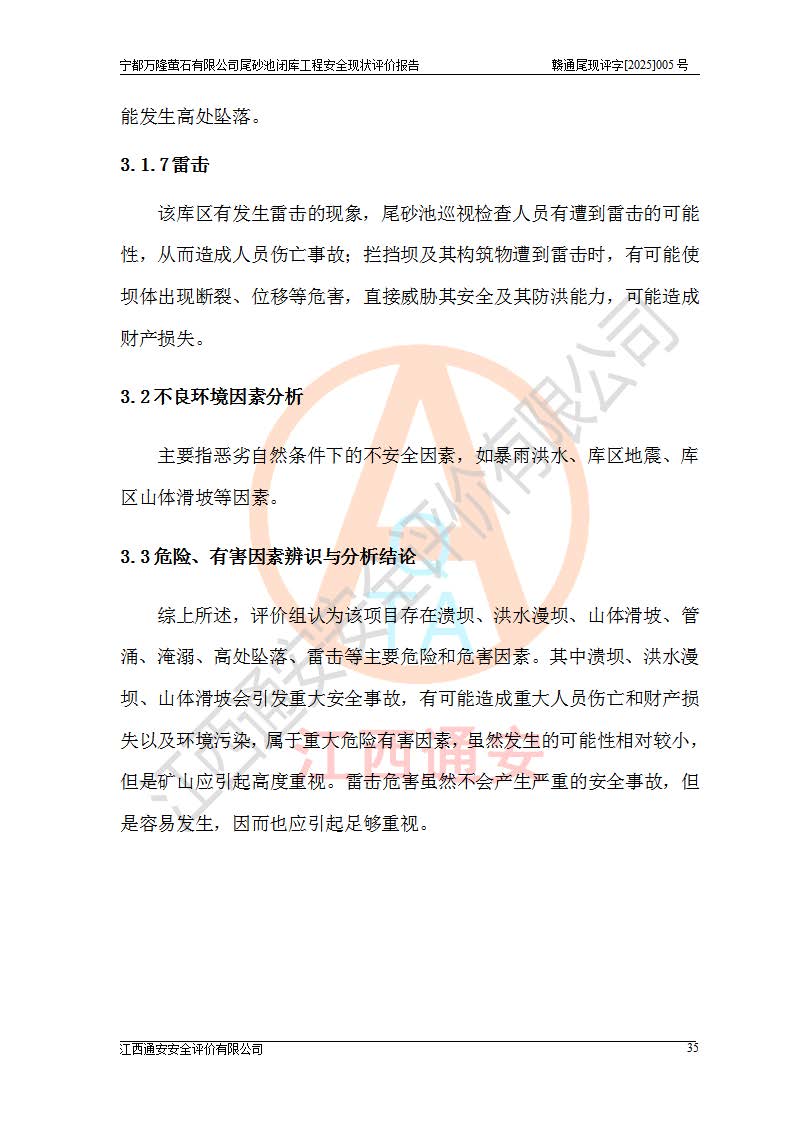 评价结论 | 宁都万隆萤石有限公司尾砂池按《宁都万隆萤石有限公司尾砂池闭库治理工程方案设计》进行建设,闭库后尾砂池坝体稳定,排洪能力满足要求,闭库后尾砂池对周边环境不存在安全影响,尾砂池闭库后符合安全条件。 | |||