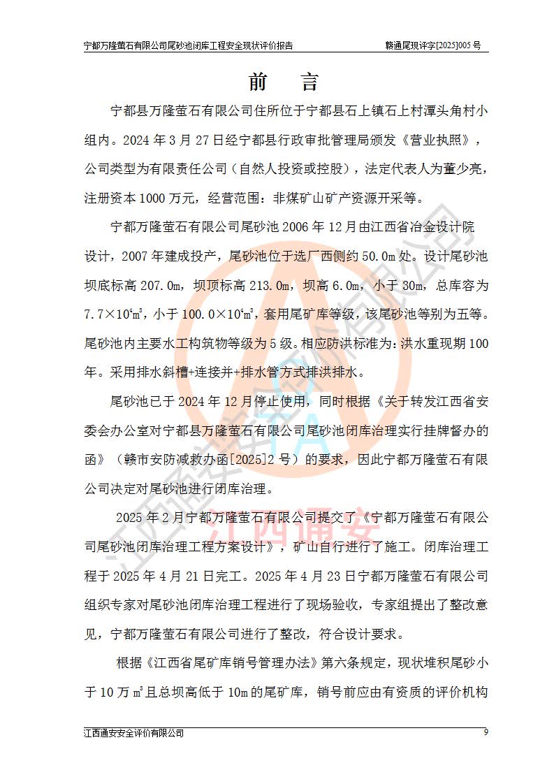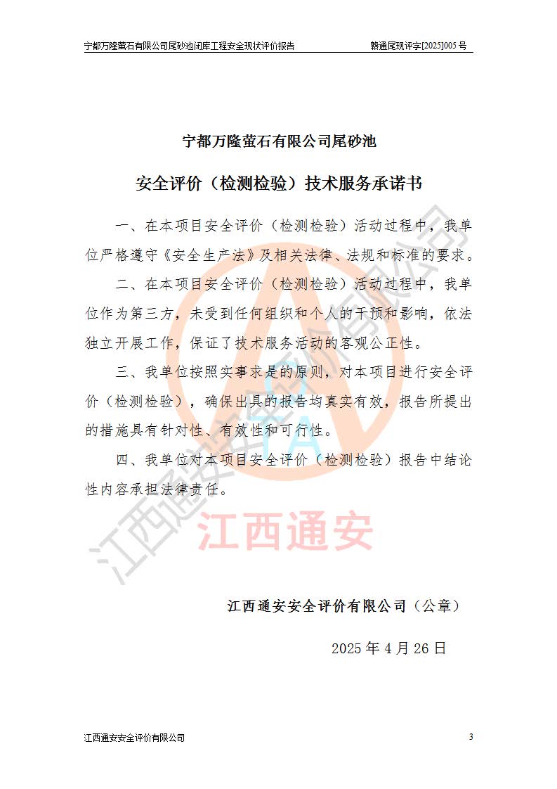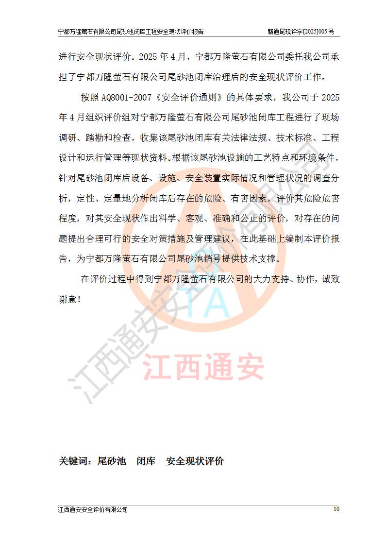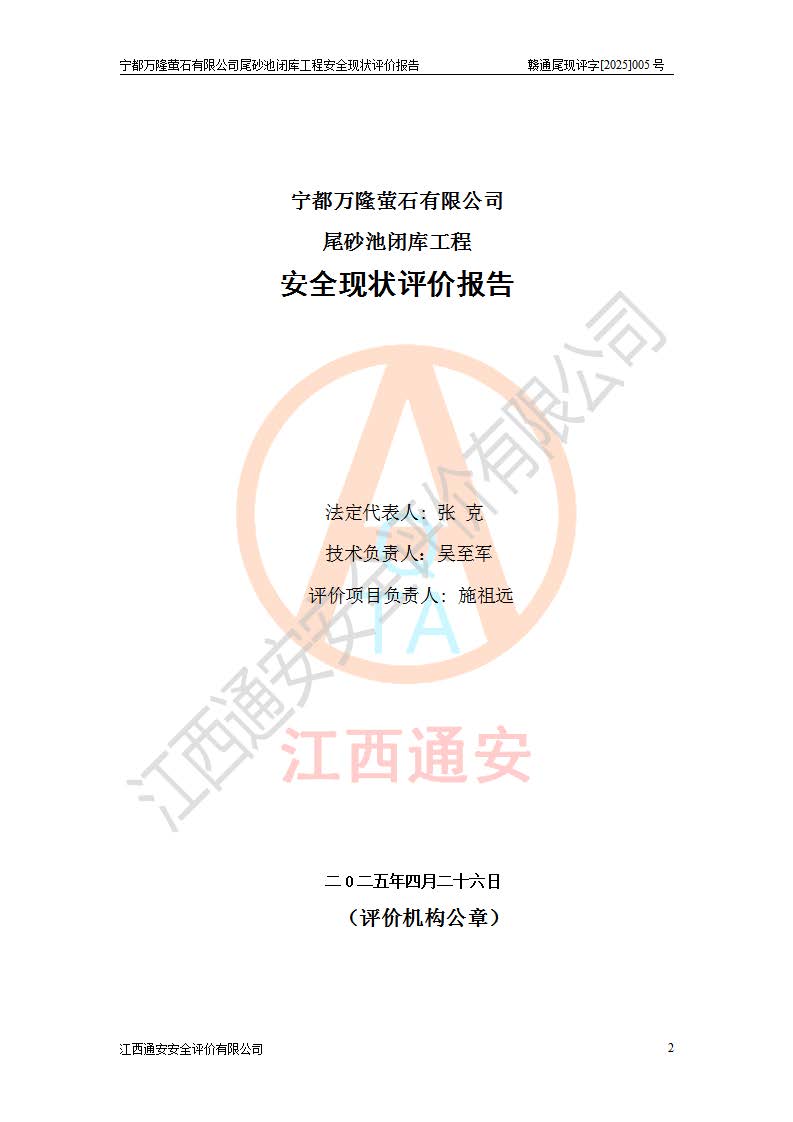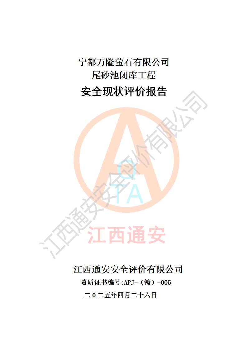 评价报告名称 | 宁都万隆萤石有限公司尾砂池闭库工程安全现状评价报告 | |||