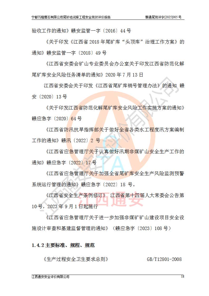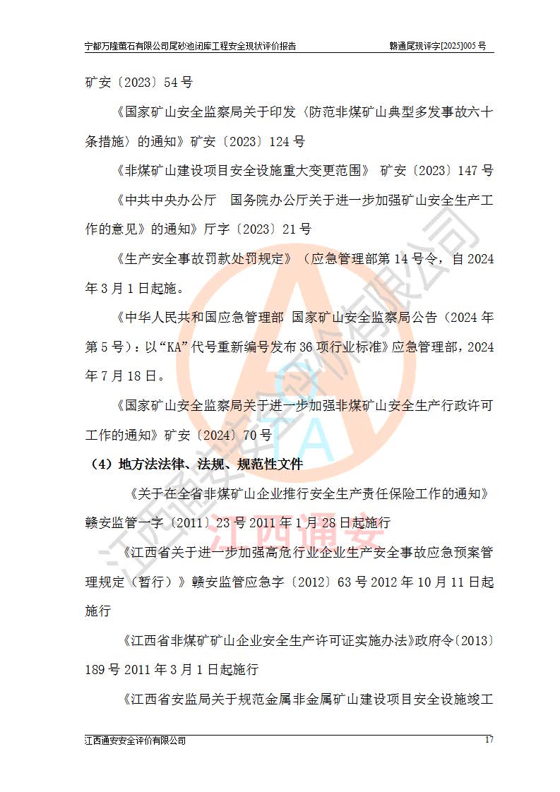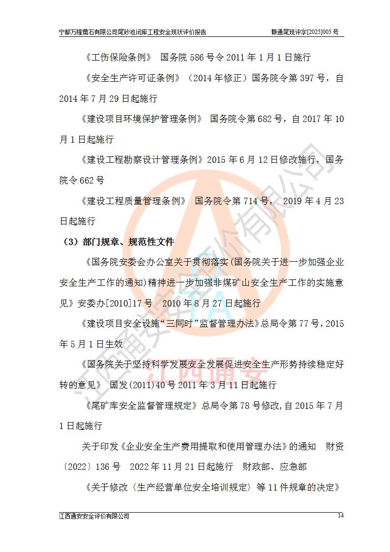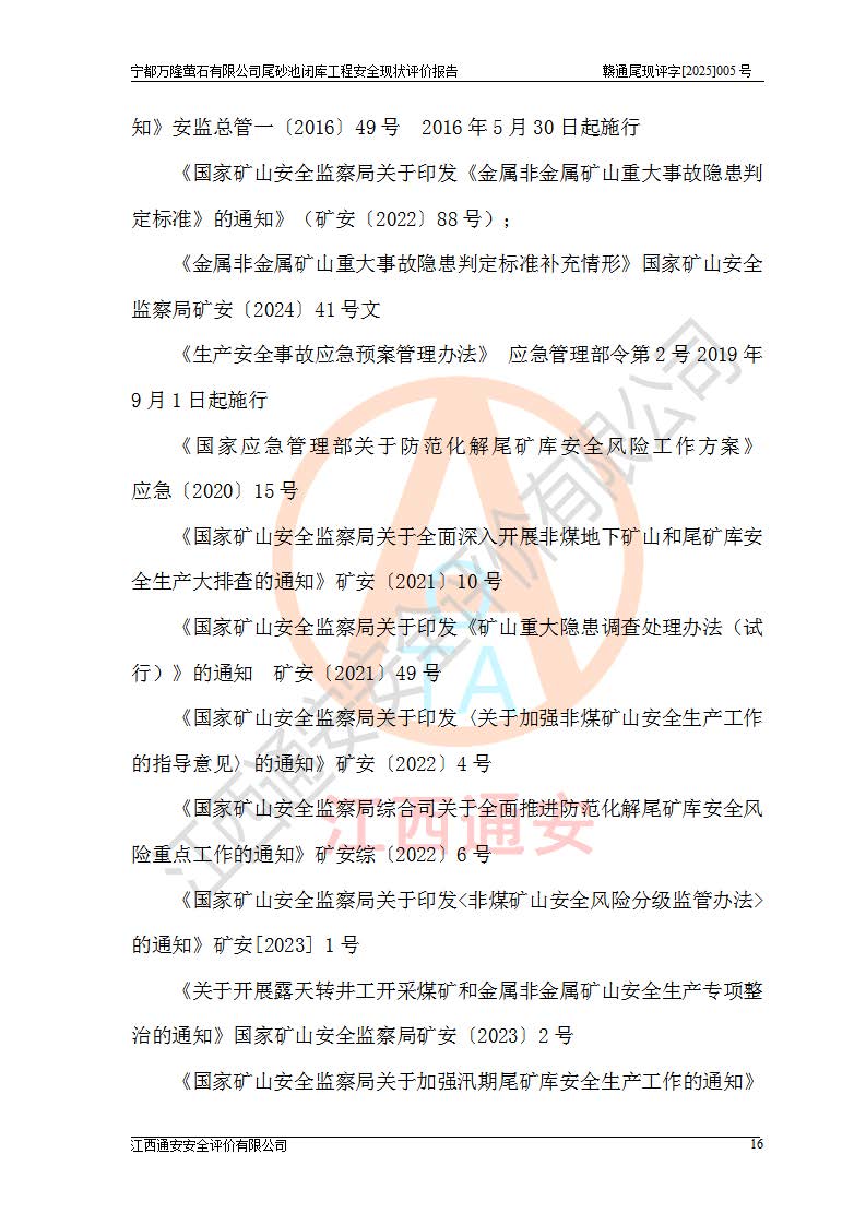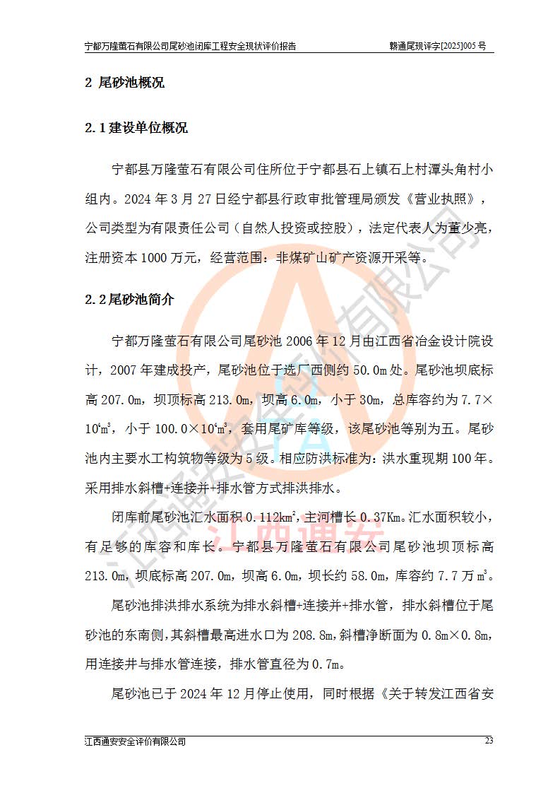 项目简介 | 宁都县万隆萤石有限公司住所位于宁都县石上镇石上村潭头角村小组内。2024年3月27日经宁都县行政审批管理局颁发《营业执照》,公司类型为有限责任公司(自然人投资或控股),法定**人为董少亮,注册资本1000万元,经营范围:非煤矿山矿产资源开采等。 宁都万隆萤石有限公司尾砂池2006年12月由江西省冶金设计院设计,2007年建成投产,尾砂池位于选厂西侧约50.0m处。设计尾砂池坝底标高207.0m,坝顶标高213.0m,坝高6.0m,小于30m,总库容为7.7×104m3,小于100.0×104m3,套用尾矿库等级,该尾砂池等别为五等。尾砂池内主要水工构筑物等级为5级。相应防洪标准为:洪水重现期100年。采用排水斜槽+连接并+排水管方式排洪排水。 尾砂池已于2024年12月停止使用,同时根据《关于转发江西省安委会办公室对宁都县万隆萤石有限公司尾砂池闭库治理实行挂牌督办的函》(赣市安防减救办函[2025]2号)的要求,宁都万隆萤石有限公司决定对尾砂池进行闭库治理。 2025年2月宁都万隆萤石有限公司提交了《宁都万隆萤石有限公司尾砂池闭库治理工程方案设计》,矿山自行进行了施工。闭库治理工程于2025年4月21日完工。2025年4月23日宁都万隆萤石有限公司组织专家对尾砂池闭库治理工程进行了现场验收,专家组提出了整改意见,宁都万隆萤石有限公司进行了整改,符合设计要求。 根据《江西省尾矿库销号管理办法》第六条规定,现状堆积尾砂小于10万m3且总坝高低于10m的尾矿库,销号前应由有资质的评价机构进行安全现状评价。2025年4月,宁都万隆萤石有限公司委托我公司承担了宁都万隆萤石有限公司尾砂池闭库治理后的安全现状评价工作。 | |||