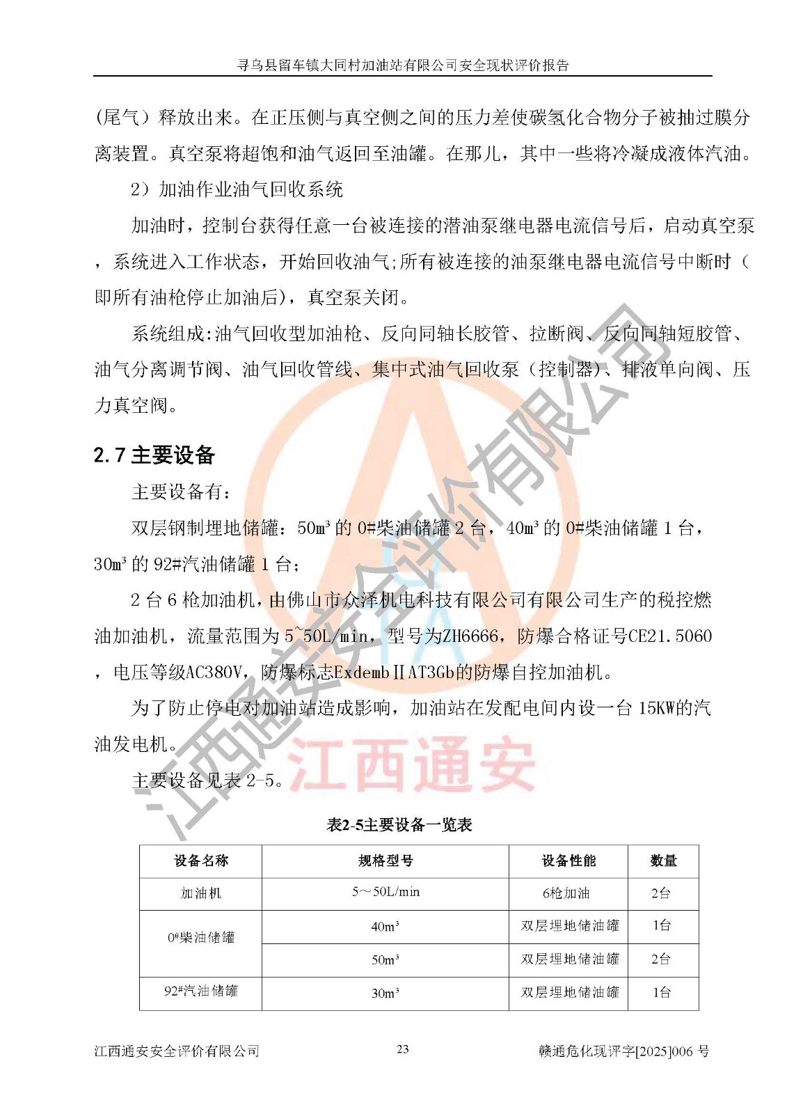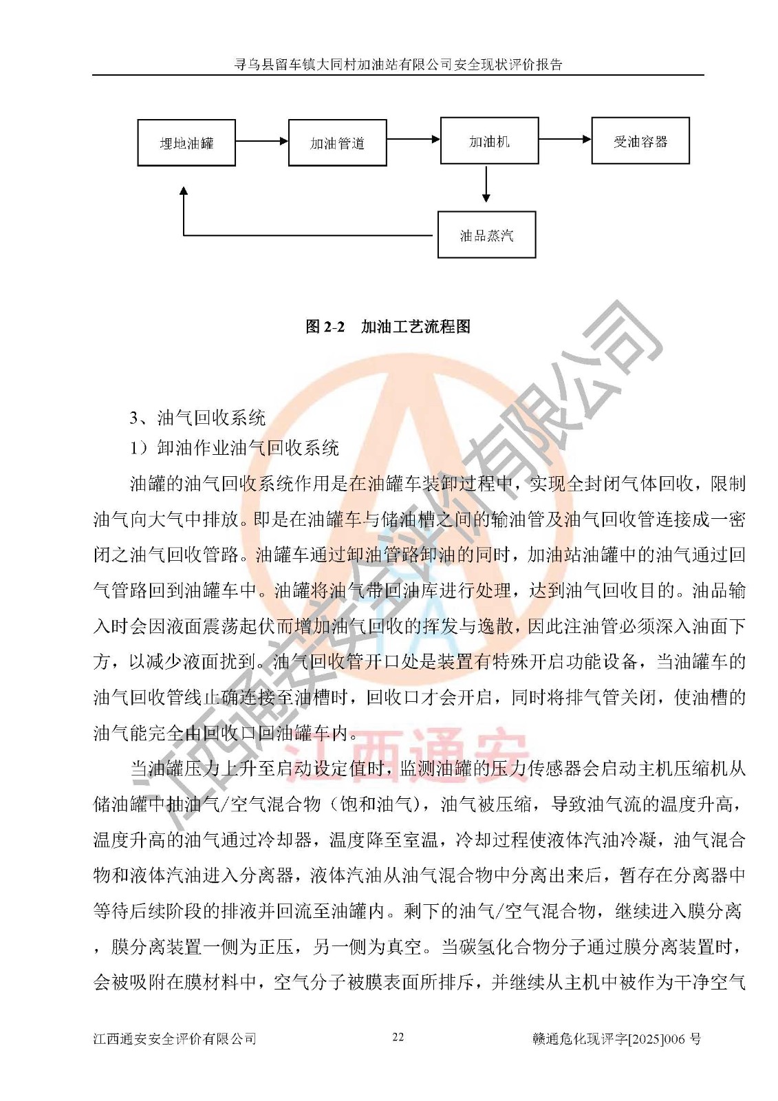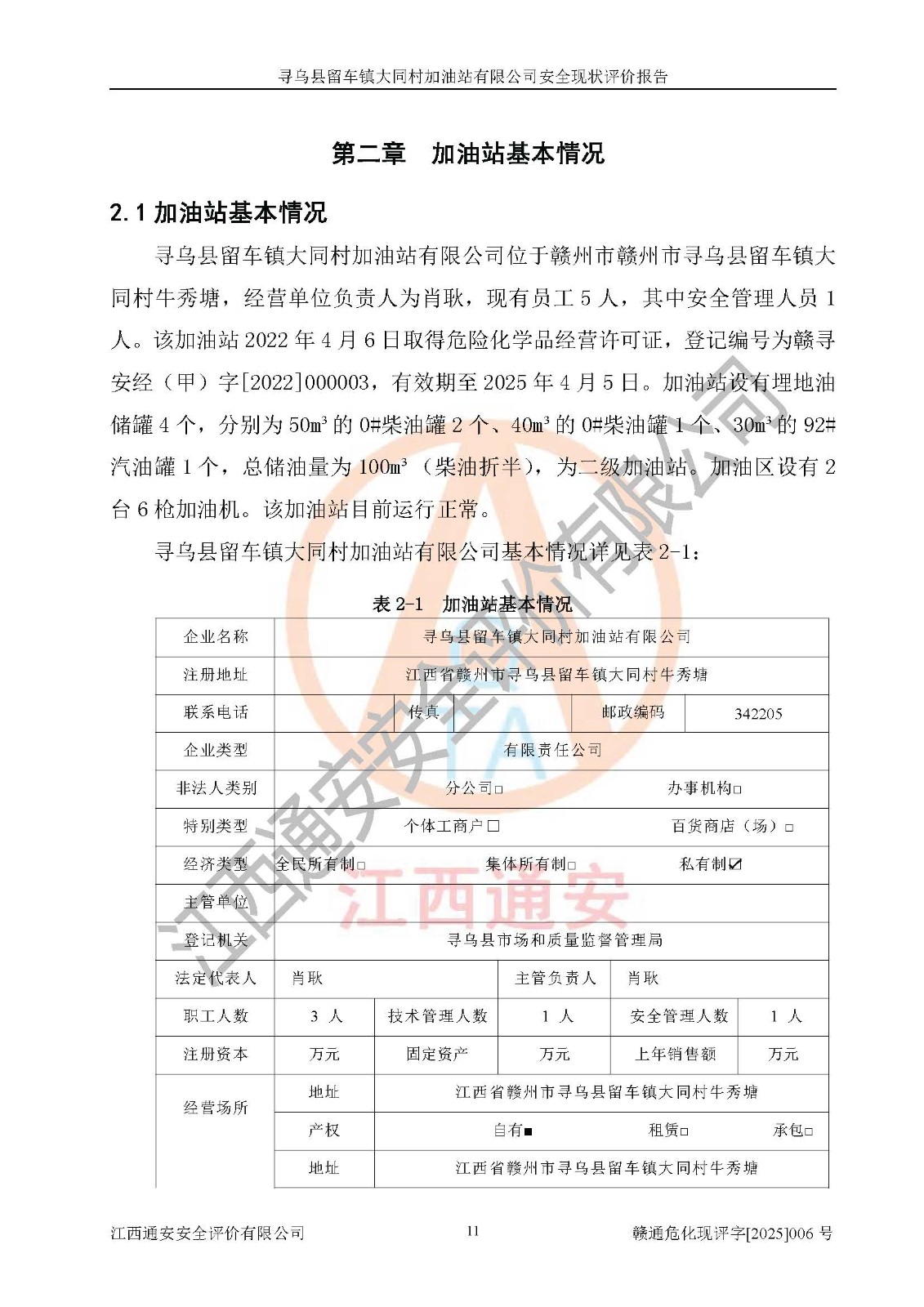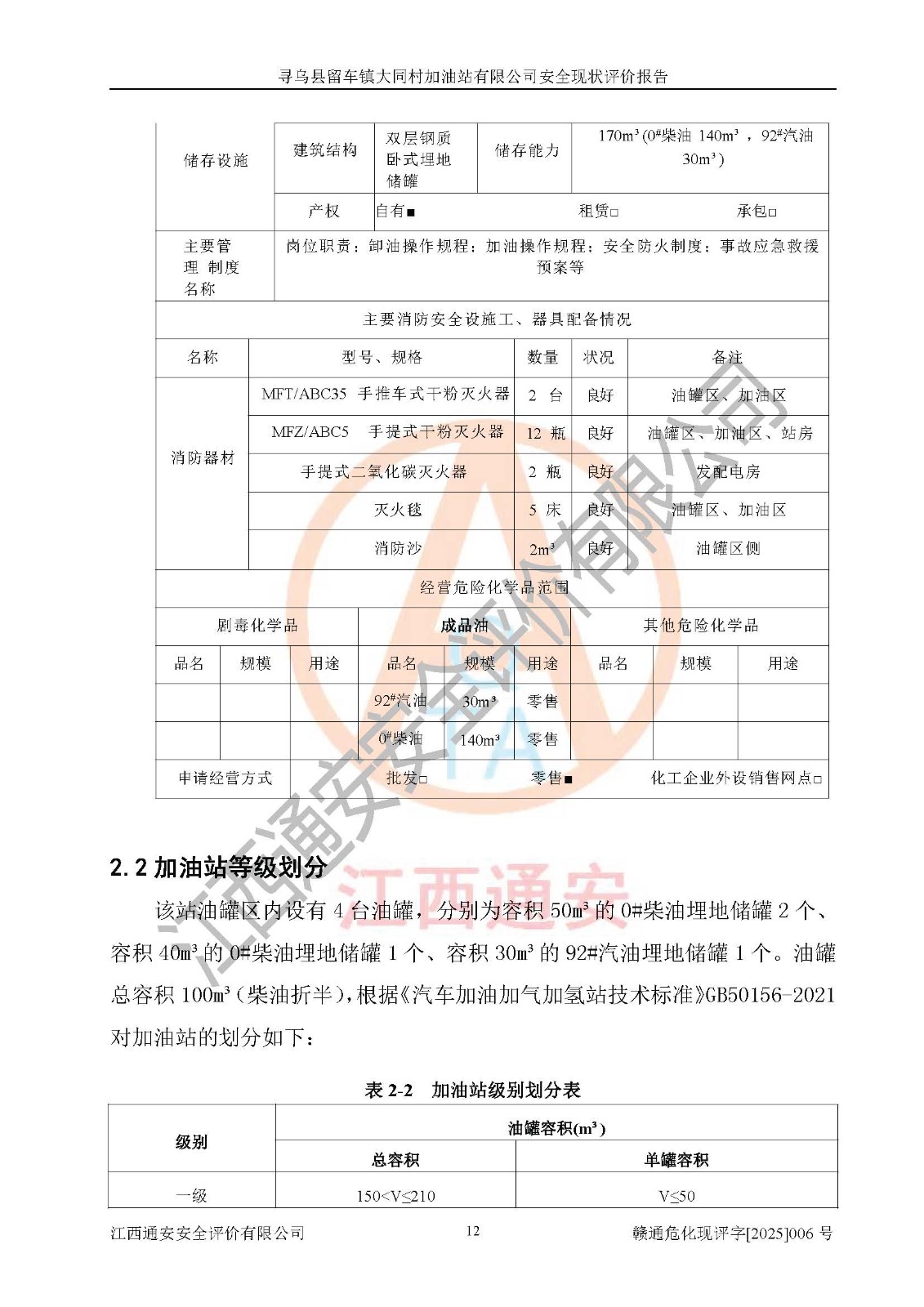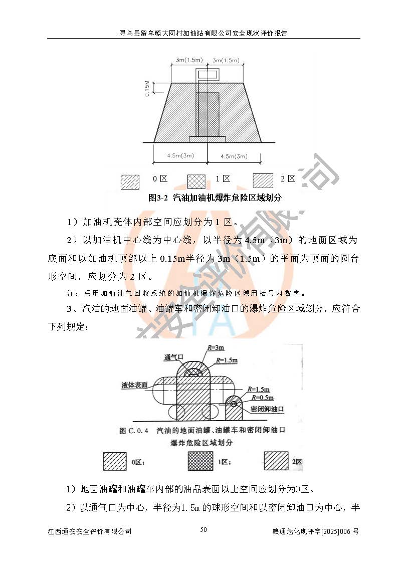 项目简介 | 寻乌县留车镇大同村加油站有限公司位于赣州市赣州市寻乌县留车镇大同村牛秀塘,经营单位负责人为肖耿,现有员工5人,其中安全管理人员1人。该加油站2022年4月6日取得危险化学品经营许可证,登记编号为赣寻安经(甲)字[2022]000003,**期至2025年4月5日。加油站设有埋地油储罐4个,分别为50m³的0#柴油罐2个、40m³的0#柴油罐1个、30m³的92#汽油罐1个,总储油量为100m³(柴油折半),为二级加油站。加油区设有2台6枪加油机。该加油站目前运行正常。 | ||||