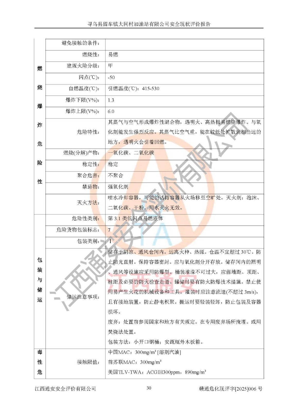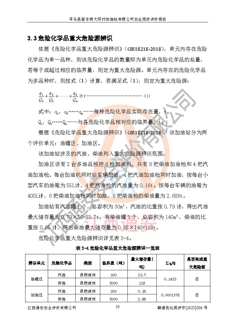 其它 | 1、寻乌县留车镇大同村加油站有限公司加油站所涉及危险化学品为汽油、柴油,汽油属于首批重点监管的危险化学品和特别管控危险化学品,汽油、柴油的数量不构成危险化学品重大危险源。 2、通过本报告分析,该加油站经营中面临多种危险因素,如火灾、爆炸,电气伤害、**伤害、噪声等危险有害因素。而加油站*主要的危险、有害因素是火灾、爆炸,对此加油站全体员工**保持**的安全防护意识。 3、加油站公用工程能够满足安全经营的基本需要。 4、采用检查表评价法对加油站的选址、总平面布置及站内设施之间的安全距离、经营设施与设备、工艺方法、物料及产品安全性、电气仪表和公用工程、建筑与消防、罐区防静电、作业场所、安全管理制度和安全管理机构、重大生产安全事故隐患进行安全评价,整改后能够符合安全要求。 5、加油站取得了防雷防静电技术检测报告,符合安全规范要求。 6、项目的外部防火距离、平面布置、消防安全设施和措施,能够满足**法律、法规、标准、规范的要求。其油罐、加油机为正规专业单位制造,并经检测检验合格,采用带有油气回收的密闭卸油、加油系统;设施电气防爆防护、机械设备的安全保护等方面的安全设施建立**。 7、该项目的作业条件相对较安全,在选定的4个单元中均出现可能危险作业环境,且可能危险作业环境的出现均由物料和特殊条件的危险程度所决定。 8、危险度评价汽油储罐危险等级为III级,属于低度危险;柴油储罐危险等级为II级,属于中度危险。油储罐区危险度应取较大值,故油储罐区危险等级应为II级,属于中度危险。 9、加油站成立了安全**小组,制定了相应的管理制度,操作规程和事故应急预案,加油站的安全管理机构工作有力,加油站安全经营管理处于正常有序开展范围。 10、加油站对现场存在的问题点进行了整改。 寻乌县留车镇大同村加油站有限公司的安全设施和措施在正常经营过程中能够满足安全经营的条件,消防、防雷设施到位且在**期内,对现场存在的问题点进行了整改,安全管理能够满足正常安全经营的需要,符合危险化学品经营安全要求。