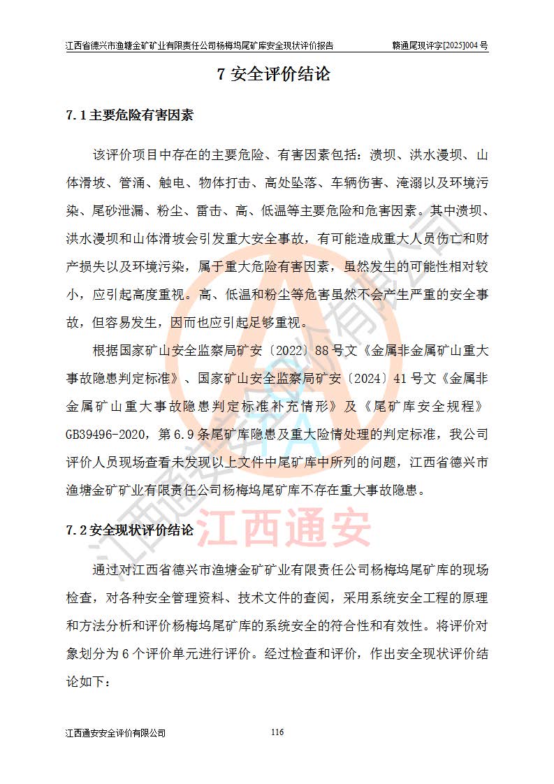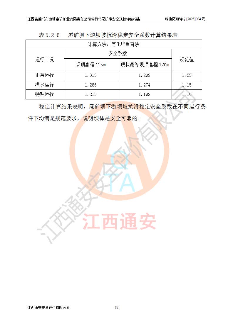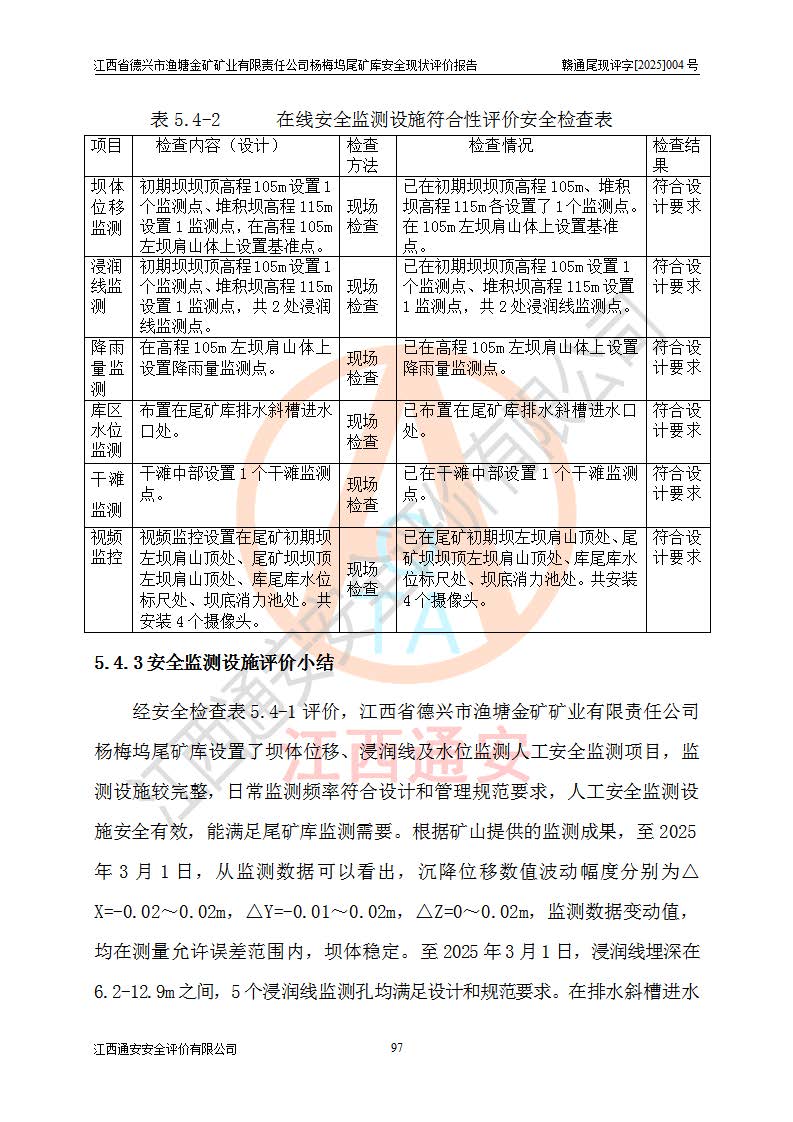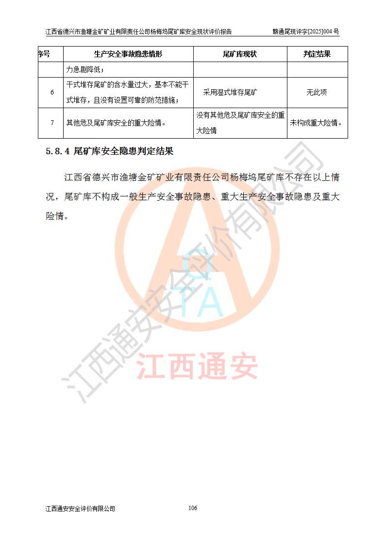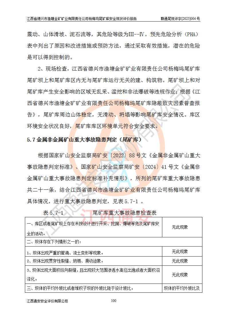 评价结论 | 江西省德兴市渔塘金矿矿业有限责任公司杨梅坞尾矿库安全设施符合设计要求,为正常库,具备《非煤矿山企业安全生产许可证实施办法》要求的安全生产条件。 | |||