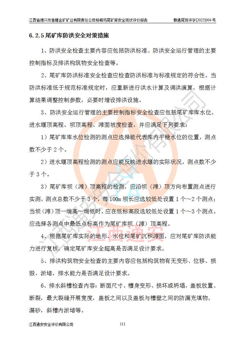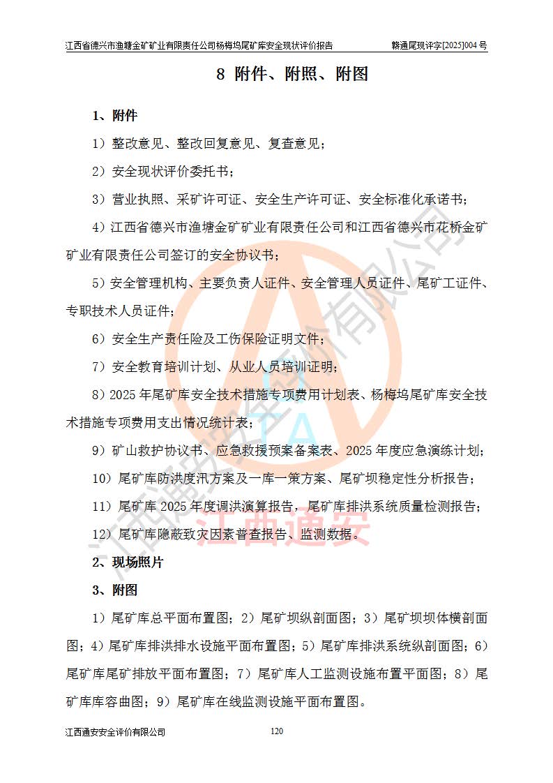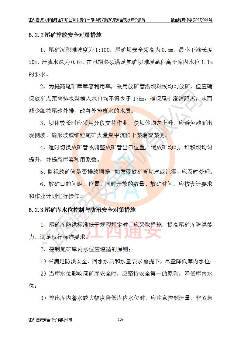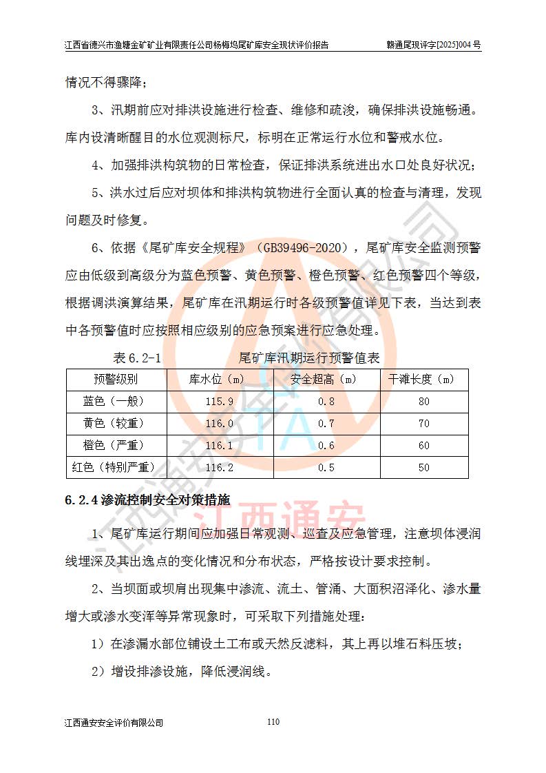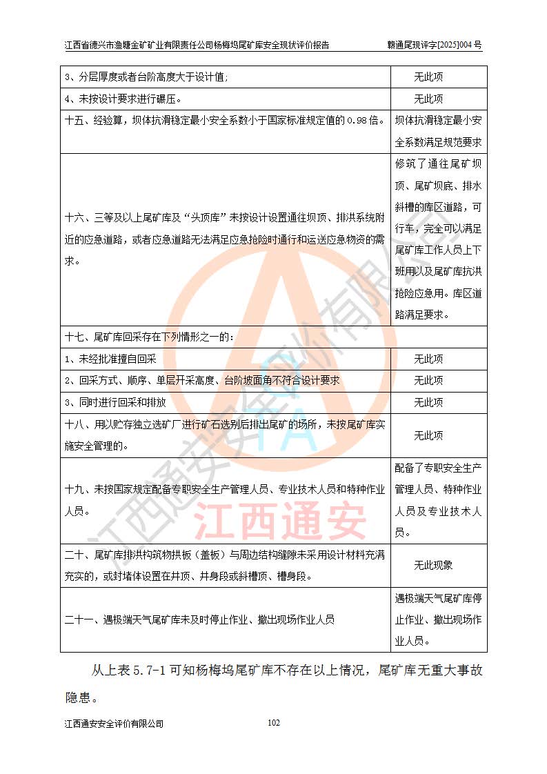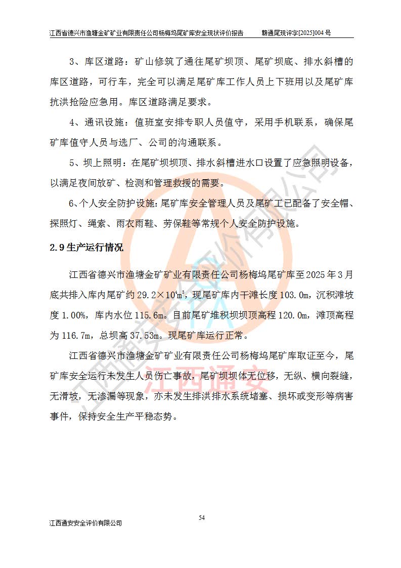 评价结论 | 江西省德兴市渔塘金矿矿业有限责任公司杨梅坞尾矿库安全设施符合设计要求,为正常库,具备《非煤矿山企业安全生产许可证实施办法》要求的安全生产条件。 | |||
