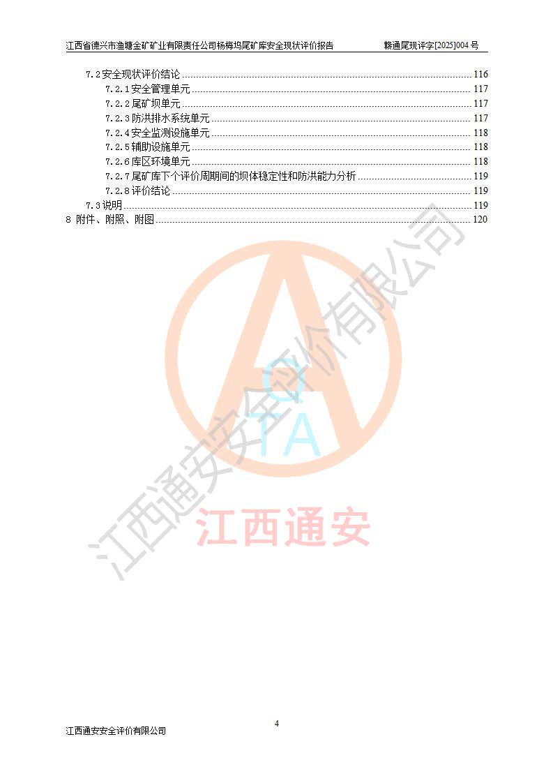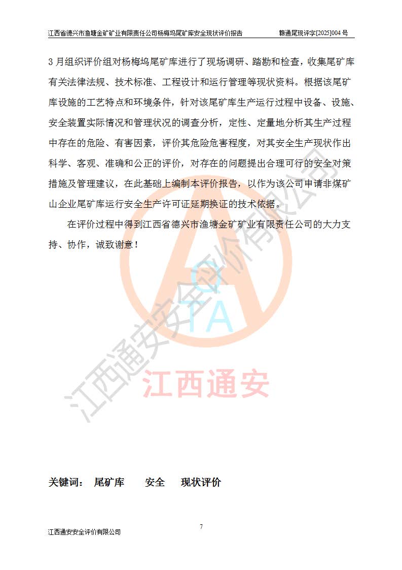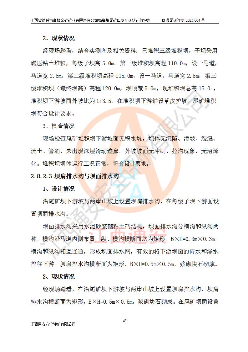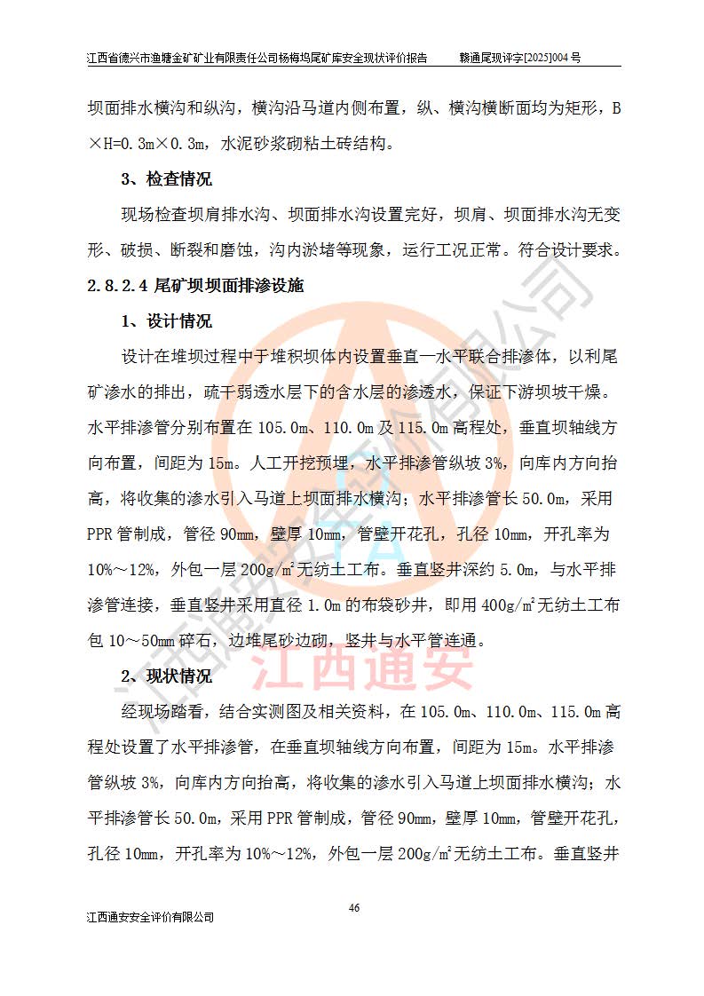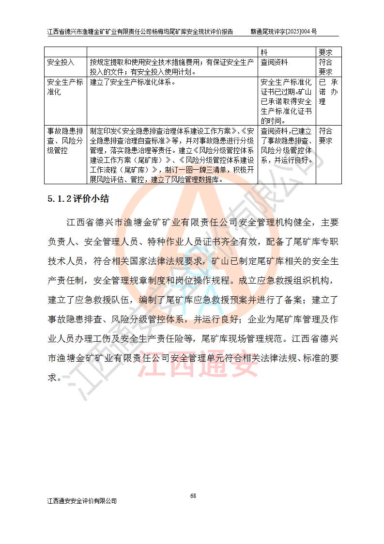 评价结论 | 江西省德兴市渔塘金矿矿业有限责任公司杨梅坞尾矿库安全设施符合设计要求,为正常库,具备《非煤矿山企业安全生产许可证实施办法》要求的安全生产条件。 | |||