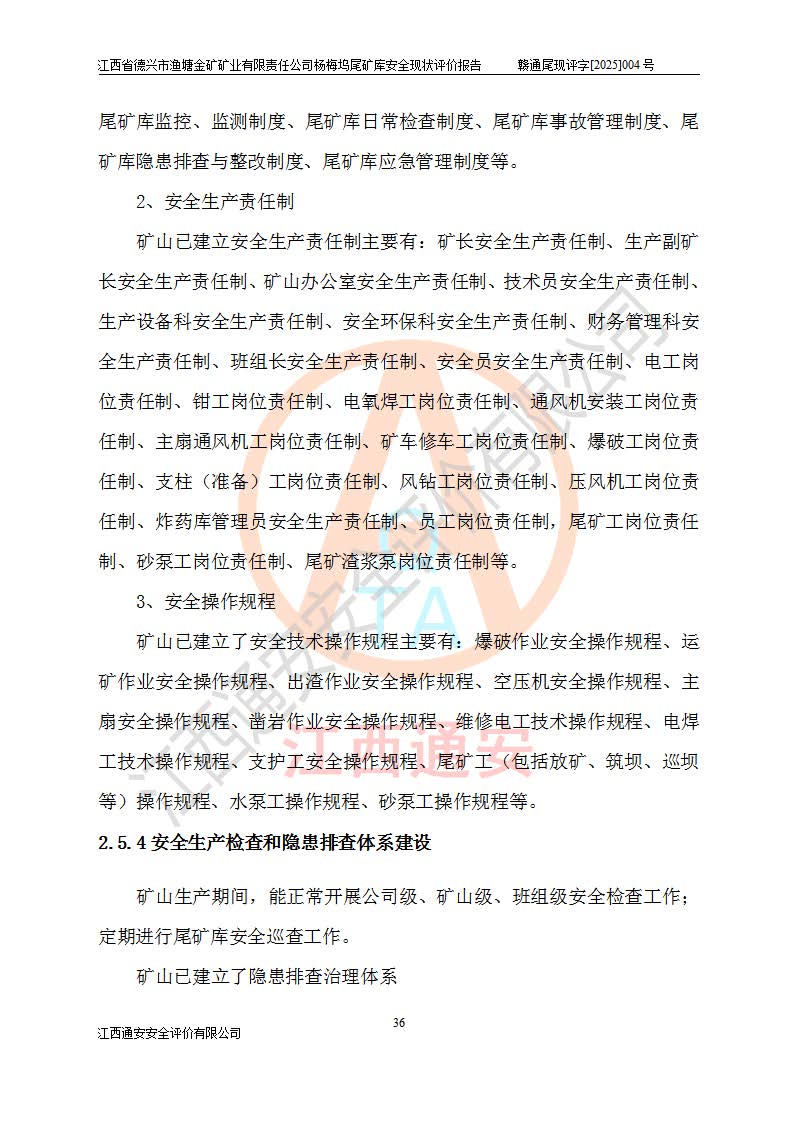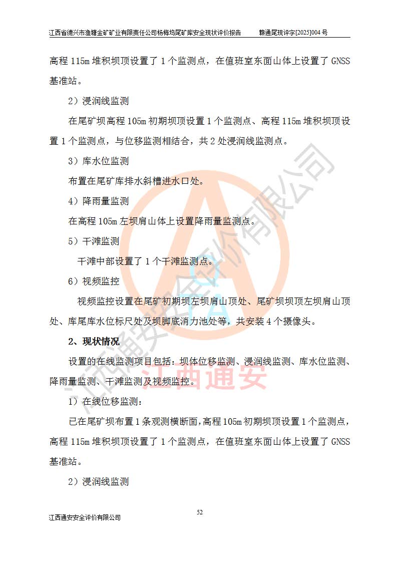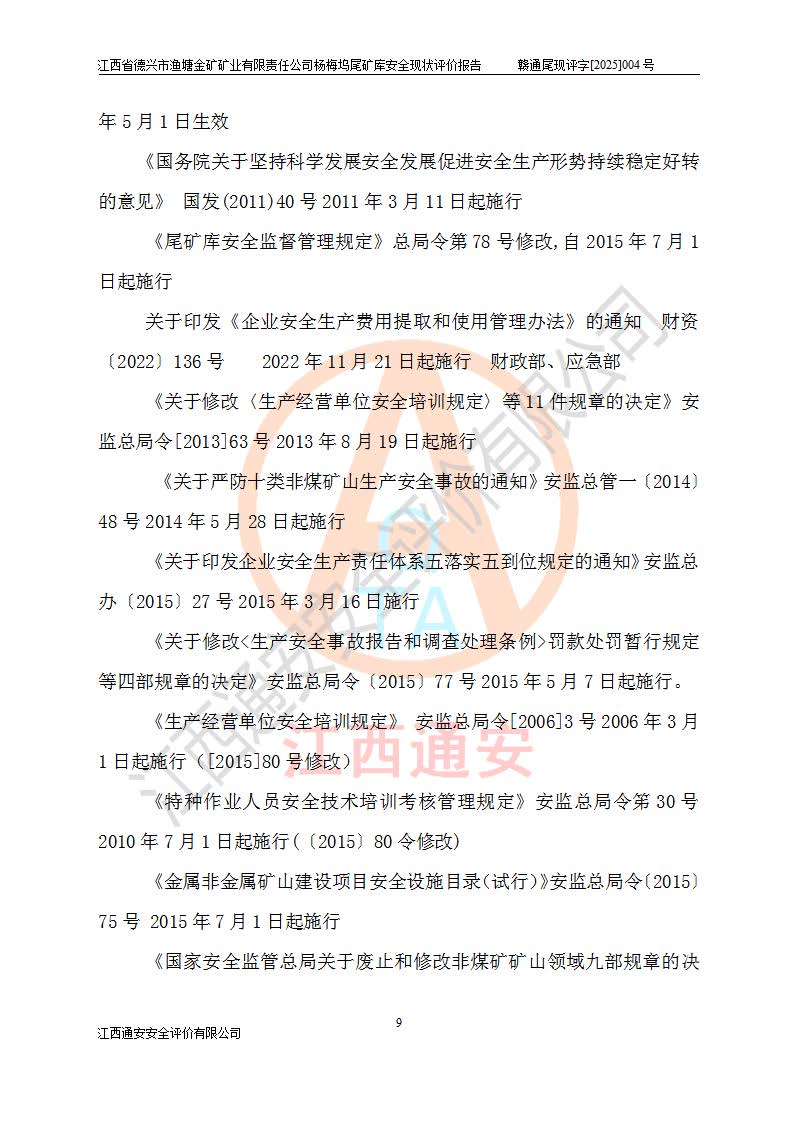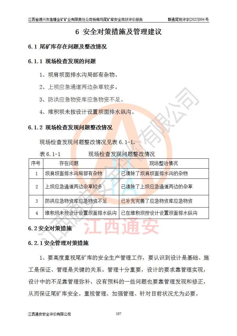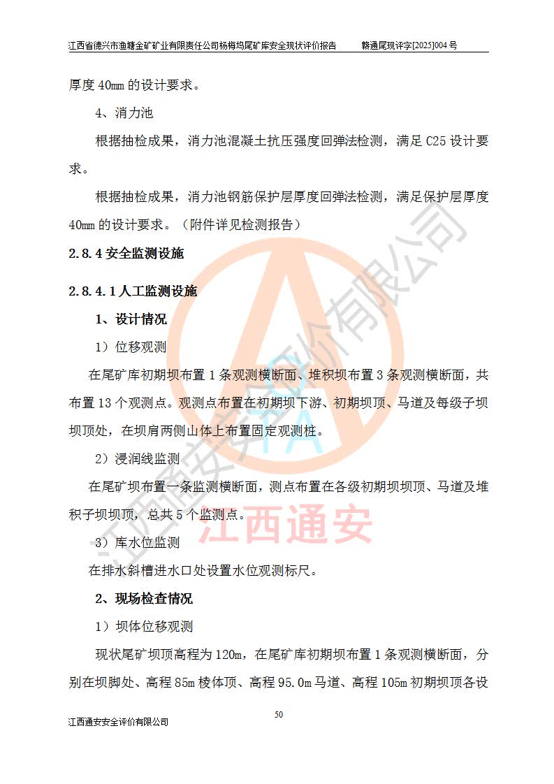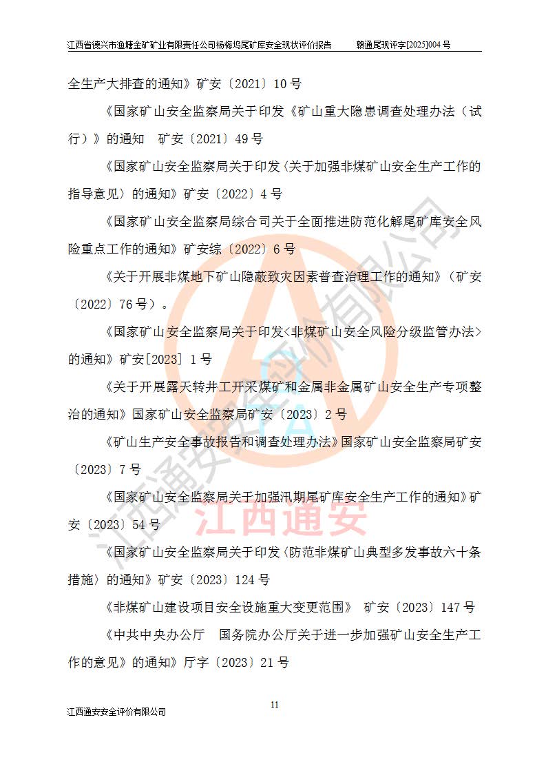 评价结论 | 江西省德兴市渔塘金矿矿业有限责任公司杨梅坞尾矿库安全设施符合设计要求,为正常库,具备《非煤矿山企业安全生产许可证实施办法》要求的安全生产条件。 | |||