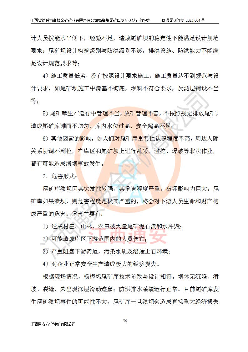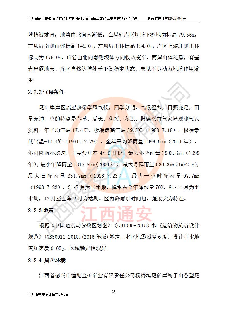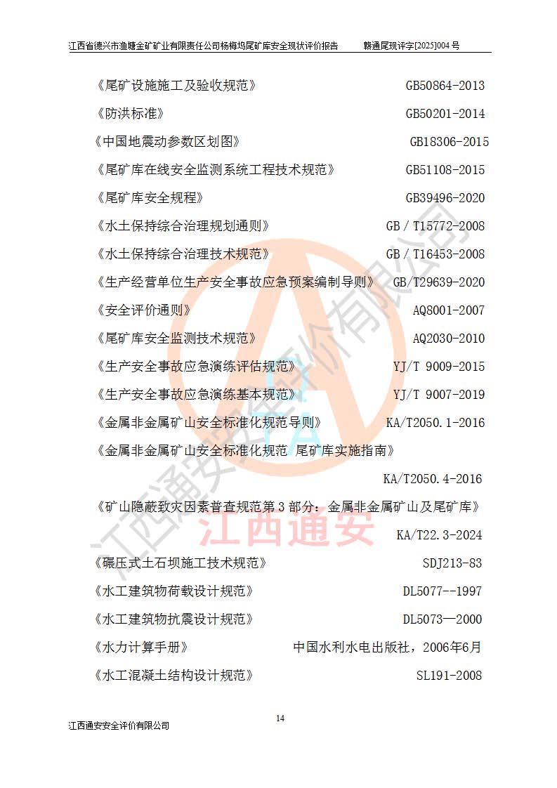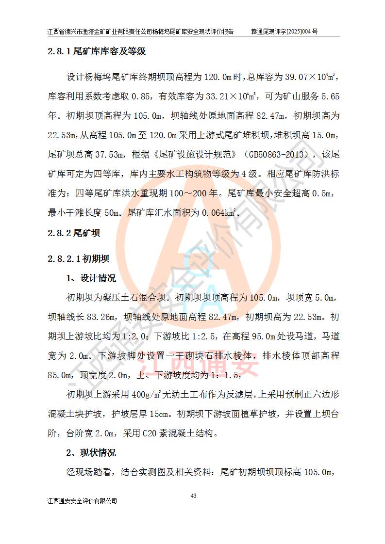 项目简介 | 江西省德兴市渔塘金矿矿业有限责任公司由原渔塘金矿、原石碑金矿和原黄柏洋金矿整合成立。江西省德兴市渔塘金矿矿业有限责任公司杨梅坞尾矿库位于德兴市84°方向直线距离约9.2**处,属德兴市花桥镇黄柏洋村。库区中心地理坐标:东经117°40′39″,北纬28°57′47″,有矿山公路通达杨梅坞尾矿库,交通较为方便。 杨梅坞尾矿库2017年7月由海湾工程有限公司设计,为山谷型尾矿库,总库容39.07×104m3,尾矿终期坝坝顶高程为120.0m,坝高37.53m。初期坝坝顶高程为105.0m,初期坝坝高22.53m,后期采用上游式放矿法,粘土堆积子坝,堆积坝高15.0m。根据《尾矿设施设计规范》(GB50863-2013),尾矿库为四等库,库内主要水工构筑物等级为4级,排洪设施采用200年一遇标准设计,排洪排水设施采用排水斜槽+连接井+排水涵洞的排洪排水方式。尾矿库年入库尾矿量5.88×104m3,可服务5.65年。尾矿库总汇水面积为0.064km2。尾矿库总占地面积约52亩。 杨梅坞尾矿库于2022年4月27日取得江西省应急管理厅颁发安全生产许可证,证书编号(赣)FM安许证字(2019)M1740号,有限期从2022年4月29日到2022年4月28日,依照《非煤矿矿山企业安全生产许可证延期换证工作》的通知,根据***《安全生产许可证条例》、《江西省安全生产条例》、《非煤矿山安全生产许可证实施办法》、《江西省非煤矿矿山企业安全生产许可证办法》规定及非煤矿山安全评价导则的要求,受江西省德兴市渔塘金矿矿业有限责任公司的委托,我公司承担杨梅坞尾矿库延期换证的安全现状评价工作。 | |||