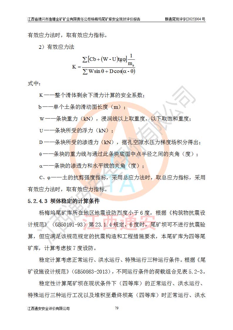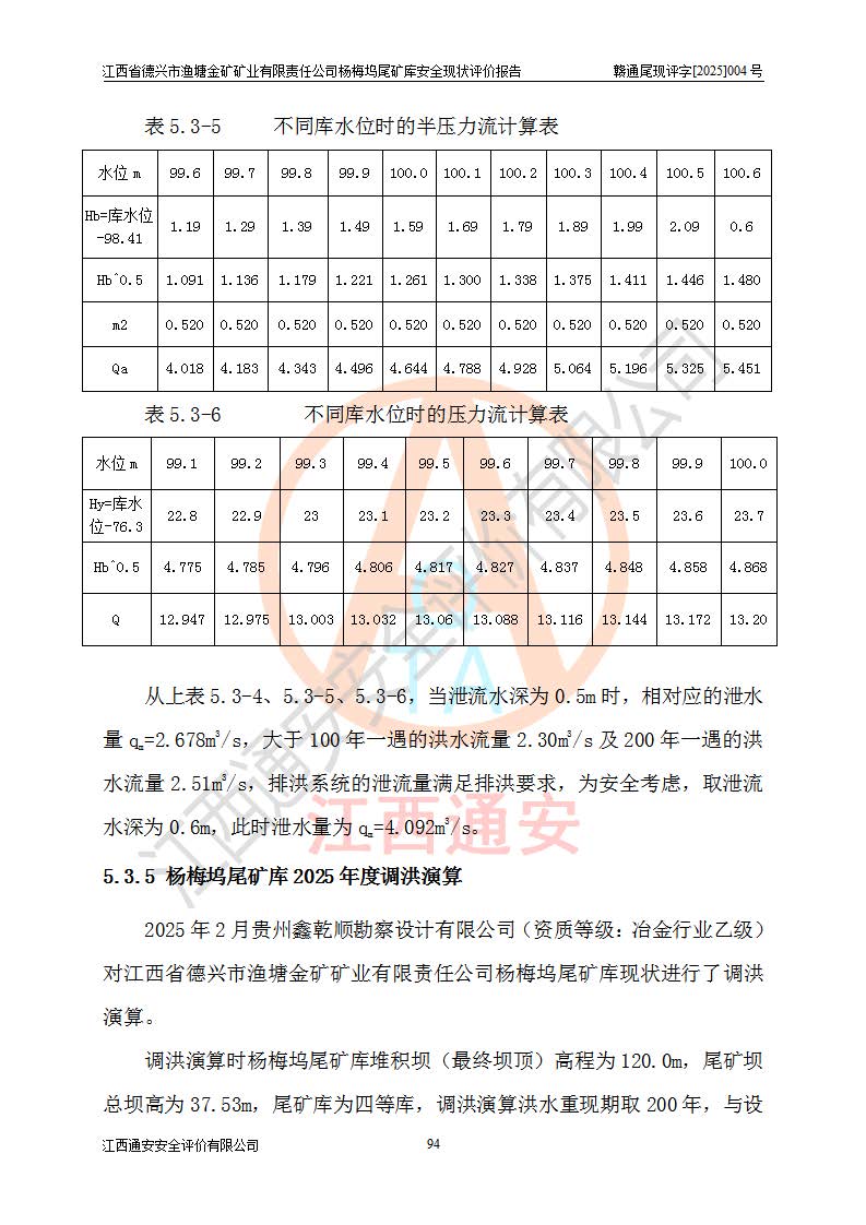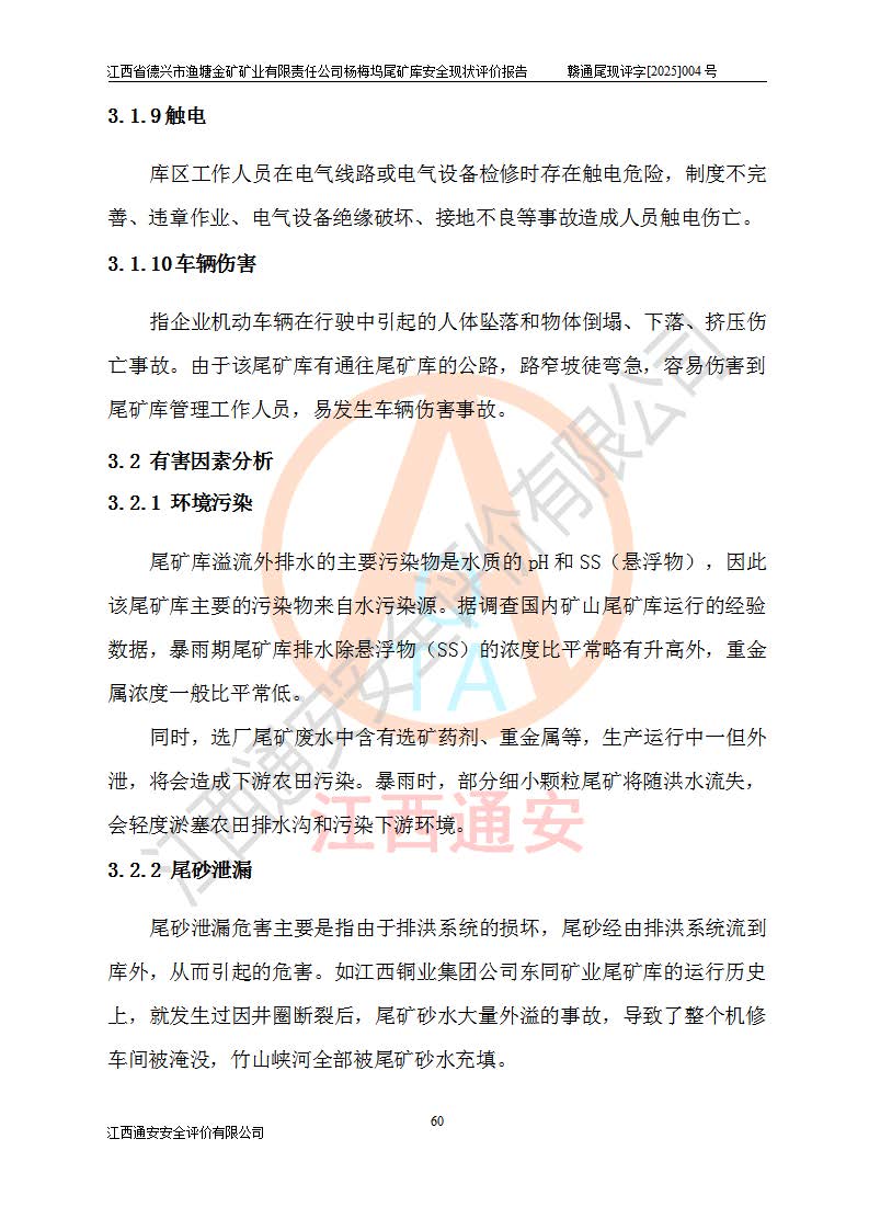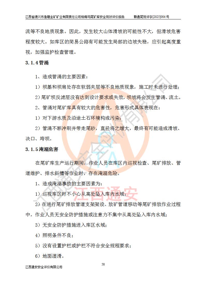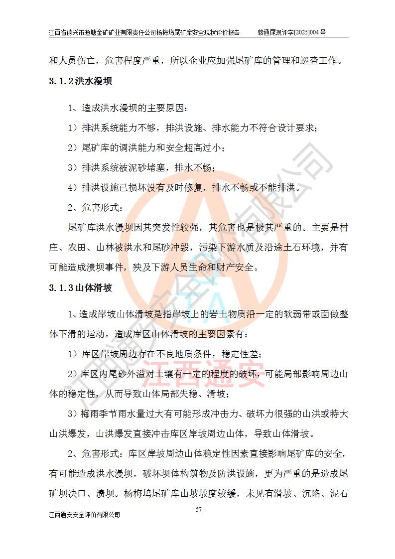 项目简介 | 江西省德兴市渔塘金矿矿业有限责任公司由原渔塘金矿、原石碑金矿和原黄柏洋金矿整合成立。江西省德兴市渔塘金矿矿业有限责任公司杨梅坞尾矿库位于德兴市84°方向直线距离约9.2**处,属德兴市花桥镇黄柏洋村。库区中心地理坐标:东经117°40′39″,北纬28°57′47″,有矿山公路通达杨梅坞尾矿库,交通较为方便。 杨梅坞尾矿库2017年7月由海湾工程有限公司设计,为山谷型尾矿库,总库容39.07×104m3,尾矿终期坝坝顶高程为120.0m,坝高37.53m。初期坝坝顶高程为105.0m,初期坝坝高22.53m,后期采用上游式放矿法,粘土堆积子坝,堆积坝高15.0m。根据《尾矿设施设计规范》(GB50863-2013),尾矿库为四等库,库内主要水工构筑物等级为4级,排洪设施采用200年一遇标准设计,排洪排水设施采用排水斜槽+连接井+排水涵洞的排洪排水方式。尾矿库年入库尾矿量5.88×104m3,可服务5.65年。尾矿库总汇水面积为0.064km2。尾矿库总占地面积约52亩。 杨梅坞尾矿库于2022年4月27日取得江西省应急管理厅颁发安全生产许可证,证书编号(赣)FM安许证字(2019)M1740号,有限期从2022年4月29日到2022年4月28日,依照《非煤矿矿山企业安全生产许可证延期换证工作》的通知,根据***《安全生产许可证条例》、《江西省安全生产条例》、《非煤矿山安全生产许可证实施办法》、《江西省非煤矿矿山企业安全生产许可证办法》规定及非煤矿山安全评价导则的要求,受江西省德兴市渔塘金矿矿业有限责任公司的委托,我公司承担杨梅坞尾矿库延期换证的安全现状评价工作。 | |||