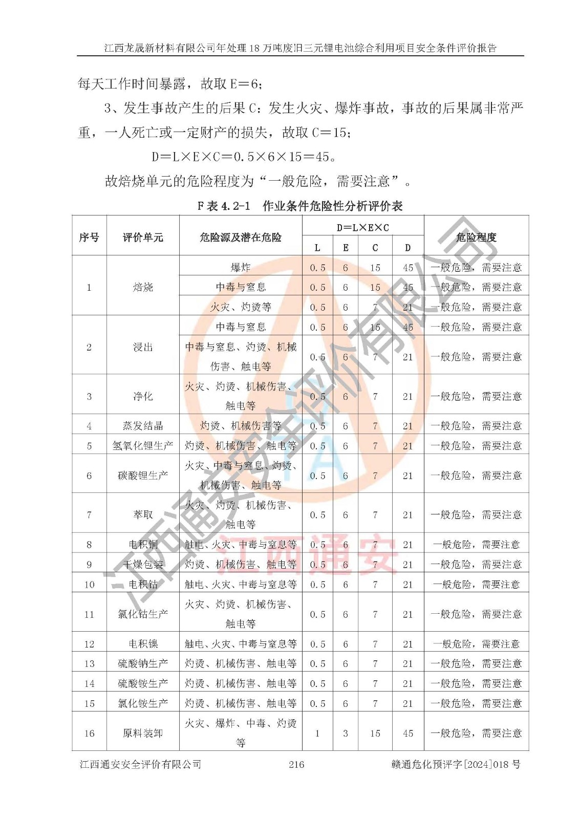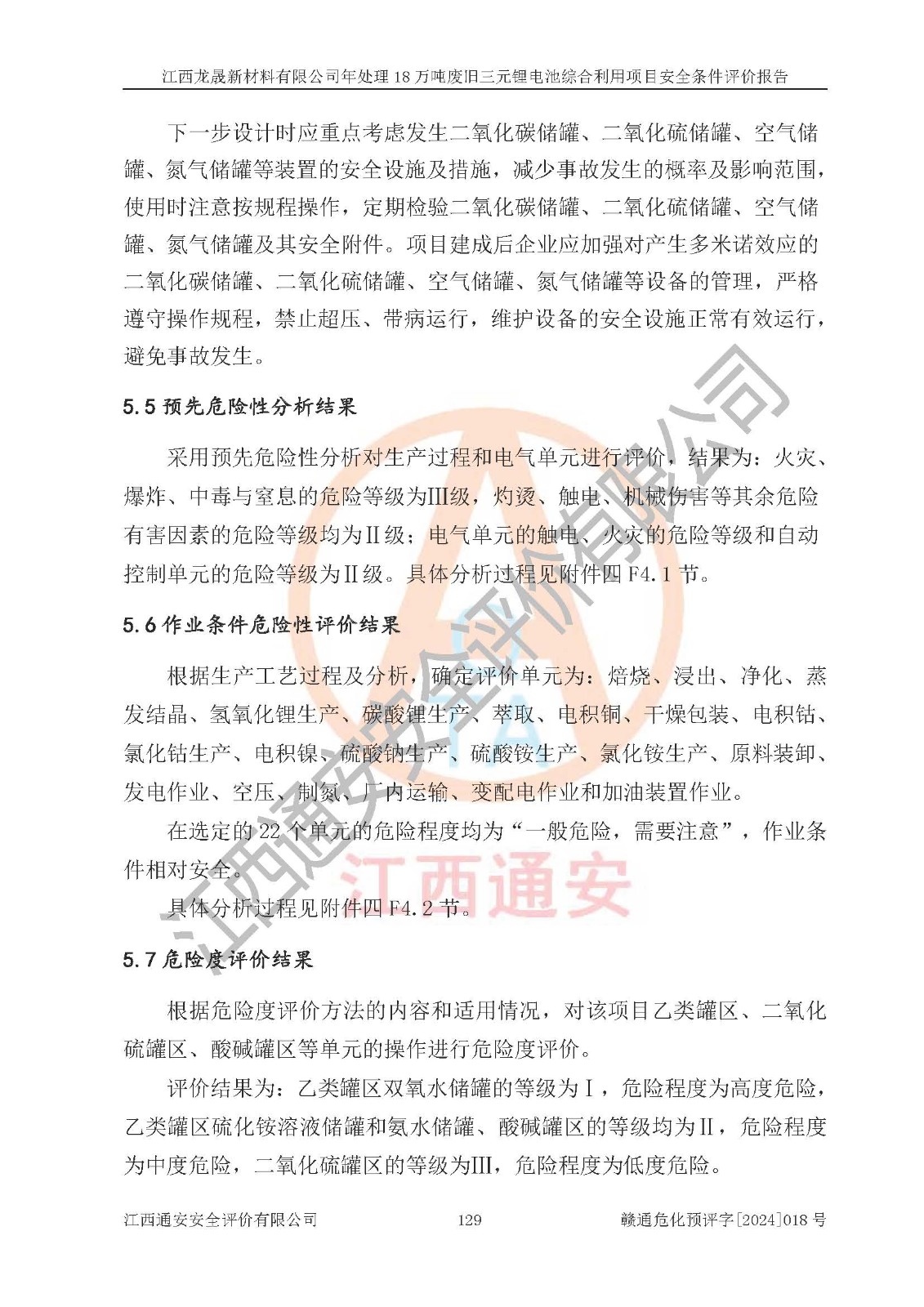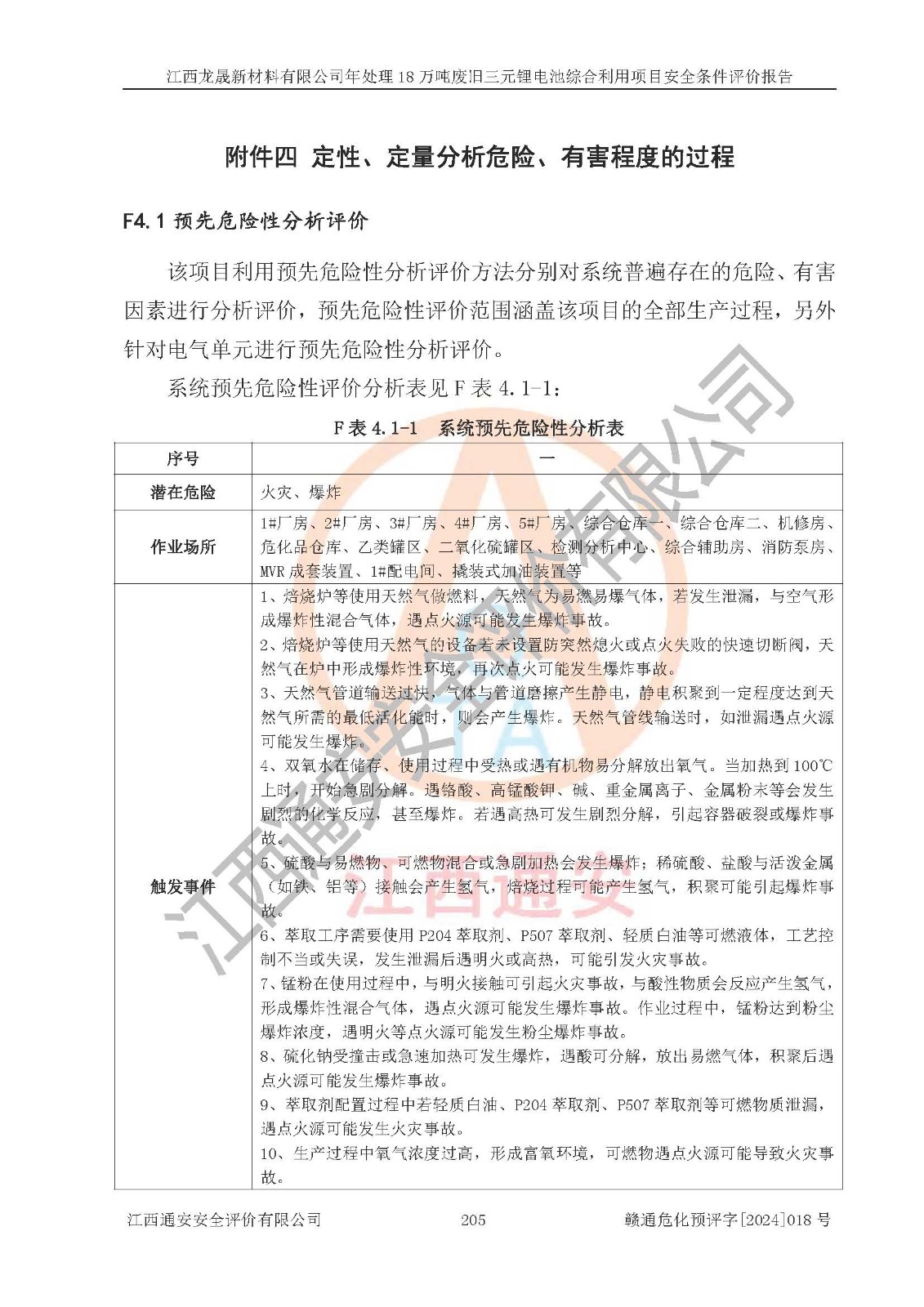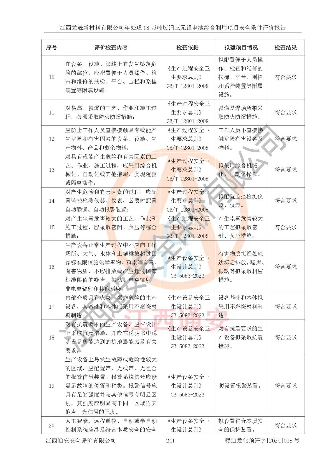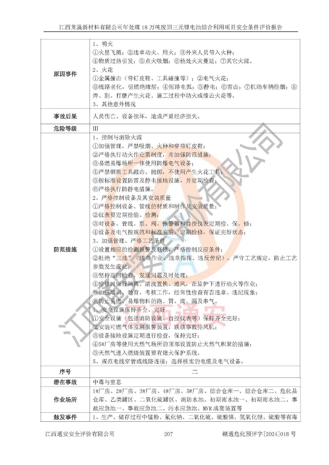 评价结论 | 江西龙晟新材料有限公司年处理18万吨废旧三元锂电池综合利用项目在以后的初步设计、施工图设计和建设施工、安装调试及生产运行中,如能严格执行**有关安全生产的法律法规、规章、标准、规范,认真落实项目可行性研究报告提出的安全对策措施,并合理采纳本报告中提出的安全对策措施及建议,真正做到安全设施与主体工程同时设计、同时施工、同时投入生产和使用,则工程潜在的危险、有害因素可得到**控制,风险在**控制和可接受范围内。 | |||