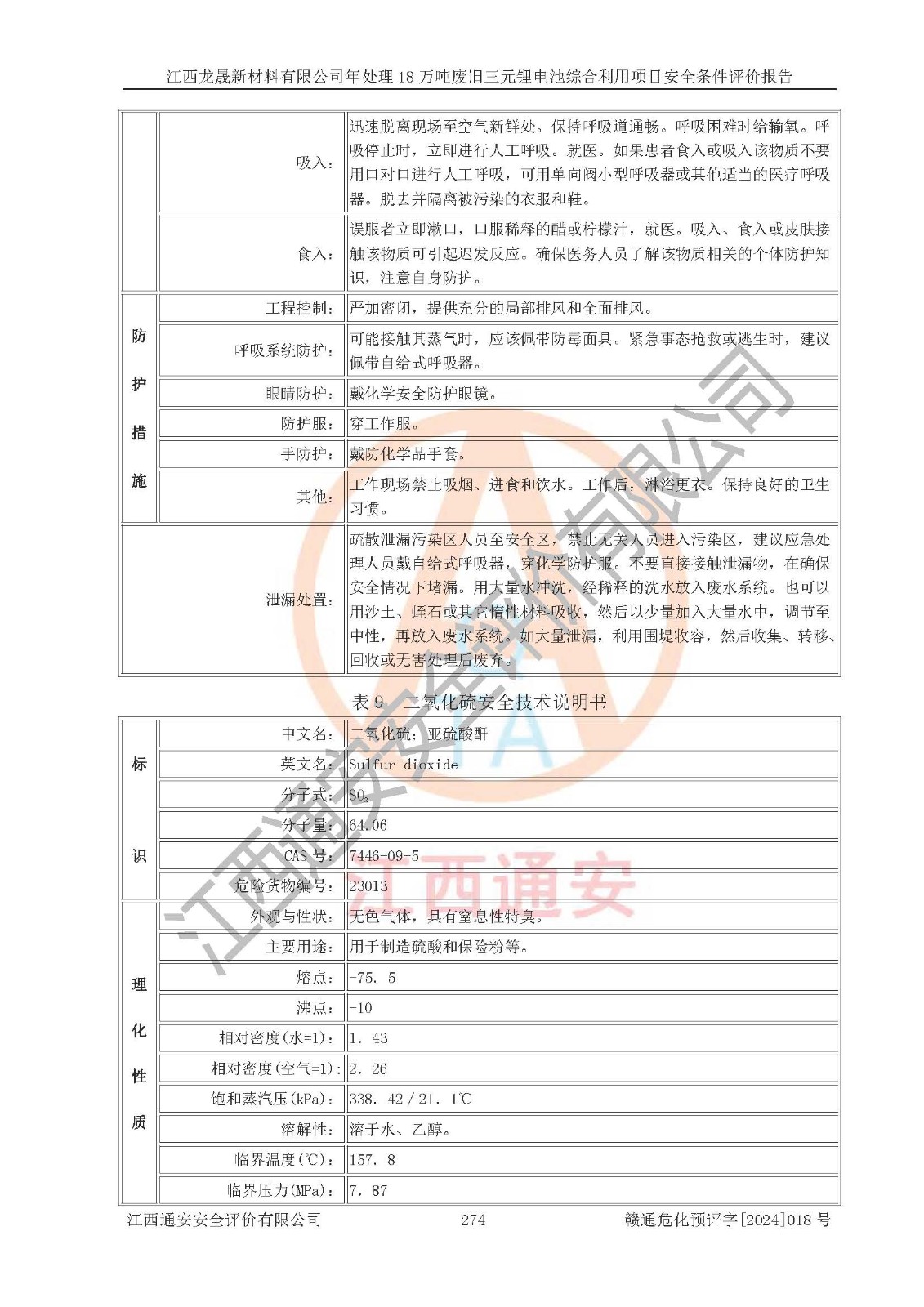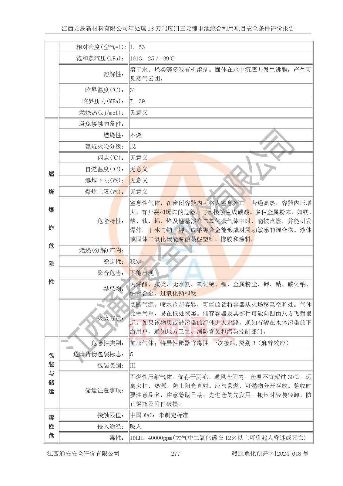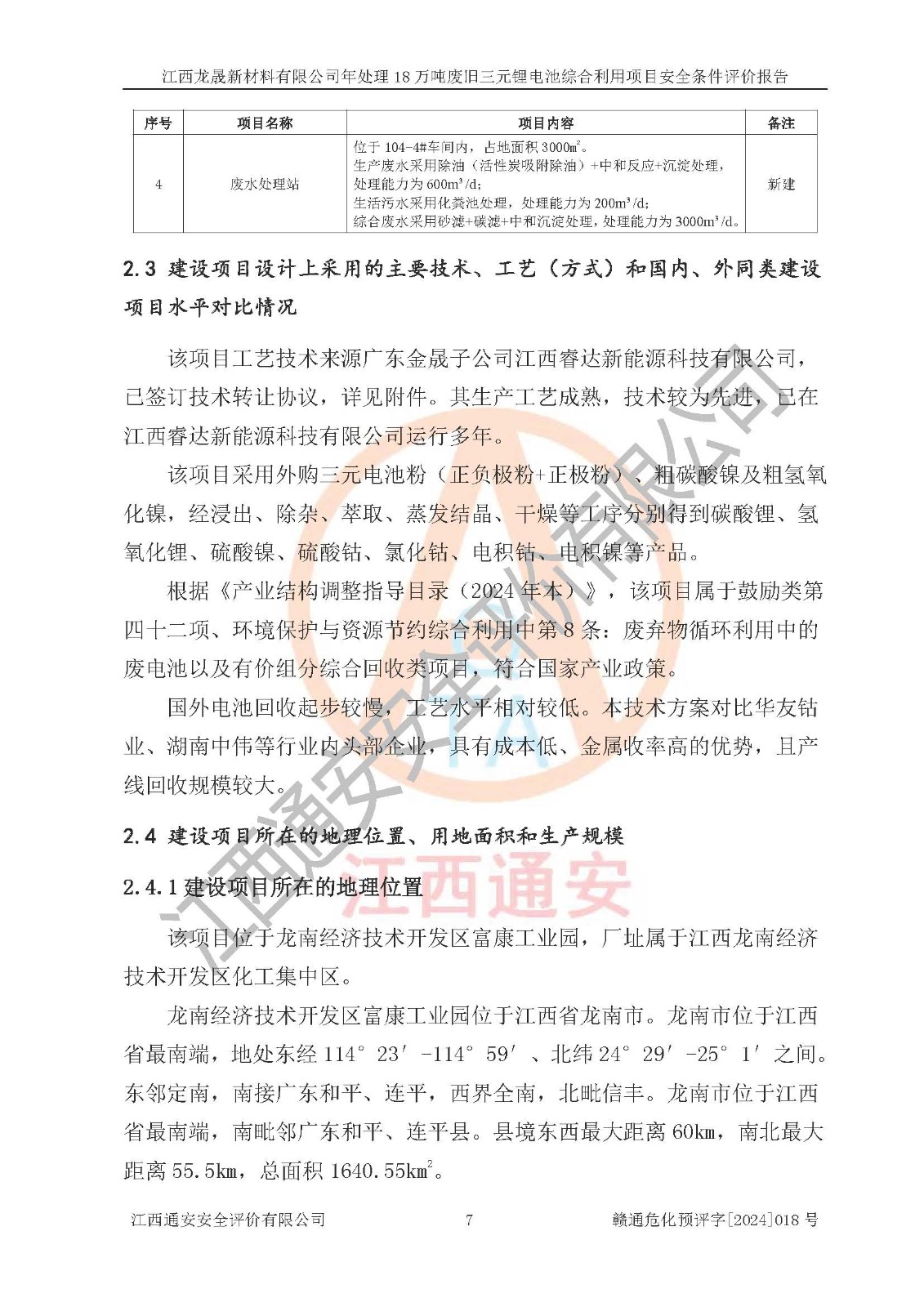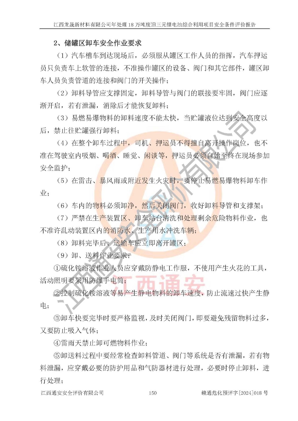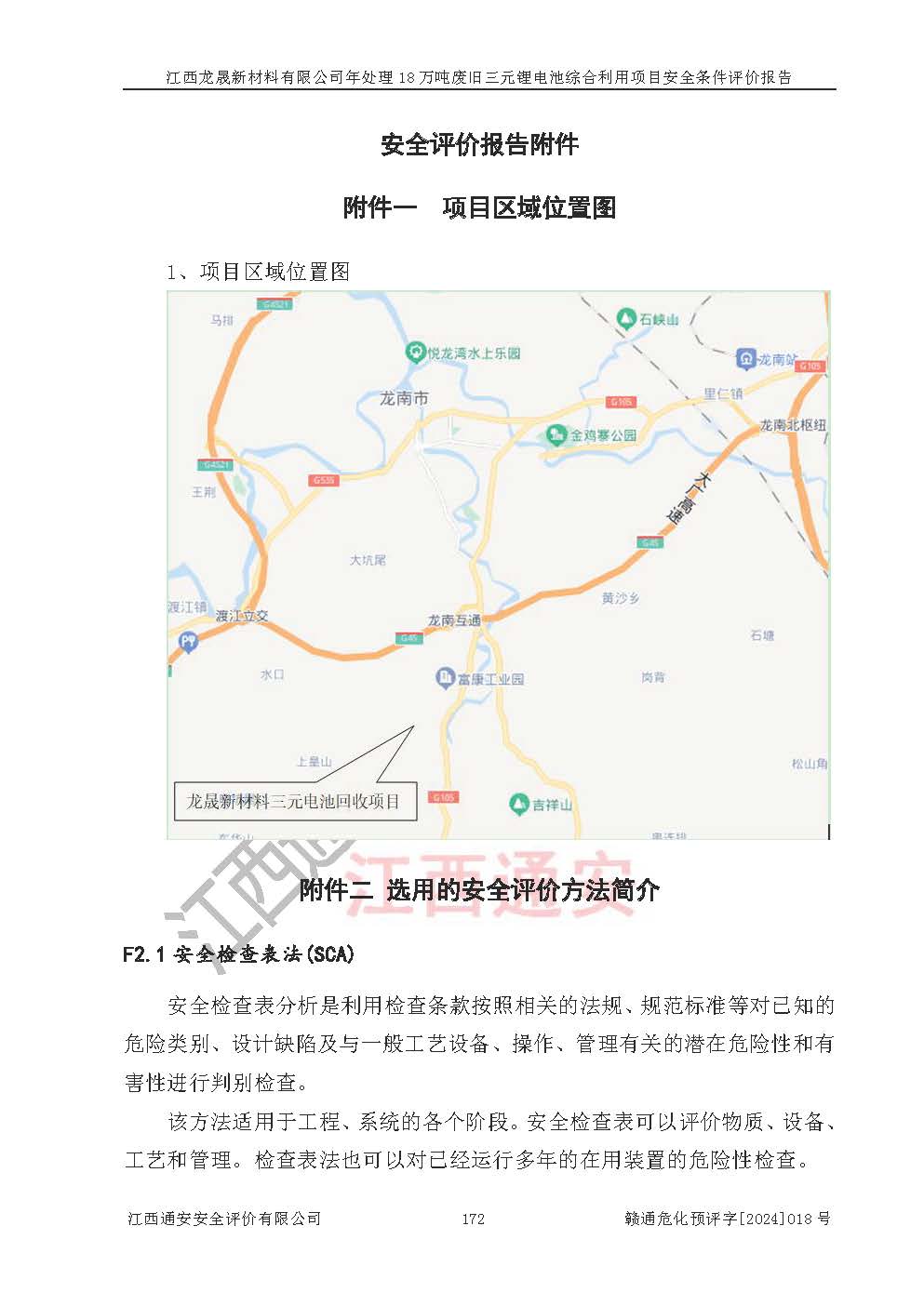评价结论 | 江西龙晟新材料有限公司年处理18万吨废旧三元锂电池综合利用项目在以后的初步设计、施工图设计和建设施工、安装调试及生产运行中,如能严格执行**有关安全生产的法律法规、规章、标准、规范,认真落实项目可行性研究报告提出的安全对策措施,并合理采纳本报告中提出的安全对策措施及建议,真正做到安全设施与主体工程同时设计、同时施工、同时投入生产和使用,则工程潜在的危险、有害因素可得到**控制,风险在**控制和可接受范围内。 | |||