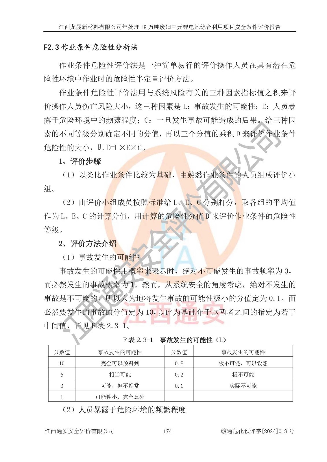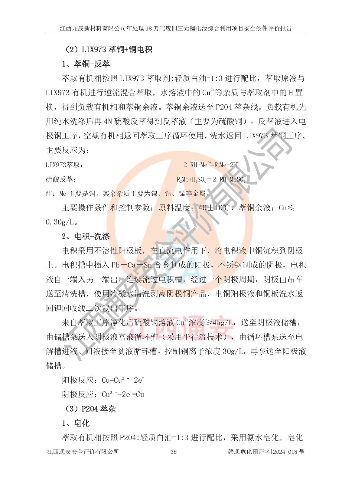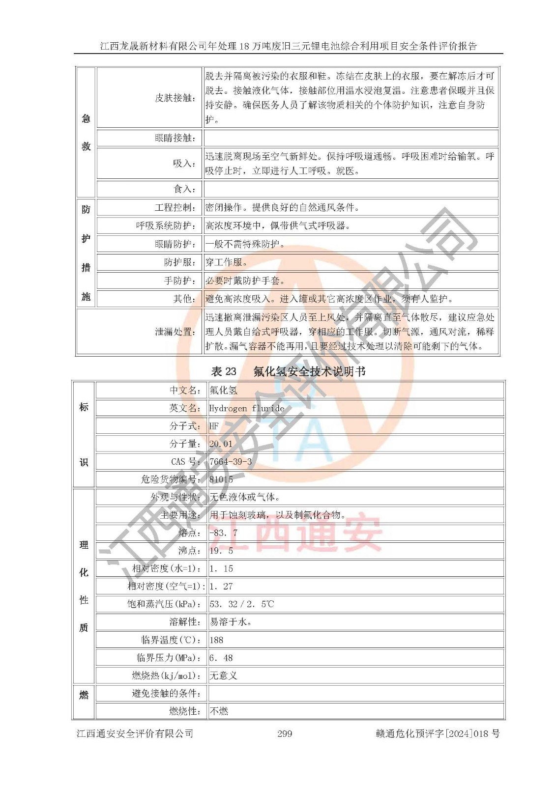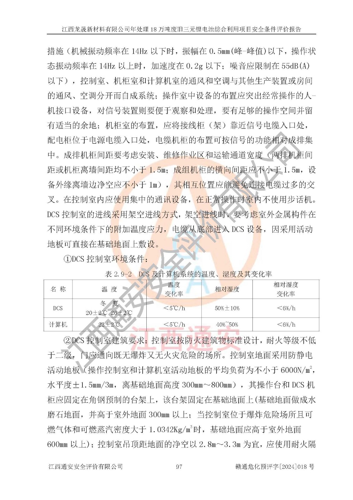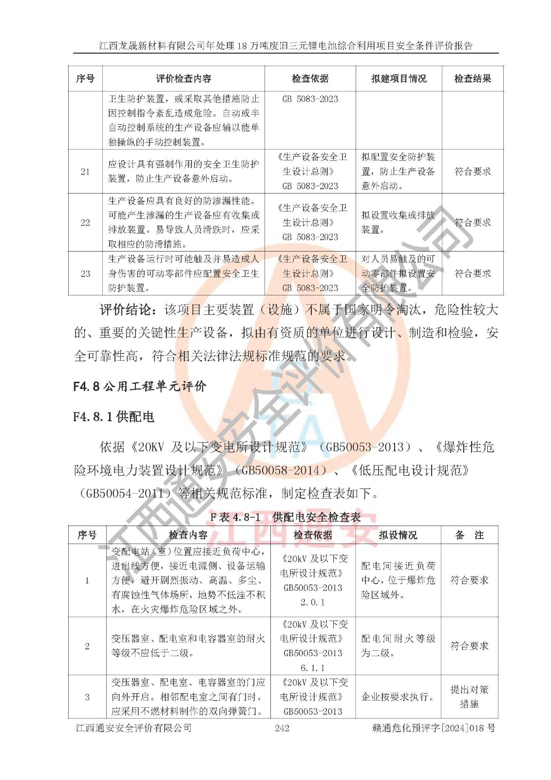 评价结论 | 江西龙晟新材料有限公司年处理18万吨废旧三元锂电池综合利用项目在以后的初步设计、施工图设计和建设施工、安装调试及生产运行中,如能严格执行**有关安全生产的法律法规、规章、标准、规范,认真落实项目可行性研究报告提出的安全对策措施,并合理采纳本报告中提出的安全对策措施及建议,真正做到安全设施与主体工程同时设计、同时施工、同时投入生产和使用,则工程潜在的危险、有害因素可得到**控制,风险在**控制和可接受范围内。 | |||