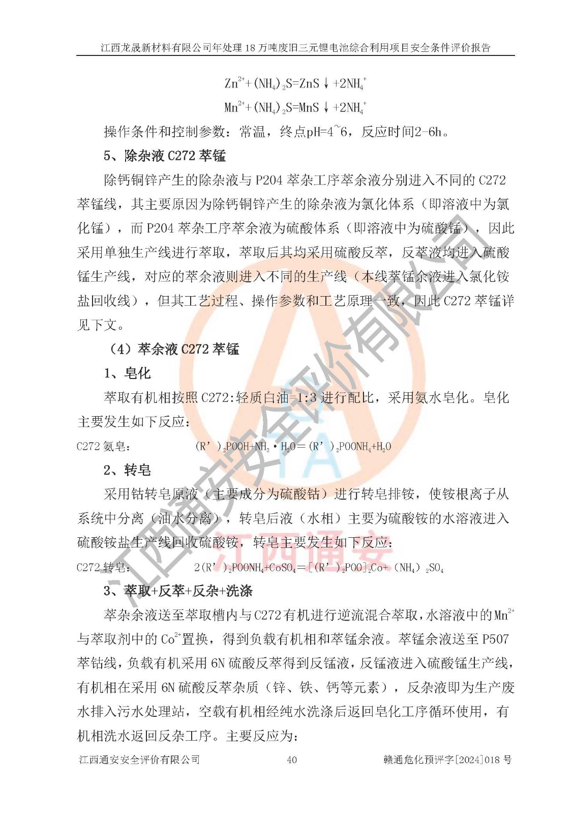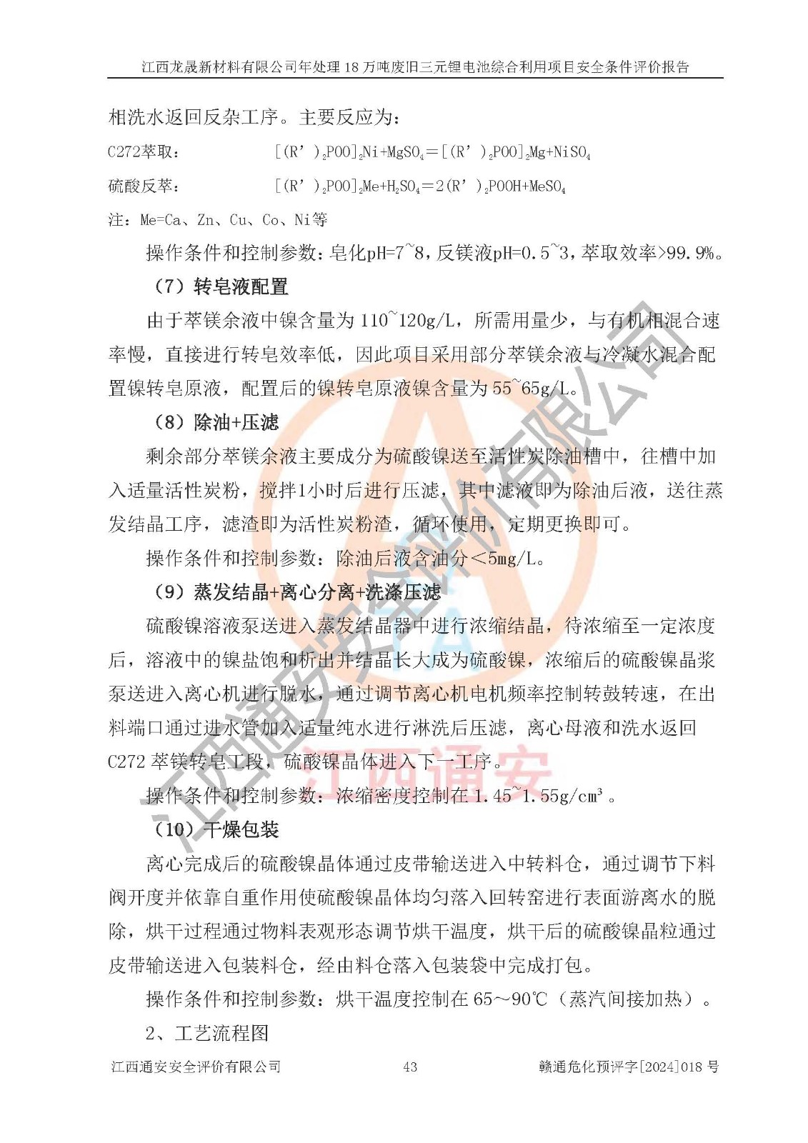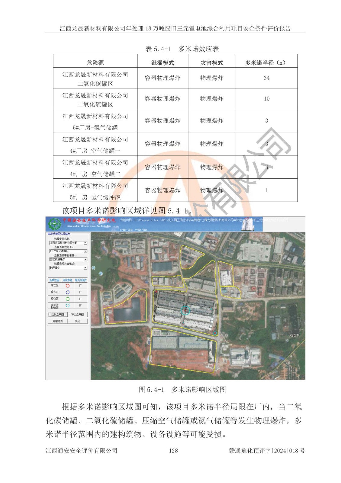 项目简介 | 江西龙晟新材料有限公司(以下简称龙晟新材料公司)成立于2022年11月16日,法定**人为李森,注册资本壹亿元整,经营范围为新能源汽车废旧动力蓄电池回收及梯次利用(不含危险废物经营)、电子**材料研发、电子**材料制造、基础化学原料制造(不含危险化学品等许可类化学品的制造)等。 江西龙晟新材料有限公司年处理18万吨废旧三元锂电池综合利用项目2023年4月3日取得了建设用地规划许可证,2023年04月13日取得了备案通知书,委托江西通安安全评价有限公司编制了项目安全条件评价报告,并于2023年5月11日取得了安全条件审查的批复,委托广东政和工程有限公司编制了项目安全设施设计,并于2023年9月12日取得了安全设施设计审查的批复。依据《危险化学品建设项目安全监督管理办法》和《江西省应急管理厅关于印发<江西省危险化学品建设项目安全监督管理实施细则>(试行)的通知》等规定,因建设项目的工艺路线、产品方案及规模等发生重大变化,建设单位应当重新进行安全评价。 江西龙晟新材料有限公司2024年09月25日对年处理18万吨废旧三元锂电池综合利用项目备案文件进行了变更,建设地点位于龙南经济技术开发区富康工业园,厂址属于省级认定的化工集中区。该项目生产过程中涉及使用的原辅材料有三元正负极粉、三元极片粉、粗氢氧化镍、粗碳酸镍、粗碳酸锂、除氟剂、锰粉、硫化钠、硫酸、双氧水、纯碱、液碱(氢氧化钠)、LIX973萃取剂、P204萃取剂、P507萃取剂、C272萃取剂、锂萃取剂、轻质白油、活性炭粉、盐酸、氨水、碳酸氢铵、还原性碳粉、二氧化硫、二氧化碳、碳酸钙、硼酸、硫酸亚铁、亚硫酸铵、树脂、电极板、硫化铵溶液、硫化钡、氟化钠、高锰酸钾、柴油、天然气(燃料)和氮气,尾气中含有氟化氢和氢气,产品为硫酸镍、电积镍、硫酸钴、电积钴、电积铜、硫酸锰、氢氧化锂、氯化钴、碳酸锂、无水硫酸钠、粗制石墨粉、硫酸铵和氯化铵。经辨识,锰粉、硫化钠、硫酸、双氧水、氢氧化钠、P204萃取剂、盐酸、氨水、二氧化硫、二氧化碳、硼酸、硫化铵溶液、硫化钡、氟化钠、高锰酸钾、柴油、天然气(燃料)、氟化氢(尾气)、氢气(尾气)、氮气、硫酸镍、硫酸钴、氢氧化锂和氯化钴属于危险化学品,硫酸、盐酸和高锰酸钾属于易制毒化学品,双氧水和高锰酸钾属于易制爆危险化学品,锰粉、氟化钠、硫酸镍和氟化氢(尾气)属于高毒物品,二氧化硫、天然气(燃料)、氟化氢(尾气)和氢气(尾气)属于重点监管的危险化学品,不涉及重点监管的危险化工工艺,生产、储存单元均不构成危险化学品重大危险源。该项目生产过程中主要的危险有害因素为火灾、爆炸、中毒与窒息、灼烫。根据《安全生产许可证条例》、《危险化学品安全管理条例》和《危险化学品生产企业安全生产许可实施办法》等相关规定,该项目产品中硫酸镍、硫酸钴、氢氧化锂和氯化钴属于危险化学品,需要办理危险化学品安全生产许可证。 | |||