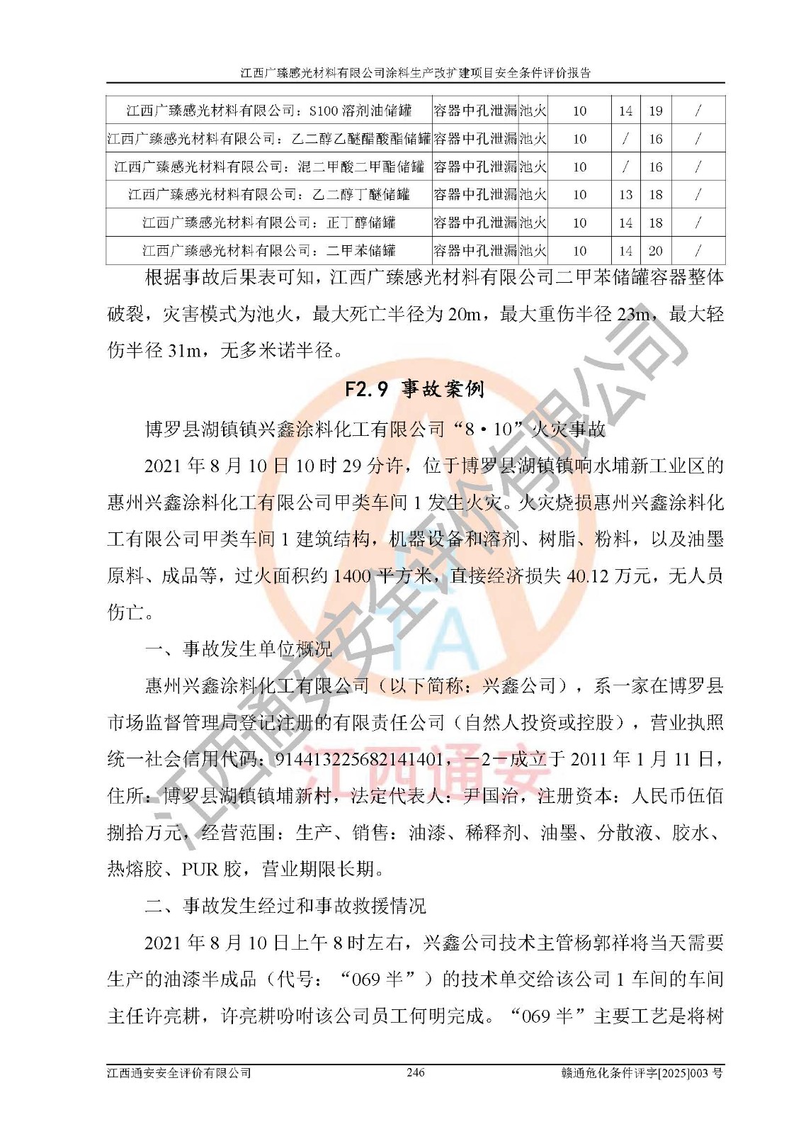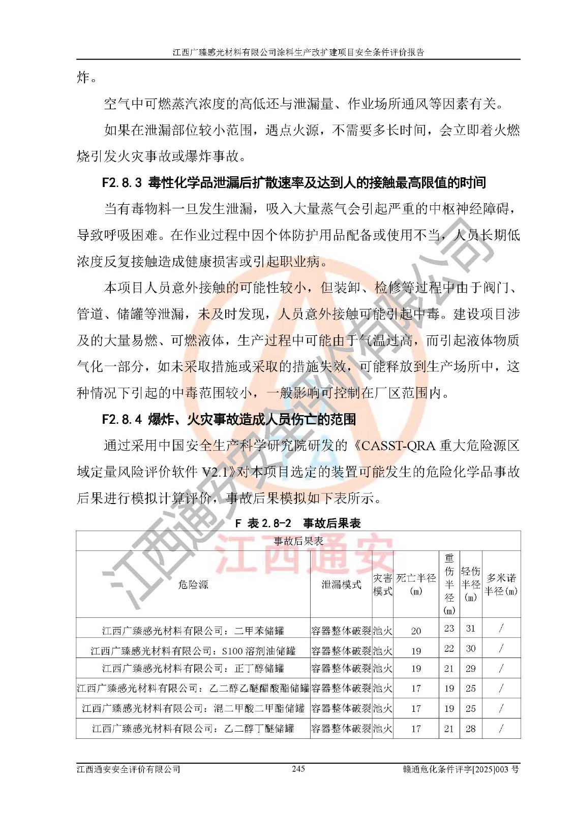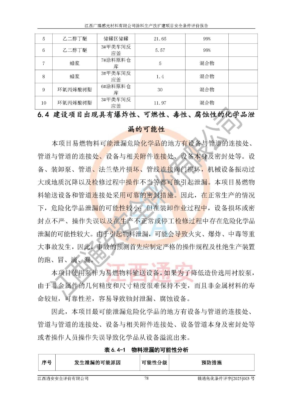 1)本项目取得了龙南市行政审批局下发的《江西省工业企业技术改造项目备案通知书》(项目统一代码为:2408-360727-07-02-3253323)、《建设用地规划许可证》、龙南市自然资源局出具对《关于为江西广臻年产2万吨涂料技改项目出具用地证明的函》的复函,符合地方产业发展规划的要求。 2)根据《危险化学品目录》(2015年版,十部委公告2022年第8号修订),本项目原辅料蜡浆、色浆、助剂、二甲苯、正丁醇、乙二醇丁醚、乙二醇乙醚醋酸酯、S100溶剂油、氮气[压缩的]及产品溶剂型涂料(色漆)属于危险化学品。本项目不涉及监控化学品、剧毒化学品、易制爆化学品、易制毒化学品、重点监管的危险化学品、特别管控危险化学品、高毒物品。本项目不涉及重点监管的危险化工工艺。 3)根据《危险化学品重大危险源辨识》(GB18218-2018),该项目未构成危险化学品重大危险源。 4)项目存在的主要危险因素有:火灾爆炸、容器爆炸、中毒窒息、灼烫、触电、**伤害、机械伤害、高处坠落、物体打击、淹溺等,存在的主要危害因素有:噪声与振动、高温、有害化学物质等;引起事故的原因有人的不安全行为、物的不安全状态、管理缺陷和环境不良。其中*主要的危险有害因素是火灾爆炸。 5)采用预先危险性分析法评价,结果为: (1)通过预先危险(PHA)分析可知,项目厂址及总体布局单元存在周边环境相互影响,发生异常情况,可对周边企业生产经营活动、人员活动产生影响;存在自然条件影响,可因雷击、暴雨等引起事故;存在**伤害、建筑物危害,其固有的危险性等级为Ⅱ级,属于“临界的”,应予以排除、采取控制措施因素。 (2)生产作业存在的危险因素包括火灾爆炸、触电、灼烫、中毒窒息固有的危险等级为Ⅲ级,属于“危险的”,可能导致人员伤亡和系统损坏的因素,需要采取防范和对策措施的因素;其它危险因素固有的危险等级为Ⅱ级,属于“临界的”,应予以排除、采取控制措施因素。 (3)生产作业存在的噪声、粉尘、高温、有害化学物质的危险有害因素等级为Ⅱ级,属于“临界的”,应予以排除、采取控制措施因素。 6)危险度评价分析,结果为: 生产装置危险度评价分析:3#甲类车间为中度危险(Ⅱ级)。 储存单元危险度评价分析:1#涂料成品仓库为**危险(Ⅰ级)、5#涂料原料仓库为**危险(Ⅰ级)、6#涂料原料仓库为中度危险(Ⅱ级)、7#涂料原料仓库为中度危险(Ⅱ级)、9#危废仓库为中度危险(Ⅱ级)、2#丙类原料仓库为中度危险(Ⅱ级)、甲类罐区为**危险(Ⅰ级)。 7)作业条件危险性评价结果:在选定的评价单元中,其危险分值均在70以下,危险程度基本属于“可能危险”、“稍有危险”范围,作业条件相对安全。企业经营过程中首先应重点加强对甲类生产车间、甲类仓库、储罐区的危险因素的严格控制,注重日常安全管理;其次要建立健全完善的安全生产责任制、安全管理制度、安全技术操作规程并**其贯彻落实;第三要认真抓好操作人员、管理人员的安全知识和操作技能的培训,**人员具有与工程技术水平相适应的技术素质和安全素质,**安全作业。 8)项目建设场地符合当地规划要求,建设场地通过合理规划,其选址、周边环境、总平面布置、交通运输等能符合《中华人民共和国安全生产法》《危险化学品安全管理条例》《建筑设计防火规范》《精细化工企业工程设计防火标准》等法规、标准、规范要求。 厂址地区地震活动相对较弱,灾害性天气出现频率稍高,自然灾害对项目建设具有**影响,通过采取相应的防护措施,自然条件适宜建设。 9)建设项目符合**产业政策的要求;选择工艺为现行成熟工艺,其安全可靠性可得到**。 10)本报告已根据有关安全生产法律、法规、规章和**标准、行业标准,并严格执行省委办公厅省**办公厅《关于全面加强危险化学品安全生产工作的实施意见》(赣办发[2020]32号)及鄱阳湖生态经济区、长江经济带、“五河一湖”相关政策规定,客观、公正、科学地进行安全评价,项目符合《江西省应急管理厅关于印发《江西省危险化学品建设项目安全监督管理实施细则》(试行)的通知》(赣应急字[2021]100号)的要求。 11)本报告结合工艺特征,提出应采取的对应的自动化控制系统及自动化实施方案,满足《江西省应急管理厅关于印发《江西省化工企业自动化提升实施方案》(试行)的通知》(赣应急字[2021]190号)的要求。 综上所述:江西广臻感光材料有限公司涂料生产改扩建项目的产业政策、安全条件、厂址、总体布局、主要技术和工艺、装置、设施、配套和辅助工程、安全管理等均满足安全生产相关法律法规、标准规范的要求,该建设项目的危险、有害因素可得到**控制,风险在可接受范围内,具有**的本质安全水平。企业应认真落实本报告提出的安全对策与建议,在下一步设计、建设施工过程中严把质量关、严格施工安全管理和检查,使各项安全措施落实到实处,且严格执行建设项目安全设施“三同时”的规定,建立**的事故应急体系和措施。 |