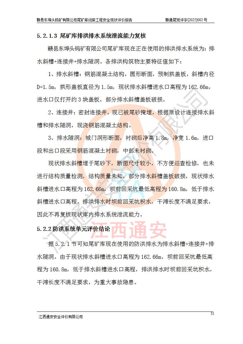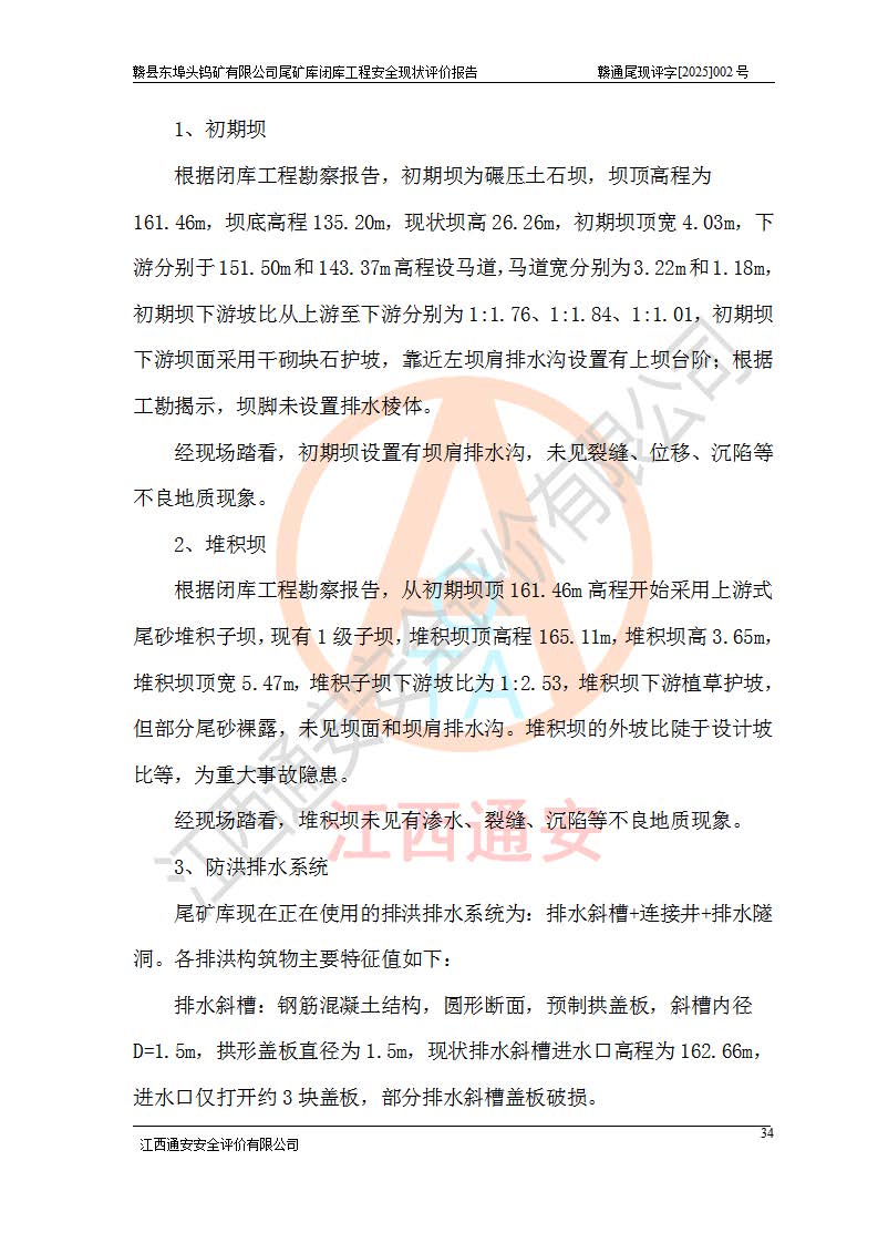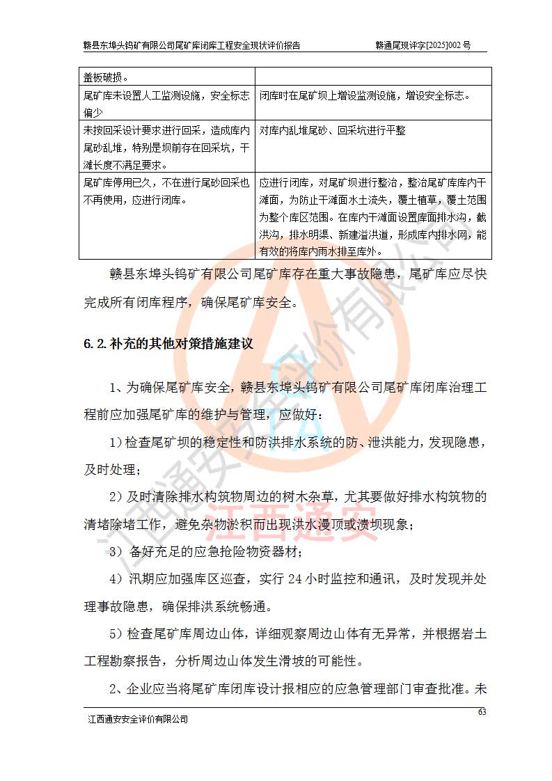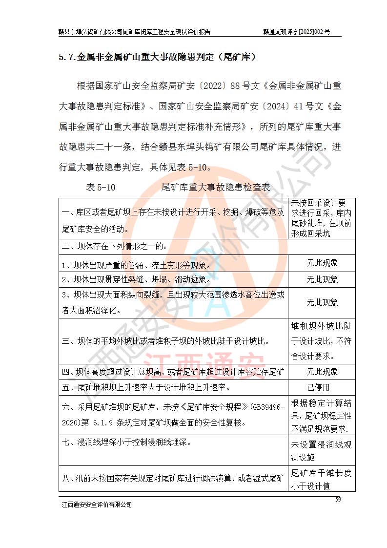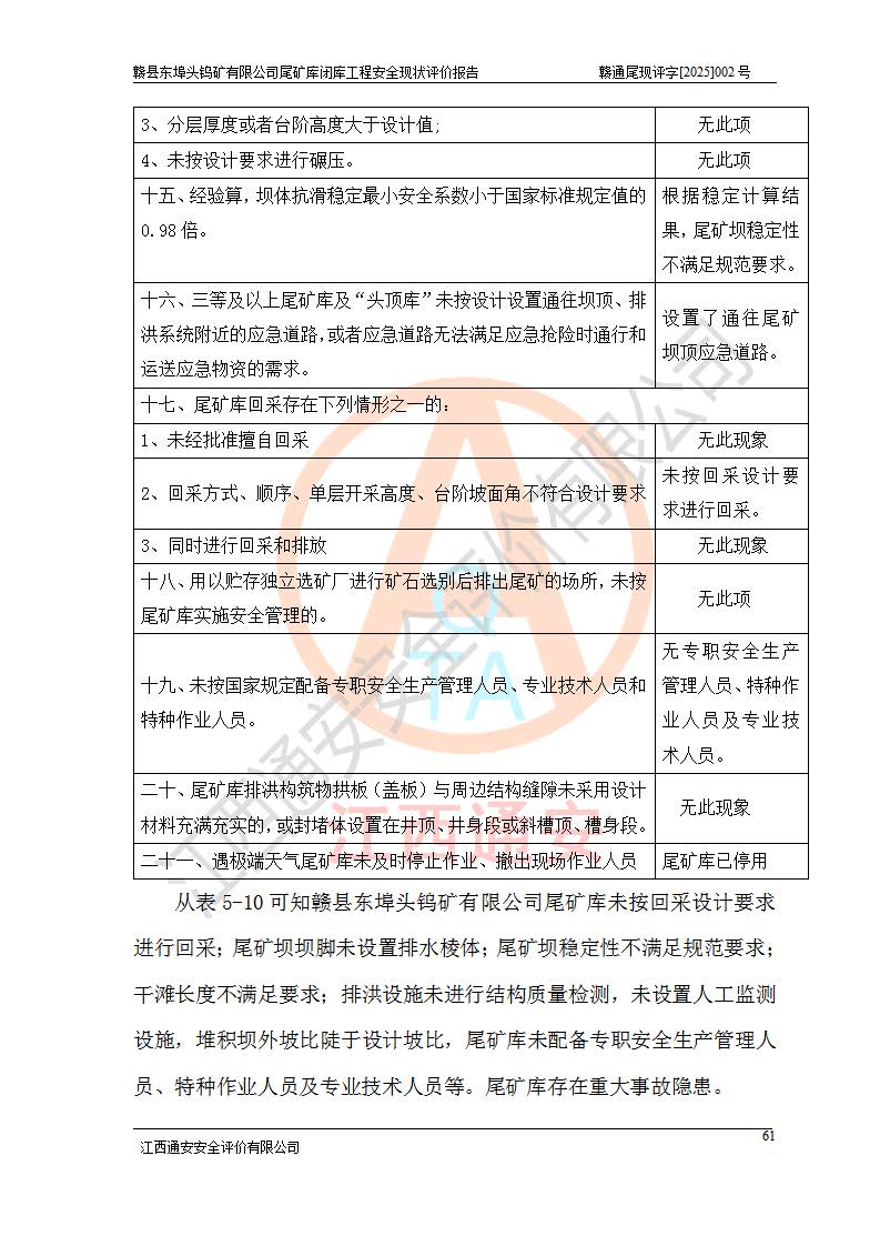 评价结论 | 赣县东埠头钨矿有限公司尾矿库未按回采设计要求进行回采;尾矿坝坝脚未设置排水棱体;尾矿坝稳定性不满足规范要求;干滩长度不满足要求;排洪设施未进行结构质量检测,未设置人工监测设施,堆积坝外坡比陡于设计坡比,尾矿库未配备专职安全生产管理人员、特种作业人员及专业技术人员等。根据**矿山安全监察局矿安〔2022〕88号文《金属非金属矿山重大事故隐患判定标准》、**矿山安全监察局矿安〔2024〕41号文《金属非金属矿山重大事故隐患判定标准补充情形》,尾矿库存在重大事故隐患。赣县东埠头钨矿有限公司尾矿库应尽快完成所有闭库程序,闭库设计应按正常运行标准进行闭库整治设计,**尾矿库防洪能力和尾矿坝稳定性满足规程要求,维持尾矿库闭库后长期安全稳定。 | |||