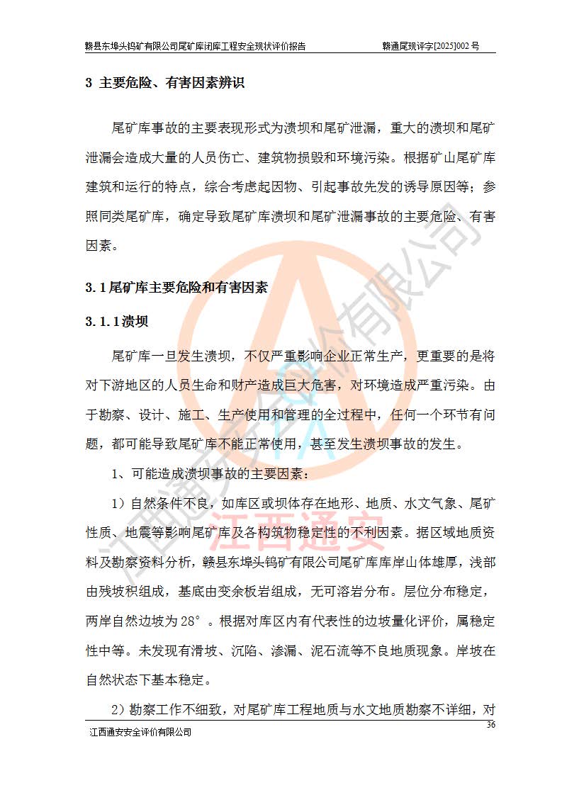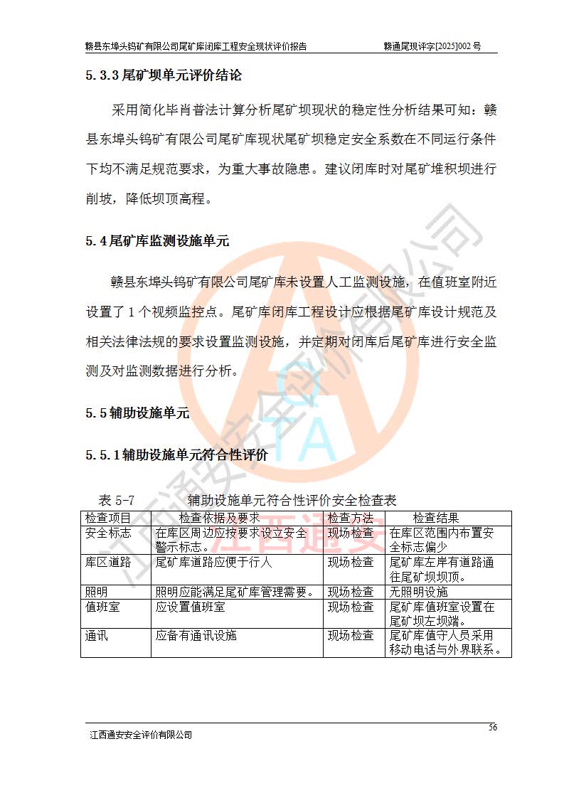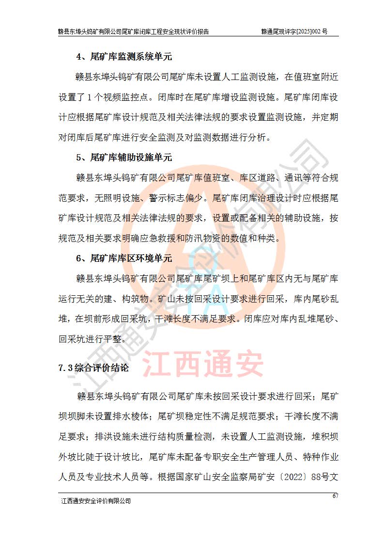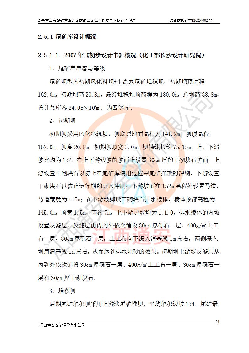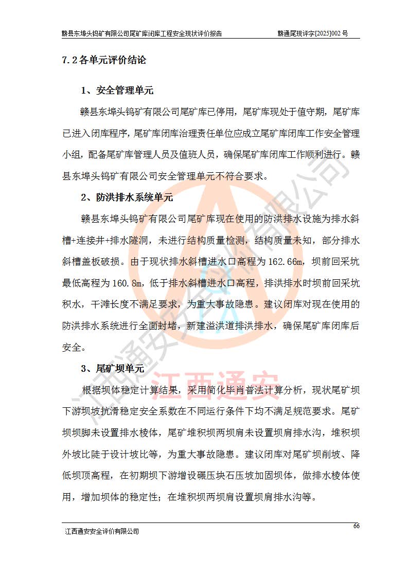 评价结论 | 赣县东埠头钨矿有限公司尾矿库未按回采设计要求进行回采;尾矿坝坝脚未设置排水棱体;尾矿坝稳定性不满足规范要求;干滩长度不满足要求;排洪设施未进行结构质量检测,未设置人工监测设施,堆积坝外坡比陡于设计坡比,尾矿库未配备专职安全生产管理人员、特种作业人员及专业技术人员等。根据**矿山安全监察局矿安〔2022〕88号文《金属非金属矿山重大事故隐患判定标准》、**矿山安全监察局矿安〔2024〕41号文《金属非金属矿山重大事故隐患判定标准补充情形》,尾矿库存在重大事故隐患。赣县东埠头钨矿有限公司尾矿库应尽快完成所有闭库程序,闭库设计应按正常运行标准进行闭库整治设计,**尾矿库防洪能力和尾矿坝稳定性满足规程要求,维持尾矿库闭库后长期安全稳定。 | |||