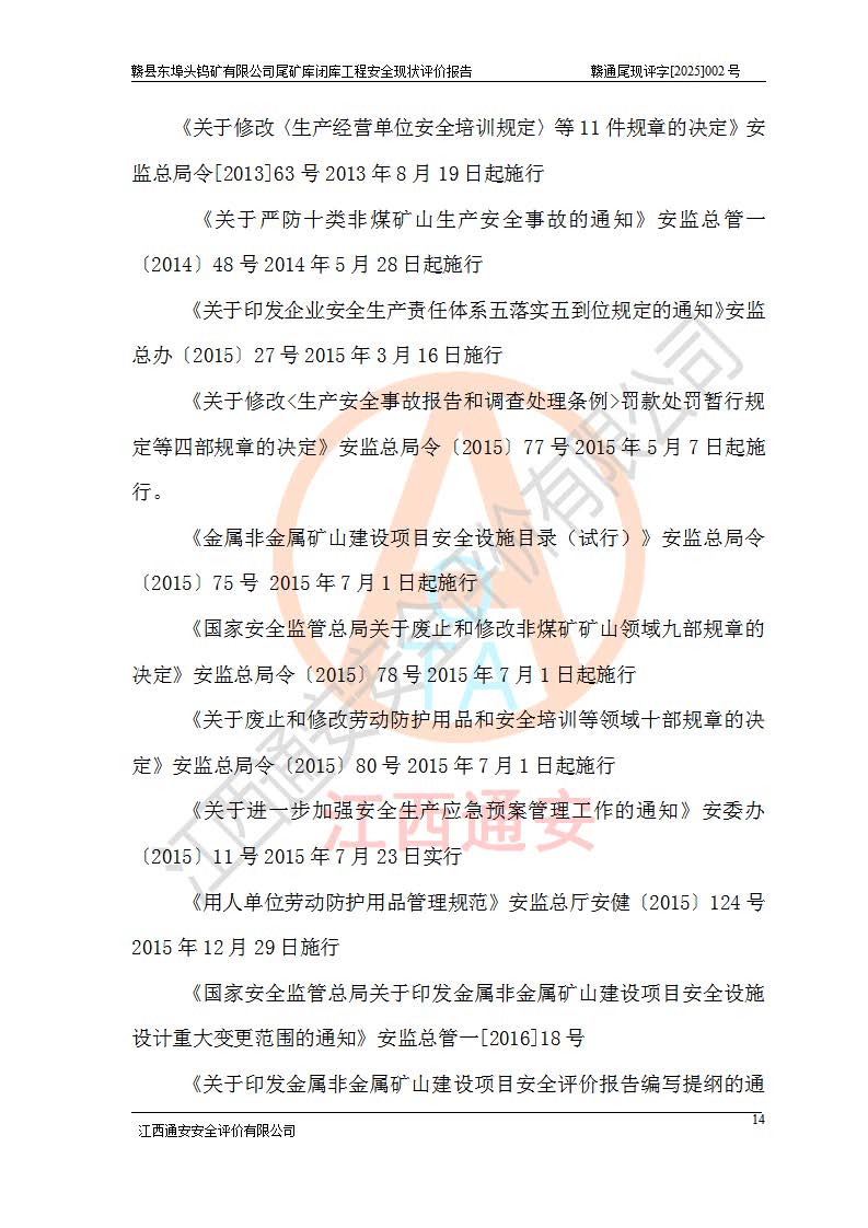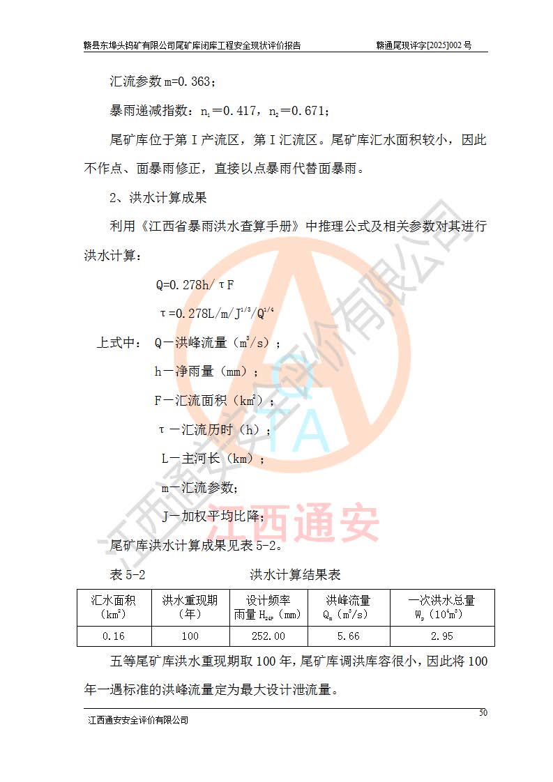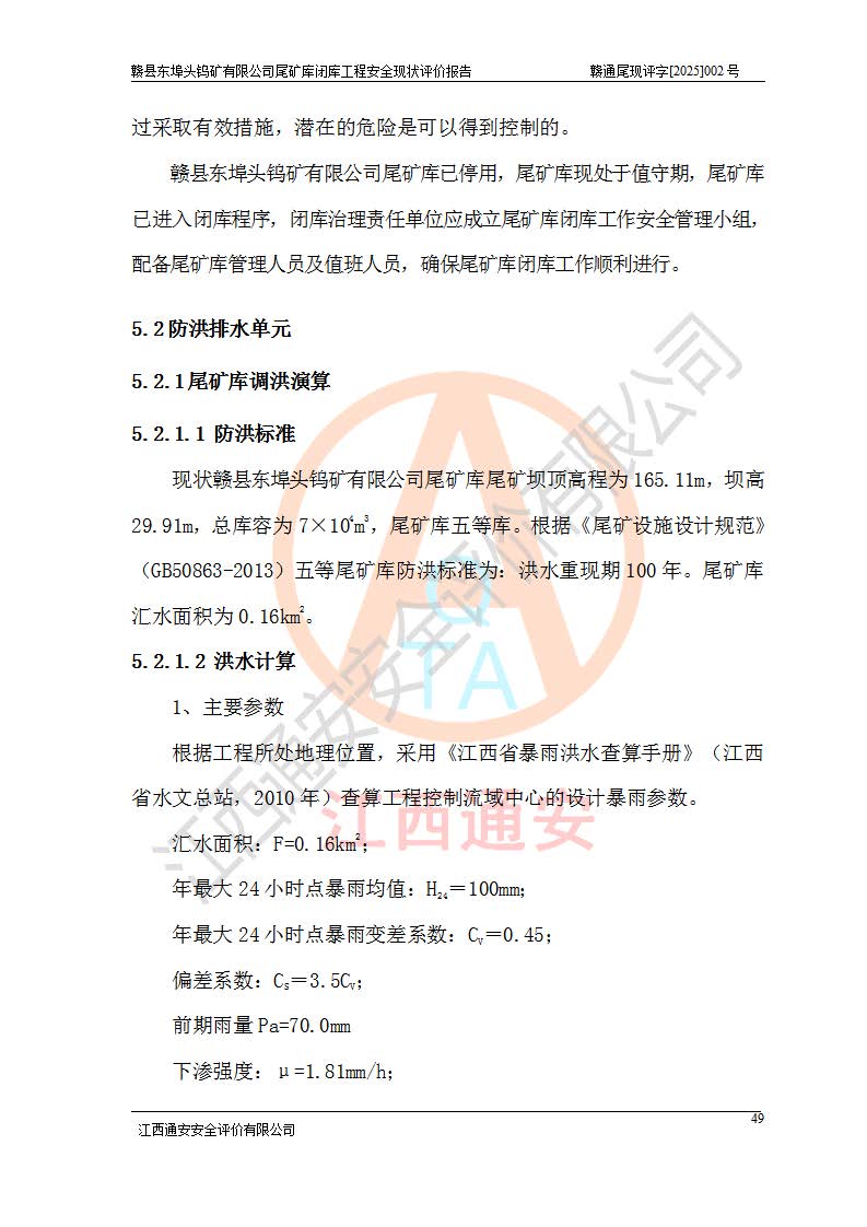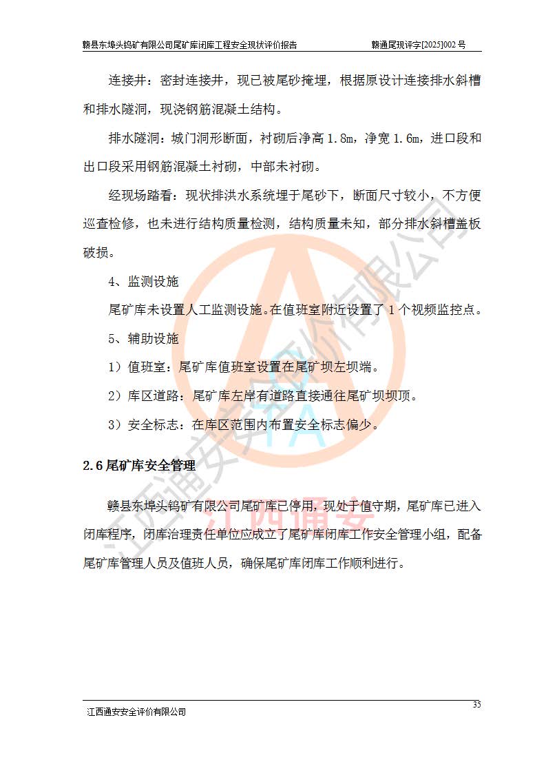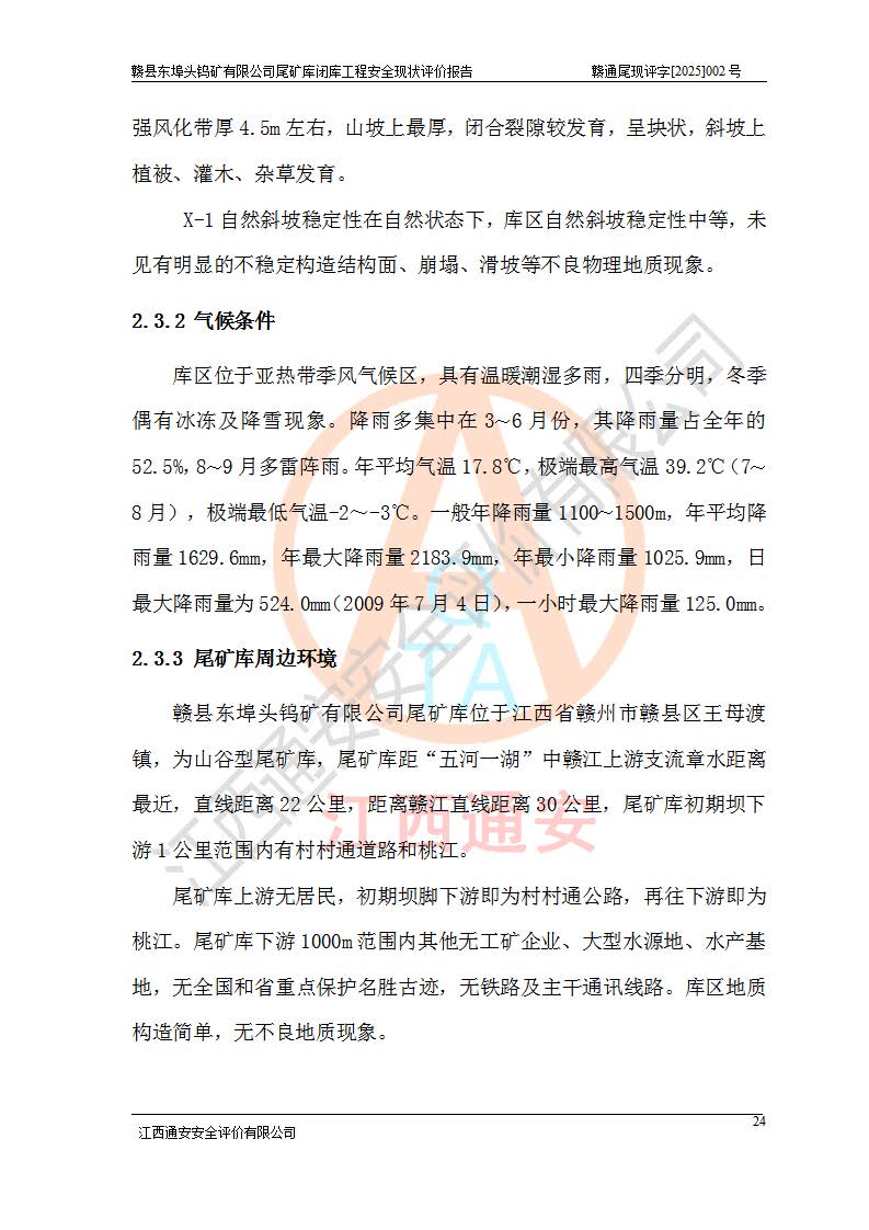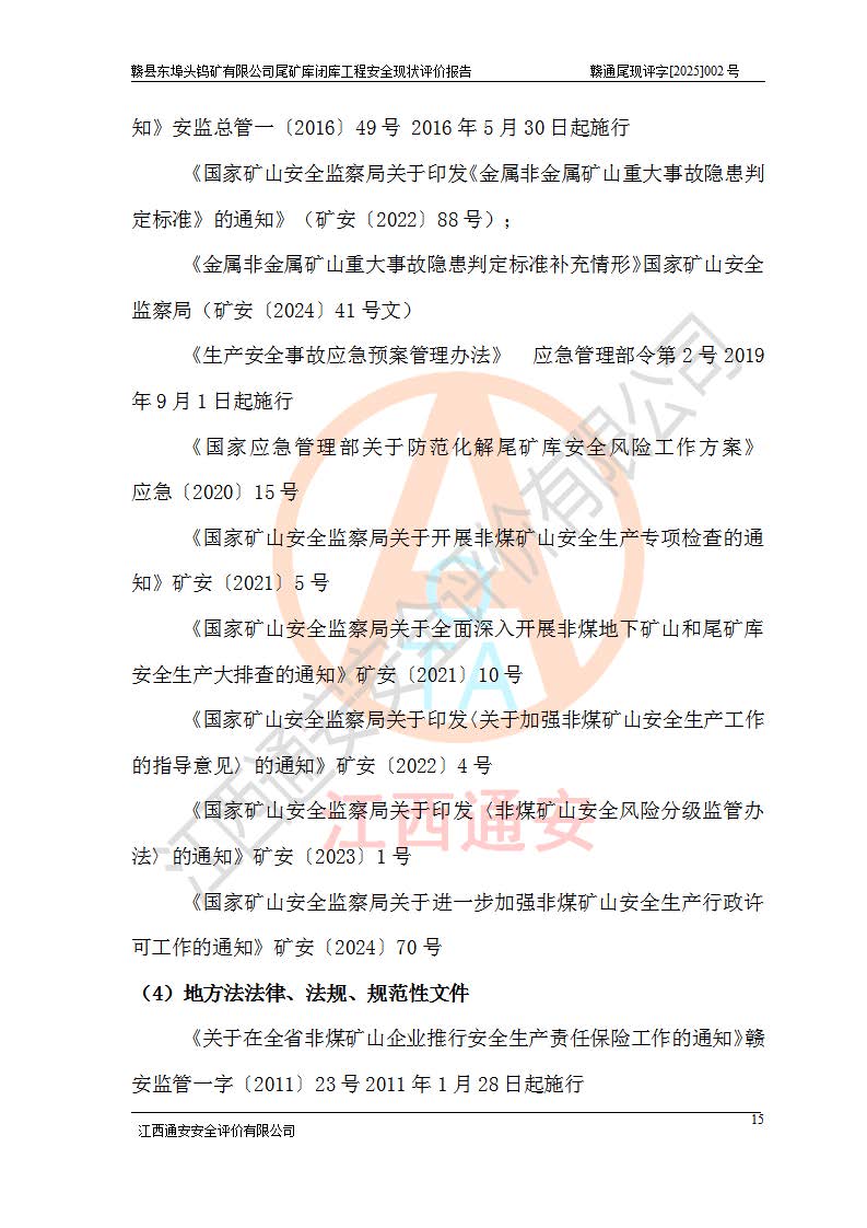 评价结论 | 赣县东埠头钨矿有限公司尾矿库未按回采设计要求进行回采;尾矿坝坝脚未设置排水棱体;尾矿坝稳定性不满足规范要求;干滩长度不满足要求;排洪设施未进行结构质量检测,未设置人工监测设施,堆积坝外坡比陡于设计坡比,尾矿库未配备专职安全生产管理人员、特种作业人员及专业技术人员等。根据**矿山安全监察局矿安〔2022〕88号文《金属非金属矿山重大事故隐患判定标准》、**矿山安全监察局矿安〔2024〕41号文《金属非金属矿山重大事故隐患判定标准补充情形》,尾矿库存在重大事故隐患。赣县东埠头钨矿有限公司尾矿库应尽快完成所有闭库程序,闭库设计应按正常运行标准进行闭库整治设计,**尾矿库防洪能力和尾矿坝稳定性满足规程要求,维持尾矿库闭库后长期安全稳定。 | |||