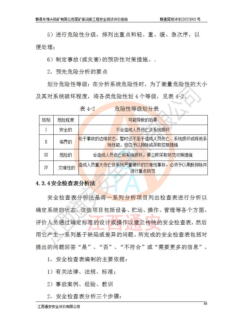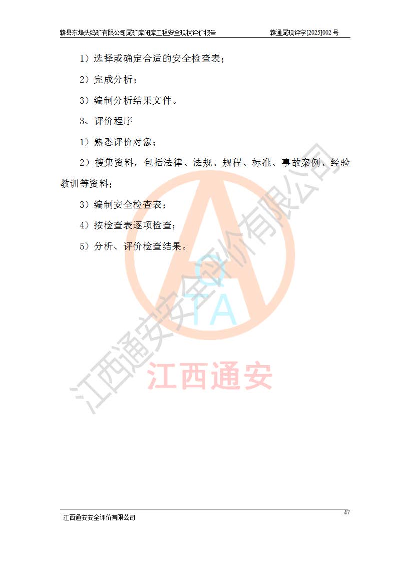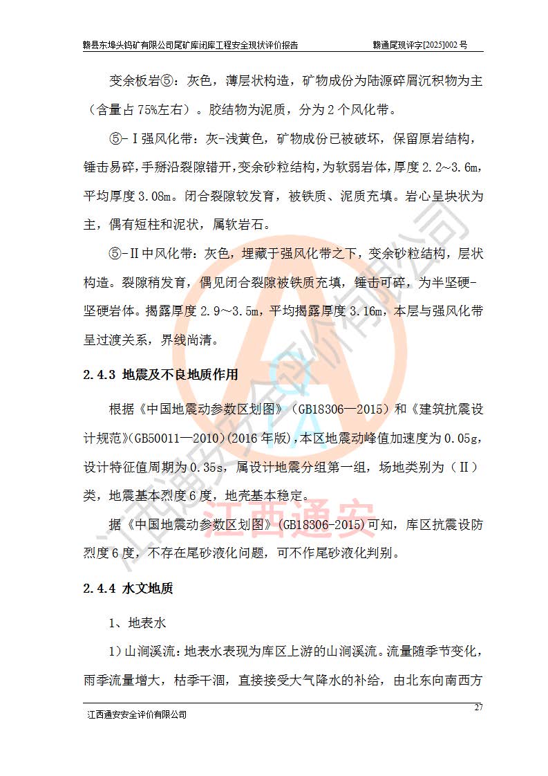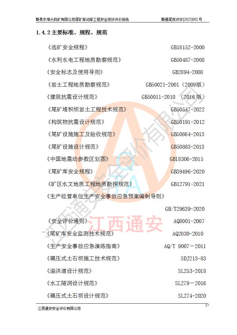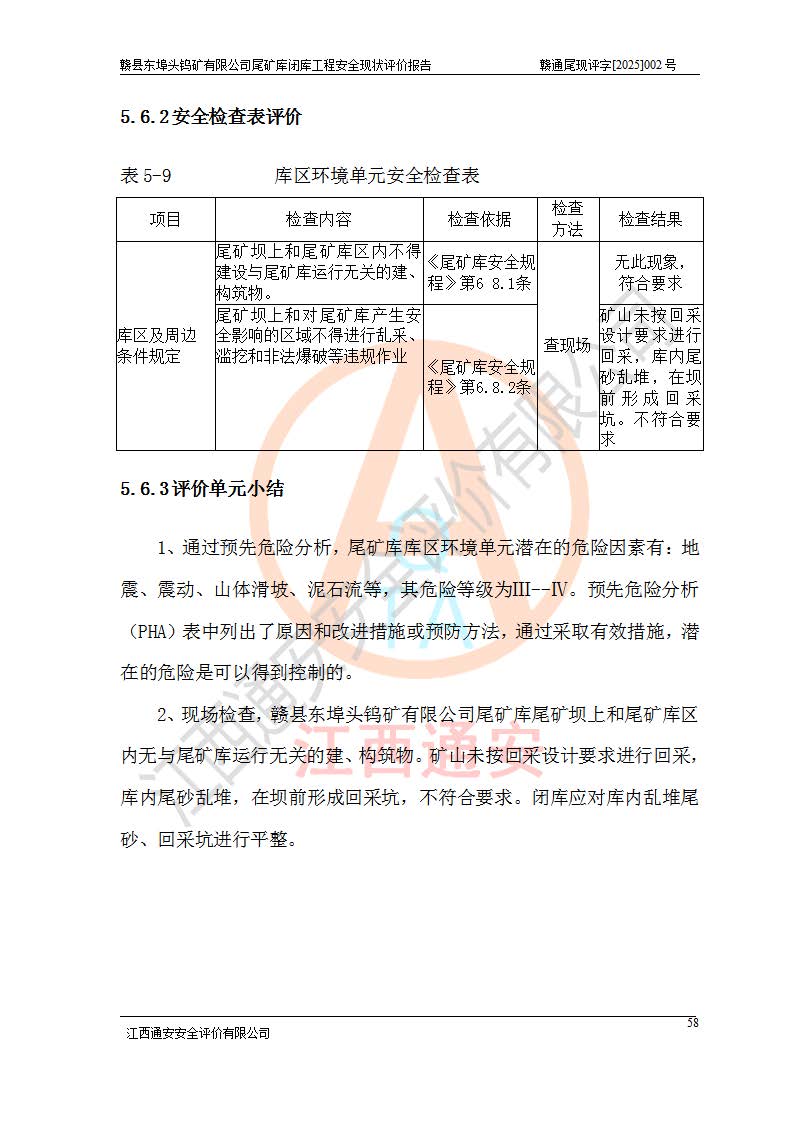 评价结论 | 赣县东埠头钨矿有限公司尾矿库未按回采设计要求进行回采;尾矿坝坝脚未设置排水棱体;尾矿坝稳定性不满足规范要求;干滩长度不满足要求;排洪设施未进行结构质量检测,未设置人工监测设施,堆积坝外坡比陡于设计坡比,尾矿库未配备专职安全生产管理人员、特种作业人员及专业技术人员等。根据**矿山安全监察局矿安〔2022〕88号文《金属非金属矿山重大事故隐患判定标准》、**矿山安全监察局矿安〔2024〕41号文《金属非金属矿山重大事故隐患判定标准补充情形》,尾矿库存在重大事故隐患。赣县东埠头钨矿有限公司尾矿库应尽快完成所有闭库程序,闭库设计应按正常运行标准进行闭库整治设计,**尾矿库防洪能力和尾矿坝稳定性满足规程要求,维持尾矿库闭库后长期安全稳定。 | |||