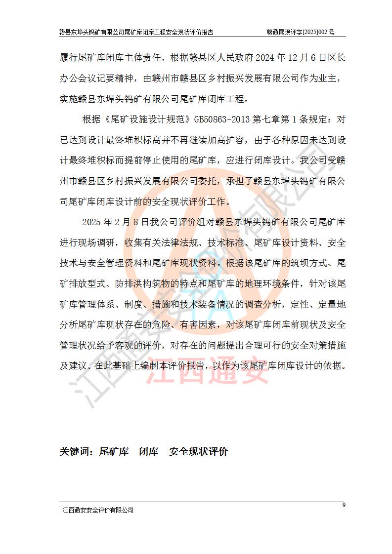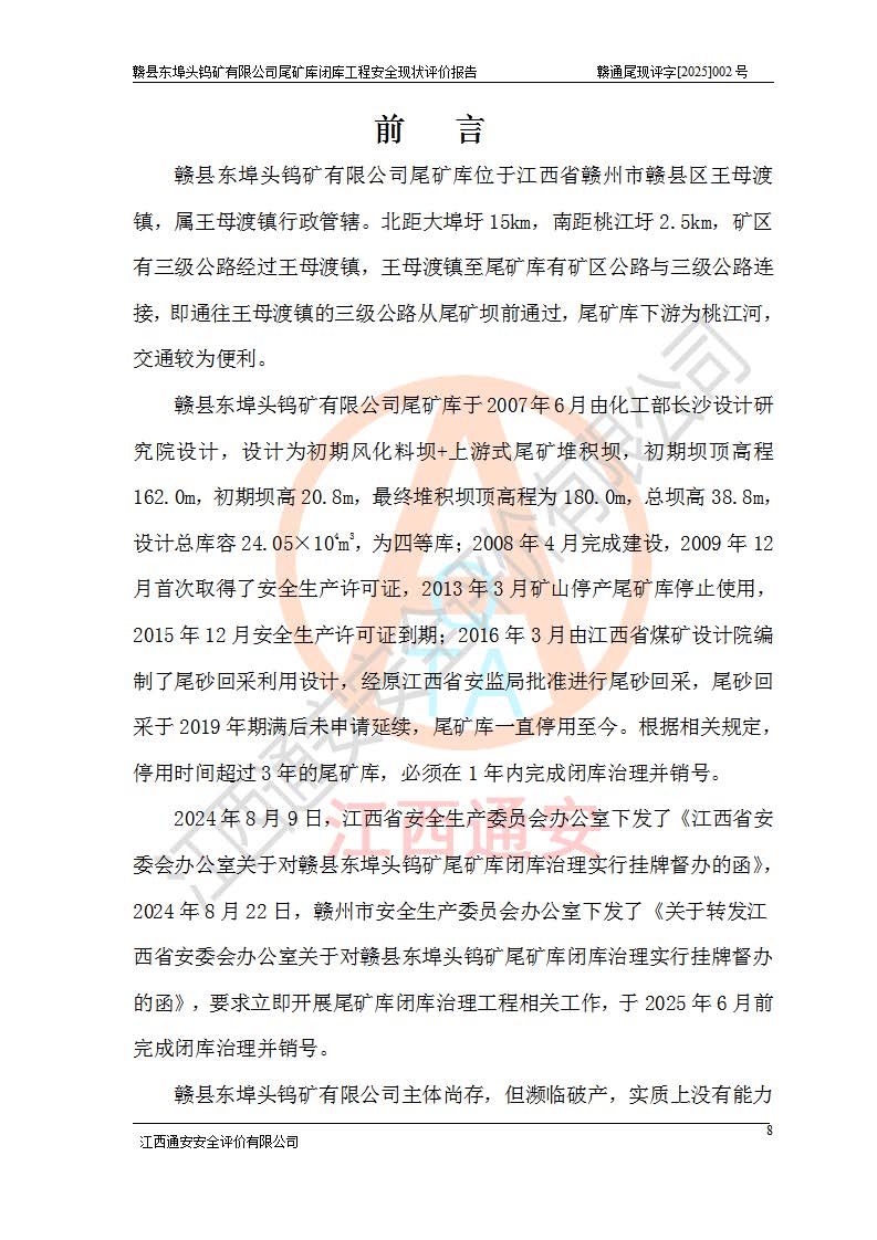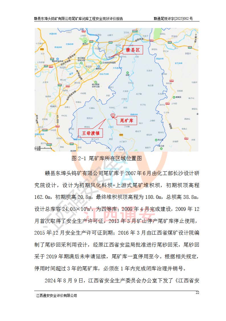 评价报告名称 | 赣县东埠头钨矿有限公司尾矿库闭库工程安全现状评价报告 | |||