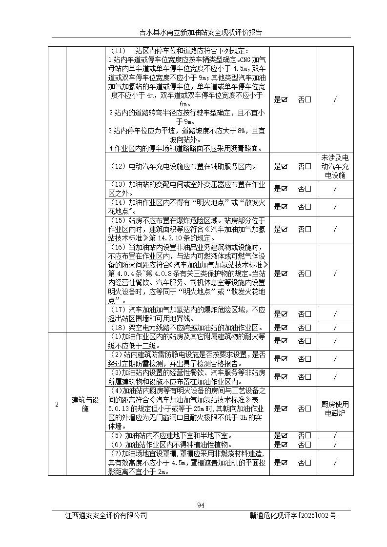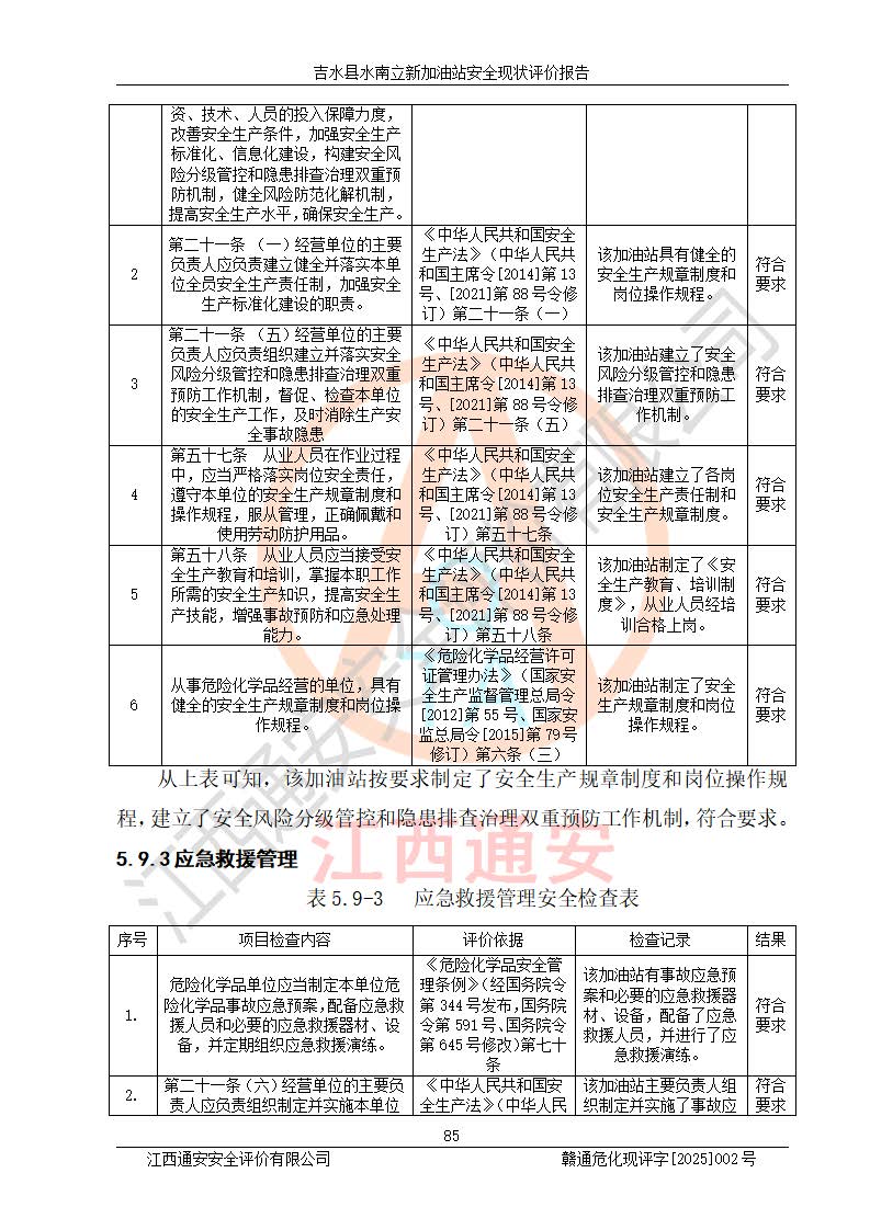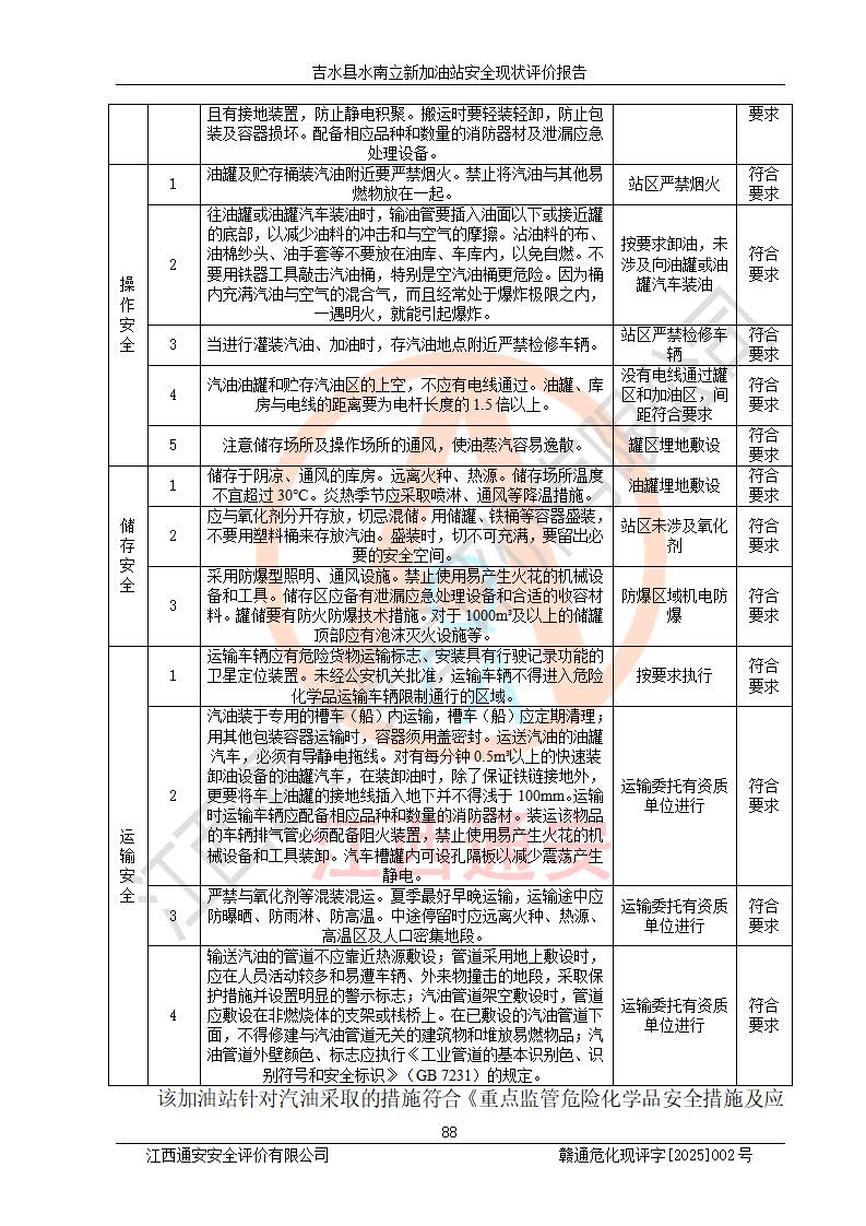 评价结论 | 吉水县水南立新加油站站址合理,周边环境良好,与敏感防护目标间距符合规范要求,站区建构筑物之间的防火间距、耐火等级符合标准要求,与总平面布置图一致,加油卸油工艺及设备设施合理,工艺布置得当,防雷设施经检测合格,采取的工艺安全设施符合规范要求;该加油站制定了安全管理制度和操作规程,人员经培训合格后上岗,安全管理人员经考核合格并取得安全合格证,主要负责人于2024年05月08日取得安全生产知识和管理能力考核合格证,能按照法律法规要求开展安全生产管理工作。 吉水县水南立新加油站符合《汽车加油加气加氢站技术标准》GB50156-2021等标准规范的要求,安全风险可控,满足危险化学品经营的安全条件。 | |||