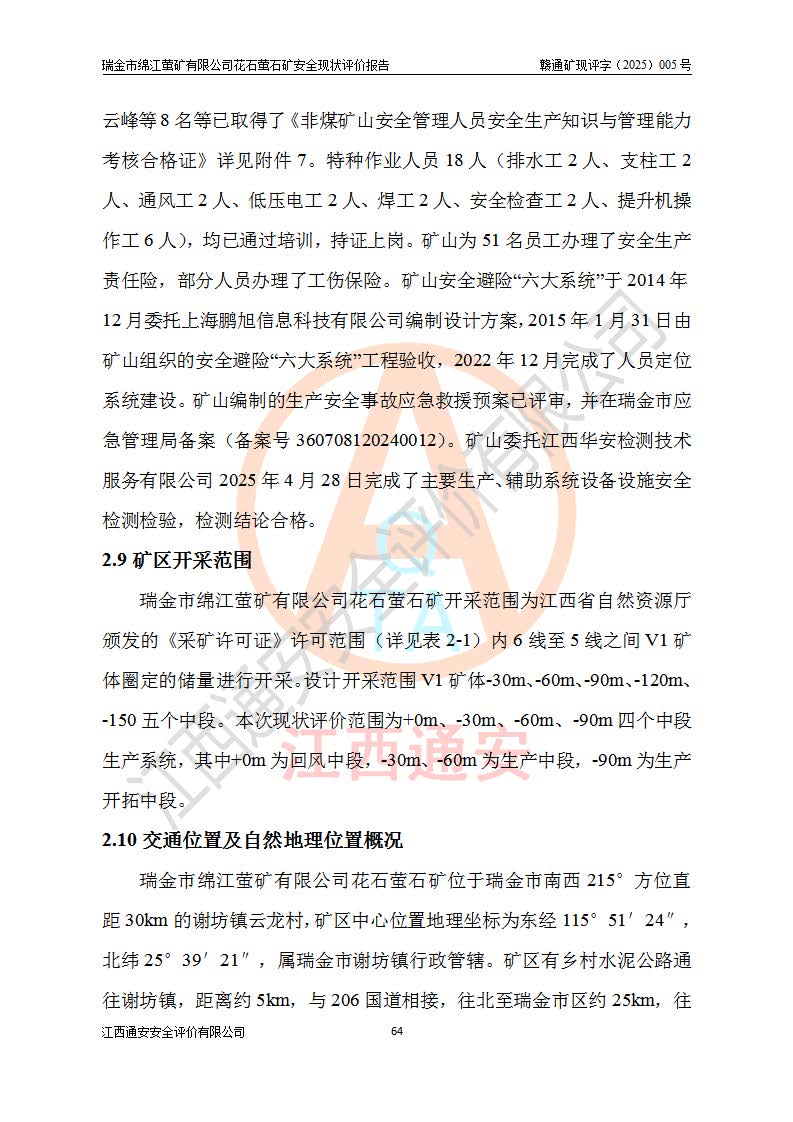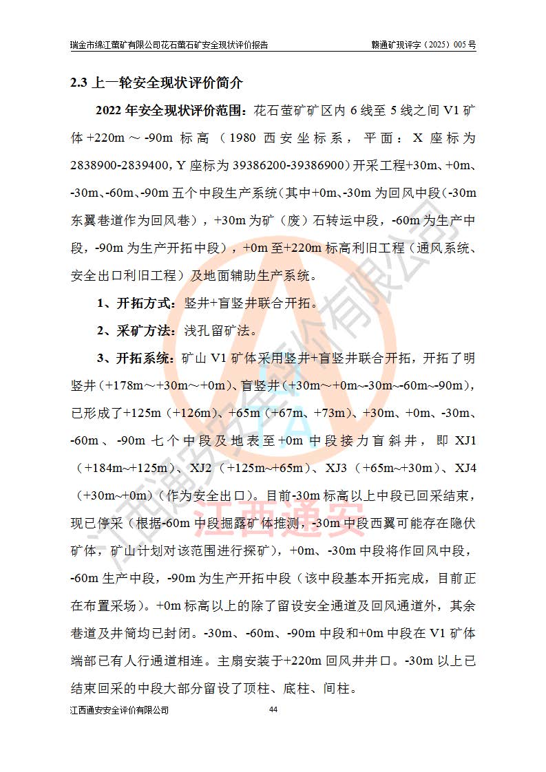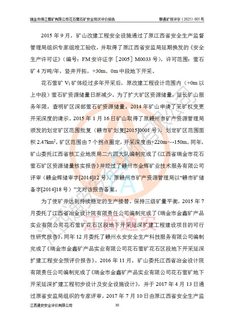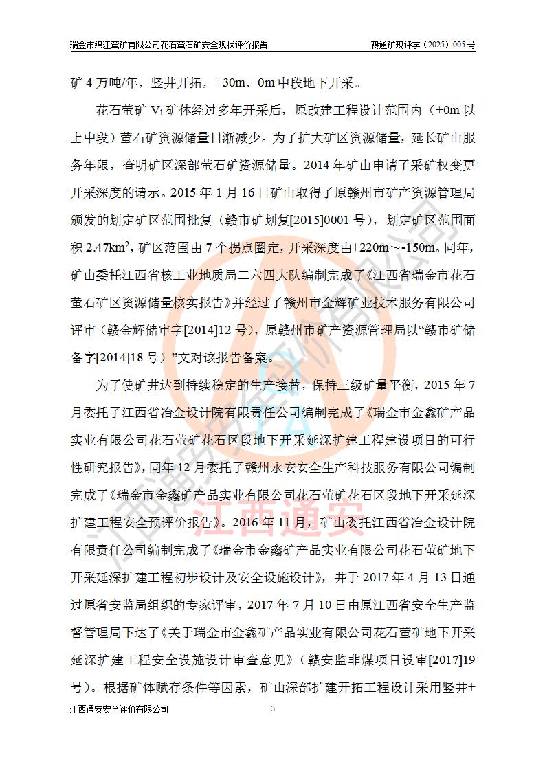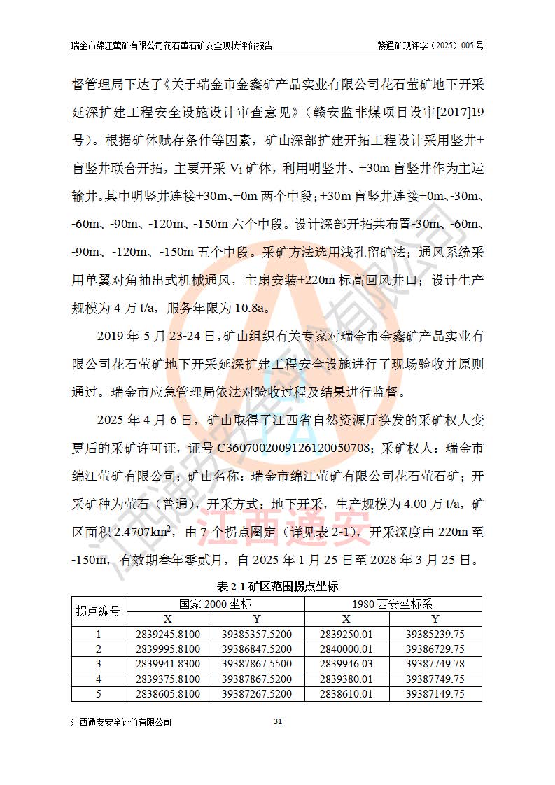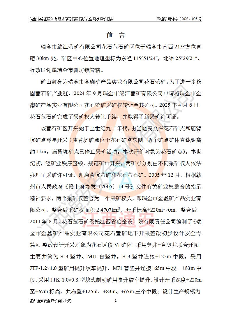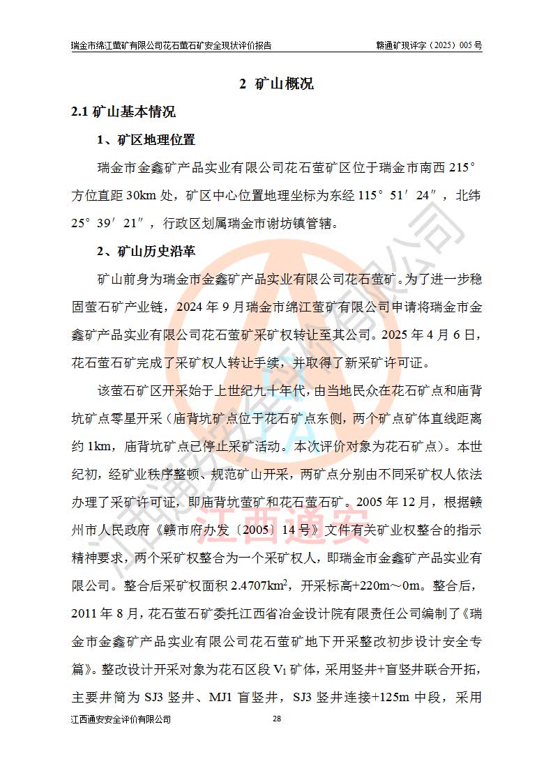 瑞金市绵江萤矿有限公司花石萤石矿区位于瑞金市南西215°方位直距30km处,矿区中心位置地理坐标为东经115°51′24″,北纬25°39′21″,行政区划属瑞金市谢坊镇管辖。 矿山前身为瑞金市金鑫矿产品实业有限公司花石萤矿。为了进一步稳固萤石矿产业链,2024年9月瑞金市绵江萤矿有限公司申请将瑞金市金鑫矿产品实业有限公司花石萤矿采矿权**至其公司。2025年4月6日,花石萤石矿完成了采矿权人**手续,并取得了新采矿许可证。 该萤石矿区开采始于上世纪九十年代,由当地民众在花石矿点和庙背坑矿点零星开采(庙背坑矿点位于花石矿点东侧,两个矿点矿体直线距离约1km,庙背坑矿点已停止采矿活动。本次评价对象为花石矿点)。本世纪初,经矿业秩序整顿、规范矿山开采,两矿点分别由不同采矿权人依法办理了采矿许可证,即庙背坑萤矿和花石萤石矿。2005年12月,根据赣州市人民**《赣市府办发〔2005〕14号》文件有关矿业权整合的指示精神要求,两个采矿权整合为一个采矿权人,即瑞金市金鑫矿产品实业有限公司,整合后采矿权面积2.4707km2,开采标高+220m~0m。整合后,2011年8月,花石萤石矿委托江西省冶金设计院有限责任公司编制了《瑞金市金鑫矿产品实业有限公司花石萤矿地下开采整改初步设计安全专篇》。整改设计开采对象为花石区段V1矿体,采用竖井+盲竖井联合开拓,主要井筒为SJ3竖井、MJ1盲竖井,SJ3竖井连接+125m中段,采用JTP-1.2×1.0型矿用提升绞车提升,MJ1盲竖井连接+65m中段、+83m中段,采用JTK-1.0×0.8型块式制动矿用提升绞车提升。设计开采深度+220m至+67m标高,共布置+125m、+83m、+65m三个中段;设计生产规模为4万吨/年,采矿方法选用浅孔留矿法。 根据整改设计要求,矿山经过近一年多的整改施工,2012年9月通过由原赣州市安全生产监督管理局组织的安全设施整改验收。2012年9月26日取得了由原江西省安全生产监督管理局延期换发的《安全生产许可证》(编号:FM安许证字[2005]M0033号),许可范围:萤石矿4万吨/年,竖井+盲竖井联合开拓,+67m中段地下开采。 由于原整改设计范围内(+67m以上中段)V1矿体资源储量无法使矿井达到持续稳定的生产接替,根据2011年11月264核工业大队《江西省瑞金市花石萤石矿资源储量核实报告》及矿山提交的2013年度资源储量动态检测报告。2013年4月,花石萤石矿又委托江西省冶金设计院有限责任公司为其编制了《瑞金市金鑫矿产品实业有限公司花石萤矿花石矿区地下开采改建工程初步设计安全专篇》。设计开采范围+83m~+0m标高;采用竖井开拓。设计新建开拓工程为新竖井及+83m、+40m、+0m三个中段。采矿方法为浅孔留矿法。 由于部分工程与设计不符。2014年10月,矿山委托江西省冶金设计院有限责任公司编制了《瑞金市金鑫矿产品实业有限公司花石萤矿花石矿区地下开采改建工程变更设计》,其中段布置变更为+30m、+0m中段;通风系统变更为以新竖井为进风井;采用SJ3北东已有的平峒(PD)及平硐内的人行、回风斜巷MXJ1、MXJ2 、MXJ3并配置相关工程后作为矿区北东翼矿体开采的北东翼回风系统。主扇安装于+190m中段回风道。 2015年9月,矿山改建工程安全设施通过了原江西省安全生产监督管理局组织专家组竣工验收,并取得了原江西省安监局延期换发的《安全生产许可证》(编号:FM安许证字[2005]M0033号),许可范围:萤石矿4万吨/年,竖井开拓,+30m、0m中段地下开采。 花石萤矿V1矿体经过多年开采后,原改建工程设计范围内(+0m以上中段)萤石矿资源储量日渐减少。为了扩大矿区资源储量,延长矿山服务年限,查明矿区深部萤石矿资源储量。2014年矿山申请了采矿权变更开采深度的请示。2015年1月16日矿山取得了原赣州市矿产资源管理局颁发的划定矿区范围批复(赣市矿划复[2015]0001号),划定矿区范围面积2.47km2,矿区范围由7个拐点圈定,开采深度由+220m~-150m。同年,矿山委托江西省核工业地质局二六四大队编制完成了《江西省瑞金市花石萤石矿区资源储量核实报告》并经过了赣州市金辉矿业技术服务有限公司评审(赣金辉储审字[2014]12号),原赣州市矿产资源管理局以“赣市矿储备字[2014]18号)”文对该报告备案。 为了使矿井达到持续稳定的生产接替,保持三级矿量平衡,2015年7月委托了江西省冶金设计院有限责任公司编制完成了《瑞金市金鑫矿产品实业有限公司花石萤矿花石区段地下开采延深扩建工程建设项目的可行性研究报告》,同年12月委托了赣州永安安全生产科技服务有限公司编制完成了《瑞金市金鑫矿产品实业有限公司花石萤矿花石区段地下开采延深扩建工程安全预评价报告》。2016年11月,矿山委托江西省冶金设计院有限责任公司编制完成了《瑞金市金鑫矿产品实业有限公司花石萤矿地下开采延深扩建工程初步设计及安全设施设计》,并于2017年4月13日通过原省安监局组织的专家评审,2017年7月10日由原江西省安全生产监督管理局下达了《关于瑞金市金鑫矿产品实业有限公司花石萤矿地下开采延深扩建工程安全设施设计审查意见》(赣安监非煤项目设审[2017]19号)。根据矿体赋存条件等因素,矿山深部扩建开拓工程设计采用竖井+盲竖井联合开拓,主要开采V1矿体,利用明竖井、+30m盲竖井作为主运输井。其中明竖井连接+30m、+0m两个中段;+30m盲竖井连接+0m、-30m、-60m、-90m、-120m、-150m六个中段。设计深部开拓共布置-30m、-60m、-90m、-120m、-150m五个中段。采矿方法