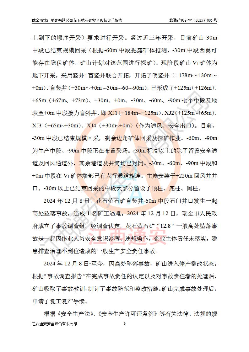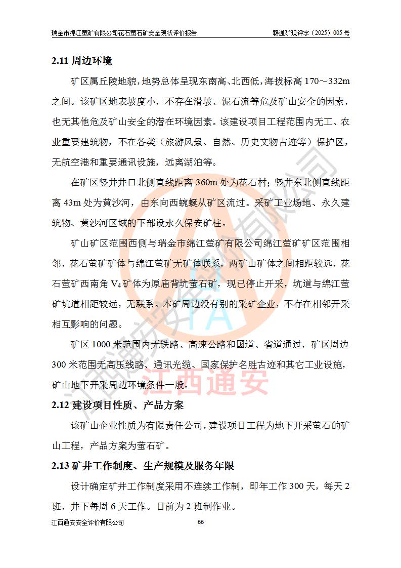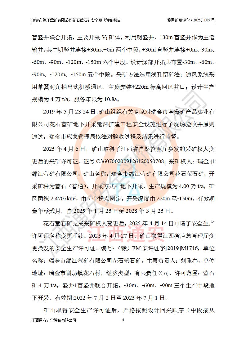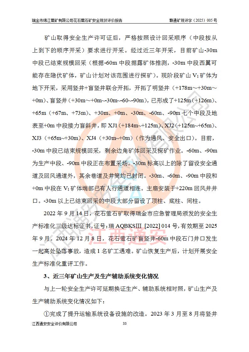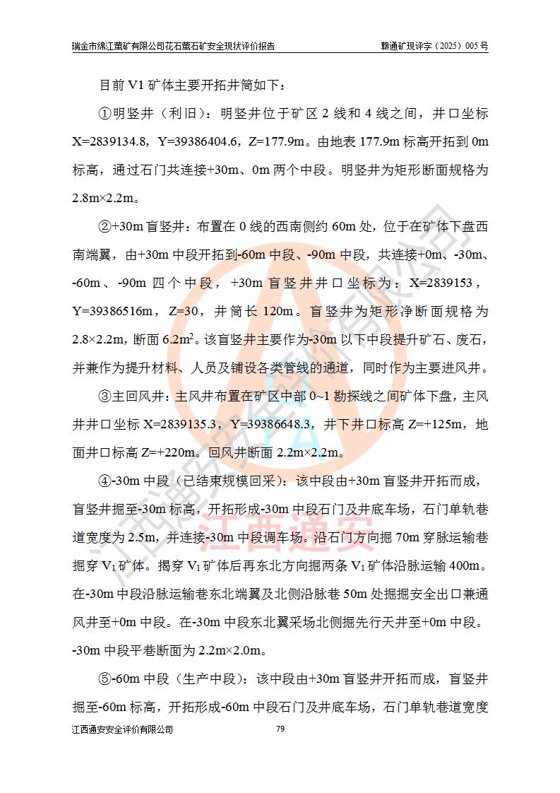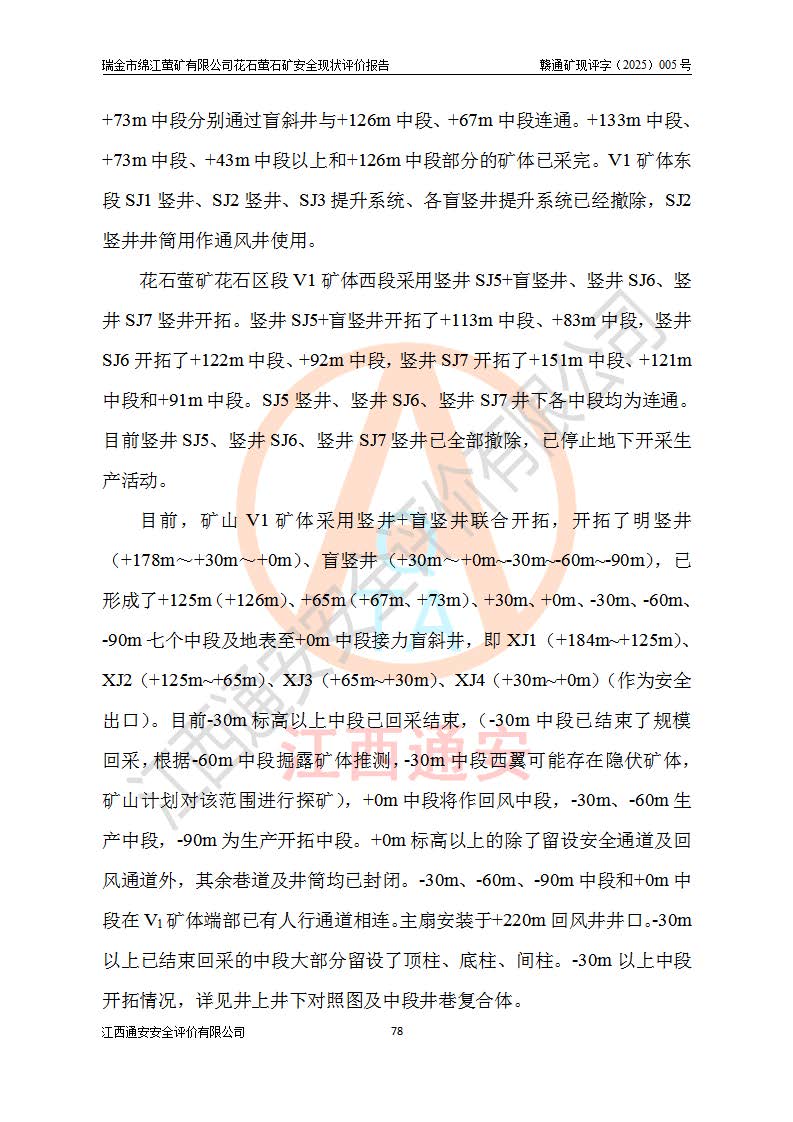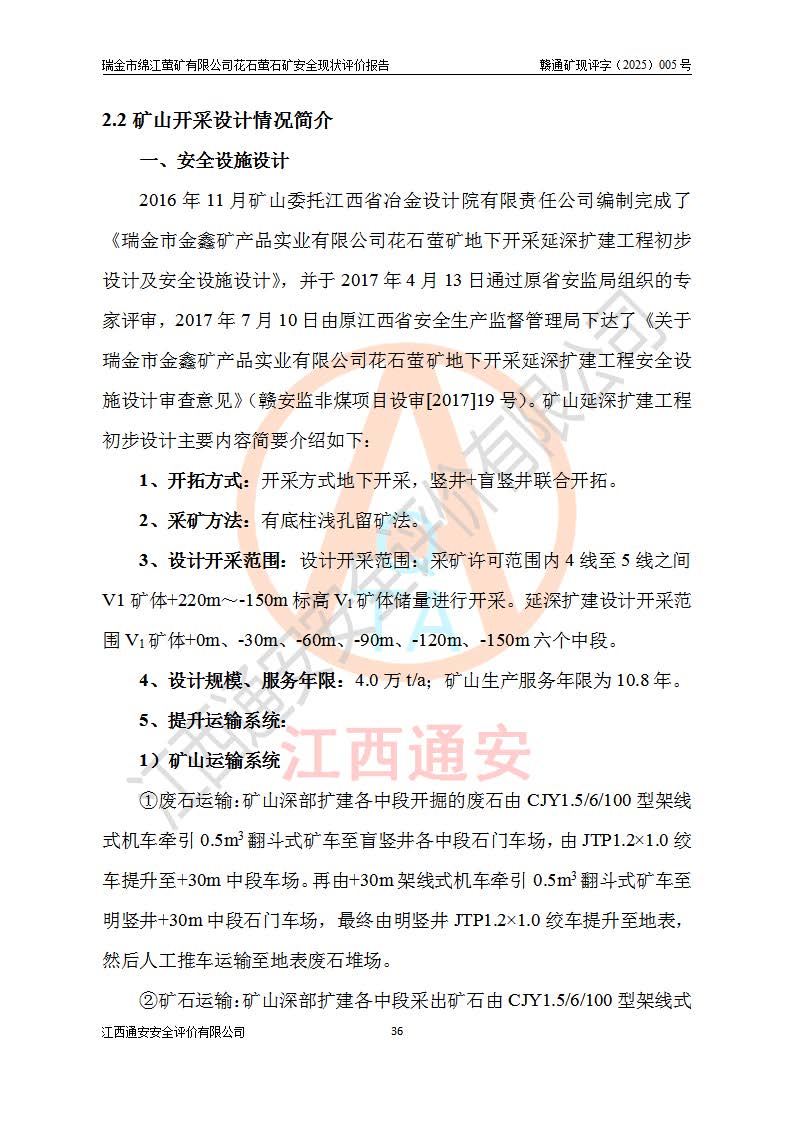 瑞金市绵江萤矿有限公司花石萤石矿区位于瑞金市南西215°方位直距30km处,矿区中心位置地理坐标为东经115°51′24″,北纬25°39′21″,行政区划属瑞金市谢坊镇管辖。 矿山前身为瑞金市金鑫矿产品实业有限公司花石萤矿。为了进一步稳固萤石矿产业链,2024年9月瑞金市绵江萤矿有限公司申请将瑞金市金鑫矿产品实业有限公司花石萤矿采矿权**至其公司。2025年4月6日,花石萤石矿完成了采矿权人**手续,并取得了新采矿许可证。 该萤石矿区开采始于上世纪九十年代,由当地民众在花石矿点和庙背坑矿点零星开采(庙背坑矿点位于花石矿点东侧,两个矿点矿体直线距离约1km,庙背坑矿点已停止采矿活动。本次评价对象为花石矿点)。本世纪初,经矿业秩序整顿、规范矿山开采,两矿点分别由不同采矿权人依法办理了采矿许可证,即庙背坑萤矿和花石萤石矿。2005年12月,根据赣州市人民**《赣市府办发〔2005〕14号》文件有关矿业权整合的指示精神要求,两个采矿权整合为一个采矿权人,即瑞金市金鑫矿产品实业有限公司,整合后采矿权面积2.4707km2,开采标高+220m~0m。整合后,2011年8月,花石萤石矿委托江西省冶金设计院有限责任公司编制了《瑞金市金鑫矿产品实业有限公司花石萤矿地下开采整改初步设计安全专篇》。整改设计开采对象为花石区段V1矿体,采用竖井+盲竖井联合开拓,主要井筒为SJ3竖井、MJ1盲竖井,SJ3竖井连接+125m中段,采用JTP-1.2×1.0型矿用提升绞车提升,MJ1盲竖井连接+65m中段、+83m中段,采用JTK-1.0×0.8型块式制动矿用提升绞车提升。设计开采深度+220m至+67m标高,共布置+125m、+83m、+65m三个中段;设计生产规模为4万吨/年,采矿方法选用浅孔留矿法。 根据整改设计要求,矿山经过近一年多的整改施工,2012年9月通过由原赣州市安全生产监督管理局组织的安全设施整改验收。2012年9月26日取得了由原江西省安全生产监督管理局延期换发的《安全生产许可证》(编号:FM安许证字[2005]M0033号),许可范围:萤石矿4万吨/年,竖井+盲竖井联合开拓,+67m中段地下开采。 由于原整改设计范围内(+67m以上中段)V1矿体资源储量无法使矿井达到持续稳定的生产接替,根据2011年11月264核工业大队《江西省瑞金市花石萤石矿资源储量核实报告》及矿山提交的2013年度资源储量动态检测报告。2013年4月,花石萤石矿又委托江西省冶金设计院有限责任公司为其编制了《瑞金市金鑫矿产品实业有限公司花石萤矿花石矿区地下开采改建工程初步设计安全专篇》。设计开采范围+83m~+0m标高;采用竖井开拓。设计新建开拓工程为新竖井及+83m、+40m、+0m三个中段。采矿方法为浅孔留矿法。 由于部分工程与设计不符。2014年10月,矿山委托江西省冶金设计院有限责任公司编制了《瑞金市金鑫矿产品实业有限公司花石萤矿花石矿区地下开采改建工程变更设计》,其中段布置变更为+30m、+0m中段;通风系统变更为以新竖井为进风井;采用SJ3北东已有的平峒(PD)及平硐内的人行、回风斜巷MXJ1、MXJ2 、MXJ3并配置相关工程后作为矿区北东翼矿体开采的北东翼回风系统。主扇安装于+190m中段回风道。 2015年9月,矿山改建工程安全设施通过了原江西省安全生产监督管理局组织专家组竣工验收,并取得了原江西省安监局延期换发的《安全生产许可证》(编号:FM安许证字[2005]M0033号),许可范围:萤石矿4万吨/年,竖井开拓,+30m、0m中段地下开采。 花石萤矿V1矿体经过多年开采后,原改建工程设计范围内(+0m以上中段)萤石矿资源储量日渐减少。为了扩大矿区资源储量,延长矿山服务年限,查明矿区深部萤石矿资源储量。2014年矿山申请了采矿权变更开采深度的请示。2015年1月16日矿山取得了原赣州市矿产资源管理局颁发的划定矿区范围批复(赣市矿划复[2015]0001号),划定矿区范围面积2.47km2,矿区范围由7个拐点圈定,开采深度由+220m~-150m。同年,矿山委托江西省核工业地质局二六四大队编制完成了《江西省瑞金市花石萤石矿区资源储量核实报告》并经过了赣州市金辉矿业技术服务有限公司评审(赣金辉储审字[2014]12号),原赣州市矿产资源管理局以“赣市矿储备字[2014]18号)”文对该报告备案。 为了使矿井达到持续稳定的生产接替,保持三级矿量平衡,2015年7月委托了江西省冶金设计院有限责任公司编制完成了《瑞金市金鑫矿产品实业有限公司花石萤矿花石区段地下开采延深扩建工程建设项目的可行性研究报告》,同年12月委托了赣州永安安全生产科技服务有限公司编制完成了《瑞金市金鑫矿产品实业有限公司花石萤矿花石区段地下开采延深扩建工程安全预评价报告》。2016年11月,矿山委托江西省冶金设计院有限责任公司编制完成了《瑞金市金鑫矿产品实业有限公司花石萤矿地下开采延深扩建工程初步设计及安全设施设计》,并于2017年4月13日通过原省安监局组织的专家评审,2017年7月10日由原江西省安全生产监督管理局下达了《关于瑞金市金鑫矿产品实业有限公司花石萤矿地下开采延深扩建工程安全设施设计审查意见》(赣安监非煤项目设审[2017]19号)。根据矿体赋存条件等因素,矿山深部扩建开拓工程设计采用竖井+盲竖井联合开拓,主要开采V1矿体,利用明竖井、+30m盲竖井作为主运输井。其中明竖井连接+30m、+0m两个中段;+30m盲竖井连接+0m、-30m、-60m、-90m、-120m、-150m六个中段。设计深部开拓共布置-30m、-60m、-90m、-120m、-150m五个中段。采矿方法