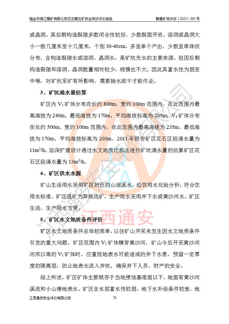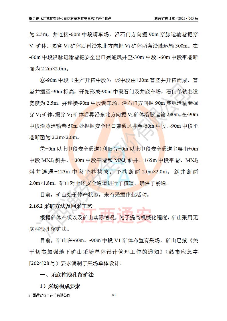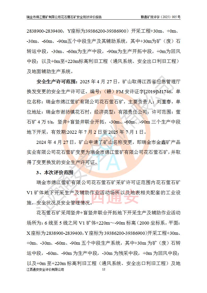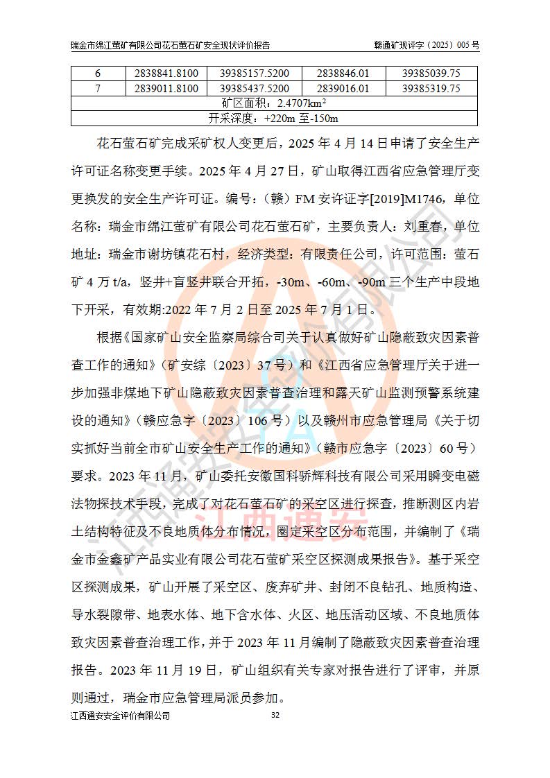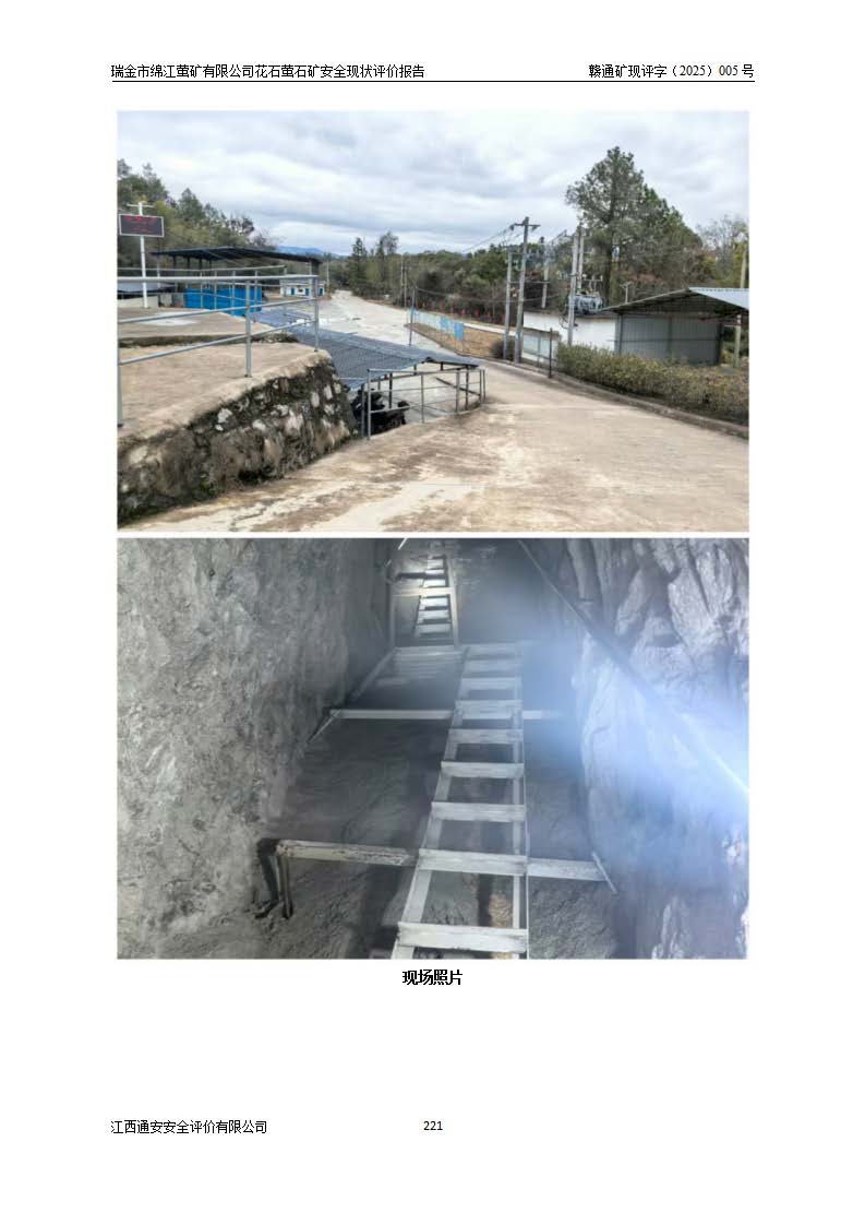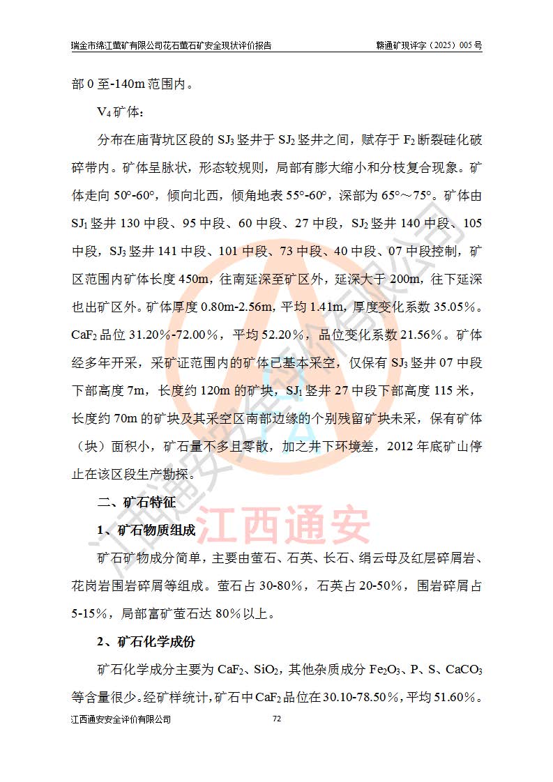 瑞金市绵江萤矿有限公司花石萤石矿区位于瑞金市南西215°方位直距30km处,矿区中心位置地理坐标为东经115°51′24″,北纬25°39′21″,行政区划属瑞金市谢坊镇管辖。 矿山前身为瑞金市金鑫矿产品实业有限公司花石萤矿。为了进一步稳固萤石矿产业链,2024年9月瑞金市绵江萤矿有限公司申请将瑞金市金鑫矿产品实业有限公司花石萤矿采矿权**至其公司。2025年4月6日,花石萤石矿完成了采矿权人**手续,并取得了新采矿许可证。 该萤石矿区开采始于上世纪九十年代,由当地民众在花石矿点和庙背坑矿点零星开采(庙背坑矿点位于花石矿点东侧,两个矿点矿体直线距离约1km,庙背坑矿点已停止采矿活动。本次评价对象为花石矿点)。本世纪初,经矿业秩序整顿、规范矿山开采,两矿点分别由不同采矿权人依法办理了采矿许可证,即庙背坑萤矿和花石萤石矿。2005年12月,根据赣州市人民**《赣市府办发〔2005〕14号》文件有关矿业权整合的指示精神要求,两个采矿权整合为一个采矿权人,即瑞金市金鑫矿产品实业有限公司,整合后采矿权面积2.4707km2,开采标高+220m~0m。整合后,2011年8月,花石萤石矿委托江西省冶金设计院有限责任公司编制了《瑞金市金鑫矿产品实业有限公司花石萤矿地下开采整改初步设计安全专篇》。整改设计开采对象为花石区段V1矿体,采用竖井+盲竖井联合开拓,主要井筒为SJ3竖井、MJ1盲竖井,SJ3竖井连接+125m中段,采用JTP-1.2×1.0型矿用提升绞车提升,MJ1盲竖井连接+65m中段、+83m中段,采用JTK-1.0×0.8型块式制动矿用提升绞车提升。设计开采深度+220m至+67m标高,共布置+125m、+83m、+65m三个中段;设计生产规模为4万吨/年,采矿方法选用浅孔留矿法。 根据整改设计要求,矿山经过近一年多的整改施工,2012年9月通过由原赣州市安全生产监督管理局组织的安全设施整改验收。2012年9月26日取得了由原江西省安全生产监督管理局延期换发的《安全生产许可证》(编号:FM安许证字[2005]M0033号),许可范围:萤石矿4万吨/年,竖井+盲竖井联合开拓,+67m中段地下开采。 由于原整改设计范围内(+67m以上中段)V1矿体资源储量无法使矿井达到持续稳定的生产接替,根据2011年11月264核工业大队《江西省瑞金市花石萤石矿资源储量核实报告》及矿山提交的2013年度资源储量动态检测报告。2013年4月,花石萤石矿又委托江西省冶金设计院有限责任公司为其编制了《瑞金市金鑫矿产品实业有限公司花石萤矿花石矿区地下开采改建工程初步设计安全专篇》。设计开采范围+83m~+0m标高;采用竖井开拓。设计新建开拓工程为新竖井及+83m、+40m、+0m三个中段。采矿方法为浅孔留矿法。 由于部分工程与设计不符。2014年10月,矿山委托江西省冶金设计院有限责任公司编制了《瑞金市金鑫矿产品实业有限公司花石萤矿花石矿区地下开采改建工程变更设计》,其中段布置变更为+30m、+0m中段;通风系统变更为以新竖井为进风井;采用SJ3北东已有的平峒(PD)及平硐内的人行、回风斜巷MXJ1、MXJ2 、MXJ3并配置相关工程后作为矿区北东翼矿体开采的北东翼回风系统。主扇安装于+190m中段回风道。 2015年9月,矿山改建工程安全设施通过了原江西省安全生产监督管理局组织专家组竣工验收,并取得了原江西省安监局延期换发的《安全生产许可证》(编号:FM安许证字[2005]M0033号),许可范围:萤石矿4万吨/年,竖井开拓,+30m、0m中段地下开采。 花石萤矿V1矿体经过多年开采后,原改建工程设计范围内(+0m以上中段)萤石矿资源储量日渐减少。为了扩大矿区资源储量,延长矿山服务年限,查明矿区深部萤石矿资源储量。2014年矿山申请了采矿权变更开采深度的请示。2015年1月16日矿山取得了原赣州市矿产资源管理局颁发的划定矿区范围批复(赣市矿划复[2015]0001号),划定矿区范围面积2.47km2,矿区范围由7个拐点圈定,开采深度由+220m~-150m。同年,矿山委托江西省核工业地质局二六四大队编制完成了《江西省瑞金市花石萤石矿区资源储量核实报告》并经过了赣州市金辉矿业技术服务有限公司评审(赣金辉储审字[2014]12号),原赣州市矿产资源管理局以“赣市矿储备字[2014]18号)”文对该报告备案。 为了使矿井达到持续稳定的生产接替,保持三级矿量平衡,2015年7月委托了江西省冶金设计院有限责任公司编制完成了《瑞金市金鑫矿产品实业有限公司花石萤矿花石区段地下开采延深扩建工程建设项目的可行性研究报告》,同年12月委托了赣州永安安全生产科技服务有限公司编制完成了《瑞金市金鑫矿产品实业有限公司花石萤矿花石区段地下开采延深扩建工程安全预评价报告》。2016年11月,矿山委托江西省冶金设计院有限责任公司编制完成了《瑞金市金鑫矿产品实业有限公司花石萤矿地下开采延深扩建工程初步设计及安全设施设计》,并于2017年4月13日通过原省安监局组织的专家评审,2017年7月10日由原江西省安全生产监督管理局下达了《关于瑞金市金鑫矿产品实业有限公司花石萤矿地下开采延深扩建工程安全设施设计审查意见》(赣安监非煤项目设审[2017]19号)。根据矿体赋存条件等因素,矿山深部扩建开拓工程设计采用竖井+盲竖井联合开拓,主要开采V1矿体,利用明竖井、+30m盲竖井作为主运输井。其中明竖井连接+30m、+0m两个中段;+30m盲竖井连接+0m、-30m、-60m、-90m、-120m、-150m六个中段。设计深部开拓共布置-30m、-60m、-90m、-120m、-150m五个中段。采矿方法