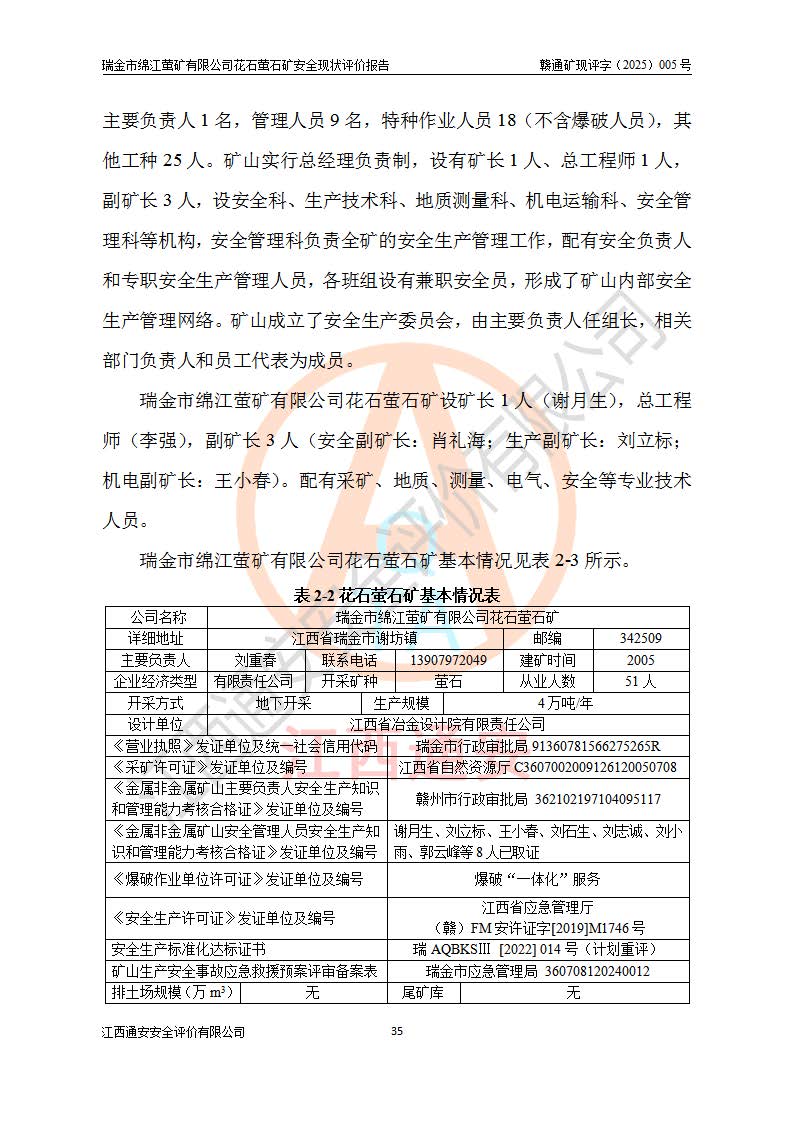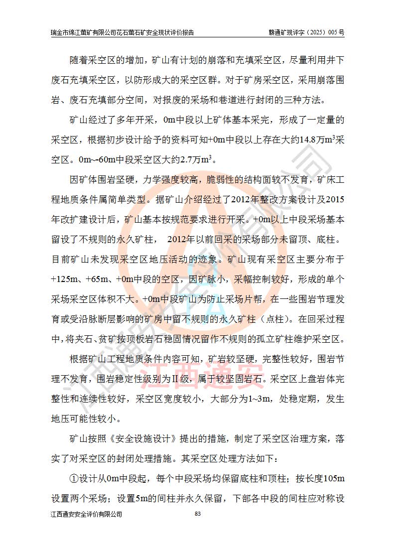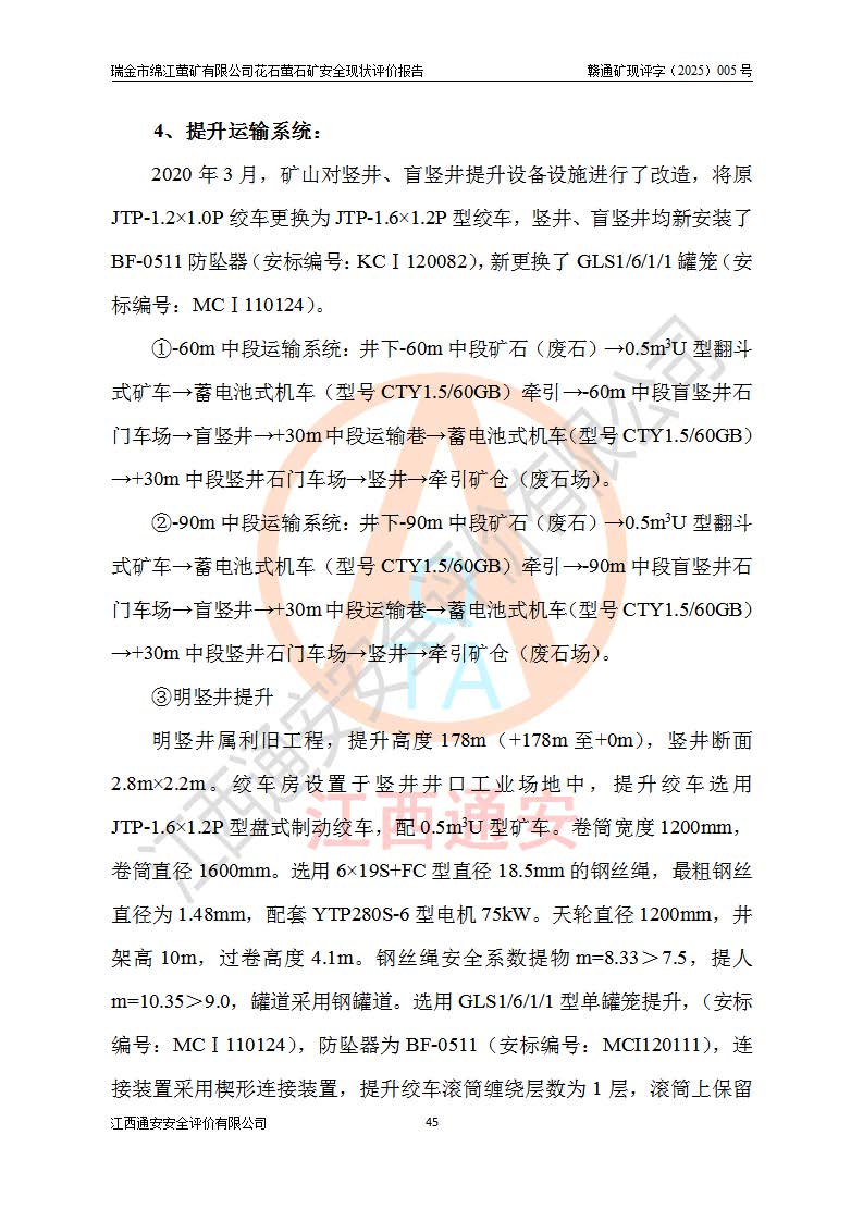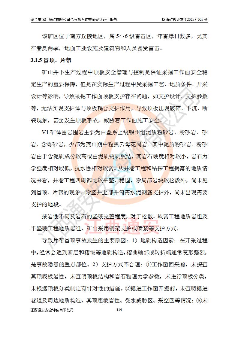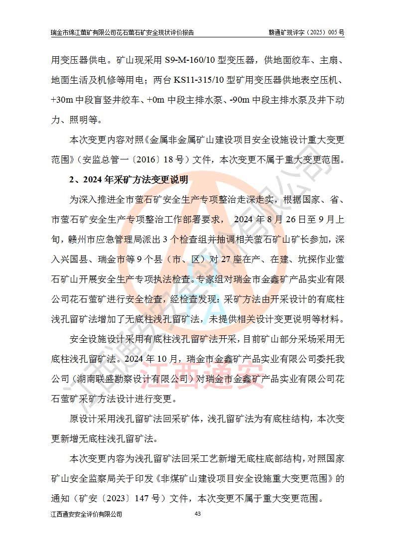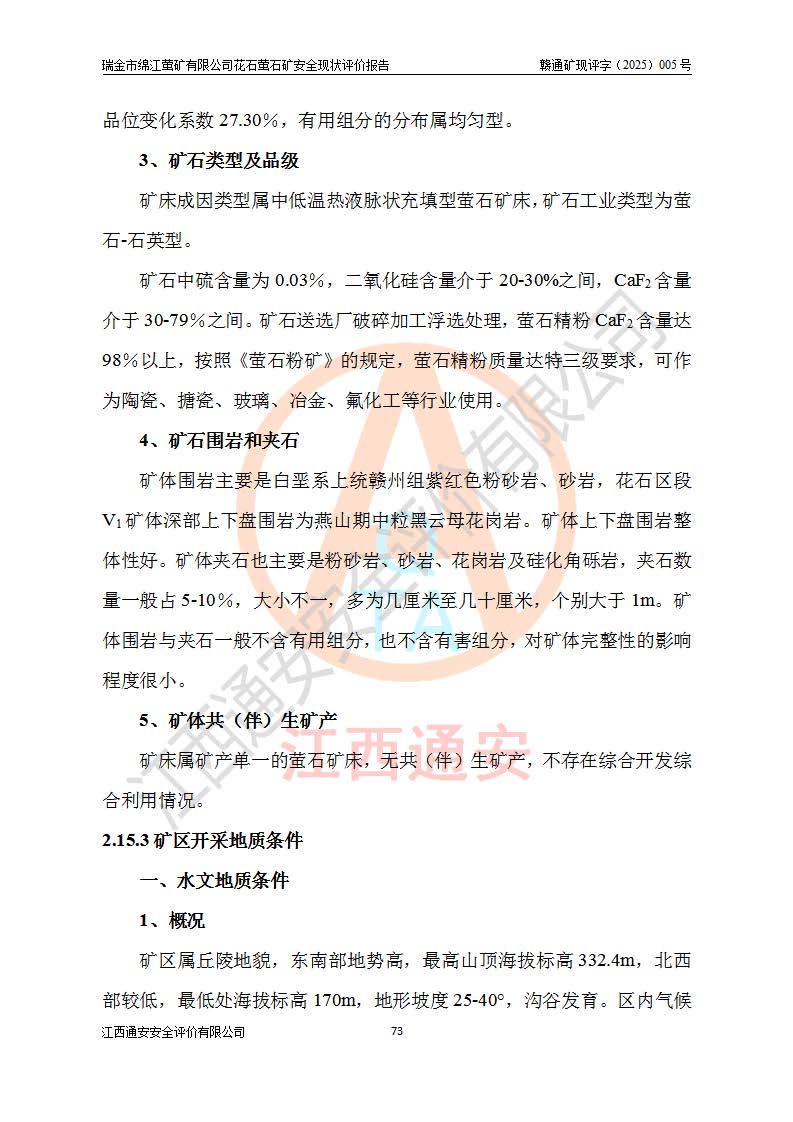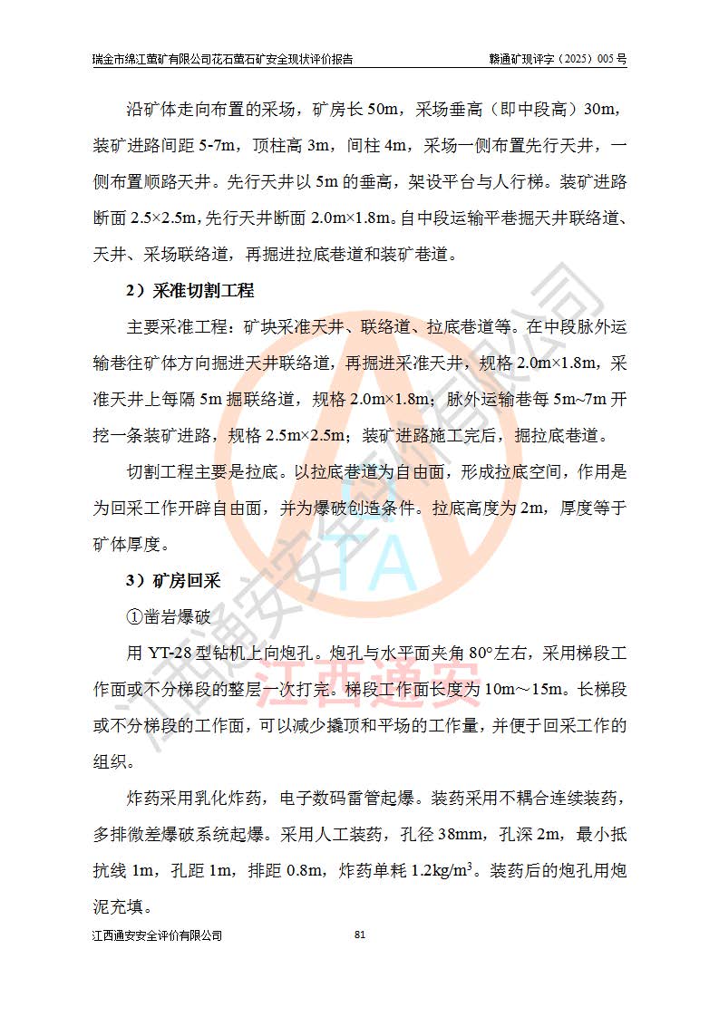 瑞金市绵江萤矿有限公司花石萤石矿区位于瑞金市南西215°方位直距30km处,矿区中心位置地理坐标为东经115°51′24″,北纬25°39′21″,行政区划属瑞金市谢坊镇管辖。 矿山前身为瑞金市金鑫矿产品实业有限公司花石萤矿。为了进一步稳固萤石矿产业链,2024年9月瑞金市绵江萤矿有限公司申请将瑞金市金鑫矿产品实业有限公司花石萤矿采矿权**至其公司。2025年4月6日,花石萤石矿完成了采矿权人**手续,并取得了新采矿许可证。 该萤石矿区开采始于上世纪九十年代,由当地民众在花石矿点和庙背坑矿点零星开采(庙背坑矿点位于花石矿点东侧,两个矿点矿体直线距离约1km,庙背坑矿点已停止采矿活动。本次评价对象为花石矿点)。本世纪初,经矿业秩序整顿、规范矿山开采,两矿点分别由不同采矿权人依法办理了采矿许可证,即庙背坑萤矿和花石萤石矿。2005年12月,根据赣州市人民**《赣市府办发〔2005〕14号》文件有关矿业权整合的指示精神要求,两个采矿权整合为一个采矿权人,即瑞金市金鑫矿产品实业有限公司,整合后采矿权面积2.4707km2,开采标高+220m~0m。整合后,2011年8月,花石萤石矿委托江西省冶金设计院有限责任公司编制了《瑞金市金鑫矿产品实业有限公司花石萤矿地下开采整改初步设计安全专篇》。整改设计开采对象为花石区段V1矿体,采用竖井+盲竖井联合开拓,主要井筒为SJ3竖井、MJ1盲竖井,SJ3竖井连接+125m中段,采用JTP-1.2×1.0型矿用提升绞车提升,MJ1盲竖井连接+65m中段、+83m中段,采用JTK-1.0×0.8型块式制动矿用提升绞车提升。设计开采深度+220m至+67m标高,共布置+125m、+83m、+65m三个中段;设计生产规模为4万吨/年,采矿方法选用浅孔留矿法。 根据整改设计要求,矿山经过近一年多的整改施工,2012年9月通过由原赣州市安全生产监督管理局组织的安全设施整改验收。2012年9月26日取得了由原江西省安全生产监督管理局延期换发的《安全生产许可证》(编号:FM安许证字[2005]M0033号),许可范围:萤石矿4万吨/年,竖井+盲竖井联合开拓,+67m中段地下开采。 由于原整改设计范围内(+67m以上中段)V1矿体资源储量无法使矿井达到持续稳定的生产接替,根据2011年11月264核工业大队《江西省瑞金市花石萤石矿资源储量核实报告》及矿山提交的2013年度资源储量动态检测报告。2013年4月,花石萤石矿又委托江西省冶金设计院有限责任公司为其编制了《瑞金市金鑫矿产品实业有限公司花石萤矿花石矿区地下开采改建工程初步设计安全专篇》。设计开采范围+83m~+0m标高;采用竖井开拓。设计新建开拓工程为新竖井及+83m、+40m、+0m三个中段。采矿方法为浅孔留矿法。 由于部分工程与设计不符。2014年10月,矿山委托江西省冶金设计院有限责任公司编制了《瑞金市金鑫矿产品实业有限公司花石萤矿花石矿区地下开采改建工程变更设计》,其中段布置变更为+30m、+0m中段;通风系统变更为以新竖井为进风井;采用SJ3北东已有的平峒(PD)及平硐内的人行、回风斜巷MXJ1、MXJ2 、MXJ3并配置相关工程后作为矿区北东翼矿体开采的北东翼回风系统。主扇安装于+190m中段回风道。 2015年9月,矿山改建工程安全设施通过了原江西省安全生产监督管理局组织专家组竣工验收,并取得了原江西省安监局延期换发的《安全生产许可证》(编号:FM安许证字[2005]M0033号),许可范围:萤石矿4万吨/年,竖井开拓,+30m、0m中段地下开采。 花石萤矿V1矿体经过多年开采后,原改建工程设计范围内(+0m以上中段)萤石矿资源储量日渐减少。为了扩大矿区资源储量,延长矿山服务年限,查明矿区深部萤石矿资源储量。2014年矿山申请了采矿权变更开采深度的请示。2015年1月16日矿山取得了原赣州市矿产资源管理局颁发的划定矿区范围批复(赣市矿划复[2015]0001号),划定矿区范围面积2.47km2,矿区范围由7个拐点圈定,开采深度由+220m~-150m。同年,矿山委托江西省核工业地质局二六四大队编制完成了《江西省瑞金市花石萤石矿区资源储量核实报告》并经过了赣州市金辉矿业技术服务有限公司评审(赣金辉储审字[2014]12号),原赣州市矿产资源管理局以“赣市矿储备字[2014]18号)”文对该报告备案。 为了使矿井达到持续稳定的生产接替,保持三级矿量平衡,2015年7月委托了江西省冶金设计院有限责任公司编制完成了《瑞金市金鑫矿产品实业有限公司花石萤矿花石区段地下开采延深扩建工程建设项目的可行性研究报告》,同年12月委托了赣州永安安全生产科技服务有限公司编制完成了《瑞金市金鑫矿产品实业有限公司花石萤矿花石区段地下开采延深扩建工程安全预评价报告》。2016年11月,矿山委托江西省冶金设计院有限责任公司编制完成了《瑞金市金鑫矿产品实业有限公司花石萤矿地下开采延深扩建工程初步设计及安全设施设计》,并于2017年4月13日通过原省安监局组织的专家评审,2017年7月10日由原江西省安全生产监督管理局下达了《关于瑞金市金鑫矿产品实业有限公司花石萤矿地下开采延深扩建工程安全设施设计审查意见》(赣安监非煤项目设审[2017]19号)。根据矿体赋存条件等因素,矿山深部扩建开拓工程设计采用竖井+盲竖井联合开拓,主要开采V1矿体,利用明竖井、+30m盲竖井作为主运输井。其中明竖井连接+30m、+0m两个中段;+30m盲竖井连接+0m、-30m、-60m、-90m、-120m、-150m六个中段。设计深部开拓共布置-30m、-60m、-90m、-120m、-150m五个中段。采矿方法