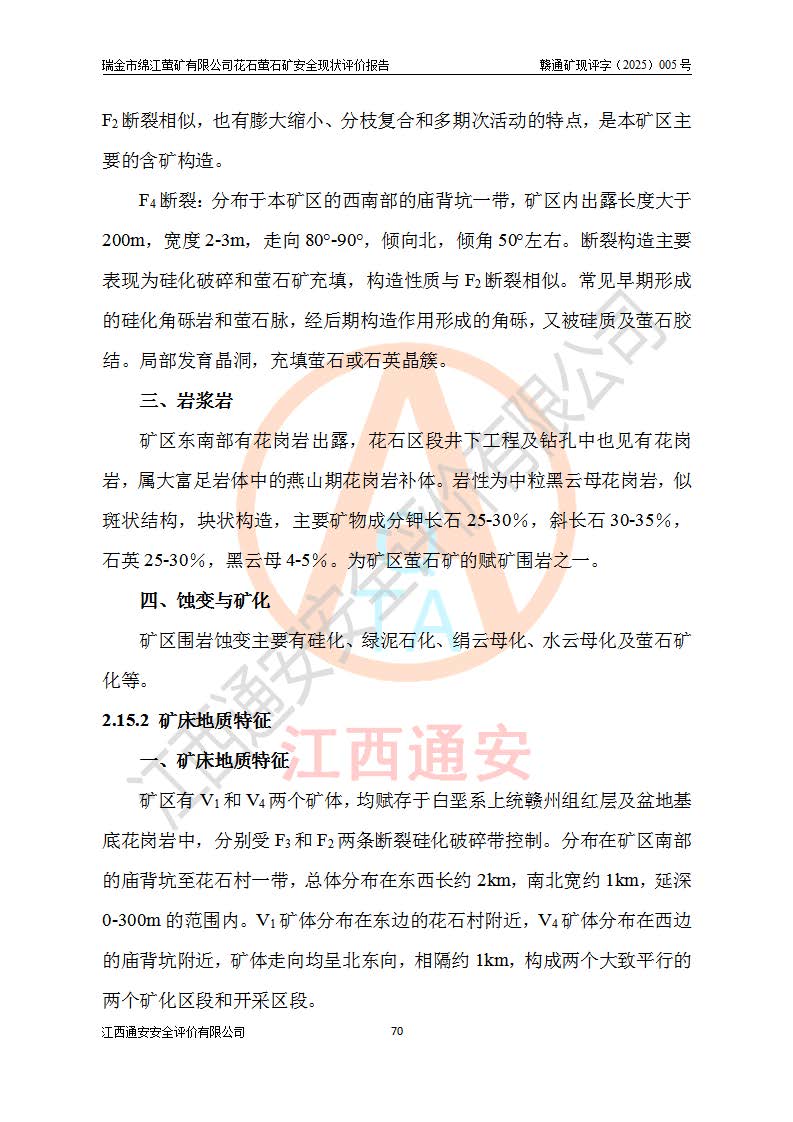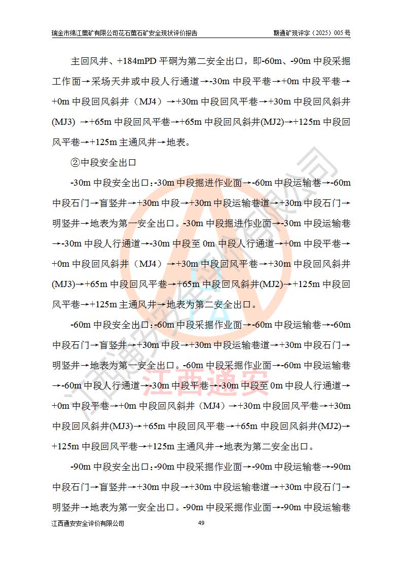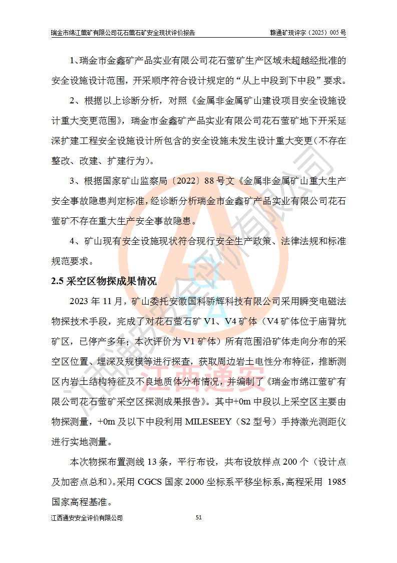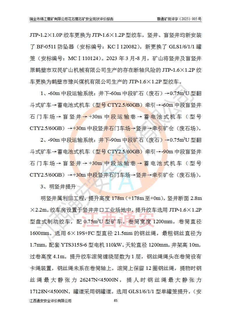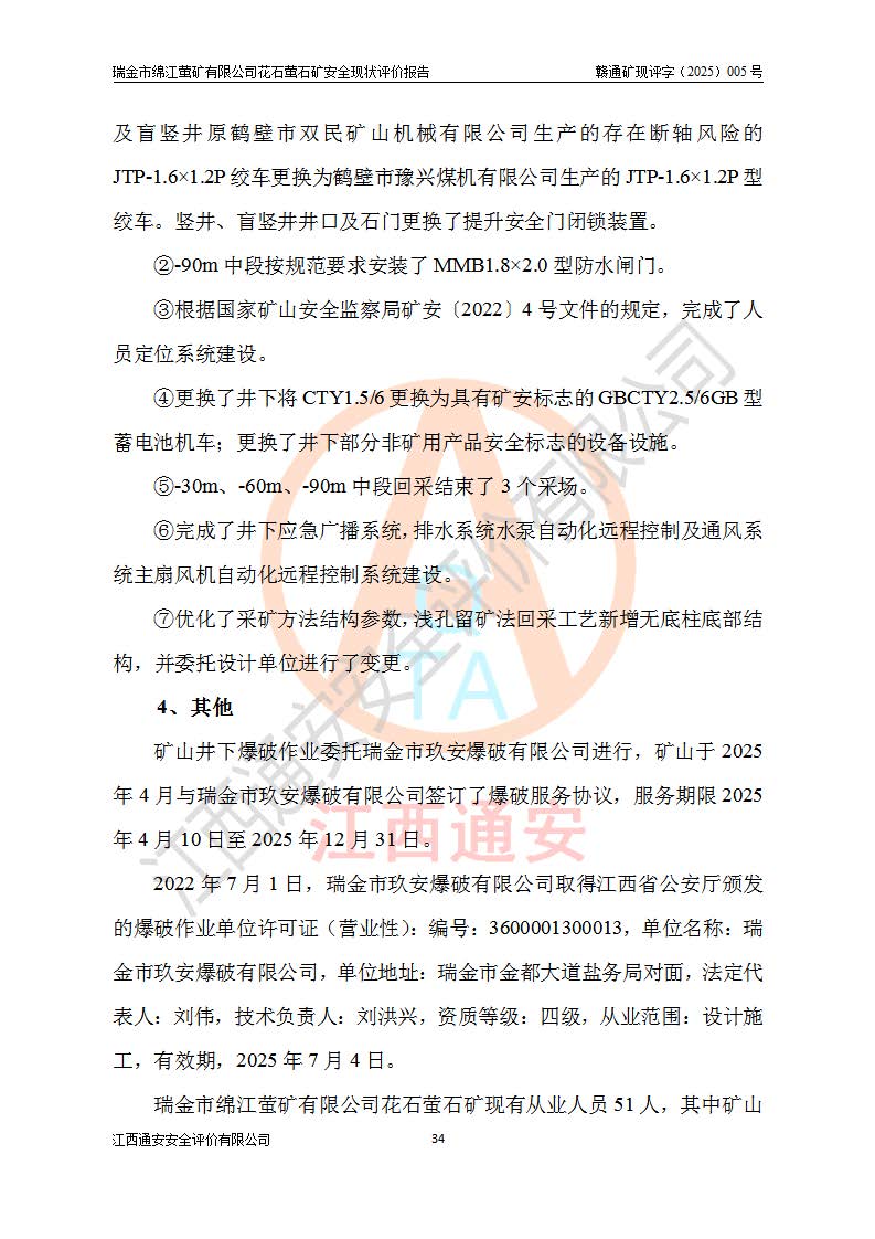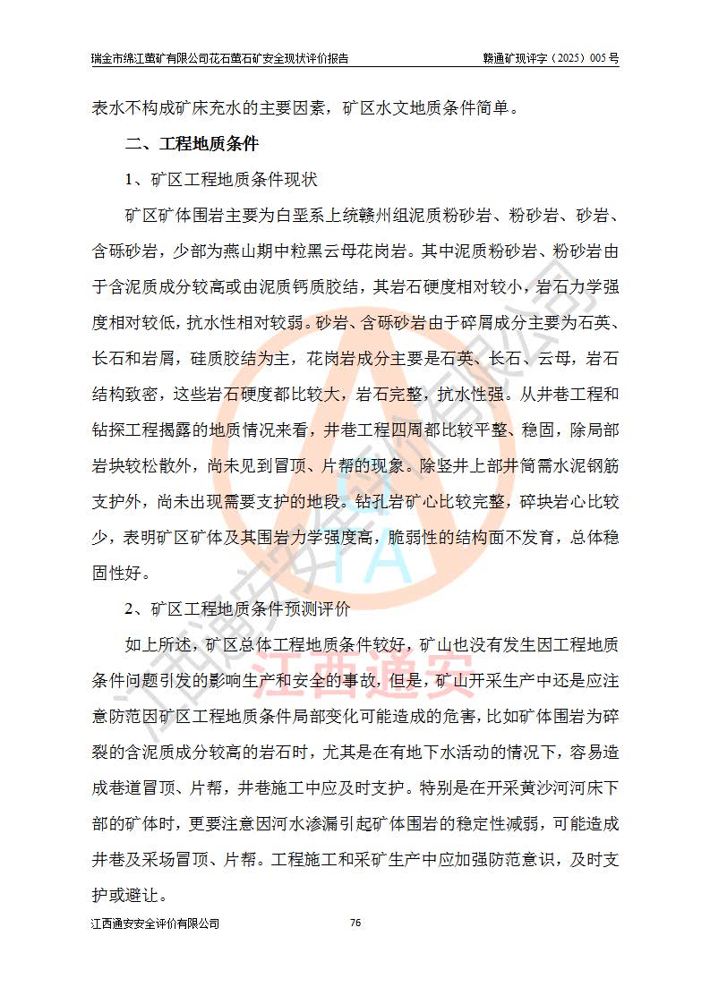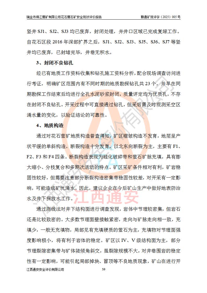 瑞金市绵江萤矿有限公司花石萤石矿区位于瑞金市南西215°方位直距30km处,矿区中心位置地理坐标为东经115°51′24″,北纬25°39′21″,行政区划属瑞金市谢坊镇管辖。 矿山前身为瑞金市金鑫矿产品实业有限公司花石萤矿。为了进一步稳固萤石矿产业链,2024年9月瑞金市绵江萤矿有限公司申请将瑞金市金鑫矿产品实业有限公司花石萤矿采矿权**至其公司。2025年4月6日,花石萤石矿完成了采矿权人**手续,并取得了新采矿许可证。 该萤石矿区开采始于上世纪九十年代,由当地民众在花石矿点和庙背坑矿点零星开采(庙背坑矿点位于花石矿点东侧,两个矿点矿体直线距离约1km,庙背坑矿点已停止采矿活动。本次评价对象为花石矿点)。本世纪初,经矿业秩序整顿、规范矿山开采,两矿点分别由不同采矿权人依法办理了采矿许可证,即庙背坑萤矿和花石萤石矿。2005年12月,根据赣州市人民**《赣市府办发〔2005〕14号》文件有关矿业权整合的指示精神要求,两个采矿权整合为一个采矿权人,即瑞金市金鑫矿产品实业有限公司,整合后采矿权面积2.4707km2,开采标高+220m~0m。整合后,2011年8月,花石萤石矿委托江西省冶金设计院有限责任公司编制了《瑞金市金鑫矿产品实业有限公司花石萤矿地下开采整改初步设计安全专篇》。整改设计开采对象为花石区段V1矿体,采用竖井+盲竖井联合开拓,主要井筒为SJ3竖井、MJ1盲竖井,SJ3竖井连接+125m中段,采用JTP-1.2×1.0型矿用提升绞车提升,MJ1盲竖井连接+65m中段、+83m中段,采用JTK-1.0×0.8型块式制动矿用提升绞车提升。设计开采深度+220m至+67m标高,共布置+125m、+83m、+65m三个中段;设计生产规模为4万吨/年,采矿方法选用浅孔留矿法。 根据整改设计要求,矿山经过近一年多的整改施工,2012年9月通过由原赣州市安全生产监督管理局组织的安全设施整改验收。2012年9月26日取得了由原江西省安全生产监督管理局延期换发的《安全生产许可证》(编号:FM安许证字[2005]M0033号),许可范围:萤石矿4万吨/年,竖井+盲竖井联合开拓,+67m中段地下开采。 由于原整改设计范围内(+67m以上中段)V1矿体资源储量无法使矿井达到持续稳定的生产接替,根据2011年11月264核工业大队《江西省瑞金市花石萤石矿资源储量核实报告》及矿山提交的2013年度资源储量动态检测报告。2013年4月,花石萤石矿又委托江西省冶金设计院有限责任公司为其编制了《瑞金市金鑫矿产品实业有限公司花石萤矿花石矿区地下开采改建工程初步设计安全专篇》。设计开采范围+83m~+0m标高;采用竖井开拓。设计新建开拓工程为新竖井及+83m、+40m、+0m三个中段。采矿方法为浅孔留矿法。 由于部分工程与设计不符。2014年10月,矿山委托江西省冶金设计院有限责任公司编制了《瑞金市金鑫矿产品实业有限公司花石萤矿花石矿区地下开采改建工程变更设计》,其中段布置变更为+30m、+0m中段;通风系统变更为以新竖井为进风井;采用SJ3北东已有的平峒(PD)及平硐内的人行、回风斜巷MXJ1、MXJ2 、MXJ3并配置相关工程后作为矿区北东翼矿体开采的北东翼回风系统。主扇安装于+190m中段回风道。 2015年9月,矿山改建工程安全设施通过了原江西省安全生产监督管理局组织专家组竣工验收,并取得了原江西省安监局延期换发的《安全生产许可证》(编号:FM安许证字[2005]M0033号),许可范围:萤石矿4万吨/年,竖井开拓,+30m、0m中段地下开采。 花石萤矿V1矿体经过多年开采后,原改建工程设计范围内(+0m以上中段)萤石矿资源储量日渐减少。为了扩大矿区资源储量,延长矿山服务年限,查明矿区深部萤石矿资源储量。2014年矿山申请了采矿权变更开采深度的请示。2015年1月16日矿山取得了原赣州市矿产资源管理局颁发的划定矿区范围批复(赣市矿划复[2015]0001号),划定矿区范围面积2.47km2,矿区范围由7个拐点圈定,开采深度由+220m~-150m。同年,矿山委托江西省核工业地质局二六四大队编制完成了《江西省瑞金市花石萤石矿区资源储量核实报告》并经过了赣州市金辉矿业技术服务有限公司评审(赣金辉储审字[2014]12号),原赣州市矿产资源管理局以“赣市矿储备字[2014]18号)”文对该报告备案。 为了使矿井达到持续稳定的生产接替,保持三级矿量平衡,2015年7月委托了江西省冶金设计院有限责任公司编制完成了《瑞金市金鑫矿产品实业有限公司花石萤矿花石区段地下开采延深扩建工程建设项目的可行性研究报告》,同年12月委托了赣州永安安全生产科技服务有限公司编制完成了《瑞金市金鑫矿产品实业有限公司花石萤矿花石区段地下开采延深扩建工程安全预评价报告》。2016年11月,矿山委托江西省冶金设计院有限责任公司编制完成了《瑞金市金鑫矿产品实业有限公司花石萤矿地下开采延深扩建工程初步设计及安全设施设计》,并于2017年4月13日通过原省安监局组织的专家评审,2017年7月10日由原江西省安全生产监督管理局下达了《关于瑞金市金鑫矿产品实业有限公司花石萤矿地下开采延深扩建工程安全设施设计审查意见》(赣安监非煤项目设审[2017]19号)。根据矿体赋存条件等因素,矿山深部扩建开拓工程设计采用竖井+盲竖井联合开拓,主要开采V1矿体,利用明竖井、+30m盲竖井作为主运输井。其中明竖井连接+30m、+0m两个中段;+30m盲竖井连接+0m、-30m、-60m、-90m、-120m、-150m六个中段。设计深部开拓共布置-30m、-60m、-90m、-120m、-150m五个中段。采矿方法