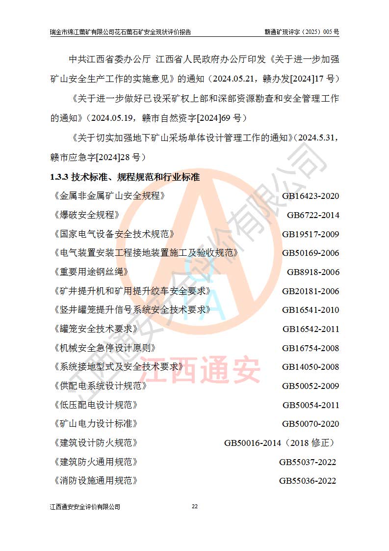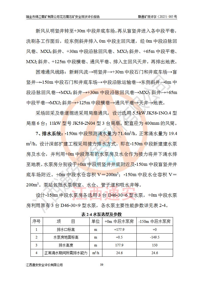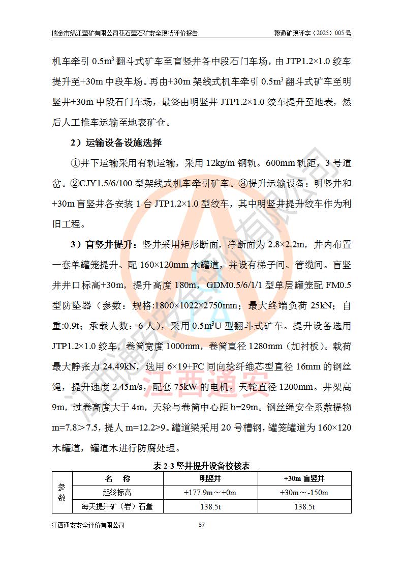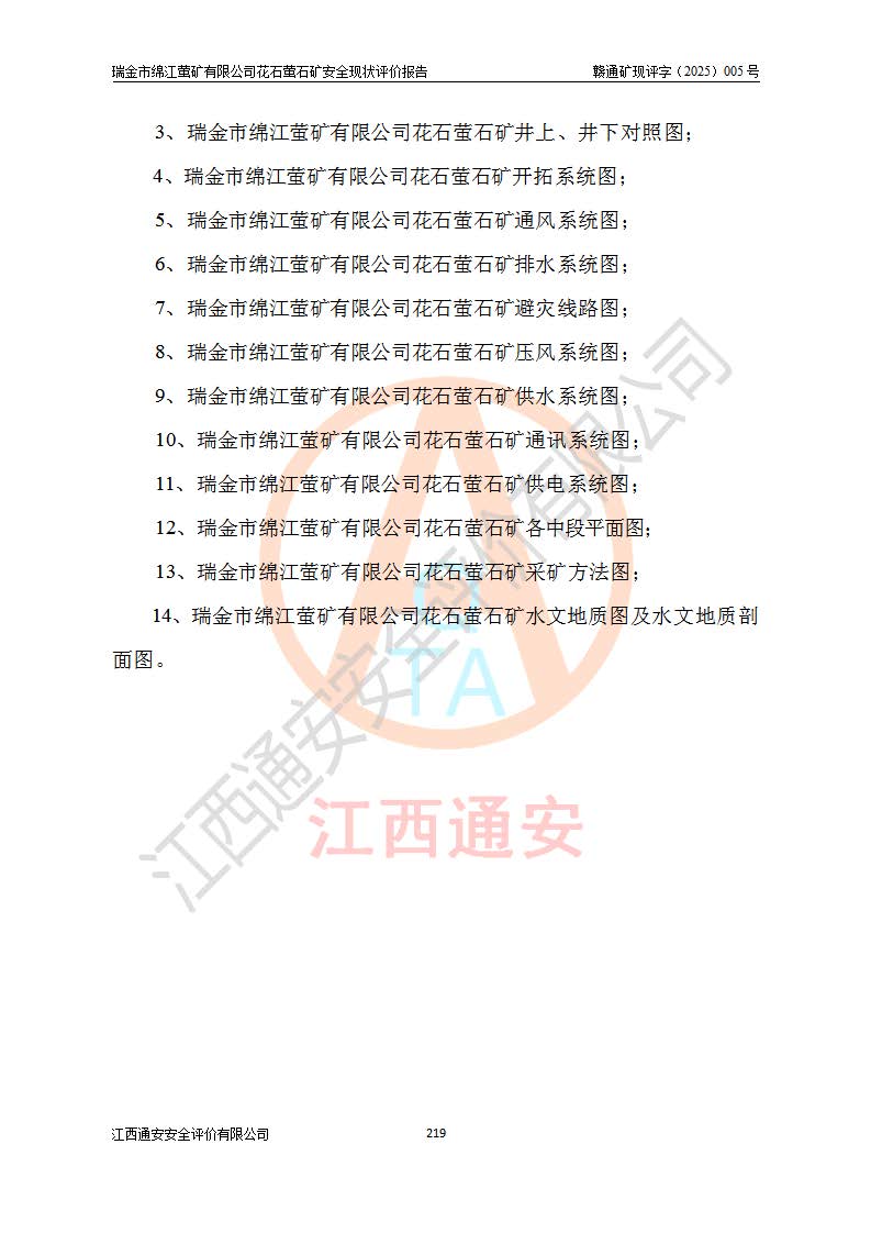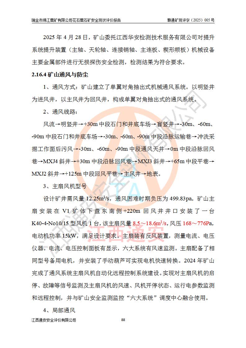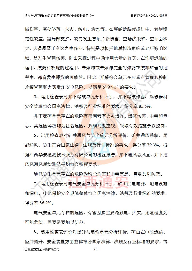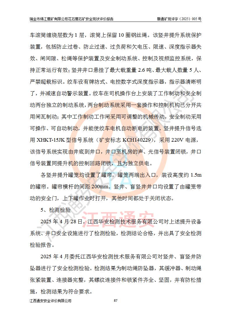 瑞金市绵江萤矿有限公司花石萤石矿区位于瑞金市南西215°方位直距30km处,矿区中心位置地理坐标为东经115°51′24″,北纬25°39′21″,行政区划属瑞金市谢坊镇管辖。 矿山前身为瑞金市金鑫矿产品实业有限公司花石萤矿。为了进一步稳固萤石矿产业链,2024年9月瑞金市绵江萤矿有限公司申请将瑞金市金鑫矿产品实业有限公司花石萤矿采矿权**至其公司。2025年4月6日,花石萤石矿完成了采矿权人**手续,并取得了新采矿许可证。 该萤石矿区开采始于上世纪九十年代,由当地民众在花石矿点和庙背坑矿点零星开采(庙背坑矿点位于花石矿点东侧,两个矿点矿体直线距离约1km,庙背坑矿点已停止采矿活动。本次评价对象为花石矿点)。本世纪初,经矿业秩序整顿、规范矿山开采,两矿点分别由不同采矿权人依法办理了采矿许可证,即庙背坑萤矿和花石萤石矿。2005年12月,根据赣州市人民**《赣市府办发〔2005〕14号》文件有关矿业权整合的指示精神要求,两个采矿权整合为一个采矿权人,即瑞金市金鑫矿产品实业有限公司,整合后采矿权面积2.4707km2,开采标高+220m~0m。整合后,2011年8月,花石萤石矿委托江西省冶金设计院有限责任公司编制了《瑞金市金鑫矿产品实业有限公司花石萤矿地下开采整改初步设计安全专篇》。整改设计开采对象为花石区段V1矿体,采用竖井+盲竖井联合开拓,主要井筒为SJ3竖井、MJ1盲竖井,SJ3竖井连接+125m中段,采用JTP-1.2×1.0型矿用提升绞车提升,MJ1盲竖井连接+65m中段、+83m中段,采用JTK-1.0×0.8型块式制动矿用提升绞车提升。设计开采深度+220m至+67m标高,共布置+125m、+83m、+65m三个中段;设计生产规模为4万吨/年,采矿方法选用浅孔留矿法。 根据整改设计要求,矿山经过近一年多的整改施工,2012年9月通过由原赣州市安全生产监督管理局组织的安全设施整改验收。2012年9月26日取得了由原江西省安全生产监督管理局延期换发的《安全生产许可证》(编号:FM安许证字[2005]M0033号),许可范围:萤石矿4万吨/年,竖井+盲竖井联合开拓,+67m中段地下开采。 由于原整改设计范围内(+67m以上中段)V1矿体资源储量无法使矿井达到持续稳定的生产接替,根据2011年11月264核工业大队《江西省瑞金市花石萤石矿资源储量核实报告》及矿山提交的2013年度资源储量动态检测报告。2013年4月,花石萤石矿又委托江西省冶金设计院有限责任公司为其编制了《瑞金市金鑫矿产品实业有限公司花石萤矿花石矿区地下开采改建工程初步设计安全专篇》。设计开采范围+83m~+0m标高;采用竖井开拓。设计新建开拓工程为新竖井及+83m、+40m、+0m三个中段。采矿方法为浅孔留矿法。 由于部分工程与设计不符。2014年10月,矿山委托江西省冶金设计院有限责任公司编制了《瑞金市金鑫矿产品实业有限公司花石萤矿花石矿区地下开采改建工程变更设计》,其中段布置变更为+30m、+0m中段;通风系统变更为以新竖井为进风井;采用SJ3北东已有的平峒(PD)及平硐内的人行、回风斜巷MXJ1、MXJ2 、MXJ3并配置相关工程后作为矿区北东翼矿体开采的北东翼回风系统。主扇安装于+190m中段回风道。 2015年9月,矿山改建工程安全设施通过了原江西省安全生产监督管理局组织专家组竣工验收,并取得了原江西省安监局延期换发的《安全生产许可证》(编号:FM安许证字[2005]M0033号),许可范围:萤石矿4万吨/年,竖井开拓,+30m、0m中段地下开采。 花石萤矿V1矿体经过多年开采后,原改建工程设计范围内(+0m以上中段)萤石矿资源储量日渐减少。为了扩大矿区资源储量,延长矿山服务年限,查明矿区深部萤石矿资源储量。2014年矿山申请了采矿权变更开采深度的请示。2015年1月16日矿山取得了原赣州市矿产资源管理局颁发的划定矿区范围批复(赣市矿划复[2015]0001号),划定矿区范围面积2.47km2,矿区范围由7个拐点圈定,开采深度由+220m~-150m。同年,矿山委托江西省核工业地质局二六四大队编制完成了《江西省瑞金市花石萤石矿区资源储量核实报告》并经过了赣州市金辉矿业技术服务有限公司评审(赣金辉储审字[2014]12号),原赣州市矿产资源管理局以“赣市矿储备字[2014]18号)”文对该报告备案。 为了使矿井达到持续稳定的生产接替,保持三级矿量平衡,2015年7月委托了江西省冶金设计院有限责任公司编制完成了《瑞金市金鑫矿产品实业有限公司花石萤矿花石区段地下开采延深扩建工程建设项目的可行性研究报告》,同年12月委托了赣州永安安全生产科技服务有限公司编制完成了《瑞金市金鑫矿产品实业有限公司花石萤矿花石区段地下开采延深扩建工程安全预评价报告》。2016年11月,矿山委托江西省冶金设计院有限责任公司编制完成了《瑞金市金鑫矿产品实业有限公司花石萤矿地下开采延深扩建工程初步设计及安全设施设计》,并于2017年4月13日通过原省安监局组织的专家评审,2017年7月10日由原江西省安全生产监督管理局下达了《关于瑞金市金鑫矿产品实业有限公司花石萤矿地下开采延深扩建工程安全设施设计审查意见》(赣安监非煤项目设审[2017]19号)。根据矿体赋存条件等因素,矿山深部扩建开拓工程设计采用竖井+盲竖井联合开拓,主要开采V1矿体,利用明竖井、+30m盲竖井作为主运输井。其中明竖井连接+30m、+0m两个中段;+30m盲竖井连接+0m、-30m、-60m、-90m、-120m、-150m六个中段。设计深部开拓共布置-30m、-60m、-90m、-120m、-150m五个中段。采矿方法