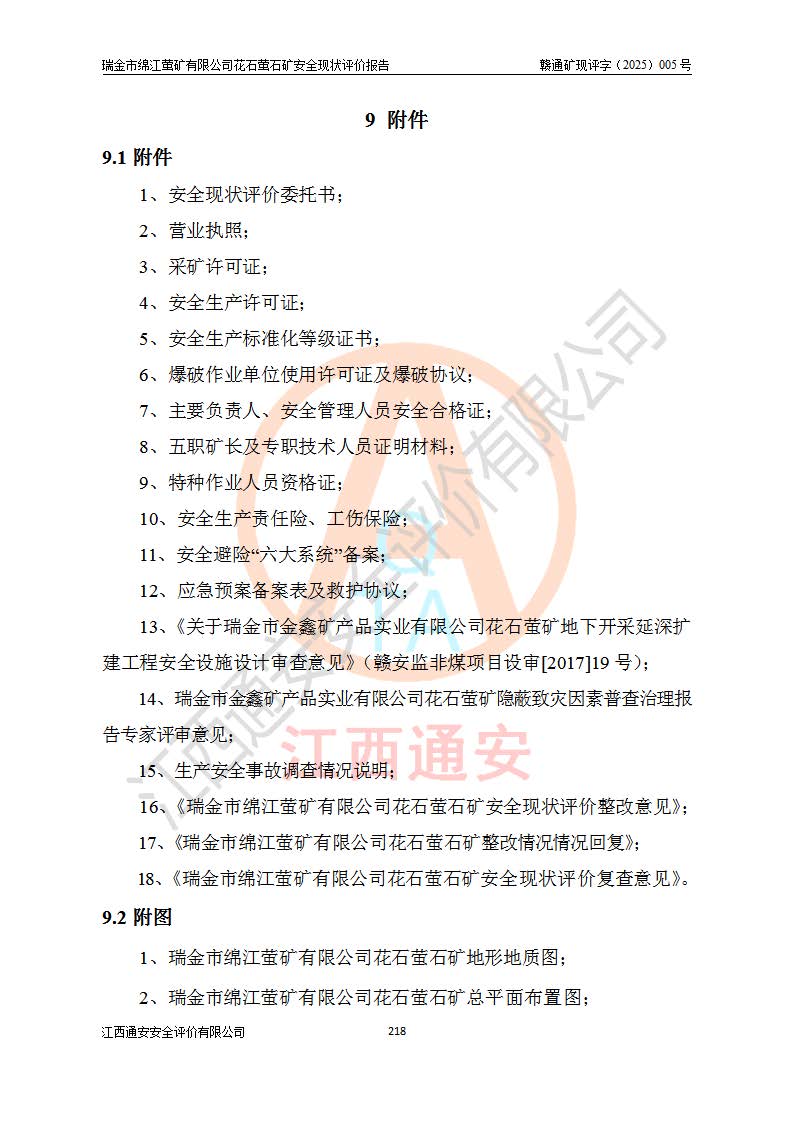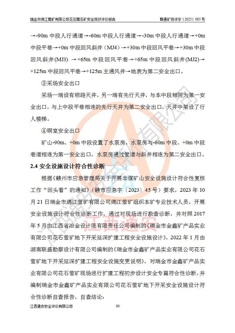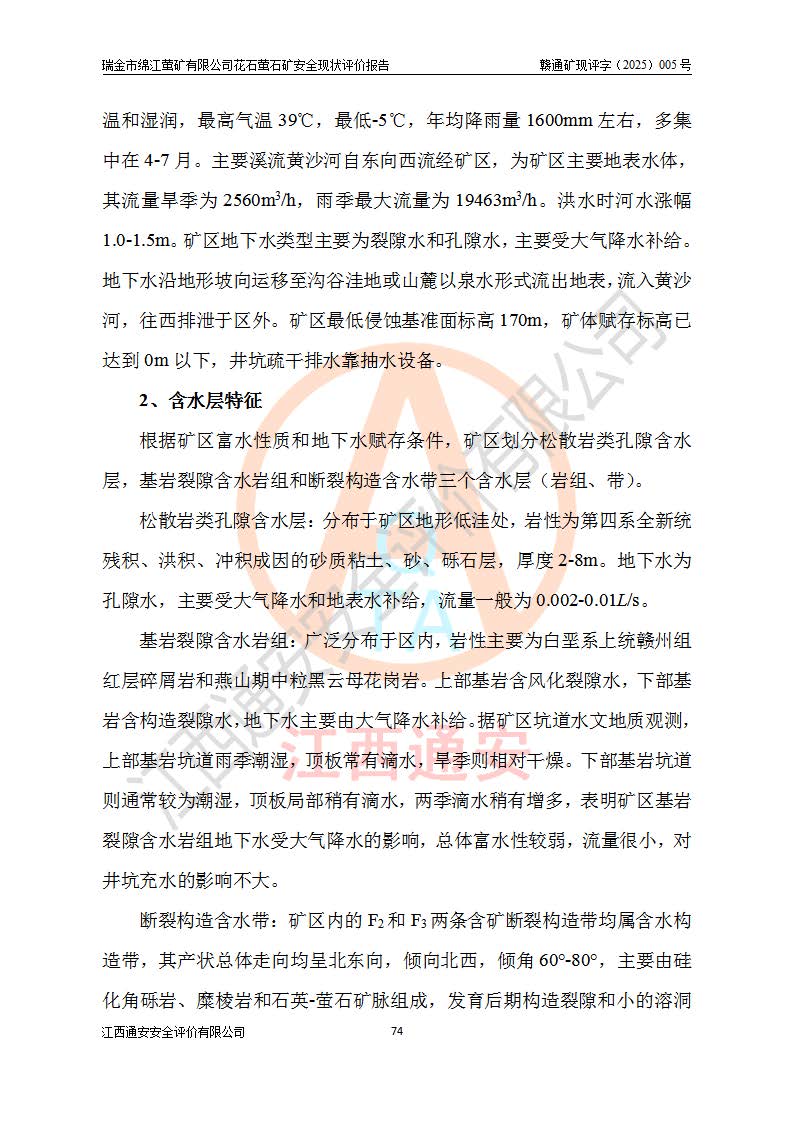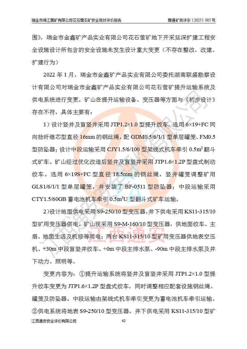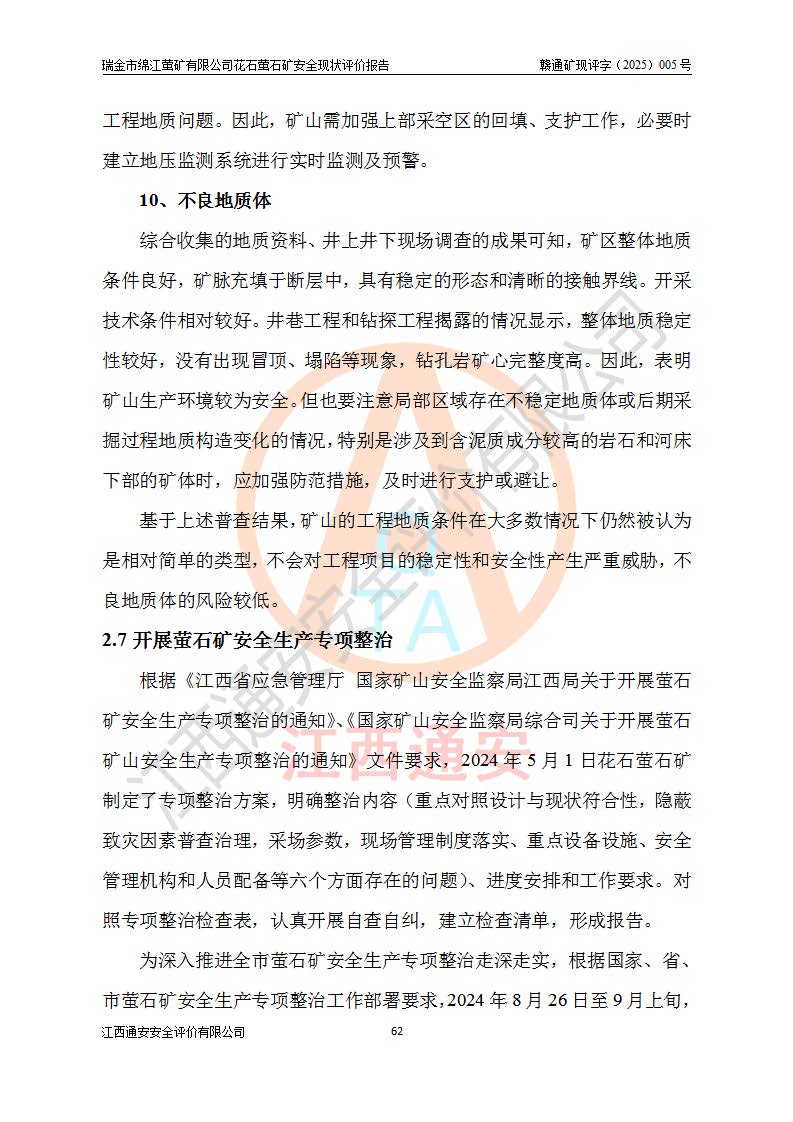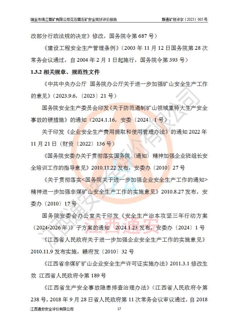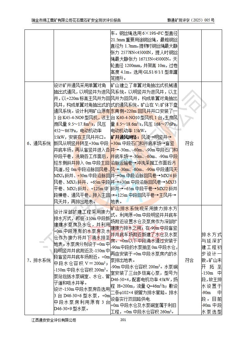 瑞金市绵江萤矿有限公司花石萤石矿区位于瑞金市南西215°方位直距30km处,矿区中心位置地理坐标为东经115°51′24″,北纬25°39′21″,行政区划属瑞金市谢坊镇管辖。 矿山前身为瑞金市金鑫矿产品实业有限公司花石萤矿。为了进一步稳固萤石矿产业链,2024年9月瑞金市绵江萤矿有限公司申请将瑞金市金鑫矿产品实业有限公司花石萤矿采矿权**至其公司。2025年4月6日,花石萤石矿完成了采矿权人**手续,并取得了新采矿许可证。 该萤石矿区开采始于上世纪九十年代,由当地民众在花石矿点和庙背坑矿点零星开采(庙背坑矿点位于花石矿点东侧,两个矿点矿体直线距离约1km,庙背坑矿点已停止采矿活动。本次评价对象为花石矿点)。本世纪初,经矿业秩序整顿、规范矿山开采,两矿点分别由不同采矿权人依法办理了采矿许可证,即庙背坑萤矿和花石萤石矿。2005年12月,根据赣州市人民**《赣市府办发〔2005〕14号》文件有关矿业权整合的指示精神要求,两个采矿权整合为一个采矿权人,即瑞金市金鑫矿产品实业有限公司,整合后采矿权面积2.4707km2,开采标高+220m~0m。整合后,2011年8月,花石萤石矿委托江西省冶金设计院有限责任公司编制了《瑞金市金鑫矿产品实业有限公司花石萤矿地下开采整改初步设计安全专篇》。整改设计开采对象为花石区段V1矿体,采用竖井+盲竖井联合开拓,主要井筒为SJ3竖井、MJ1盲竖井,SJ3竖井连接+125m中段,采用JTP-1.2×1.0型矿用提升绞车提升,MJ1盲竖井连接+65m中段、+83m中段,采用JTK-1.0×0.8型块式制动矿用提升绞车提升。设计开采深度+220m至+67m标高,共布置+125m、+83m、+65m三个中段;设计生产规模为4万吨/年,采矿方法选用浅孔留矿法。 根据整改设计要求,矿山经过近一年多的整改施工,2012年9月通过由原赣州市安全生产监督管理局组织的安全设施整改验收。2012年9月26日取得了由原江西省安全生产监督管理局延期换发的《安全生产许可证》(编号:FM安许证字[2005]M0033号),许可范围:萤石矿4万吨/年,竖井+盲竖井联合开拓,+67m中段地下开采。 由于原整改设计范围内(+67m以上中段)V1矿体资源储量无法使矿井达到持续稳定的生产接替,根据2011年11月264核工业大队《江西省瑞金市花石萤石矿资源储量核实报告》及矿山提交的2013年度资源储量动态检测报告。2013年4月,花石萤石矿又委托江西省冶金设计院有限责任公司为其编制了《瑞金市金鑫矿产品实业有限公司花石萤矿花石矿区地下开采改建工程初步设计安全专篇》。设计开采范围+83m~+0m标高;采用竖井开拓。设计新建开拓工程为新竖井及+83m、+40m、+0m三个中段。采矿方法为浅孔留矿法。 由于部分工程与设计不符。2014年10月,矿山委托江西省冶金设计院有限责任公司编制了《瑞金市金鑫矿产品实业有限公司花石萤矿花石矿区地下开采改建工程变更设计》,其中段布置变更为+30m、+0m中段;通风系统变更为以新竖井为进风井;采用SJ3北东已有的平峒(PD)及平硐内的人行、回风斜巷MXJ1、MXJ2 、MXJ3并配置相关工程后作为矿区北东翼矿体开采的北东翼回风系统。主扇安装于+190m中段回风道。 2015年9月,矿山改建工程安全设施通过了原江西省安全生产监督管理局组织专家组竣工验收,并取得了原江西省安监局延期换发的《安全生产许可证》(编号:FM安许证字[2005]M0033号),许可范围:萤石矿4万吨/年,竖井开拓,+30m、0m中段地下开采。 花石萤矿V1矿体经过多年开采后,原改建工程设计范围内(+0m以上中段)萤石矿资源储量日渐减少。为了扩大矿区资源储量,延长矿山服务年限,查明矿区深部萤石矿资源储量。2014年矿山申请了采矿权变更开采深度的请示。2015年1月16日矿山取得了原赣州市矿产资源管理局颁发的划定矿区范围批复(赣市矿划复[2015]0001号),划定矿区范围面积2.47km2,矿区范围由7个拐点圈定,开采深度由+220m~-150m。同年,矿山委托江西省核工业地质局二六四大队编制完成了《江西省瑞金市花石萤石矿区资源储量核实报告》并经过了赣州市金辉矿业技术服务有限公司评审(赣金辉储审字[2014]12号),原赣州市矿产资源管理局以“赣市矿储备字[2014]18号)”文对该报告备案。 为了使矿井达到持续稳定的生产接替,保持三级矿量平衡,2015年7月委托了江西省冶金设计院有限责任公司编制完成了《瑞金市金鑫矿产品实业有限公司花石萤矿花石区段地下开采延深扩建工程建设项目的可行性研究报告》,同年12月委托了赣州永安安全生产科技服务有限公司编制完成了《瑞金市金鑫矿产品实业有限公司花石萤矿花石区段地下开采延深扩建工程安全预评价报告》。2016年11月,矿山委托江西省冶金设计院有限责任公司编制完成了《瑞金市金鑫矿产品实业有限公司花石萤矿地下开采延深扩建工程初步设计及安全设施设计》,并于2017年4月13日通过原省安监局组织的专家评审,2017年7月10日由原江西省安全生产监督管理局下达了《关于瑞金市金鑫矿产品实业有限公司花石萤矿地下开采延深扩建工程安全设施设计审查意见》(赣安监非煤项目设审[2017]19号)。根据矿体赋存条件等因素,矿山深部扩建开拓工程设计采用竖井+盲竖井联合开拓,主要开采V1矿体,利用明竖井、+30m盲竖井作为主运输井。其中明竖井连接+30m、+0m两个中段;+30m盲竖井连接+0m、-30m、-60m、-90m、-120m、-150m六个中段。设计深部开拓共布置-30m、-60m、-90m、-120m、-150m五个中段。采矿方法