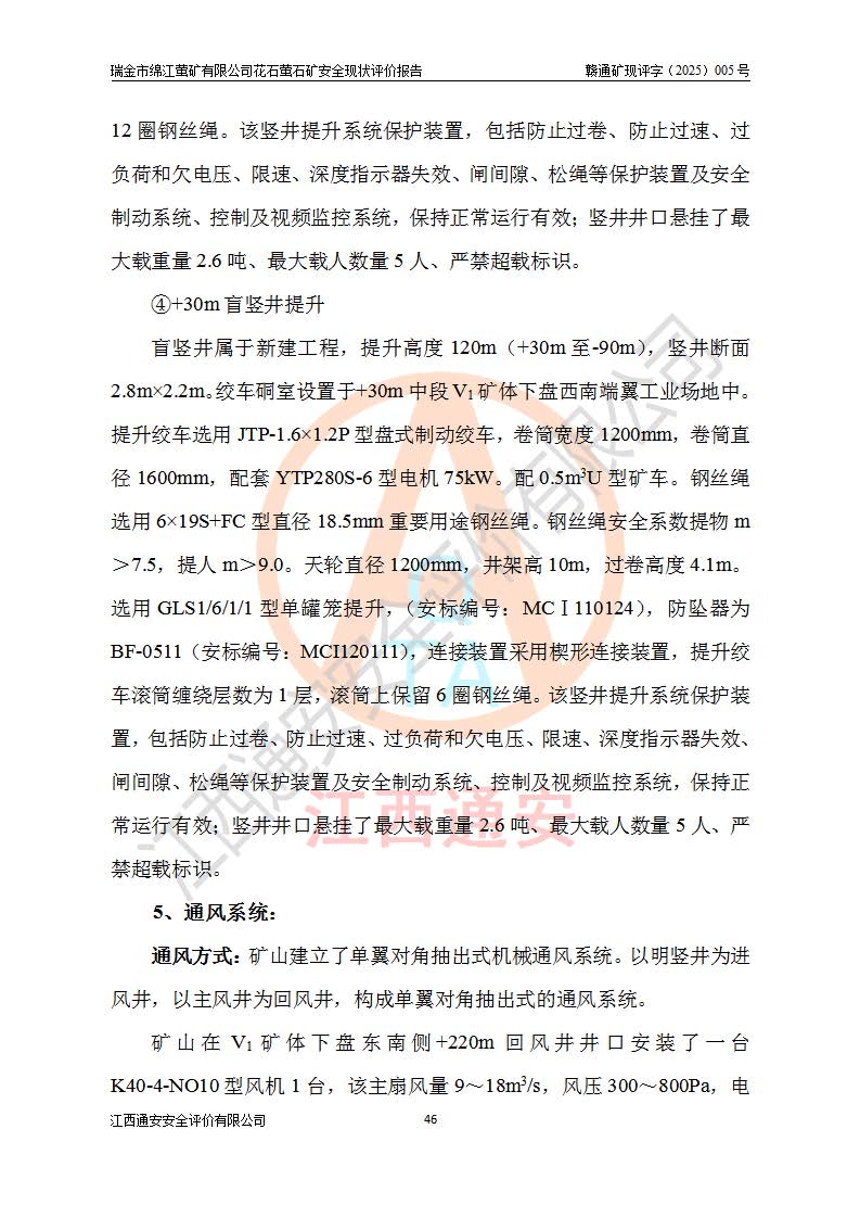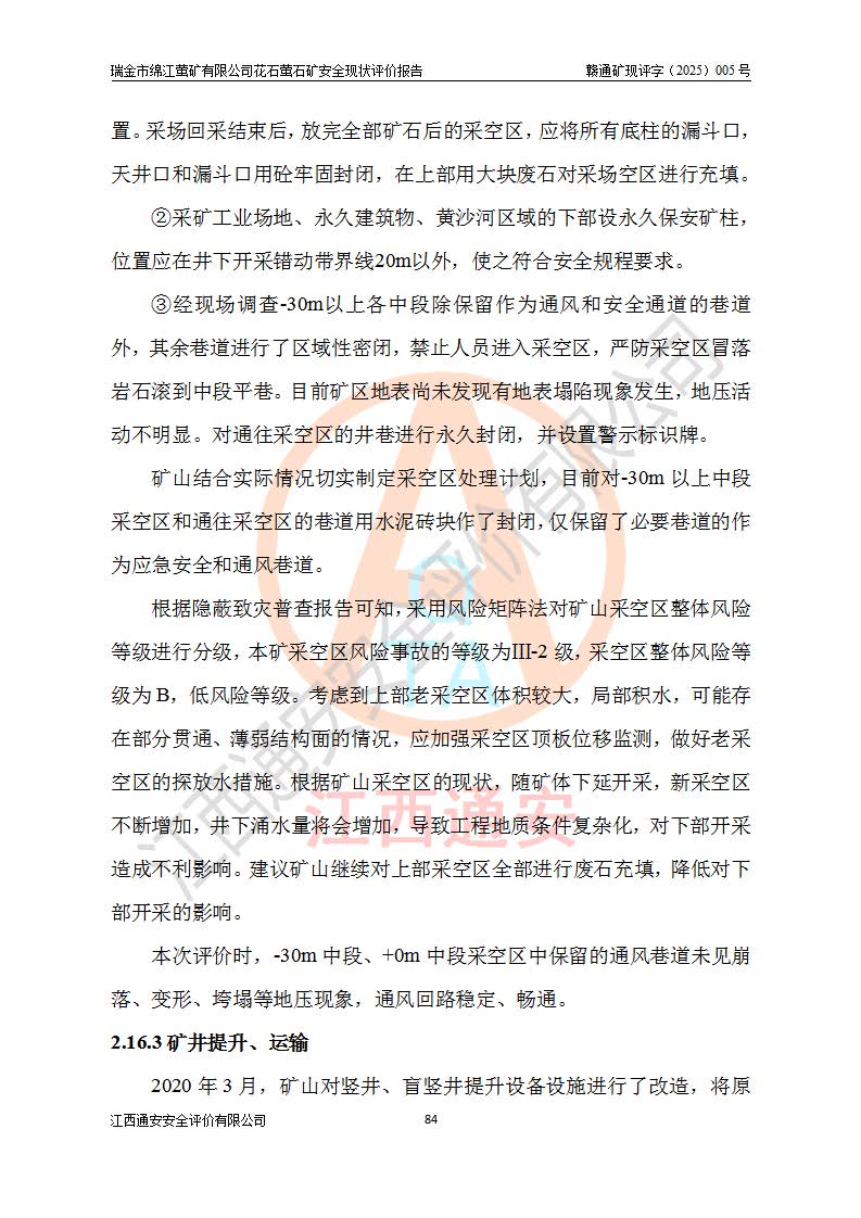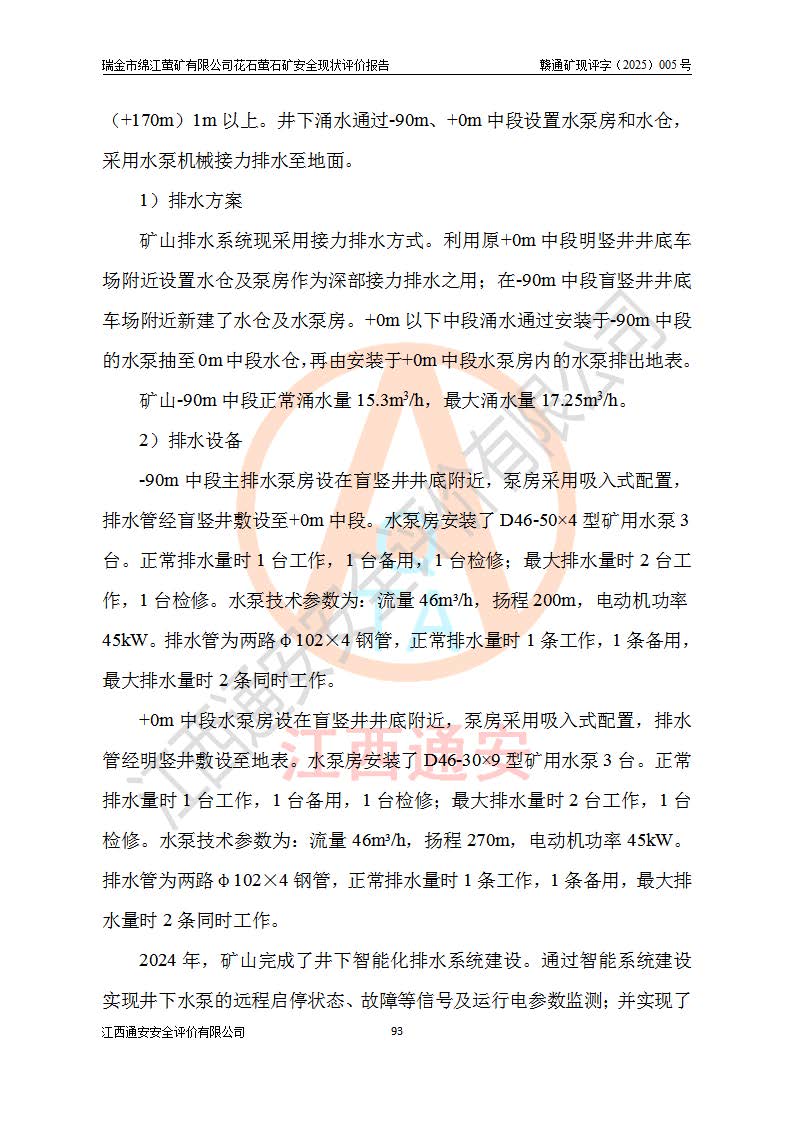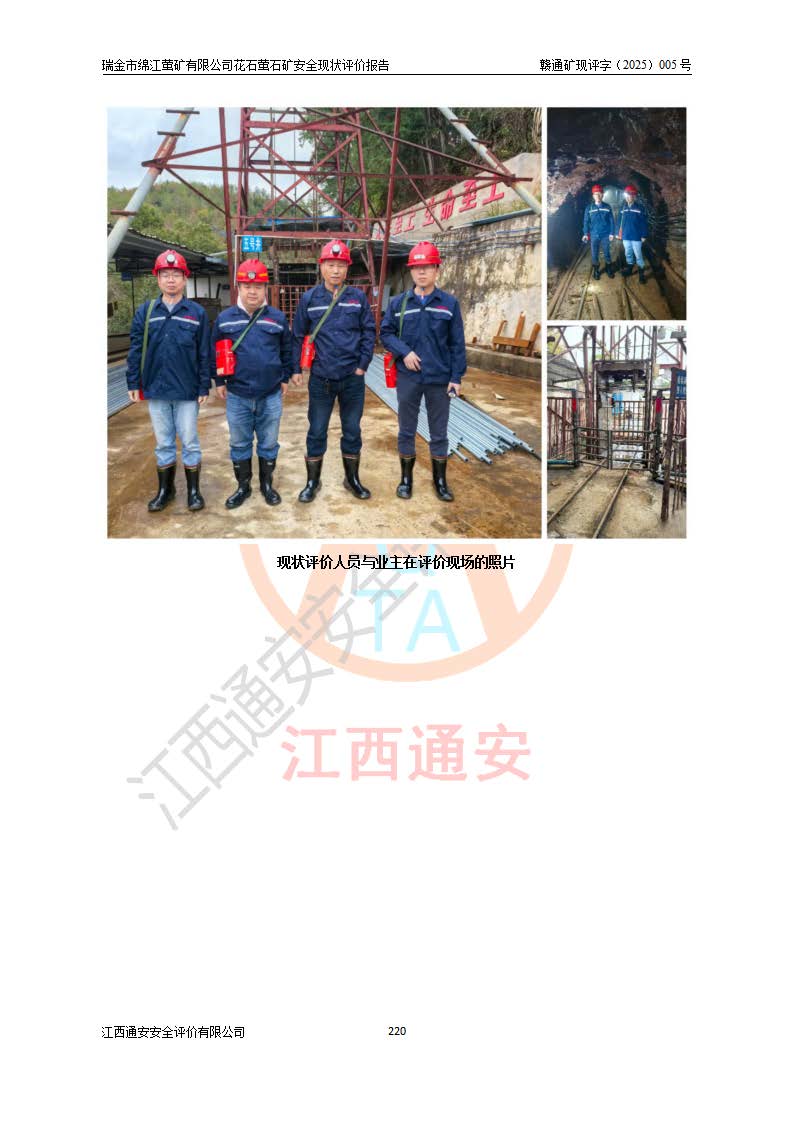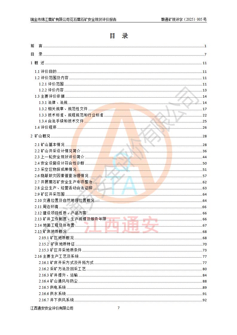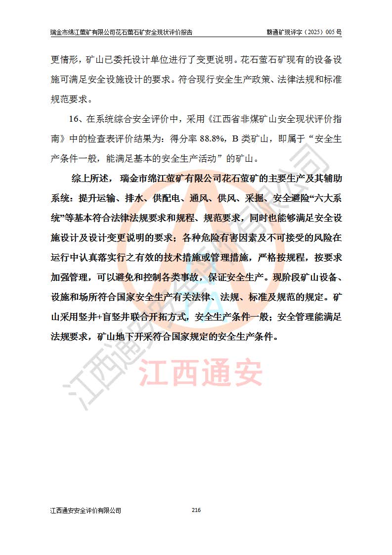 瑞金市绵江萤矿有限公司花石萤石矿区位于瑞金市南西215°方位直距30km处,矿区中心位置地理坐标为东经115°51′24″,北纬25°39′21″,行政区划属瑞金市谢坊镇管辖。 矿山前身为瑞金市金鑫矿产品实业有限公司花石萤矿。为了进一步稳固萤石矿产业链,2024年9月瑞金市绵江萤矿有限公司申请将瑞金市金鑫矿产品实业有限公司花石萤矿采矿权**至其公司。2025年4月6日,花石萤石矿完成了采矿权人**手续,并取得了新采矿许可证。 该萤石矿区开采始于上世纪九十年代,由当地民众在花石矿点和庙背坑矿点零星开采(庙背坑矿点位于花石矿点东侧,两个矿点矿体直线距离约1km,庙背坑矿点已停止采矿活动。本次评价对象为花石矿点)。本世纪初,经矿业秩序整顿、规范矿山开采,两矿点分别由不同采矿权人依法办理了采矿许可证,即庙背坑萤矿和花石萤石矿。2005年12月,根据赣州市人民**《赣市府办发〔2005〕14号》文件有关矿业权整合的指示精神要求,两个采矿权整合为一个采矿权人,即瑞金市金鑫矿产品实业有限公司,整合后采矿权面积2.4707km2,开采标高+220m~0m。整合后,2011年8月,花石萤石矿委托江西省冶金设计院有限责任公司编制了《瑞金市金鑫矿产品实业有限公司花石萤矿地下开采整改初步设计安全专篇》。整改设计开采对象为花石区段V1矿体,采用竖井+盲竖井联合开拓,主要井筒为SJ3竖井、MJ1盲竖井,SJ3竖井连接+125m中段,采用JTP-1.2×1.0型矿用提升绞车提升,MJ1盲竖井连接+65m中段、+83m中段,采用JTK-1.0×0.8型块式制动矿用提升绞车提升。设计开采深度+220m至+67m标高,共布置+125m、+83m、+65m三个中段;设计生产规模为4万吨/年,采矿方法选用浅孔留矿法。 根据整改设计要求,矿山经过近一年多的整改施工,2012年9月通过由原赣州市安全生产监督管理局组织的安全设施整改验收。2012年9月26日取得了由原江西省安全生产监督管理局延期换发的《安全生产许可证》(编号:FM安许证字[2005]M0033号),许可范围:萤石矿4万吨/年,竖井+盲竖井联合开拓,+67m中段地下开采。 由于原整改设计范围内(+67m以上中段)V1矿体资源储量无法使矿井达到持续稳定的生产接替,根据2011年11月264核工业大队《江西省瑞金市花石萤石矿资源储量核实报告》及矿山提交的2013年度资源储量动态检测报告。2013年4月,花石萤石矿又委托江西省冶金设计院有限责任公司为其编制了《瑞金市金鑫矿产品实业有限公司花石萤矿花石矿区地下开采改建工程初步设计安全专篇》。设计开采范围+83m~+0m标高;采用竖井开拓。设计新建开拓工程为新竖井及+83m、+40m、+0m三个中段。采矿方法为浅孔留矿法。 由于部分工程与设计不符。2014年10月,矿山委托江西省冶金设计院有限责任公司编制了《瑞金市金鑫矿产品实业有限公司花石萤矿花石矿区地下开采改建工程变更设计》,其中段布置变更为+30m、+0m中段;通风系统变更为以新竖井为进风井;采用SJ3北东已有的平峒(PD)及平硐内的人行、回风斜巷MXJ1、MXJ2 、MXJ3并配置相关工程后作为矿区北东翼矿体开采的北东翼回风系统。主扇安装于+190m中段回风道。 2015年9月,矿山改建工程安全设施通过了原江西省安全生产监督管理局组织专家组竣工验收,并取得了原江西省安监局延期换发的《安全生产许可证》(编号:FM安许证字[2005]M0033号),许可范围:萤石矿4万吨/年,竖井开拓,+30m、0m中段地下开采。 花石萤矿V1矿体经过多年开采后,原改建工程设计范围内(+0m以上中段)萤石矿资源储量日渐减少。为了扩大矿区资源储量,延长矿山服务年限,查明矿区深部萤石矿资源储量。2014年矿山申请了采矿权变更开采深度的请示。2015年1月16日矿山取得了原赣州市矿产资源管理局颁发的划定矿区范围批复(赣市矿划复[2015]0001号),划定矿区范围面积2.47km2,矿区范围由7个拐点圈定,开采深度由+220m~-150m。同年,矿山委托江西省核工业地质局二六四大队编制完成了《江西省瑞金市花石萤石矿区资源储量核实报告》并经过了赣州市金辉矿业技术服务有限公司评审(赣金辉储审字[2014]12号),原赣州市矿产资源管理局以“赣市矿储备字[2014]18号)”文对该报告备案。 为了使矿井达到持续稳定的生产接替,保持三级矿量平衡,2015年7月委托了江西省冶金设计院有限责任公司编制完成了《瑞金市金鑫矿产品实业有限公司花石萤矿花石区段地下开采延深扩建工程建设项目的可行性研究报告》,同年12月委托了赣州永安安全生产科技服务有限公司编制完成了《瑞金市金鑫矿产品实业有限公司花石萤矿花石区段地下开采延深扩建工程安全预评价报告》。2016年11月,矿山委托江西省冶金设计院有限责任公司编制完成了《瑞金市金鑫矿产品实业有限公司花石萤矿地下开采延深扩建工程初步设计及安全设施设计》,并于2017年4月13日通过原省安监局组织的专家评审,2017年7月10日由原江西省安全生产监督管理局下达了《关于瑞金市金鑫矿产品实业有限公司花石萤矿地下开采延深扩建工程安全设施设计审查意见》(赣安监非煤项目设审[2017]19号)。根据矿体赋存条件等因素,矿山深部扩建开拓工程设计采用竖井+盲竖井联合开拓,主要开采V1矿体,利用明竖井、+30m盲竖井作为主运输井。其中明竖井连接+30m、+0m两个中段;+30m盲竖井连接+0m、-30m、-60m、-90m、-120m、-150m六个中段。设计深部开拓共布置-30m、-60m、-90m、-120m、-150m五个中段。采矿方法