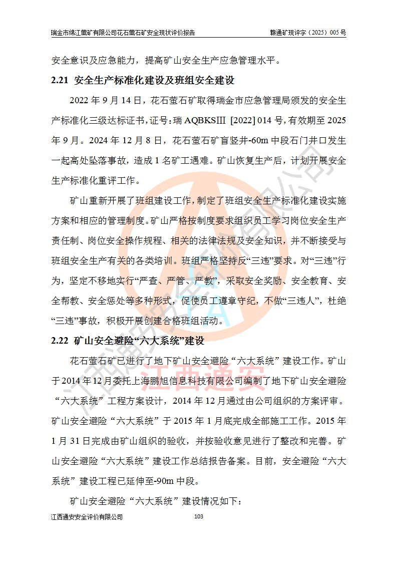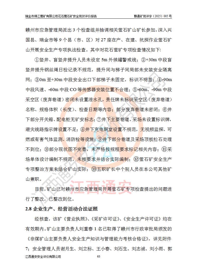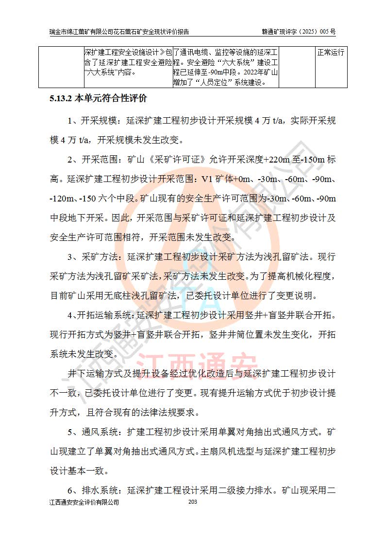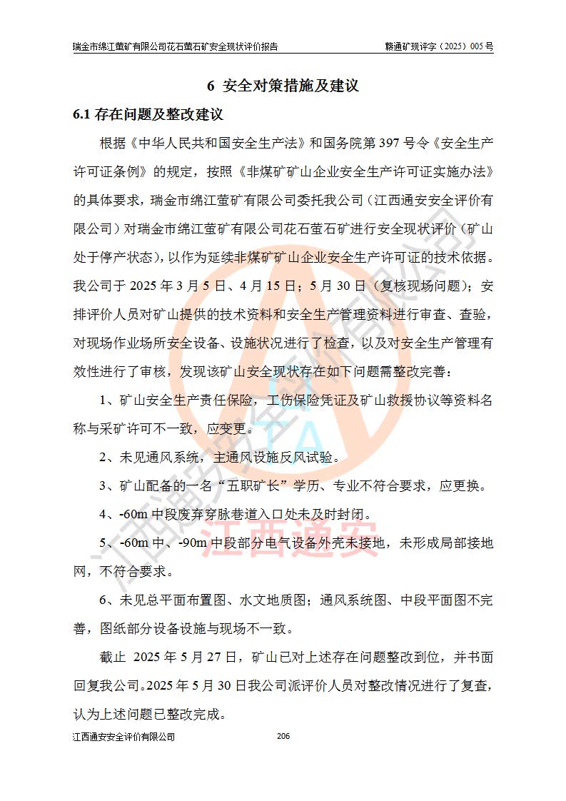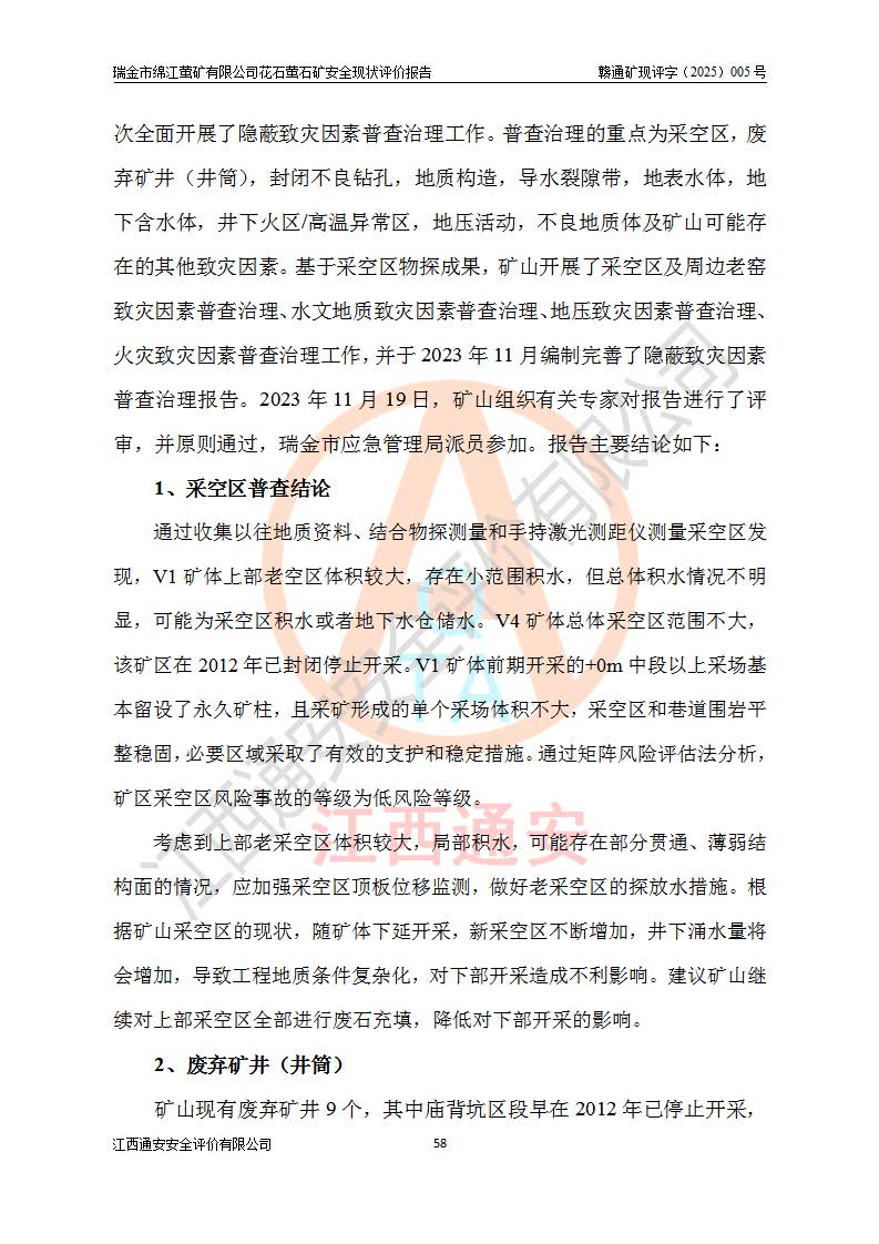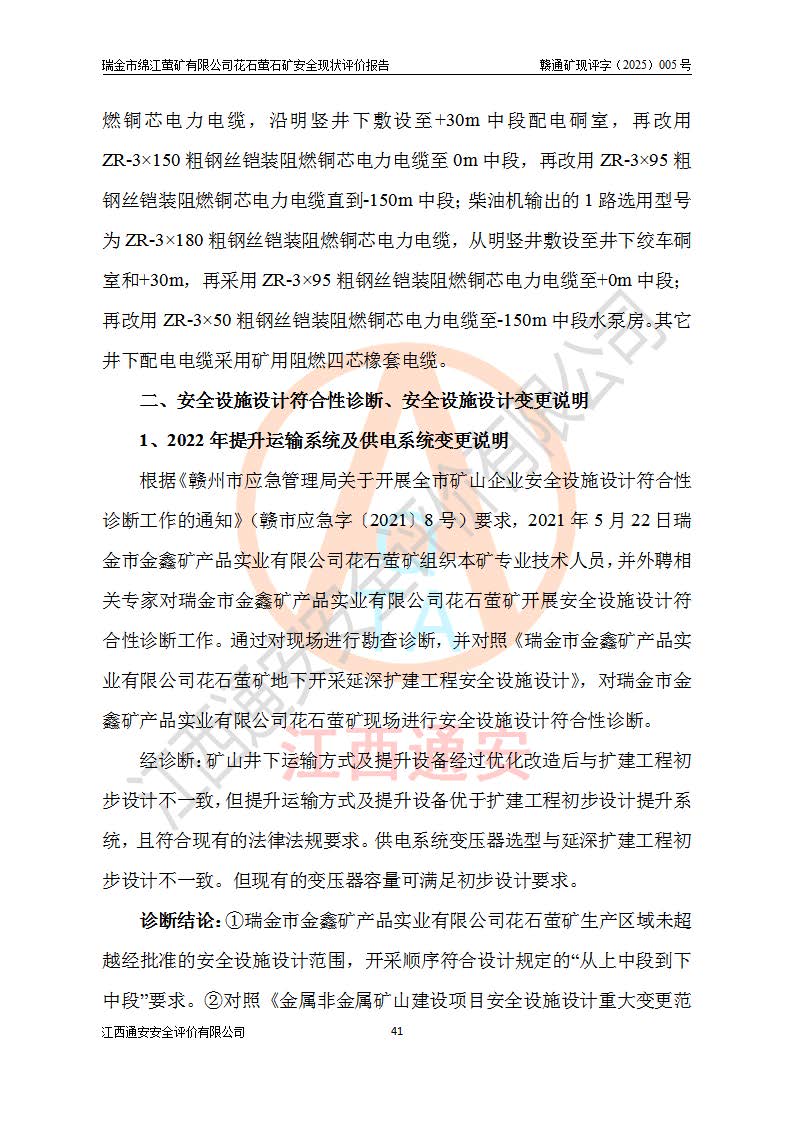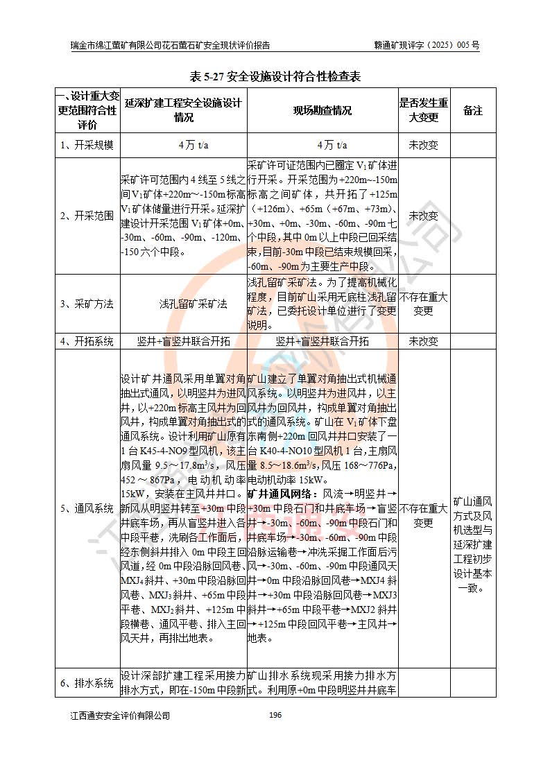 瑞金市绵江萤矿有限公司花石萤石矿区位于瑞金市南西215°方位直距30km处,矿区中心位置地理坐标为东经115°51′24″,北纬25°39′21″,行政区划属瑞金市谢坊镇管辖。 矿山前身为瑞金市金鑫矿产品实业有限公司花石萤矿。为了进一步稳固萤石矿产业链,2024年9月瑞金市绵江萤矿有限公司申请将瑞金市金鑫矿产品实业有限公司花石萤矿采矿权**至其公司。2025年4月6日,花石萤石矿完成了采矿权人**手续,并取得了新采矿许可证。 该萤石矿区开采始于上世纪九十年代,由当地民众在花石矿点和庙背坑矿点零星开采(庙背坑矿点位于花石矿点东侧,两个矿点矿体直线距离约1km,庙背坑矿点已停止采矿活动。本次评价对象为花石矿点)。本世纪初,经矿业秩序整顿、规范矿山开采,两矿点分别由不同采矿权人依法办理了采矿许可证,即庙背坑萤矿和花石萤石矿。2005年12月,根据赣州市人民**《赣市府办发〔2005〕14号》文件有关矿业权整合的指示精神要求,两个采矿权整合为一个采矿权人,即瑞金市金鑫矿产品实业有限公司,整合后采矿权面积2.4707km2,开采标高+220m~0m。整合后,2011年8月,花石萤石矿委托江西省冶金设计院有限责任公司编制了《瑞金市金鑫矿产品实业有限公司花石萤矿地下开采整改初步设计安全专篇》。整改设计开采对象为花石区段V1矿体,采用竖井+盲竖井联合开拓,主要井筒为SJ3竖井、MJ1盲竖井,SJ3竖井连接+125m中段,采用JTP-1.2×1.0型矿用提升绞车提升,MJ1盲竖井连接+65m中段、+83m中段,采用JTK-1.0×0.8型块式制动矿用提升绞车提升。设计开采深度+220m至+67m标高,共布置+125m、+83m、+65m三个中段;设计生产规模为4万吨/年,采矿方法选用浅孔留矿法。 根据整改设计要求,矿山经过近一年多的整改施工,2012年9月通过由原赣州市安全生产监督管理局组织的安全设施整改验收。2012年9月26日取得了由原江西省安全生产监督管理局延期换发的《安全生产许可证》(编号:FM安许证字[2005]M0033号),许可范围:萤石矿4万吨/年,竖井+盲竖井联合开拓,+67m中段地下开采。 由于原整改设计范围内(+67m以上中段)V1矿体资源储量无法使矿井达到持续稳定的生产接替,根据2011年11月264核工业大队《江西省瑞金市花石萤石矿资源储量核实报告》及矿山提交的2013年度资源储量动态检测报告。2013年4月,花石萤石矿又委托江西省冶金设计院有限责任公司为其编制了《瑞金市金鑫矿产品实业有限公司花石萤矿花石矿区地下开采改建工程初步设计安全专篇》。设计开采范围+83m~+0m标高;采用竖井开拓。设计新建开拓工程为新竖井及+83m、+40m、+0m三个中段。采矿方法为浅孔留矿法。 由于部分工程与设计不符。2014年10月,矿山委托江西省冶金设计院有限责任公司编制了《瑞金市金鑫矿产品实业有限公司花石萤矿花石矿区地下开采改建工程变更设计》,其中段布置变更为+30m、+0m中段;通风系统变更为以新竖井为进风井;采用SJ3北东已有的平峒(PD)及平硐内的人行、回风斜巷MXJ1、MXJ2 、MXJ3并配置相关工程后作为矿区北东翼矿体开采的北东翼回风系统。主扇安装于+190m中段回风道。 2015年9月,矿山改建工程安全设施通过了原江西省安全生产监督管理局组织专家组竣工验收,并取得了原江西省安监局延期换发的《安全生产许可证》(编号:FM安许证字[2005]M0033号),许可范围:萤石矿4万吨/年,竖井开拓,+30m、0m中段地下开采。 花石萤矿V1矿体经过多年开采后,原改建工程设计范围内(+0m以上中段)萤石矿资源储量日渐减少。为了扩大矿区资源储量,延长矿山服务年限,查明矿区深部萤石矿资源储量。2014年矿山申请了采矿权变更开采深度的请示。2015年1月16日矿山取得了原赣州市矿产资源管理局颁发的划定矿区范围批复(赣市矿划复[2015]0001号),划定矿区范围面积2.47km2,矿区范围由7个拐点圈定,开采深度由+220m~-150m。同年,矿山委托江西省核工业地质局二六四大队编制完成了《江西省瑞金市花石萤石矿区资源储量核实报告》并经过了赣州市金辉矿业技术服务有限公司评审(赣金辉储审字[2014]12号),原赣州市矿产资源管理局以“赣市矿储备字[2014]18号)”文对该报告备案。 为了使矿井达到持续稳定的生产接替,保持三级矿量平衡,2015年7月委托了江西省冶金设计院有限责任公司编制完成了《瑞金市金鑫矿产品实业有限公司花石萤矿花石区段地下开采延深扩建工程建设项目的可行性研究报告》,同年12月委托了赣州永安安全生产科技服务有限公司编制完成了《瑞金市金鑫矿产品实业有限公司花石萤矿花石区段地下开采延深扩建工程安全预评价报告》。2016年11月,矿山委托江西省冶金设计院有限责任公司编制完成了《瑞金市金鑫矿产品实业有限公司花石萤矿地下开采延深扩建工程初步设计及安全设施设计》,并于2017年4月13日通过原省安监局组织的专家评审,2017年7月10日由原江西省安全生产监督管理局下达了《关于瑞金市金鑫矿产品实业有限公司花石萤矿地下开采延深扩建工程安全设施设计审查意见》(赣安监非煤项目设审[2017]19号)。根据矿体赋存条件等因素,矿山深部扩建开拓工程设计采用竖井+盲竖井联合开拓,主要开采V1矿体,利用明竖井、+30m盲竖井作为主运输井。其中明竖井连接+30m、+0m两个中段;+30m盲竖井连接+0m、-30m、-60m、-90m、-120m、-150m六个中段。设计深部开拓共布置-30m、-60m、-90m、-120m、-150m五个中段。采矿方法