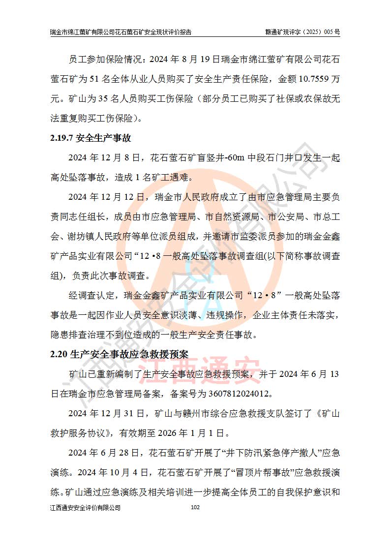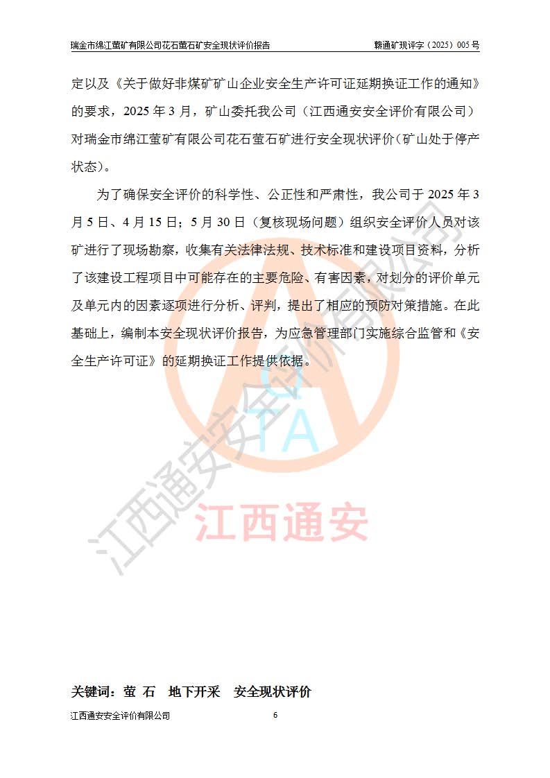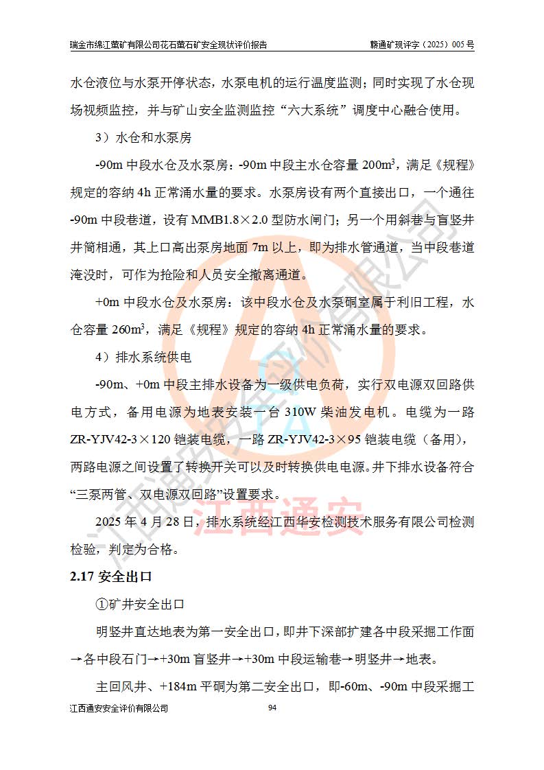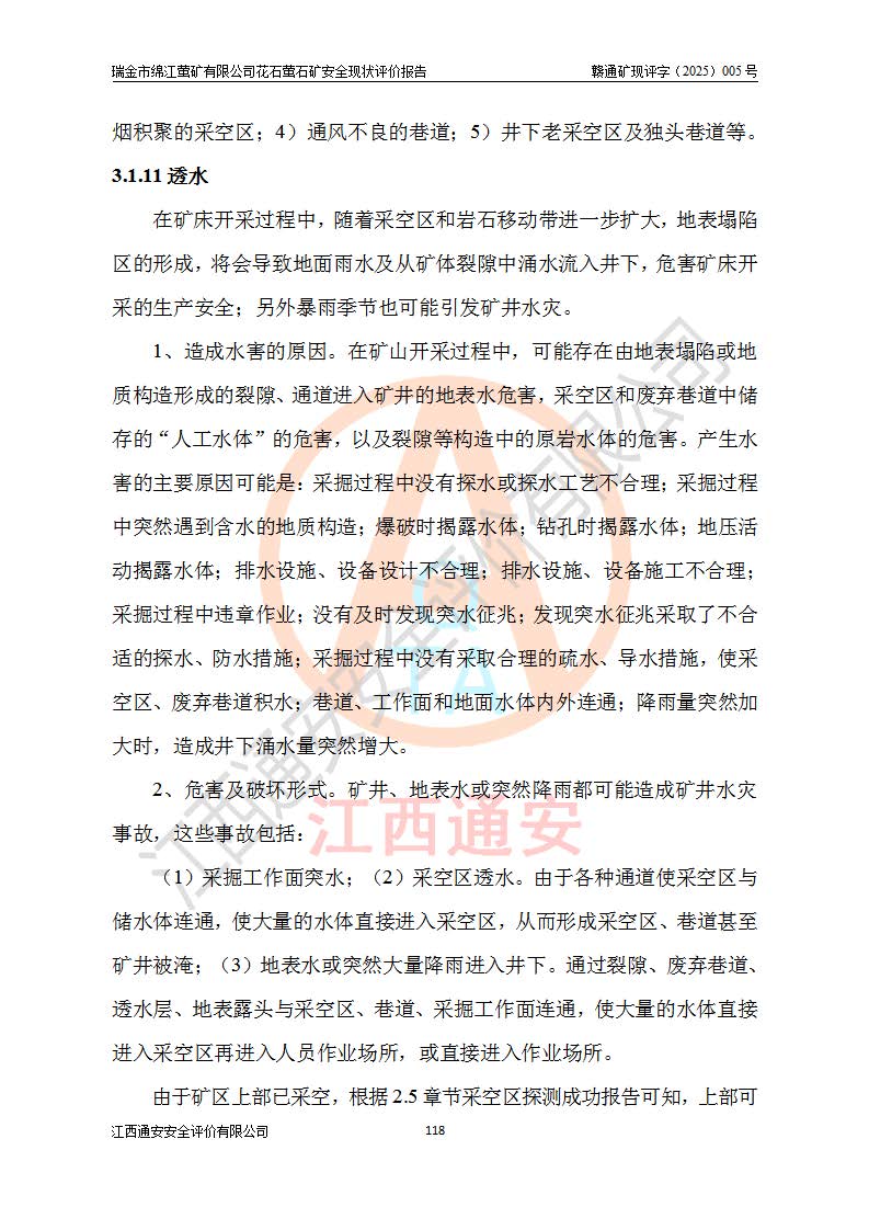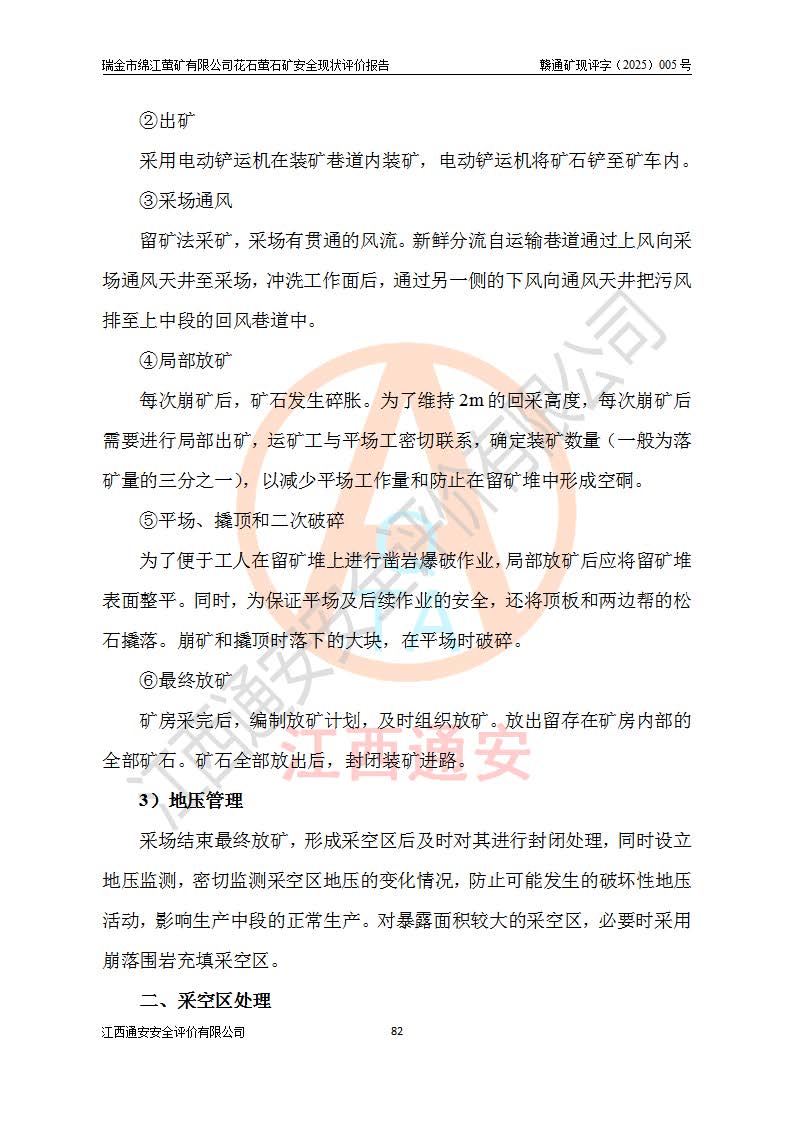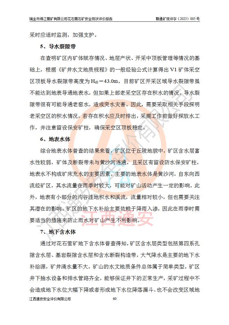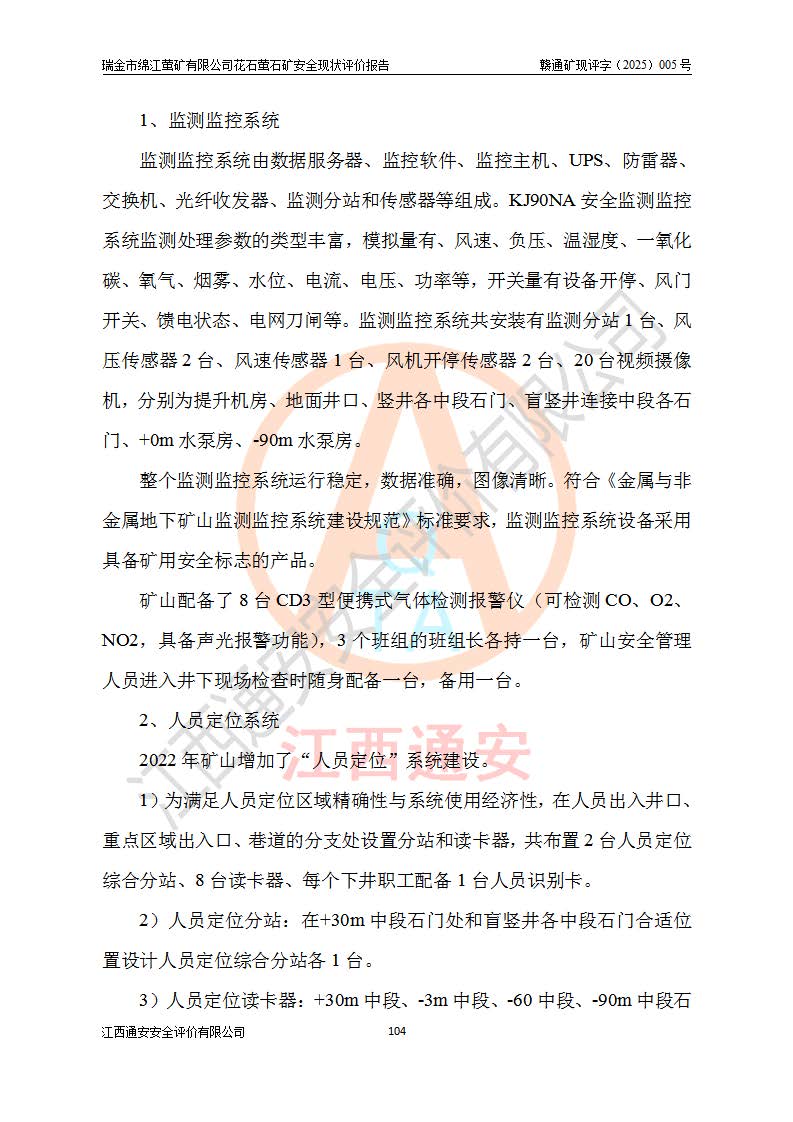 瑞金市绵江萤矿有限公司花石萤石矿区位于瑞金市南西215°方位直距30km处,矿区中心位置地理坐标为东经115°51′24″,北纬25°39′21″,行政区划属瑞金市谢坊镇管辖。 矿山前身为瑞金市金鑫矿产品实业有限公司花石萤矿。为了进一步稳固萤石矿产业链,2024年9月瑞金市绵江萤矿有限公司申请将瑞金市金鑫矿产品实业有限公司花石萤矿采矿权**至其公司。2025年4月6日,花石萤石矿完成了采矿权人**手续,并取得了新采矿许可证。 该萤石矿区开采始于上世纪九十年代,由当地民众在花石矿点和庙背坑矿点零星开采(庙背坑矿点位于花石矿点东侧,两个矿点矿体直线距离约1km,庙背坑矿点已停止采矿活动。本次评价对象为花石矿点)。本世纪初,经矿业秩序整顿、规范矿山开采,两矿点分别由不同采矿权人依法办理了采矿许可证,即庙背坑萤矿和花石萤石矿。2005年12月,根据赣州市人民**《赣市府办发〔2005〕14号》文件有关矿业权整合的指示精神要求,两个采矿权整合为一个采矿权人,即瑞金市金鑫矿产品实业有限公司,整合后采矿权面积2.4707km2,开采标高+220m~0m。整合后,2011年8月,花石萤石矿委托江西省冶金设计院有限责任公司编制了《瑞金市金鑫矿产品实业有限公司花石萤矿地下开采整改初步设计安全专篇》。整改设计开采对象为花石区段V1矿体,采用竖井+盲竖井联合开拓,主要井筒为SJ3竖井、MJ1盲竖井,SJ3竖井连接+125m中段,采用JTP-1.2×1.0型矿用提升绞车提升,MJ1盲竖井连接+65m中段、+83m中段,采用JTK-1.0×0.8型块式制动矿用提升绞车提升。设计开采深度+220m至+67m标高,共布置+125m、+83m、+65m三个中段;设计生产规模为4万吨/年,采矿方法选用浅孔留矿法。 根据整改设计要求,矿山经过近一年多的整改施工,2012年9月通过由原赣州市安全生产监督管理局组织的安全设施整改验收。2012年9月26日取得了由原江西省安全生产监督管理局延期换发的《安全生产许可证》(编号:FM安许证字[2005]M0033号),许可范围:萤石矿4万吨/年,竖井+盲竖井联合开拓,+67m中段地下开采。 由于原整改设计范围内(+67m以上中段)V1矿体资源储量无法使矿井达到持续稳定的生产接替,根据2011年11月264核工业大队《江西省瑞金市花石萤石矿资源储量核实报告》及矿山提交的2013年度资源储量动态检测报告。2013年4月,花石萤石矿又委托江西省冶金设计院有限责任公司为其编制了《瑞金市金鑫矿产品实业有限公司花石萤矿花石矿区地下开采改建工程初步设计安全专篇》。设计开采范围+83m~+0m标高;采用竖井开拓。设计新建开拓工程为新竖井及+83m、+40m、+0m三个中段。采矿方法为浅孔留矿法。 由于部分工程与设计不符。2014年10月,矿山委托江西省冶金设计院有限责任公司编制了《瑞金市金鑫矿产品实业有限公司花石萤矿花石矿区地下开采改建工程变更设计》,其中段布置变更为+30m、+0m中段;通风系统变更为以新竖井为进风井;采用SJ3北东已有的平峒(PD)及平硐内的人行、回风斜巷MXJ1、MXJ2 、MXJ3并配置相关工程后作为矿区北东翼矿体开采的北东翼回风系统。主扇安装于+190m中段回风道。 2015年9月,矿山改建工程安全设施通过了原江西省安全生产监督管理局组织专家组竣工验收,并取得了原江西省安监局延期换发的《安全生产许可证》(编号:FM安许证字[2005]M0033号),许可范围:萤石矿4万吨/年,竖井开拓,+30m、0m中段地下开采。 花石萤矿V1矿体经过多年开采后,原改建工程设计范围内(+0m以上中段)萤石矿资源储量日渐减少。为了扩大矿区资源储量,延长矿山服务年限,查明矿区深部萤石矿资源储量。2014年矿山申请了采矿权变更开采深度的请示。2015年1月16日矿山取得了原赣州市矿产资源管理局颁发的划定矿区范围批复(赣市矿划复[2015]0001号),划定矿区范围面积2.47km2,矿区范围由7个拐点圈定,开采深度由+220m~-150m。同年,矿山委托江西省核工业地质局二六四大队编制完成了《江西省瑞金市花石萤石矿区资源储量核实报告》并经过了赣州市金辉矿业技术服务有限公司评审(赣金辉储审字[2014]12号),原赣州市矿产资源管理局以“赣市矿储备字[2014]18号)”文对该报告备案。 为了使矿井达到持续稳定的生产接替,保持三级矿量平衡,2015年7月委托了江西省冶金设计院有限责任公司编制完成了《瑞金市金鑫矿产品实业有限公司花石萤矿花石区段地下开采延深扩建工程建设项目的可行性研究报告》,同年12月委托了赣州永安安全生产科技服务有限公司编制完成了《瑞金市金鑫矿产品实业有限公司花石萤矿花石区段地下开采延深扩建工程安全预评价报告》。2016年11月,矿山委托江西省冶金设计院有限责任公司编制完成了《瑞金市金鑫矿产品实业有限公司花石萤矿地下开采延深扩建工程初步设计及安全设施设计》,并于2017年4月13日通过原省安监局组织的专家评审,2017年7月10日由原江西省安全生产监督管理局下达了《关于瑞金市金鑫矿产品实业有限公司花石萤矿地下开采延深扩建工程安全设施设计审查意见》(赣安监非煤项目设审[2017]19号)。根据矿体赋存条件等因素,矿山深部扩建开拓工程设计采用竖井+盲竖井联合开拓,主要开采V1矿体,利用明竖井、+30m盲竖井作为主运输井。其中明竖井连接+30m、+0m两个中段;+30m盲竖井连接+0m、-30m、-60m、-90m、-120m、-150m六个中段。设计深部开拓共布置-30m、-60m、-90m、-120m、-150m五个中段。采矿方法