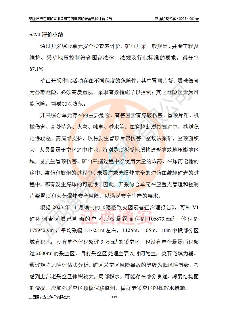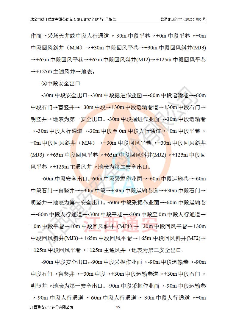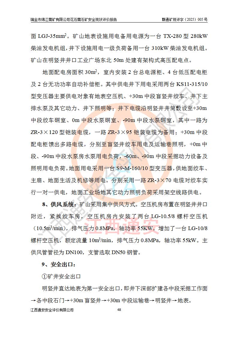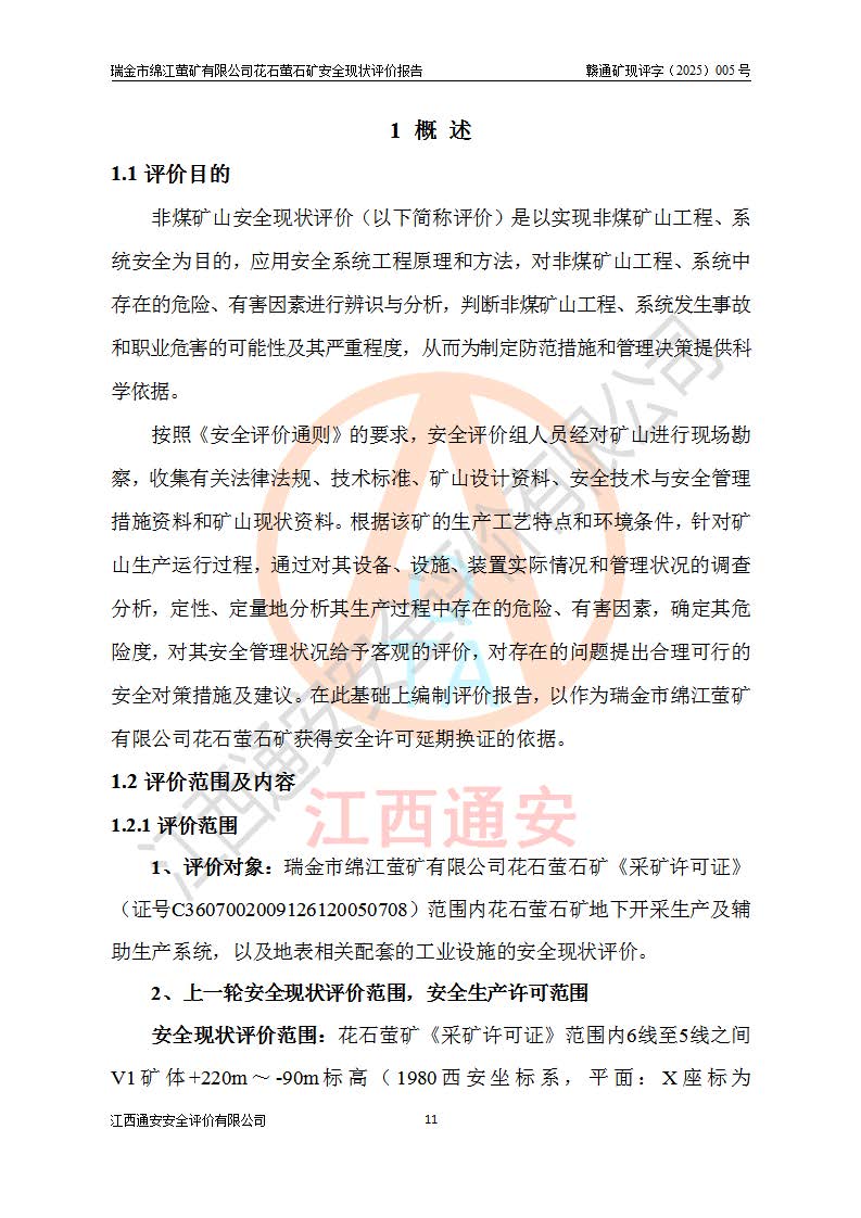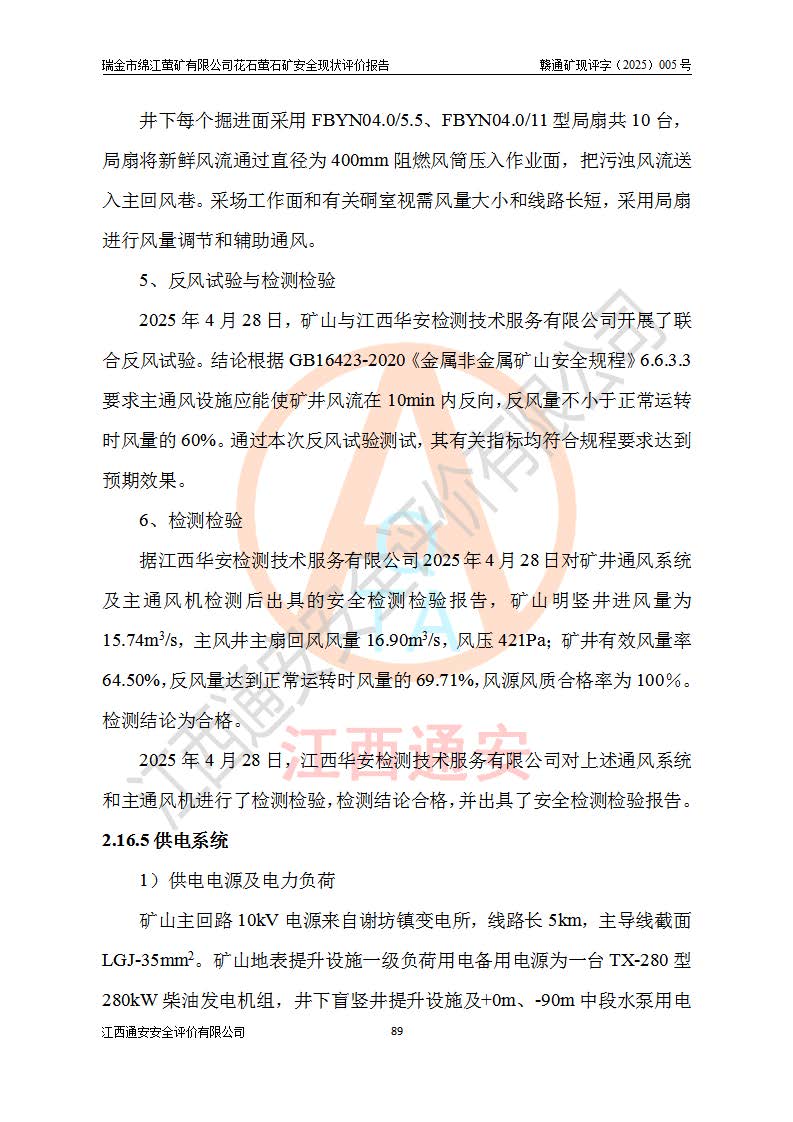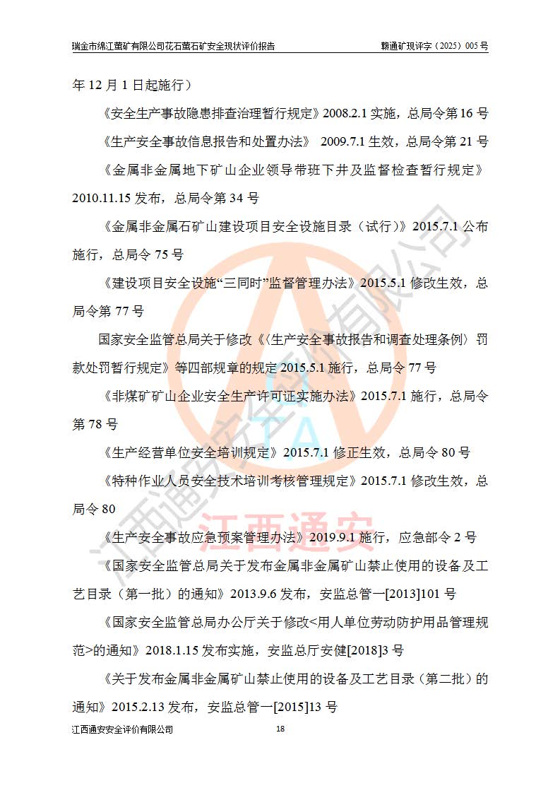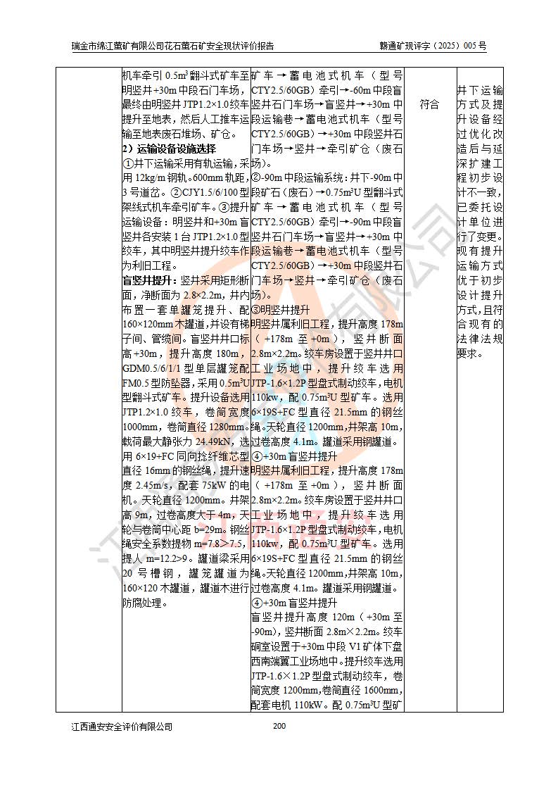 瑞金市绵江萤矿有限公司花石萤石矿区位于瑞金市南西215°方位直距30km处,矿区中心位置地理坐标为东经115°51′24″,北纬25°39′21″,行政区划属瑞金市谢坊镇管辖。 矿山前身为瑞金市金鑫矿产品实业有限公司花石萤矿。为了进一步稳固萤石矿产业链,2024年9月瑞金市绵江萤矿有限公司申请将瑞金市金鑫矿产品实业有限公司花石萤矿采矿权**至其公司。2025年4月6日,花石萤石矿完成了采矿权人**手续,并取得了新采矿许可证。 该萤石矿区开采始于上世纪九十年代,由当地民众在花石矿点和庙背坑矿点零星开采(庙背坑矿点位于花石矿点东侧,两个矿点矿体直线距离约1km,庙背坑矿点已停止采矿活动。本次评价对象为花石矿点)。本世纪初,经矿业秩序整顿、规范矿山开采,两矿点分别由不同采矿权人依法办理了采矿许可证,即庙背坑萤矿和花石萤石矿。2005年12月,根据赣州市人民**《赣市府办发〔2005〕14号》文件有关矿业权整合的指示精神要求,两个采矿权整合为一个采矿权人,即瑞金市金鑫矿产品实业有限公司,整合后采矿权面积2.4707km2,开采标高+220m~0m。整合后,2011年8月,花石萤石矿委托江西省冶金设计院有限责任公司编制了《瑞金市金鑫矿产品实业有限公司花石萤矿地下开采整改初步设计安全专篇》。整改设计开采对象为花石区段V1矿体,采用竖井+盲竖井联合开拓,主要井筒为SJ3竖井、MJ1盲竖井,SJ3竖井连接+125m中段,采用JTP-1.2×1.0型矿用提升绞车提升,MJ1盲竖井连接+65m中段、+83m中段,采用JTK-1.0×0.8型块式制动矿用提升绞车提升。设计开采深度+220m至+67m标高,共布置+125m、+83m、+65m三个中段;设计生产规模为4万吨/年,采矿方法选用浅孔留矿法。 根据整改设计要求,矿山经过近一年多的整改施工,2012年9月通过由原赣州市安全生产监督管理局组织的安全设施整改验收。2012年9月26日取得了由原江西省安全生产监督管理局延期换发的《安全生产许可证》(编号:FM安许证字[2005]M0033号),许可范围:萤石矿4万吨/年,竖井+盲竖井联合开拓,+67m中段地下开采。 由于原整改设计范围内(+67m以上中段)V1矿体资源储量无法使矿井达到持续稳定的生产接替,根据2011年11月264核工业大队《江西省瑞金市花石萤石矿资源储量核实报告》及矿山提交的2013年度资源储量动态检测报告。2013年4月,花石萤石矿又委托江西省冶金设计院有限责任公司为其编制了《瑞金市金鑫矿产品实业有限公司花石萤矿花石矿区地下开采改建工程初步设计安全专篇》。设计开采范围+83m~+0m标高;采用竖井开拓。设计新建开拓工程为新竖井及+83m、+40m、+0m三个中段。采矿方法为浅孔留矿法。 由于部分工程与设计不符。2014年10月,矿山委托江西省冶金设计院有限责任公司编制了《瑞金市金鑫矿产品实业有限公司花石萤矿花石矿区地下开采改建工程变更设计》,其中段布置变更为+30m、+0m中段;通风系统变更为以新竖井为进风井;采用SJ3北东已有的平峒(PD)及平硐内的人行、回风斜巷MXJ1、MXJ2 、MXJ3并配置相关工程后作为矿区北东翼矿体开采的北东翼回风系统。主扇安装于+190m中段回风道。 2015年9月,矿山改建工程安全设施通过了原江西省安全生产监督管理局组织专家组竣工验收,并取得了原江西省安监局延期换发的《安全生产许可证》(编号:FM安许证字[2005]M0033号),许可范围:萤石矿4万吨/年,竖井开拓,+30m、0m中段地下开采。 花石萤矿V1矿体经过多年开采后,原改建工程设计范围内(+0m以上中段)萤石矿资源储量日渐减少。为了扩大矿区资源储量,延长矿山服务年限,查明矿区深部萤石矿资源储量。2014年矿山申请了采矿权变更开采深度的请示。2015年1月16日矿山取得了原赣州市矿产资源管理局颁发的划定矿区范围批复(赣市矿划复[2015]0001号),划定矿区范围面积2.47km2,矿区范围由7个拐点圈定,开采深度由+220m~-150m。同年,矿山委托江西省核工业地质局二六四大队编制完成了《江西省瑞金市花石萤石矿区资源储量核实报告》并经过了赣州市金辉矿业技术服务有限公司评审(赣金辉储审字[2014]12号),原赣州市矿产资源管理局以“赣市矿储备字[2014]18号)”文对该报告备案。 为了使矿井达到持续稳定的生产接替,保持三级矿量平衡,2015年7月委托了江西省冶金设计院有限责任公司编制完成了《瑞金市金鑫矿产品实业有限公司花石萤矿花石区段地下开采延深扩建工程建设项目的可行性研究报告》,同年12月委托了赣州永安安全生产科技服务有限公司编制完成了《瑞金市金鑫矿产品实业有限公司花石萤矿花石区段地下开采延深扩建工程安全预评价报告》。2016年11月,矿山委托江西省冶金设计院有限责任公司编制完成了《瑞金市金鑫矿产品实业有限公司花石萤矿地下开采延深扩建工程初步设计及安全设施设计》,并于2017年4月13日通过原省安监局组织的专家评审,2017年7月10日由原江西省安全生产监督管理局下达了《关于瑞金市金鑫矿产品实业有限公司花石萤矿地下开采延深扩建工程安全设施设计审查意见》(赣安监非煤项目设审[2017]19号)。根据矿体赋存条件等因素,矿山深部扩建开拓工程设计采用竖井+盲竖井联合开拓,主要开采V1矿体,利用明竖井、+30m盲竖井作为主运输井。其中明竖井连接+30m、+0m两个中段;+30m盲竖井连接+0m、-30m、-60m、-90m、-120m、-150m六个中段。设计深部开拓共布置-30m、-60m、-90m、-120m、-150m五个中段。采矿方法