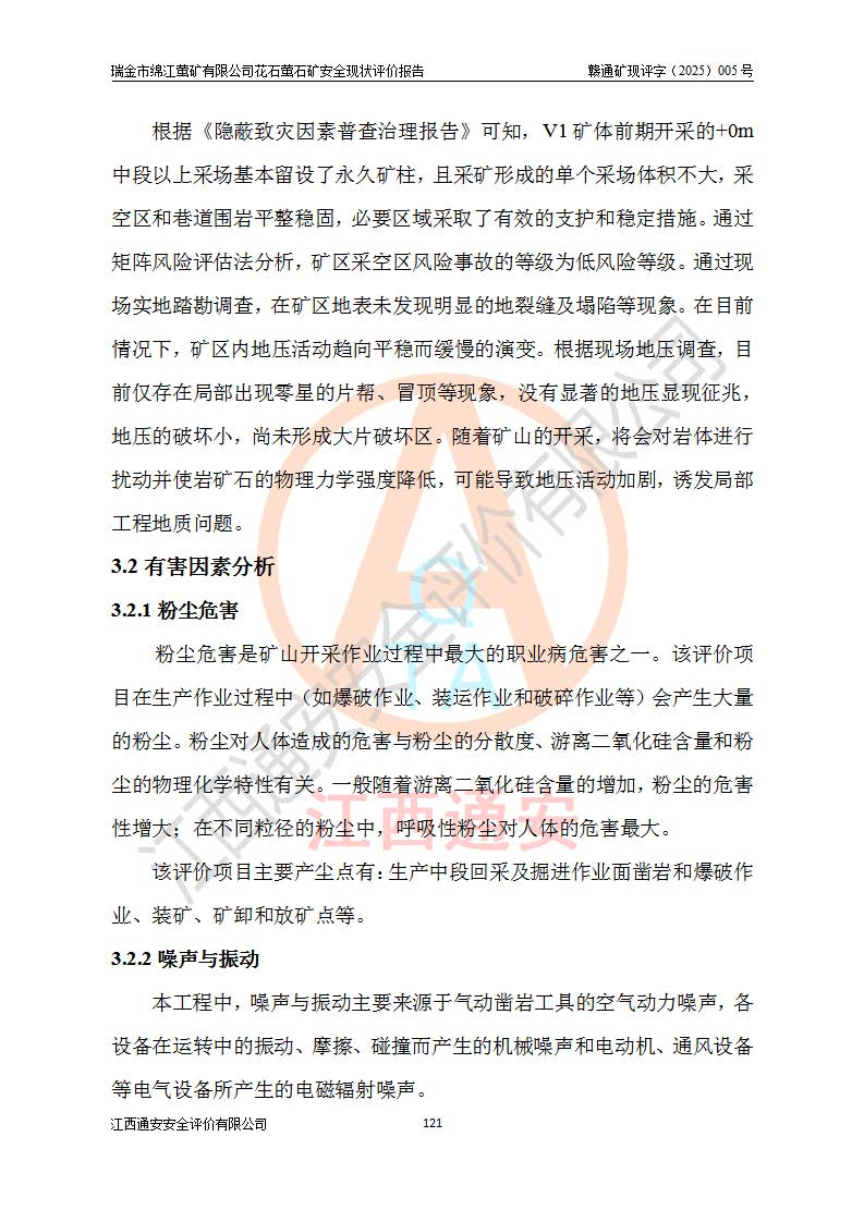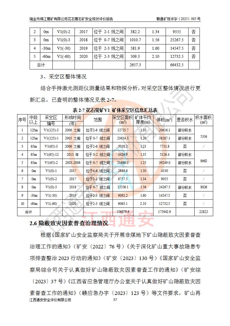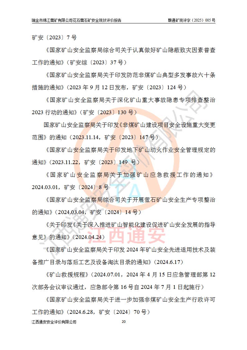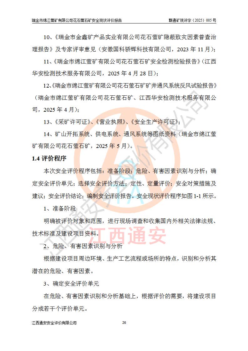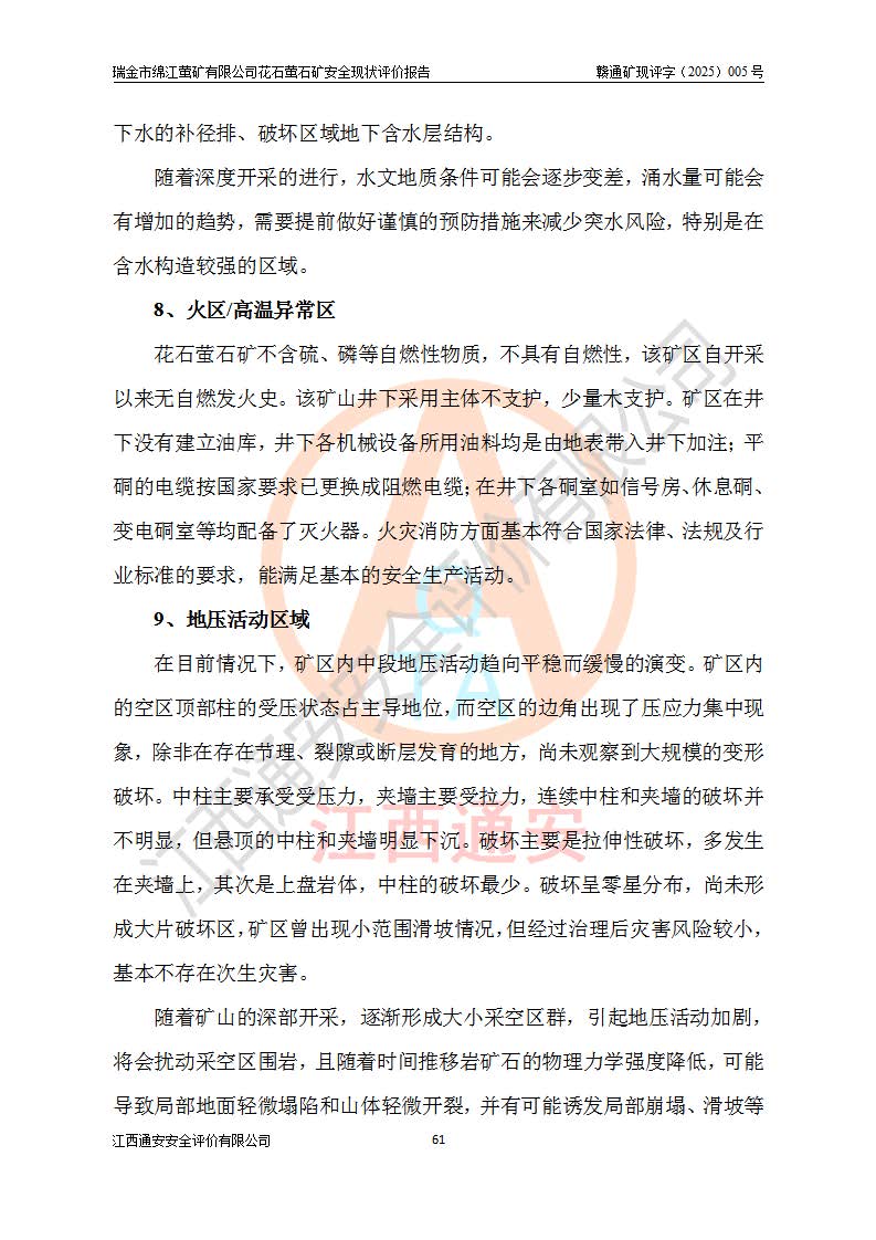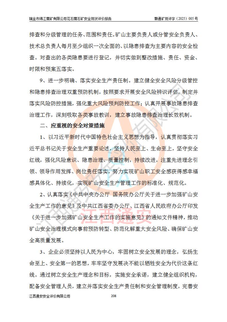 瑞金市绵江萤矿有限公司花石萤石矿区位于瑞金市南西215°方位直距30km处,矿区中心位置地理坐标为东经115°51′24″,北纬25°39′21″,行政区划属瑞金市谢坊镇管辖。 矿山前身为瑞金市金鑫矿产品实业有限公司花石萤矿。为了进一步稳固萤石矿产业链,2024年9月瑞金市绵江萤矿有限公司申请将瑞金市金鑫矿产品实业有限公司花石萤矿采矿权**至其公司。2025年4月6日,花石萤石矿完成了采矿权人**手续,并取得了新采矿许可证。 该萤石矿区开采始于上世纪九十年代,由当地民众在花石矿点和庙背坑矿点零星开采(庙背坑矿点位于花石矿点东侧,两个矿点矿体直线距离约1km,庙背坑矿点已停止采矿活动。本次评价对象为花石矿点)。本世纪初,经矿业秩序整顿、规范矿山开采,两矿点分别由不同采矿权人依法办理了采矿许可证,即庙背坑萤矿和花石萤石矿。2005年12月,根据赣州市人民**《赣市府办发〔2005〕14号》文件有关矿业权整合的指示精神要求,两个采矿权整合为一个采矿权人,即瑞金市金鑫矿产品实业有限公司,整合后采矿权面积2.4707km2,开采标高+220m~0m。整合后,2011年8月,花石萤石矿委托江西省冶金设计院有限责任公司编制了《瑞金市金鑫矿产品实业有限公司花石萤矿地下开采整改初步设计安全专篇》。整改设计开采对象为花石区段V1矿体,采用竖井+盲竖井联合开拓,主要井筒为SJ3竖井、MJ1盲竖井,SJ3竖井连接+125m中段,采用JTP-1.2×1.0型矿用提升绞车提升,MJ1盲竖井连接+65m中段、+83m中段,采用JTK-1.0×0.8型块式制动矿用提升绞车提升。设计开采深度+220m至+67m标高,共布置+125m、+83m、+65m三个中段;设计生产规模为4万吨/年,采矿方法选用浅孔留矿法。 根据整改设计要求,矿山经过近一年多的整改施工,2012年9月通过由原赣州市安全生产监督管理局组织的安全设施整改验收。2012年9月26日取得了由原江西省安全生产监督管理局延期换发的《安全生产许可证》(编号:FM安许证字[2005]M0033号),许可范围:萤石矿4万吨/年,竖井+盲竖井联合开拓,+67m中段地下开采。 由于原整改设计范围内(+67m以上中段)V1矿体资源储量无法使矿井达到持续稳定的生产接替,根据2011年11月264核工业大队《江西省瑞金市花石萤石矿资源储量核实报告》及矿山提交的2013年度资源储量动态检测报告。2013年4月,花石萤石矿又委托江西省冶金设计院有限责任公司为其编制了《瑞金市金鑫矿产品实业有限公司花石萤矿花石矿区地下开采改建工程初步设计安全专篇》。设计开采范围+83m~+0m标高;采用竖井开拓。设计新建开拓工程为新竖井及+83m、+40m、+0m三个中段。采矿方法为浅孔留矿法。 由于部分工程与设计不符。2014年10月,矿山委托江西省冶金设计院有限责任公司编制了《瑞金市金鑫矿产品实业有限公司花石萤矿花石矿区地下开采改建工程变更设计》,其中段布置变更为+30m、+0m中段;通风系统变更为以新竖井为进风井;采用SJ3北东已有的平峒(PD)及平硐内的人行、回风斜巷MXJ1、MXJ2 、MXJ3并配置相关工程后作为矿区北东翼矿体开采的北东翼回风系统。主扇安装于+190m中段回风道。 2015年9月,矿山改建工程安全设施通过了原江西省安全生产监督管理局组织专家组竣工验收,并取得了原江西省安监局延期换发的《安全生产许可证》(编号:FM安许证字[2005]M0033号),许可范围:萤石矿4万吨/年,竖井开拓,+30m、0m中段地下开采。 花石萤矿V1矿体经过多年开采后,原改建工程设计范围内(+0m以上中段)萤石矿资源储量日渐减少。为了扩大矿区资源储量,延长矿山服务年限,查明矿区深部萤石矿资源储量。2014年矿山申请了采矿权变更开采深度的请示。2015年1月16日矿山取得了原赣州市矿产资源管理局颁发的划定矿区范围批复(赣市矿划复[2015]0001号),划定矿区范围面积2.47km2,矿区范围由7个拐点圈定,开采深度由+220m~-150m。同年,矿山委托江西省核工业地质局二六四大队编制完成了《江西省瑞金市花石萤石矿区资源储量核实报告》并经过了赣州市金辉矿业技术服务有限公司评审(赣金辉储审字[2014]12号),原赣州市矿产资源管理局以“赣市矿储备字[2014]18号)”文对该报告备案。 为了使矿井达到持续稳定的生产接替,保持三级矿量平衡,2015年7月委托了江西省冶金设计院有限责任公司编制完成了《瑞金市金鑫矿产品实业有限公司花石萤矿花石区段地下开采延深扩建工程建设项目的可行性研究报告》,同年12月委托了赣州永安安全生产科技服务有限公司编制完成了《瑞金市金鑫矿产品实业有限公司花石萤矿花石区段地下开采延深扩建工程安全预评价报告》。2016年11月,矿山委托江西省冶金设计院有限责任公司编制完成了《瑞金市金鑫矿产品实业有限公司花石萤矿地下开采延深扩建工程初步设计及安全设施设计》,并于2017年4月13日通过原省安监局组织的专家评审,2017年7月10日由原江西省安全生产监督管理局下达了《关于瑞金市金鑫矿产品实业有限公司花石萤矿地下开采延深扩建工程安全设施设计审查意见》(赣安监非煤项目设审[2017]19号)。根据矿体赋存条件等因素,矿山深部扩建开拓工程设计采用竖井+盲竖井联合开拓,主要开采V1矿体,利用明竖井、+30m盲竖井作为主运输井。其中明竖井连接+30m、+0m两个中段;+30m盲竖井连接+0m、-30m、-60m、-90m、-120m、-150m六个中段。设计深部开拓共布置-30m、-60m、-90m、-120m、-150m五个中段。采矿方法