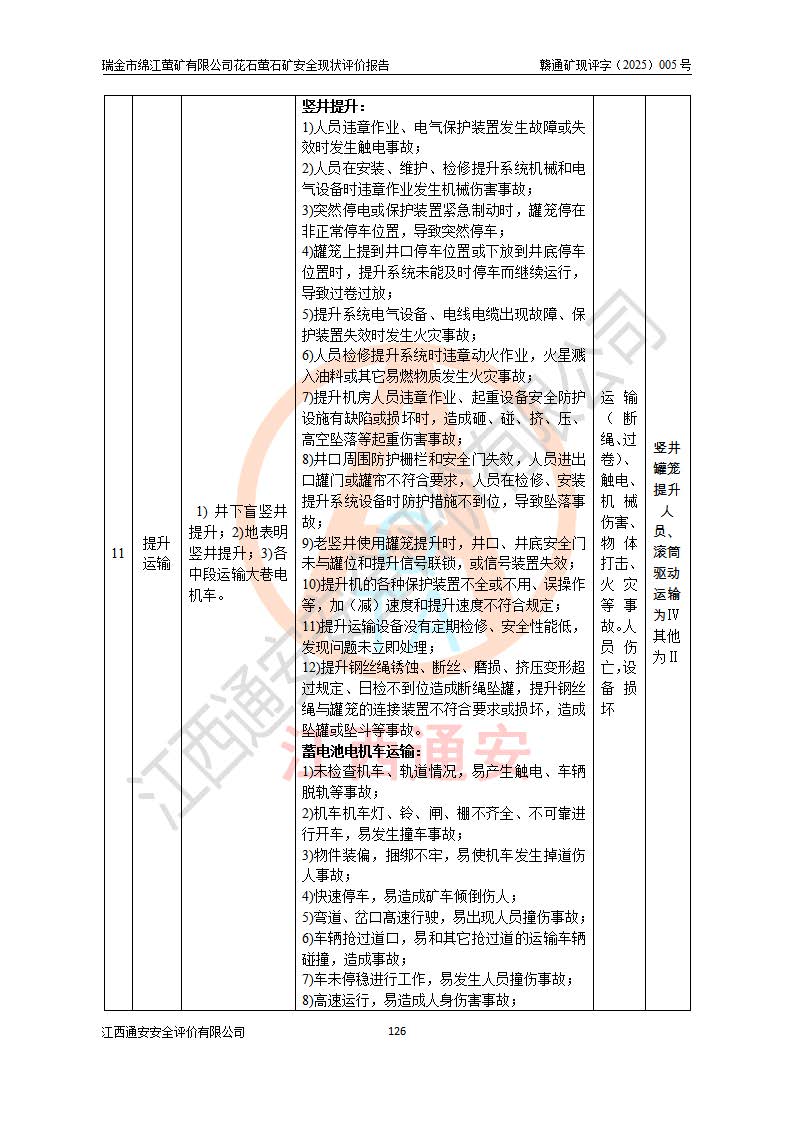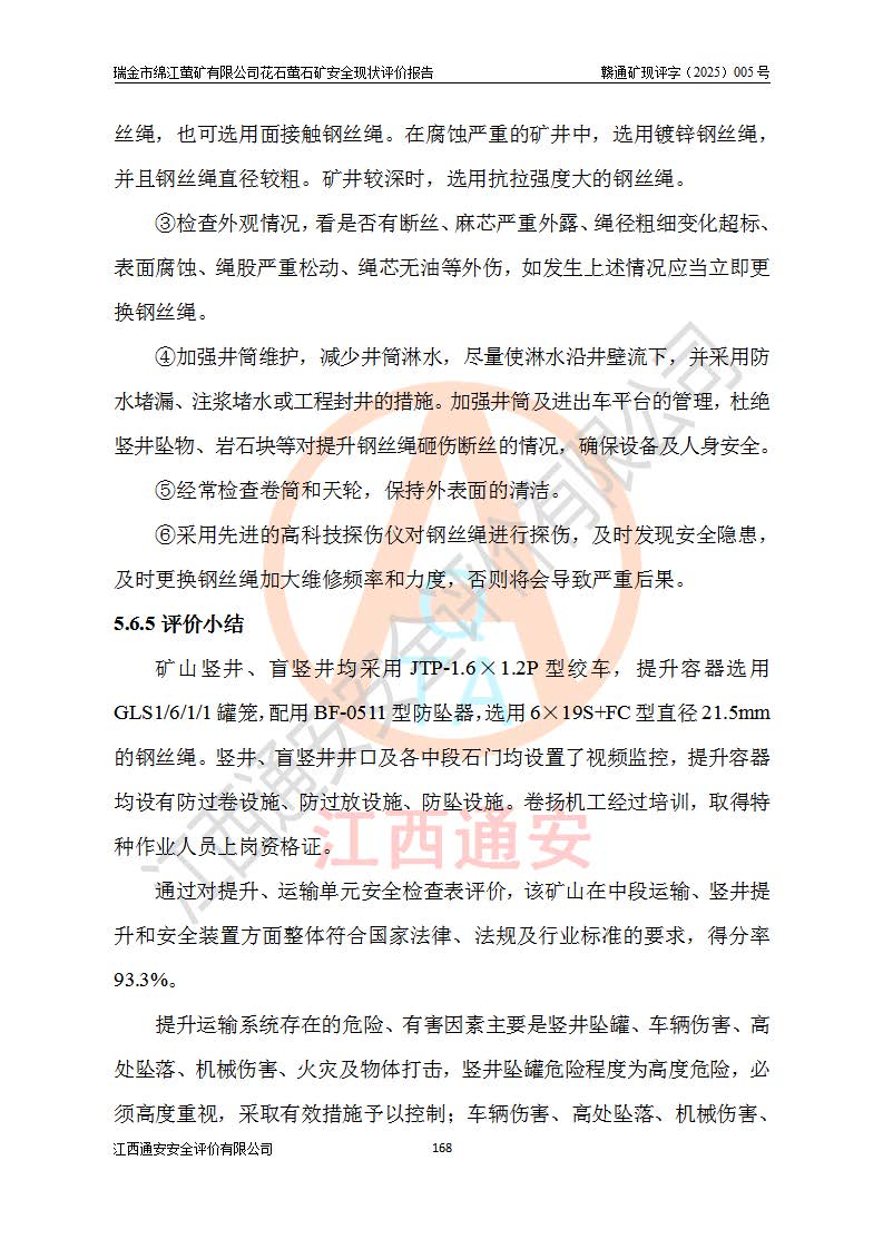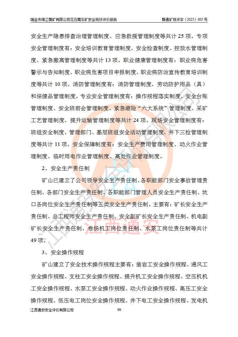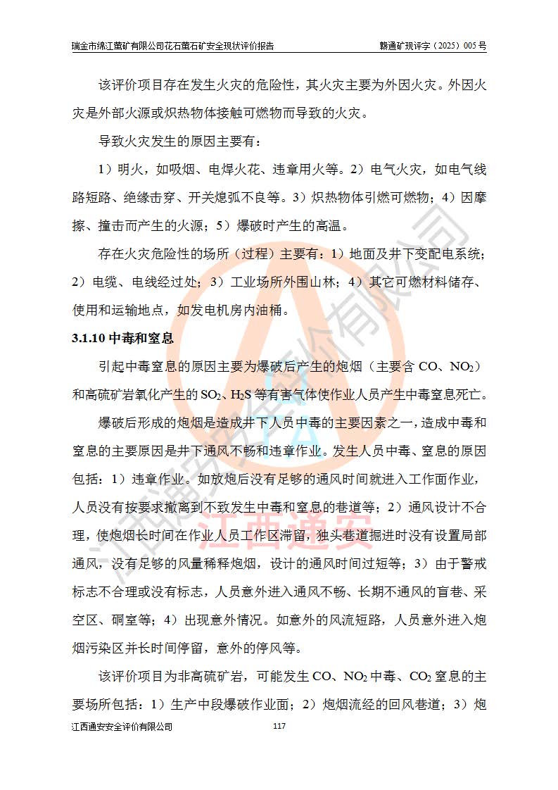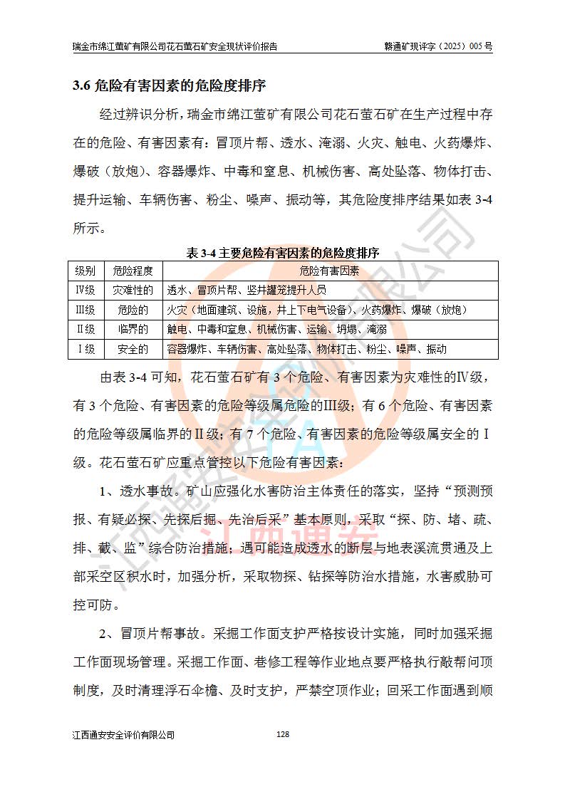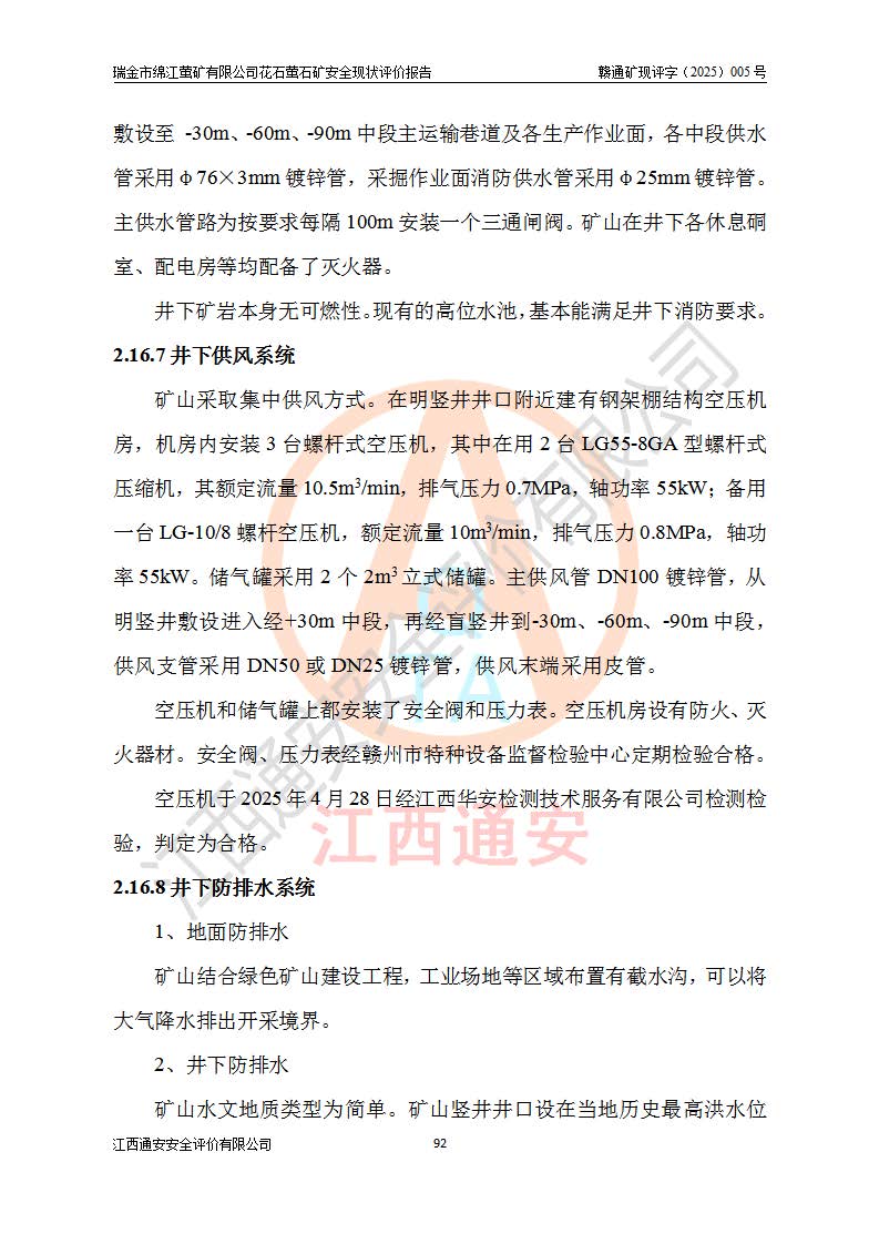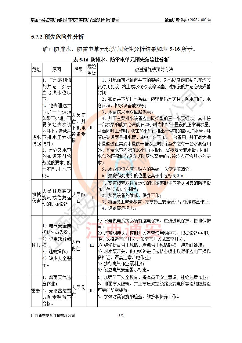 瑞金市绵江萤矿有限公司花石萤石矿区位于瑞金市南西215°方位直距30km处,矿区中心位置地理坐标为东经115°51′24″,北纬25°39′21″,行政区划属瑞金市谢坊镇管辖。 矿山前身为瑞金市金鑫矿产品实业有限公司花石萤矿。为了进一步稳固萤石矿产业链,2024年9月瑞金市绵江萤矿有限公司申请将瑞金市金鑫矿产品实业有限公司花石萤矿采矿权**至其公司。2025年4月6日,花石萤石矿完成了采矿权人**手续,并取得了新采矿许可证。 该萤石矿区开采始于上世纪九十年代,由当地民众在花石矿点和庙背坑矿点零星开采(庙背坑矿点位于花石矿点东侧,两个矿点矿体直线距离约1km,庙背坑矿点已停止采矿活动。本次评价对象为花石矿点)。本世纪初,经矿业秩序整顿、规范矿山开采,两矿点分别由不同采矿权人依法办理了采矿许可证,即庙背坑萤矿和花石萤石矿。2005年12月,根据赣州市人民**《赣市府办发〔2005〕14号》文件有关矿业权整合的指示精神要求,两个采矿权整合为一个采矿权人,即瑞金市金鑫矿产品实业有限公司,整合后采矿权面积2.4707km2,开采标高+220m~0m。整合后,2011年8月,花石萤石矿委托江西省冶金设计院有限责任公司编制了《瑞金市金鑫矿产品实业有限公司花石萤矿地下开采整改初步设计安全专篇》。整改设计开采对象为花石区段V1矿体,采用竖井+盲竖井联合开拓,主要井筒为SJ3竖井、MJ1盲竖井,SJ3竖井连接+125m中段,采用JTP-1.2×1.0型矿用提升绞车提升,MJ1盲竖井连接+65m中段、+83m中段,采用JTK-1.0×0.8型块式制动矿用提升绞车提升。设计开采深度+220m至+67m标高,共布置+125m、+83m、+65m三个中段;设计生产规模为4万吨/年,采矿方法选用浅孔留矿法。 根据整改设计要求,矿山经过近一年多的整改施工,2012年9月通过由原赣州市安全生产监督管理局组织的安全设施整改验收。2012年9月26日取得了由原江西省安全生产监督管理局延期换发的《安全生产许可证》(编号:FM安许证字[2005]M0033号),许可范围:萤石矿4万吨/年,竖井+盲竖井联合开拓,+67m中段地下开采。 由于原整改设计范围内(+67m以上中段)V1矿体资源储量无法使矿井达到持续稳定的生产接替,根据2011年11月264核工业大队《江西省瑞金市花石萤石矿资源储量核实报告》及矿山提交的2013年度资源储量动态检测报告。2013年4月,花石萤石矿又委托江西省冶金设计院有限责任公司为其编制了《瑞金市金鑫矿产品实业有限公司花石萤矿花石矿区地下开采改建工程初步设计安全专篇》。设计开采范围+83m~+0m标高;采用竖井开拓。设计新建开拓工程为新竖井及+83m、+40m、+0m三个中段。采矿方法为浅孔留矿法。 由于部分工程与设计不符。2014年10月,矿山委托江西省冶金设计院有限责任公司编制了《瑞金市金鑫矿产品实业有限公司花石萤矿花石矿区地下开采改建工程变更设计》,其中段布置变更为+30m、+0m中段;通风系统变更为以新竖井为进风井;采用SJ3北东已有的平峒(PD)及平硐内的人行、回风斜巷MXJ1、MXJ2 、MXJ3并配置相关工程后作为矿区北东翼矿体开采的北东翼回风系统。主扇安装于+190m中段回风道。 2015年9月,矿山改建工程安全设施通过了原江西省安全生产监督管理局组织专家组竣工验收,并取得了原江西省安监局延期换发的《安全生产许可证》(编号:FM安许证字[2005]M0033号),许可范围:萤石矿4万吨/年,竖井开拓,+30m、0m中段地下开采。 花石萤矿V1矿体经过多年开采后,原改建工程设计范围内(+0m以上中段)萤石矿资源储量日渐减少。为了扩大矿区资源储量,延长矿山服务年限,查明矿区深部萤石矿资源储量。2014年矿山申请了采矿权变更开采深度的请示。2015年1月16日矿山取得了原赣州市矿产资源管理局颁发的划定矿区范围批复(赣市矿划复[2015]0001号),划定矿区范围面积2.47km2,矿区范围由7个拐点圈定,开采深度由+220m~-150m。同年,矿山委托江西省核工业地质局二六四大队编制完成了《江西省瑞金市花石萤石矿区资源储量核实报告》并经过了赣州市金辉矿业技术服务有限公司评审(赣金辉储审字[2014]12号),原赣州市矿产资源管理局以“赣市矿储备字[2014]18号)”文对该报告备案。 为了使矿井达到持续稳定的生产接替,保持三级矿量平衡,2015年7月委托了江西省冶金设计院有限责任公司编制完成了《瑞金市金鑫矿产品实业有限公司花石萤矿花石区段地下开采延深扩建工程建设项目的可行性研究报告》,同年12月委托了赣州永安安全生产科技服务有限公司编制完成了《瑞金市金鑫矿产品实业有限公司花石萤矿花石区段地下开采延深扩建工程安全预评价报告》。2016年11月,矿山委托江西省冶金设计院有限责任公司编制完成了《瑞金市金鑫矿产品实业有限公司花石萤矿地下开采延深扩建工程初步设计及安全设施设计》,并于2017年4月13日通过原省安监局组织的专家评审,2017年7月10日由原江西省安全生产监督管理局下达了《关于瑞金市金鑫矿产品实业有限公司花石萤矿地下开采延深扩建工程安全设施设计审查意见》(赣安监非煤项目设审[2017]19号)。根据矿体赋存条件等因素,矿山深部扩建开拓工程设计采用竖井+盲竖井联合开拓,主要开采V1矿体,利用明竖井、+30m盲竖井作为主运输井。其中明竖井连接+30m、+0m两个中段;+30m盲竖井连接+0m、-30m、-60m、-90m、-120m、-150m六个中段。设计深部开拓共布置-30m、-60m、-90m、-120m、-150m五个中段。采矿方法
