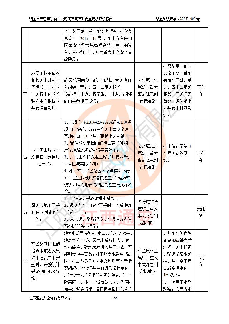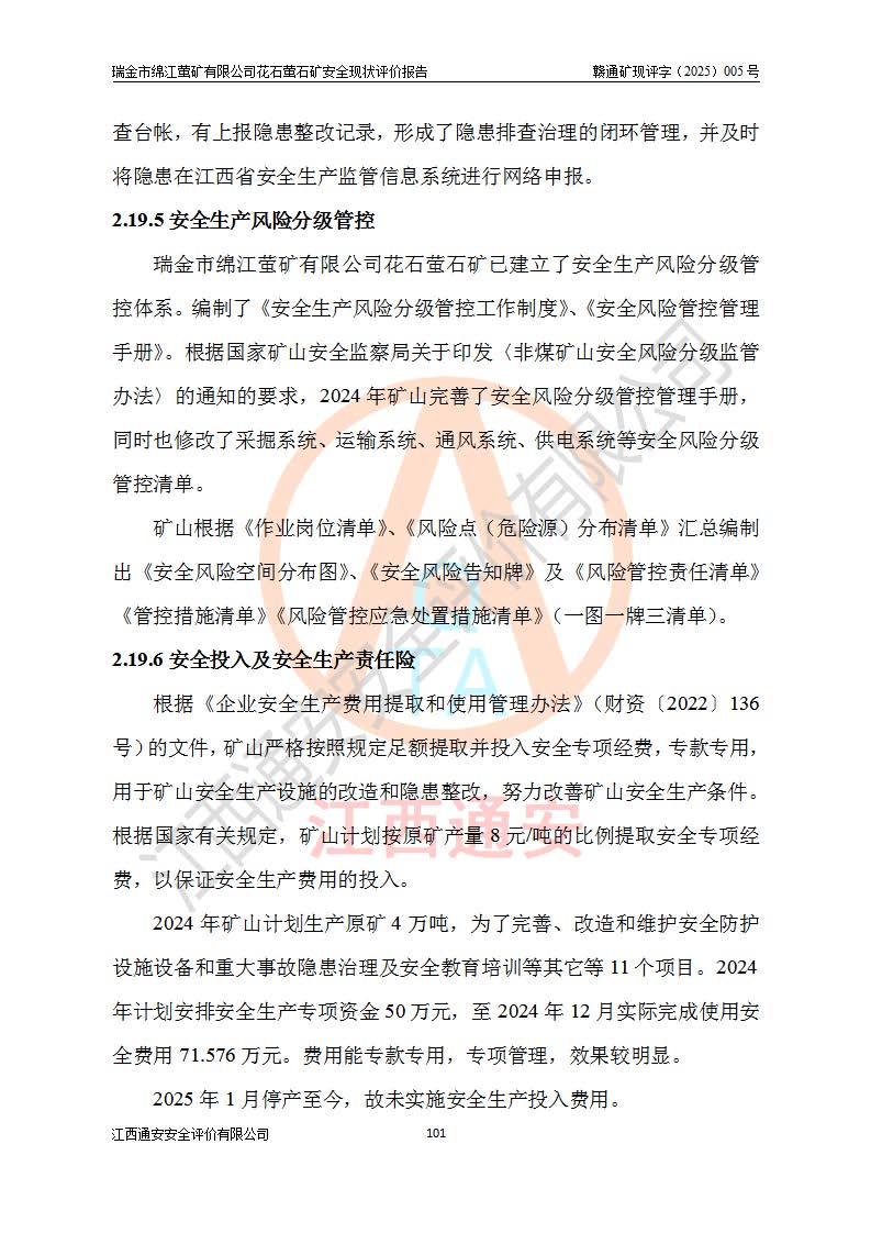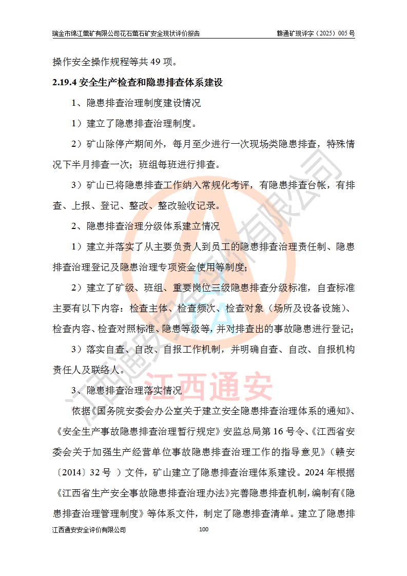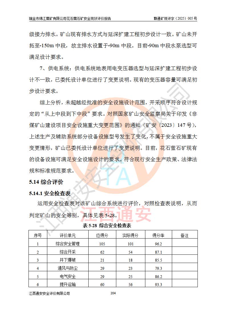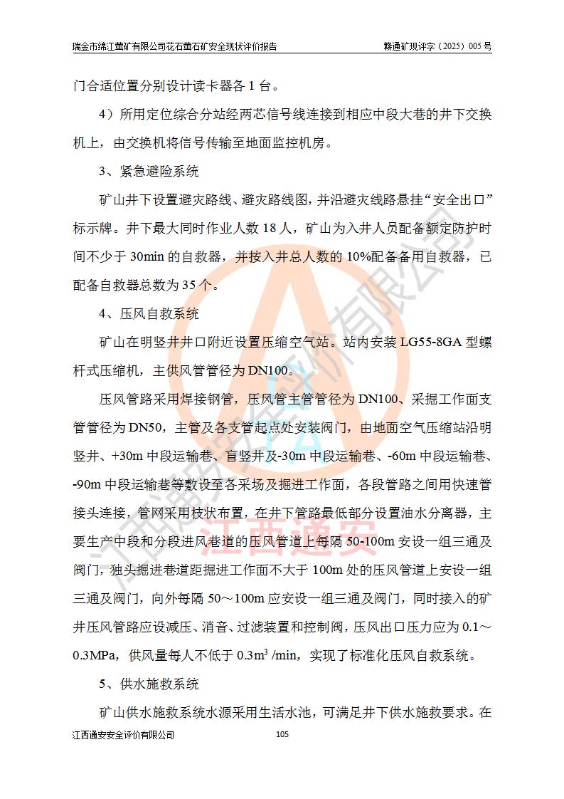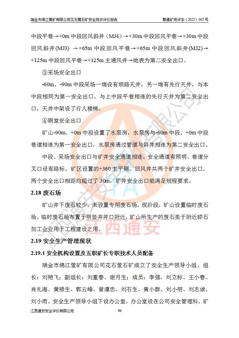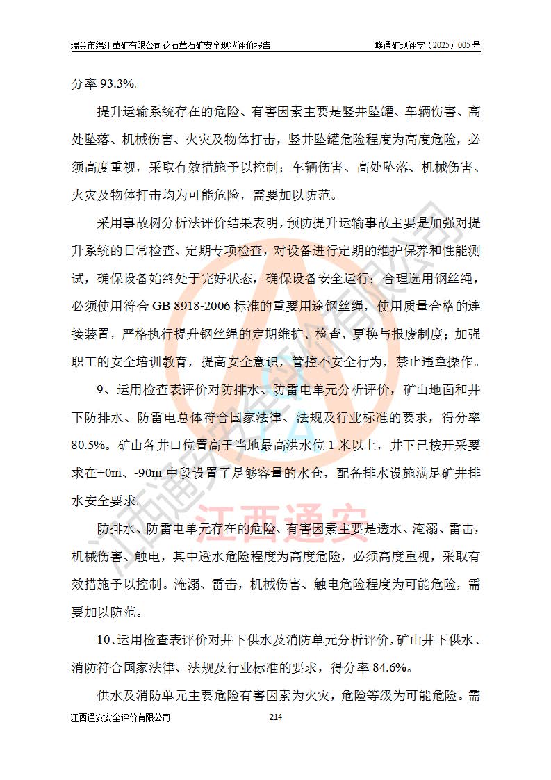 瑞金市绵江萤矿有限公司花石萤石矿区位于瑞金市南西215°方位直距30km处,矿区中心位置地理坐标为东经115°51′24″,北纬25°39′21″,行政区划属瑞金市谢坊镇管辖。 矿山前身为瑞金市金鑫矿产品实业有限公司花石萤矿。为了进一步稳固萤石矿产业链,2024年9月瑞金市绵江萤矿有限公司申请将瑞金市金鑫矿产品实业有限公司花石萤矿采矿权**至其公司。2025年4月6日,花石萤石矿完成了采矿权人**手续,并取得了新采矿许可证。 该萤石矿区开采始于上世纪九十年代,由当地民众在花石矿点和庙背坑矿点零星开采(庙背坑矿点位于花石矿点东侧,两个矿点矿体直线距离约1km,庙背坑矿点已停止采矿活动。本次评价对象为花石矿点)。本世纪初,经矿业秩序整顿、规范矿山开采,两矿点分别由不同采矿权人依法办理了采矿许可证,即庙背坑萤矿和花石萤石矿。2005年12月,根据赣州市人民**《赣市府办发〔2005〕14号》文件有关矿业权整合的指示精神要求,两个采矿权整合为一个采矿权人,即瑞金市金鑫矿产品实业有限公司,整合后采矿权面积2.4707km2,开采标高+220m~0m。整合后,2011年8月,花石萤石矿委托江西省冶金设计院有限责任公司编制了《瑞金市金鑫矿产品实业有限公司花石萤矿地下开采整改初步设计安全专篇》。整改设计开采对象为花石区段V1矿体,采用竖井+盲竖井联合开拓,主要井筒为SJ3竖井、MJ1盲竖井,SJ3竖井连接+125m中段,采用JTP-1.2×1.0型矿用提升绞车提升,MJ1盲竖井连接+65m中段、+83m中段,采用JTK-1.0×0.8型块式制动矿用提升绞车提升。设计开采深度+220m至+67m标高,共布置+125m、+83m、+65m三个中段;设计生产规模为4万吨/年,采矿方法选用浅孔留矿法。 根据整改设计要求,矿山经过近一年多的整改施工,2012年9月通过由原赣州市安全生产监督管理局组织的安全设施整改验收。2012年9月26日取得了由原江西省安全生产监督管理局延期换发的《安全生产许可证》(编号:FM安许证字[2005]M0033号),许可范围:萤石矿4万吨/年,竖井+盲竖井联合开拓,+67m中段地下开采。 由于原整改设计范围内(+67m以上中段)V1矿体资源储量无法使矿井达到持续稳定的生产接替,根据2011年11月264核工业大队《江西省瑞金市花石萤石矿资源储量核实报告》及矿山提交的2013年度资源储量动态检测报告。2013年4月,花石萤石矿又委托江西省冶金设计院有限责任公司为其编制了《瑞金市金鑫矿产品实业有限公司花石萤矿花石矿区地下开采改建工程初步设计安全专篇》。设计开采范围+83m~+0m标高;采用竖井开拓。设计新建开拓工程为新竖井及+83m、+40m、+0m三个中段。采矿方法为浅孔留矿法。 由于部分工程与设计不符。2014年10月,矿山委托江西省冶金设计院有限责任公司编制了《瑞金市金鑫矿产品实业有限公司花石萤矿花石矿区地下开采改建工程变更设计》,其中段布置变更为+30m、+0m中段;通风系统变更为以新竖井为进风井;采用SJ3北东已有的平峒(PD)及平硐内的人行、回风斜巷MXJ1、MXJ2 、MXJ3并配置相关工程后作为矿区北东翼矿体开采的北东翼回风系统。主扇安装于+190m中段回风道。 2015年9月,矿山改建工程安全设施通过了原江西省安全生产监督管理局组织专家组竣工验收,并取得了原江西省安监局延期换发的《安全生产许可证》(编号:FM安许证字[2005]M0033号),许可范围:萤石矿4万吨/年,竖井开拓,+30m、0m中段地下开采。 花石萤矿V1矿体经过多年开采后,原改建工程设计范围内(+0m以上中段)萤石矿资源储量日渐减少。为了扩大矿区资源储量,延长矿山服务年限,查明矿区深部萤石矿资源储量。2014年矿山申请了采矿权变更开采深度的请示。2015年1月16日矿山取得了原赣州市矿产资源管理局颁发的划定矿区范围批复(赣市矿划复[2015]0001号),划定矿区范围面积2.47km2,矿区范围由7个拐点圈定,开采深度由+220m~-150m。同年,矿山委托江西省核工业地质局二六四大队编制完成了《江西省瑞金市花石萤石矿区资源储量核实报告》并经过了赣州市金辉矿业技术服务有限公司评审(赣金辉储审字[2014]12号),原赣州市矿产资源管理局以“赣市矿储备字[2014]18号)”文对该报告备案。 为了使矿井达到持续稳定的生产接替,保持三级矿量平衡,2015年7月委托了江西省冶金设计院有限责任公司编制完成了《瑞金市金鑫矿产品实业有限公司花石萤矿花石区段地下开采延深扩建工程建设项目的可行性研究报告》,同年12月委托了赣州永安安全生产科技服务有限公司编制完成了《瑞金市金鑫矿产品实业有限公司花石萤矿花石区段地下开采延深扩建工程安全预评价报告》。2016年11月,矿山委托江西省冶金设计院有限责任公司编制完成了《瑞金市金鑫矿产品实业有限公司花石萤矿地下开采延深扩建工程初步设计及安全设施设计》,并于2017年4月13日通过原省安监局组织的专家评审,2017年7月10日由原江西省安全生产监督管理局下达了《关于瑞金市金鑫矿产品实业有限公司花石萤矿地下开采延深扩建工程安全设施设计审查意见》(赣安监非煤项目设审[2017]19号)。根据矿体赋存条件等因素,矿山深部扩建开拓工程设计采用竖井+盲竖井联合开拓,主要开采V1矿体,利用明竖井、+30m盲竖井作为主运输井。其中明竖井连接+30m、+0m两个中段;+30m盲竖井连接+0m、-30m、-60m、-90m、-120m、-150m六个中段。设计深部开拓共布置-30m、-60m、-90m、-120m、-150m五个中段。采矿方法