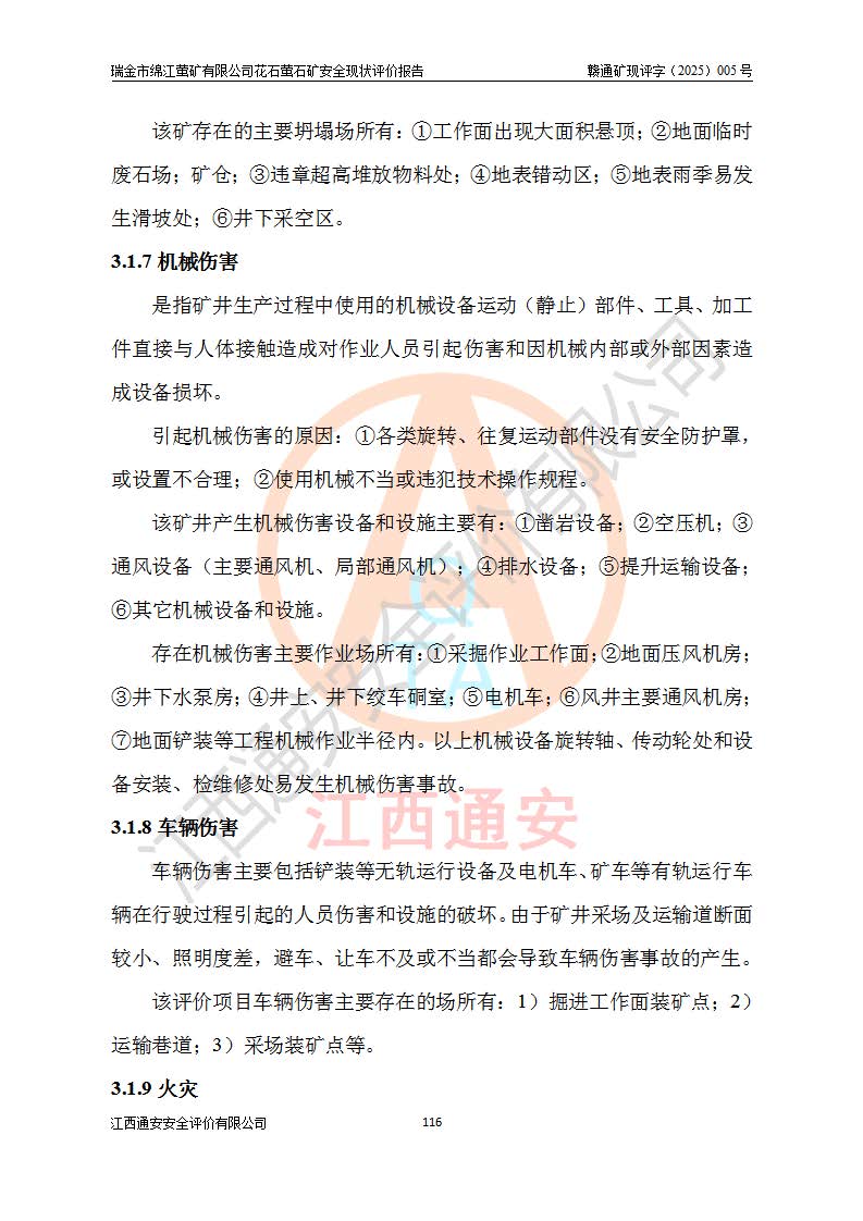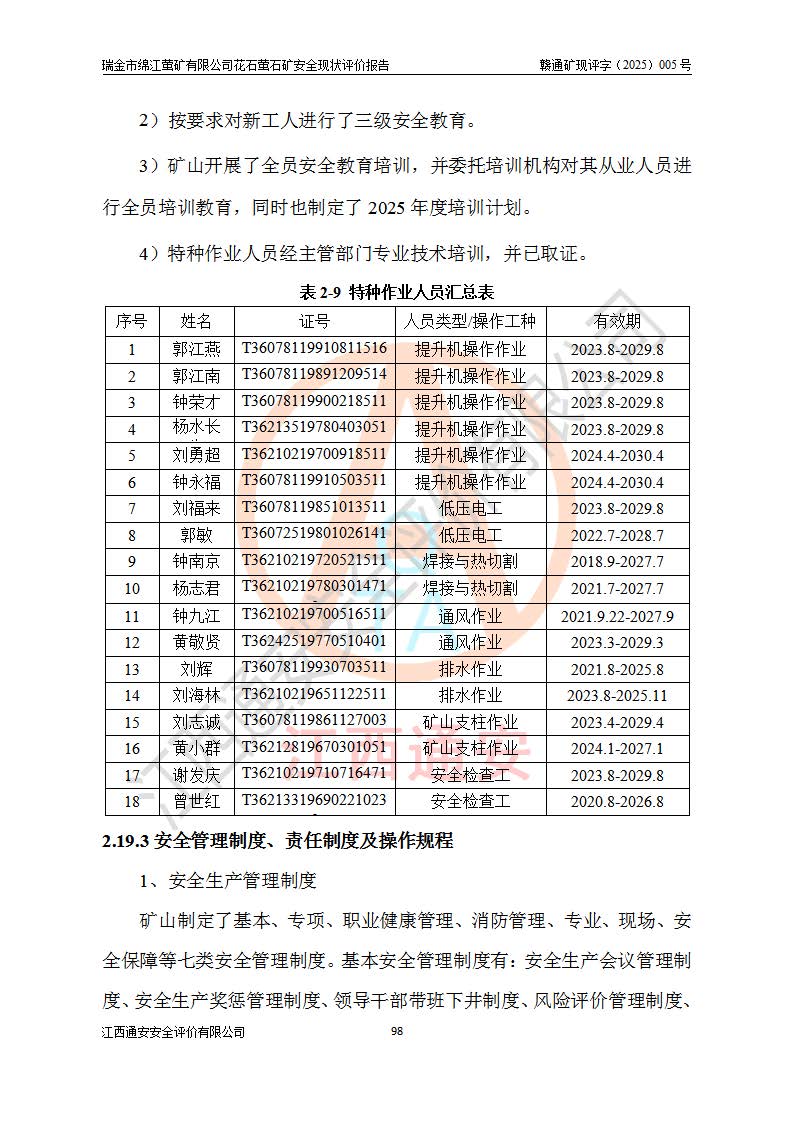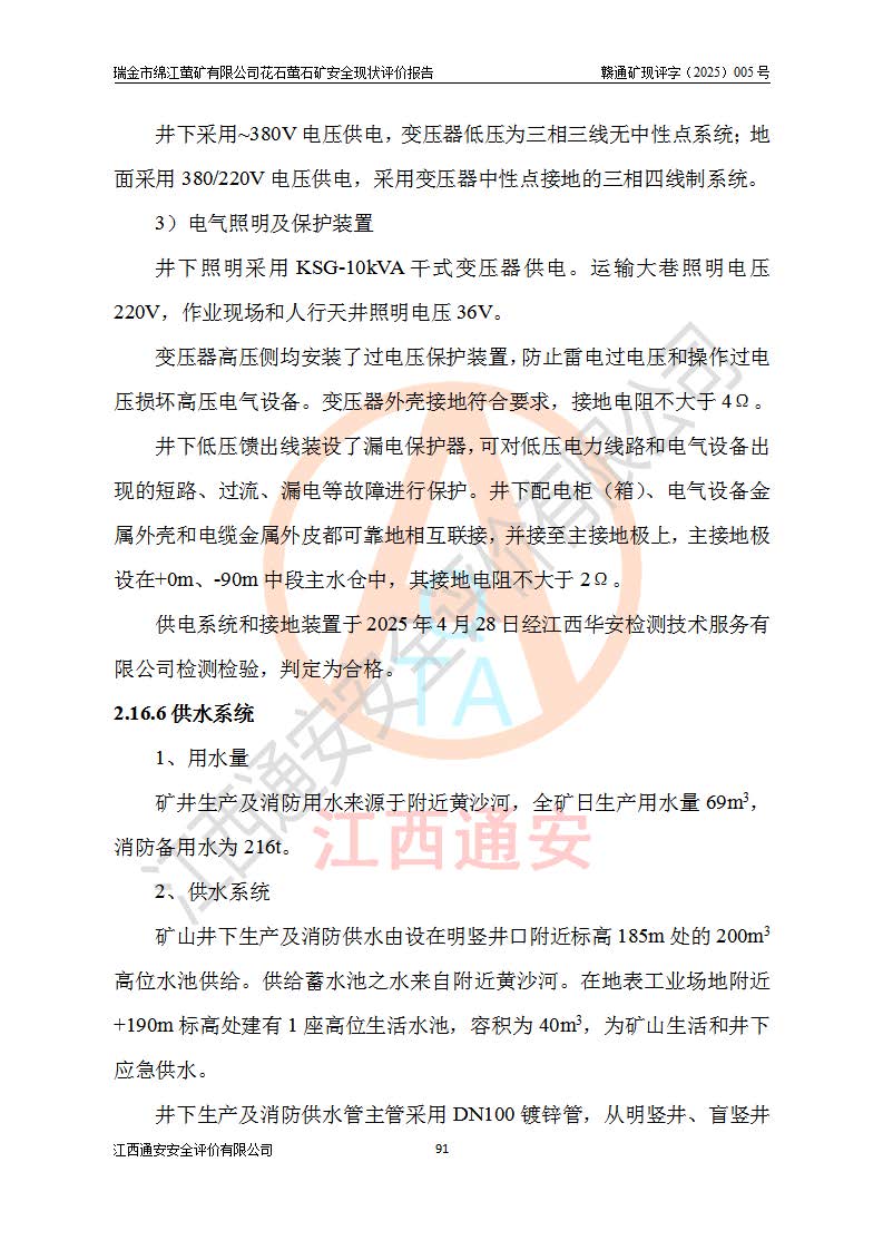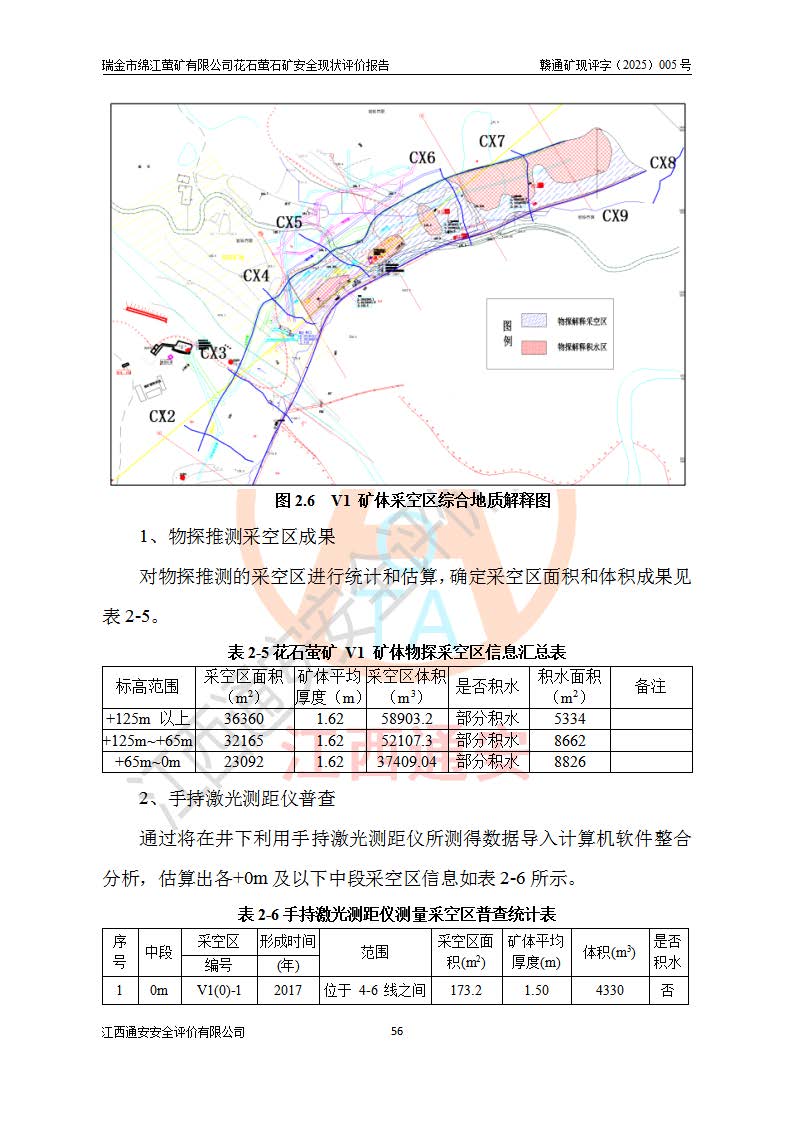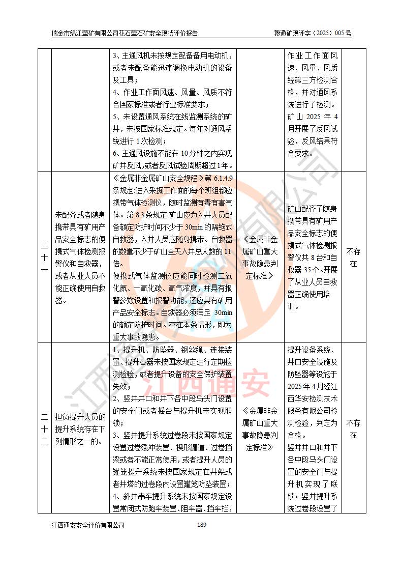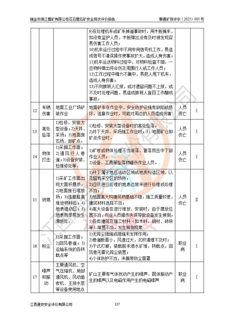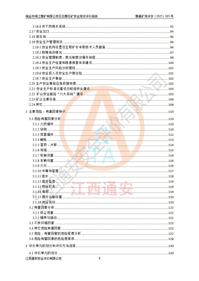 瑞金市绵江萤矿有限公司花石萤石矿区位于瑞金市南西215°方位直距30km处,矿区中心位置地理坐标为东经115°51′24″,北纬25°39′21″,行政区划属瑞金市谢坊镇管辖。 矿山前身为瑞金市金鑫矿产品实业有限公司花石萤矿。为了进一步稳固萤石矿产业链,2024年9月瑞金市绵江萤矿有限公司申请将瑞金市金鑫矿产品实业有限公司花石萤矿采矿权**至其公司。2025年4月6日,花石萤石矿完成了采矿权人**手续,并取得了新采矿许可证。 该萤石矿区开采始于上世纪九十年代,由当地民众在花石矿点和庙背坑矿点零星开采(庙背坑矿点位于花石矿点东侧,两个矿点矿体直线距离约1km,庙背坑矿点已停止采矿活动。本次评价对象为花石矿点)。本世纪初,经矿业秩序整顿、规范矿山开采,两矿点分别由不同采矿权人依法办理了采矿许可证,即庙背坑萤矿和花石萤石矿。2005年12月,根据赣州市人民**《赣市府办发〔2005〕14号》文件有关矿业权整合的指示精神要求,两个采矿权整合为一个采矿权人,即瑞金市金鑫矿产品实业有限公司,整合后采矿权面积2.4707km2,开采标高+220m~0m。整合后,2011年8月,花石萤石矿委托江西省冶金设计院有限责任公司编制了《瑞金市金鑫矿产品实业有限公司花石萤矿地下开采整改初步设计安全专篇》。整改设计开采对象为花石区段V1矿体,采用竖井+盲竖井联合开拓,主要井筒为SJ3竖井、MJ1盲竖井,SJ3竖井连接+125m中段,采用JTP-1.2×1.0型矿用提升绞车提升,MJ1盲竖井连接+65m中段、+83m中段,采用JTK-1.0×0.8型块式制动矿用提升绞车提升。设计开采深度+220m至+67m标高,共布置+125m、+83m、+65m三个中段;设计生产规模为4万吨/年,采矿方法选用浅孔留矿法。 根据整改设计要求,矿山经过近一年多的整改施工,2012年9月通过由原赣州市安全生产监督管理局组织的安全设施整改验收。2012年9月26日取得了由原江西省安全生产监督管理局延期换发的《安全生产许可证》(编号:FM安许证字[2005]M0033号),许可范围:萤石矿4万吨/年,竖井+盲竖井联合开拓,+67m中段地下开采。 由于原整改设计范围内(+67m以上中段)V1矿体资源储量无法使矿井达到持续稳定的生产接替,根据2011年11月264核工业大队《江西省瑞金市花石萤石矿资源储量核实报告》及矿山提交的2013年度资源储量动态检测报告。2013年4月,花石萤石矿又委托江西省冶金设计院有限责任公司为其编制了《瑞金市金鑫矿产品实业有限公司花石萤矿花石矿区地下开采改建工程初步设计安全专篇》。设计开采范围+83m~+0m标高;采用竖井开拓。设计新建开拓工程为新竖井及+83m、+40m、+0m三个中段。采矿方法为浅孔留矿法。 由于部分工程与设计不符。2014年10月,矿山委托江西省冶金设计院有限责任公司编制了《瑞金市金鑫矿产品实业有限公司花石萤矿花石矿区地下开采改建工程变更设计》,其中段布置变更为+30m、+0m中段;通风系统变更为以新竖井为进风井;采用SJ3北东已有的平峒(PD)及平硐内的人行、回风斜巷MXJ1、MXJ2 、MXJ3并配置相关工程后作为矿区北东翼矿体开采的北东翼回风系统。主扇安装于+190m中段回风道。 2015年9月,矿山改建工程安全设施通过了原江西省安全生产监督管理局组织专家组竣工验收,并取得了原江西省安监局延期换发的《安全生产许可证》(编号:FM安许证字[2005]M0033号),许可范围:萤石矿4万吨/年,竖井开拓,+30m、0m中段地下开采。 花石萤矿V1矿体经过多年开采后,原改建工程设计范围内(+0m以上中段)萤石矿资源储量日渐减少。为了扩大矿区资源储量,延长矿山服务年限,查明矿区深部萤石矿资源储量。2014年矿山申请了采矿权变更开采深度的请示。2015年1月16日矿山取得了原赣州市矿产资源管理局颁发的划定矿区范围批复(赣市矿划复[2015]0001号),划定矿区范围面积2.47km2,矿区范围由7个拐点圈定,开采深度由+220m~-150m。同年,矿山委托江西省核工业地质局二六四大队编制完成了《江西省瑞金市花石萤石矿区资源储量核实报告》并经过了赣州市金辉矿业技术服务有限公司评审(赣金辉储审字[2014]12号),原赣州市矿产资源管理局以“赣市矿储备字[2014]18号)”文对该报告备案。 为了使矿井达到持续稳定的生产接替,保持三级矿量平衡,2015年7月委托了江西省冶金设计院有限责任公司编制完成了《瑞金市金鑫矿产品实业有限公司花石萤矿花石区段地下开采延深扩建工程建设项目的可行性研究报告》,同年12月委托了赣州永安安全生产科技服务有限公司编制完成了《瑞金市金鑫矿产品实业有限公司花石萤矿花石区段地下开采延深扩建工程安全预评价报告》。2016年11月,矿山委托江西省冶金设计院有限责任公司编制完成了《瑞金市金鑫矿产品实业有限公司花石萤矿地下开采延深扩建工程初步设计及安全设施设计》,并于2017年4月13日通过原省安监局组织的专家评审,2017年7月10日由原江西省安全生产监督管理局下达了《关于瑞金市金鑫矿产品实业有限公司花石萤矿地下开采延深扩建工程安全设施设计审查意见》(赣安监非煤项目设审[2017]19号)。根据矿体赋存条件等因素,矿山深部扩建开拓工程设计采用竖井+盲竖井联合开拓,主要开采V1矿体,利用明竖井、+30m盲竖井作为主运输井。其中明竖井连接+30m、+0m两个中段;+30m盲竖井连接+0m、-30m、-60m、-90m、-120m、-150m六个中段。设计深部开拓共布置-30m、-60m、-90m、-120m、-150m五个中段。采矿方法