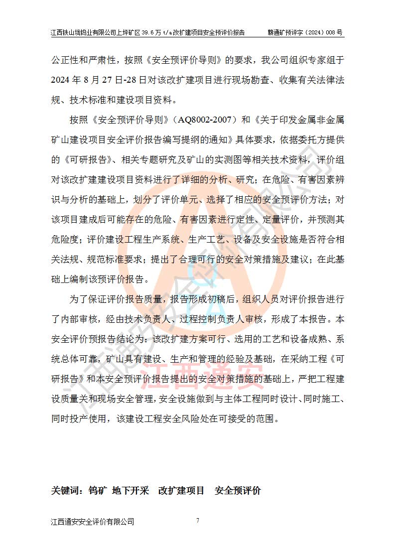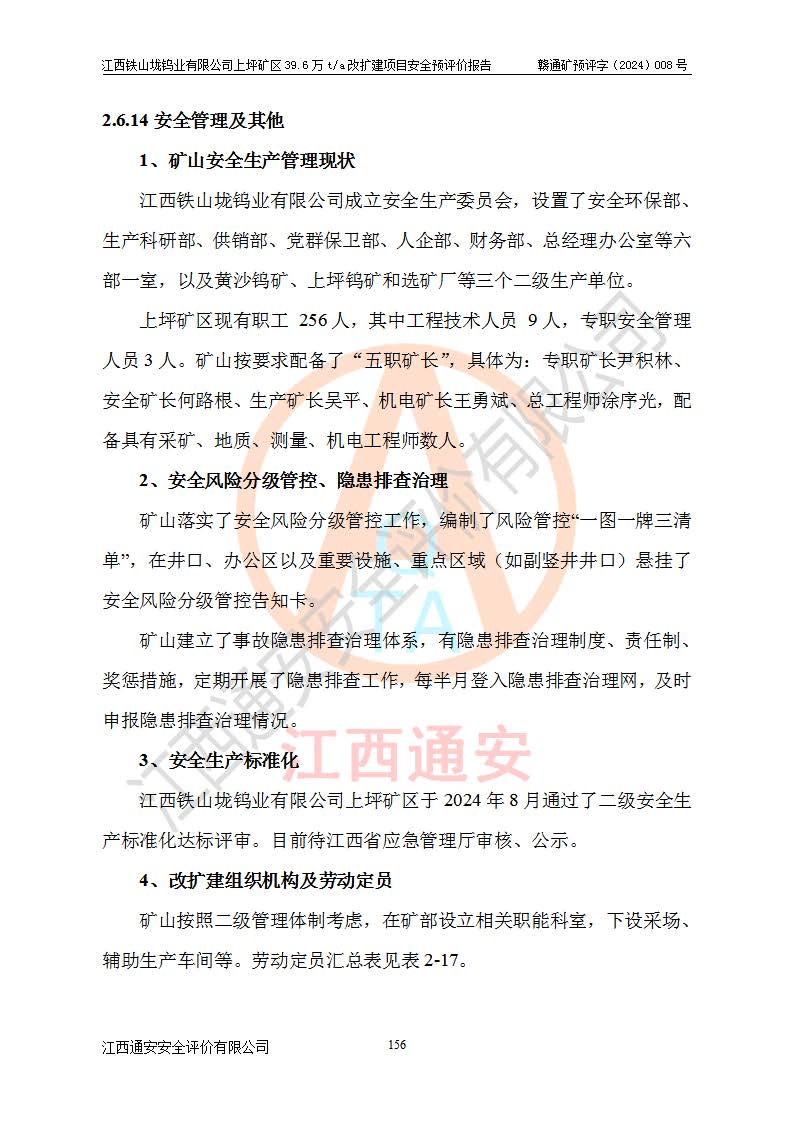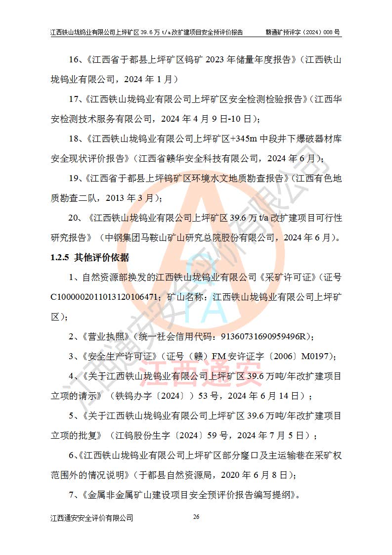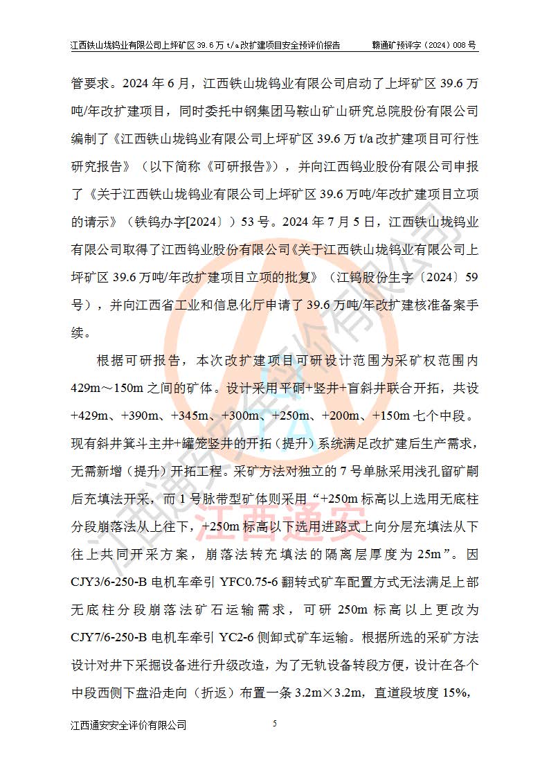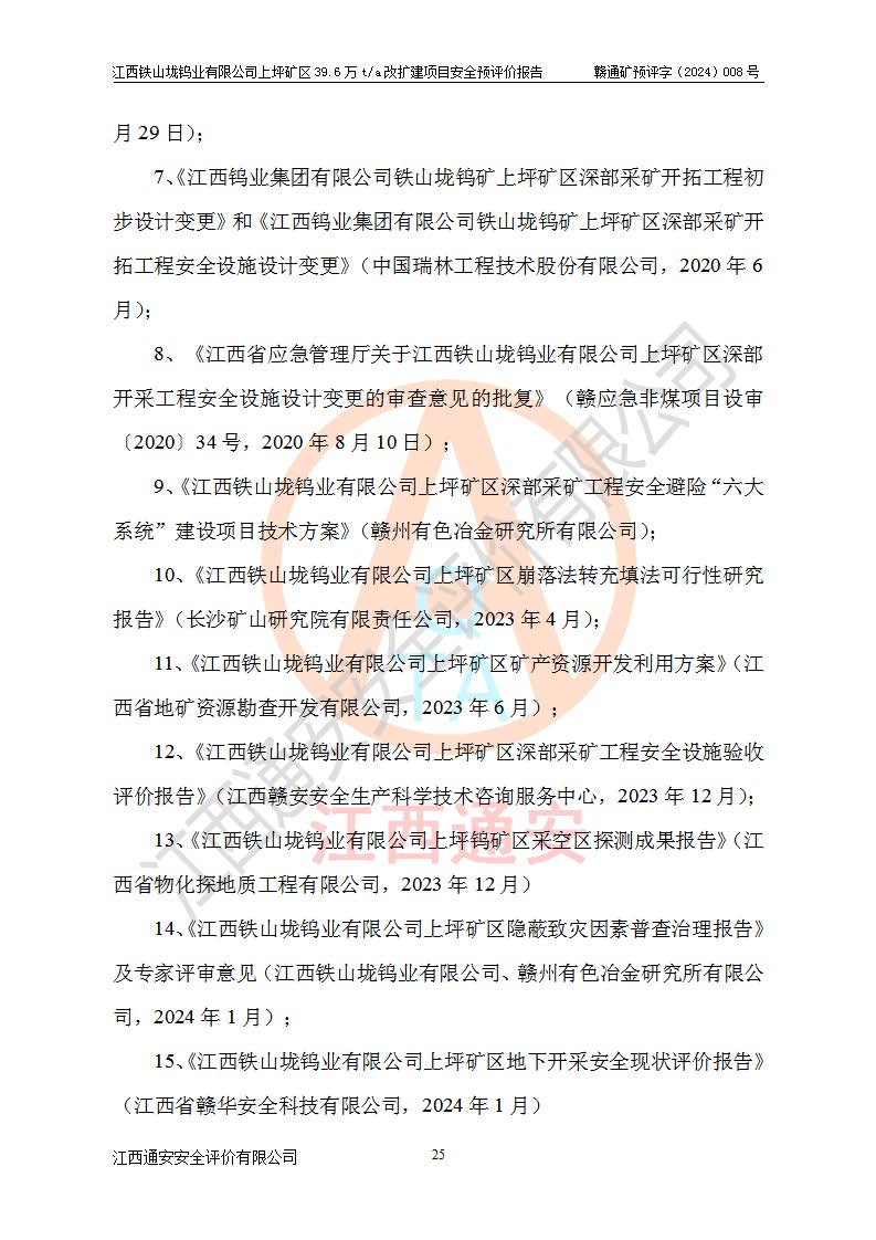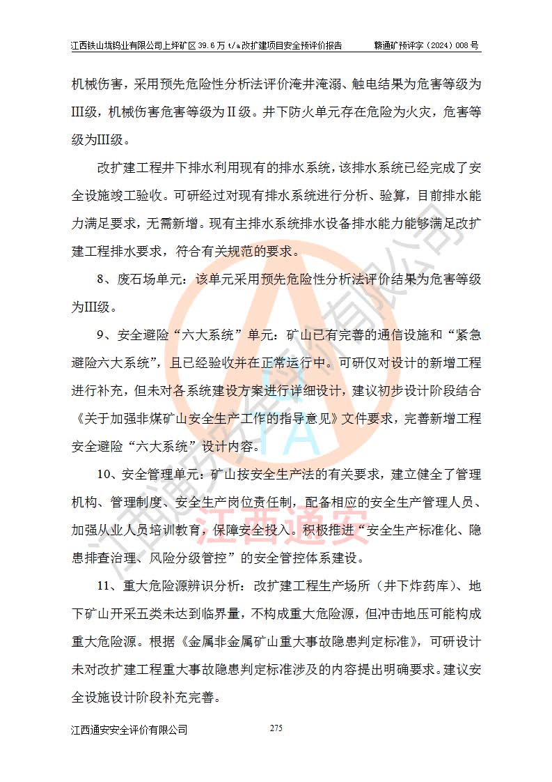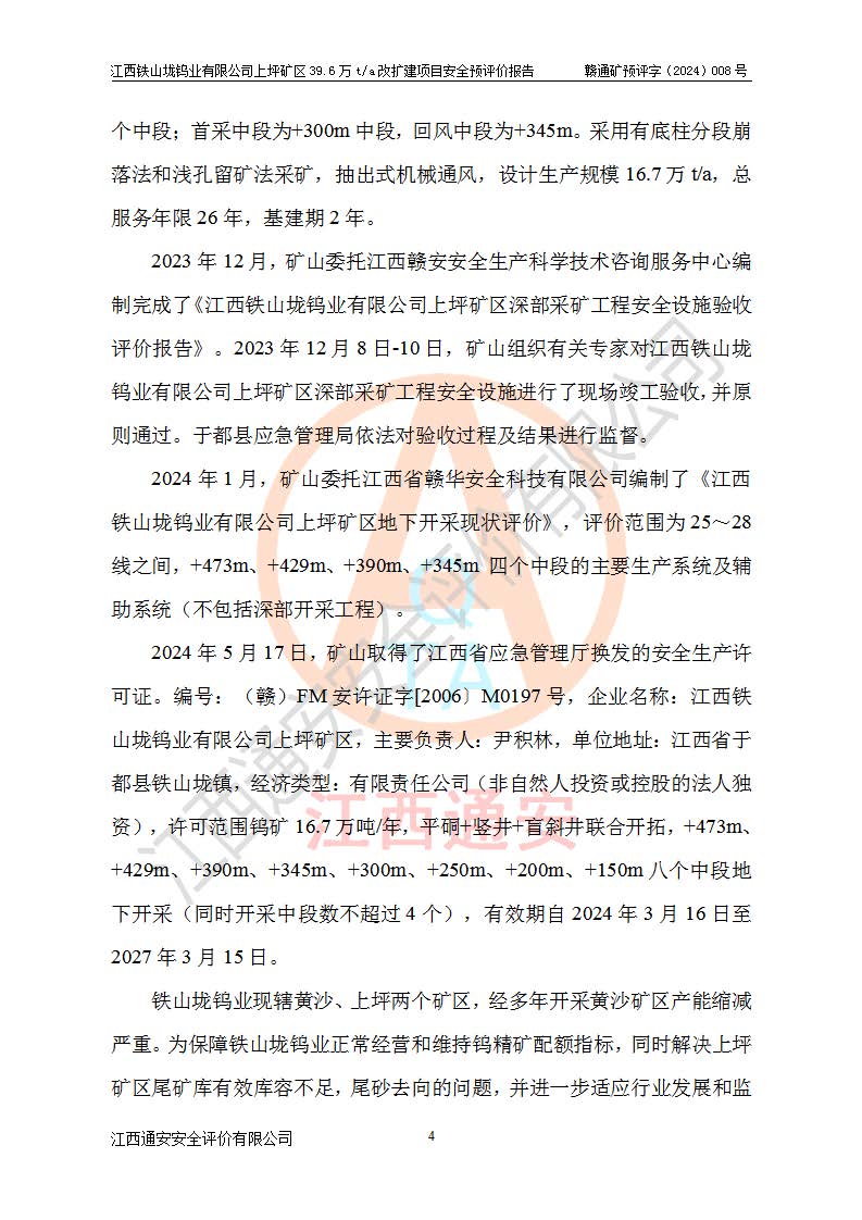 项目名称 | 江西铁山垅钨业有限公司上坪矿区39.6万t/a改扩建项目安全预评价报告 | ||||