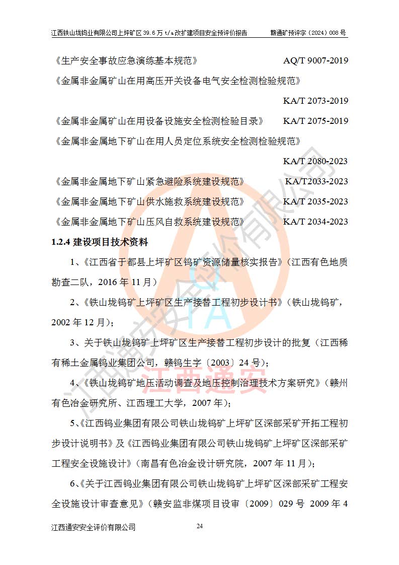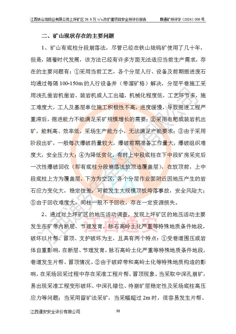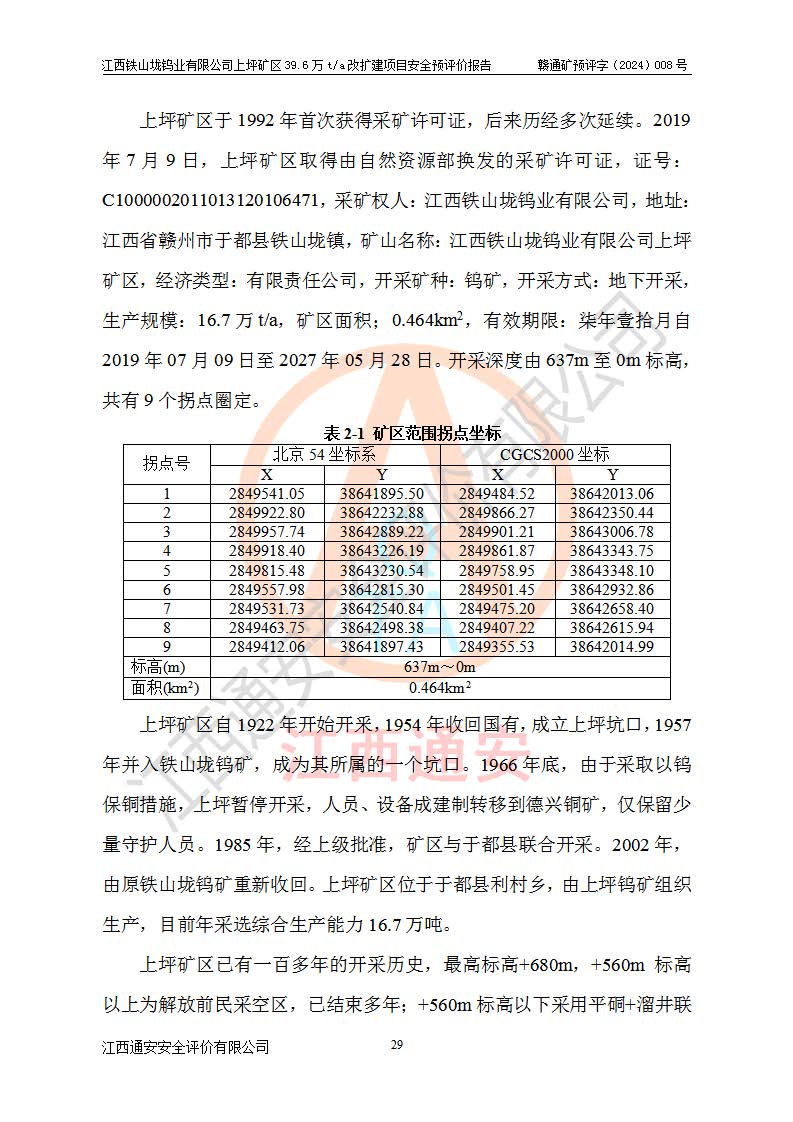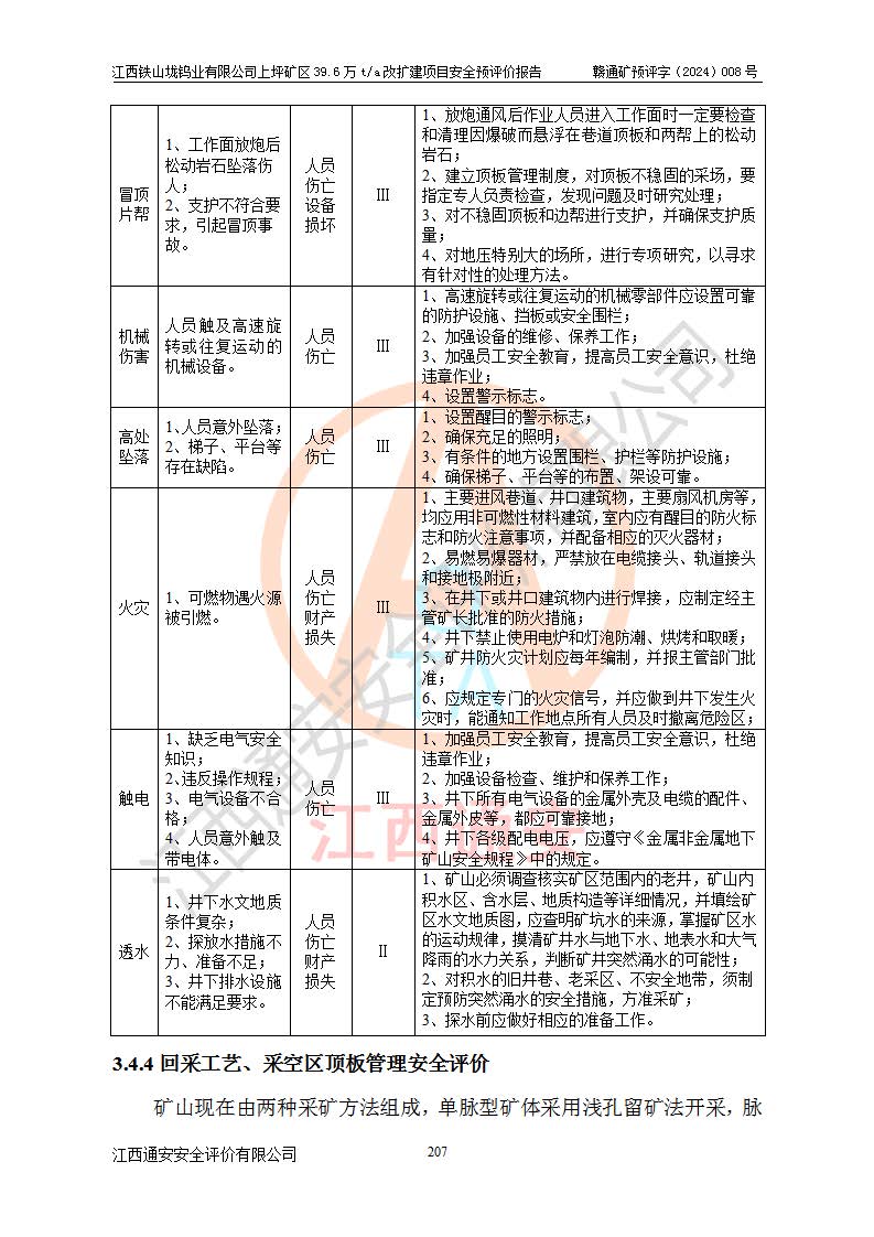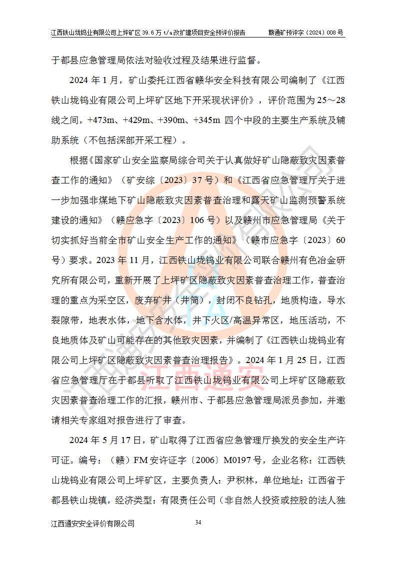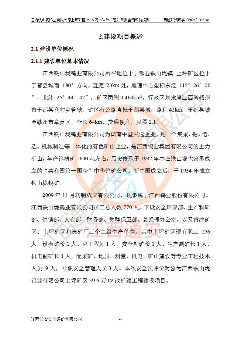 项目名称 | 江西铁山垅钨业有限公司上坪矿区39.6万t/a改扩建项目安全预评价报告 | ||||