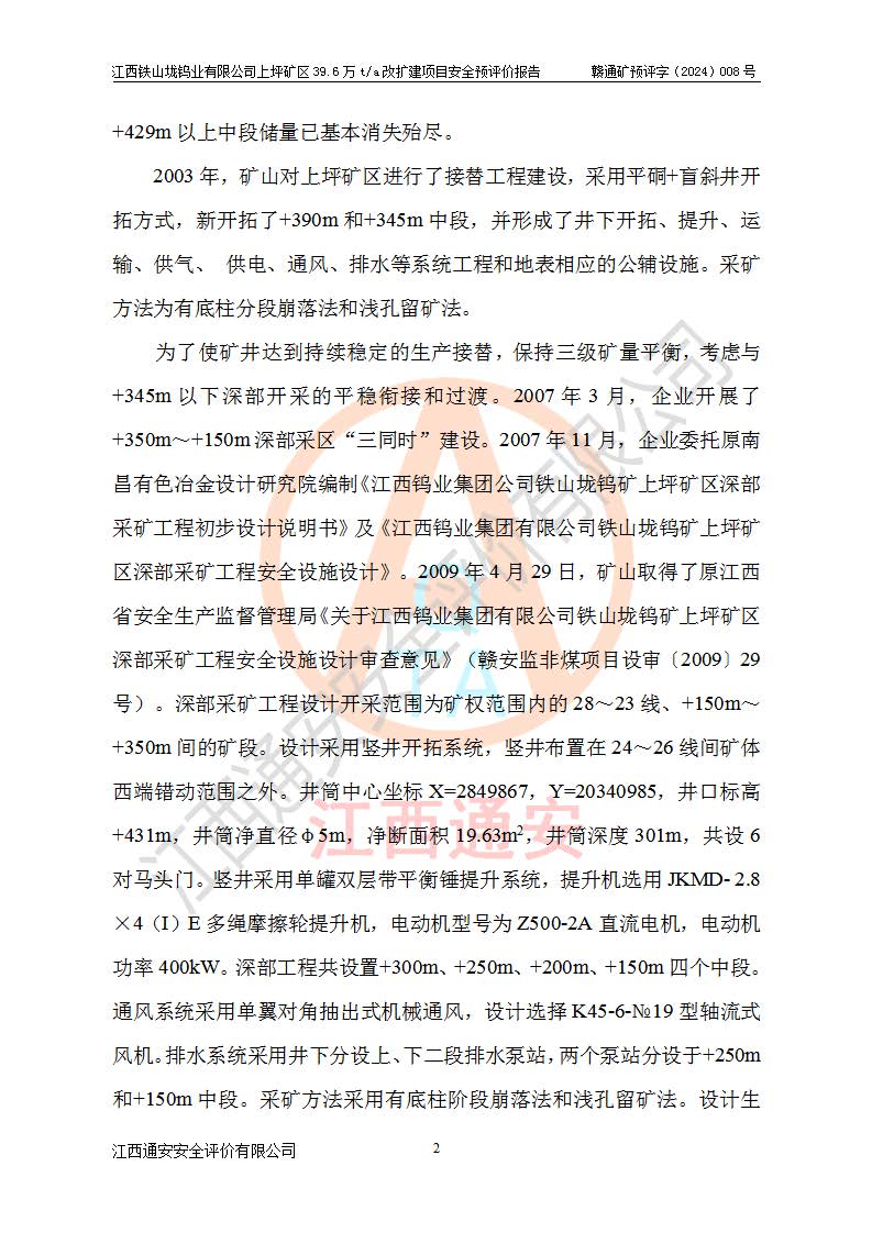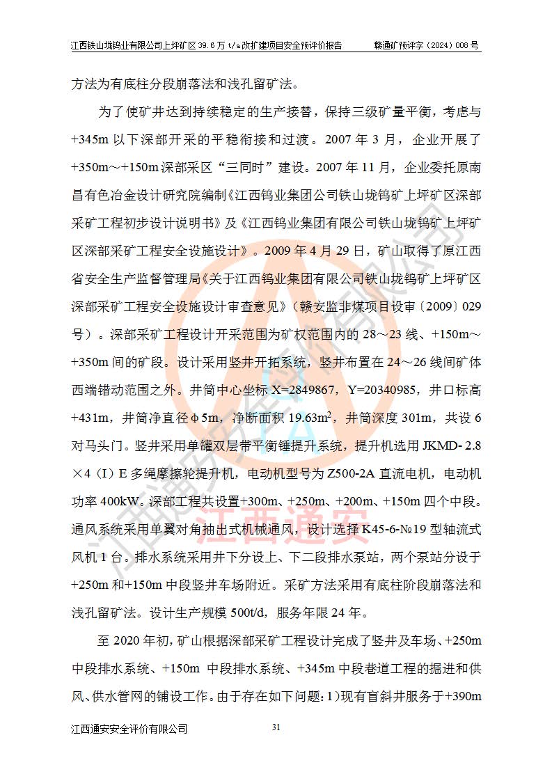 项目简介 | 江西铁山垅钨业有限公司上坪矿区位于于都县城南 180°方向,直距 23km处,地理中心坐标东经 115°26′06″,北纬 25°44′42″,矿区面积0.464km2,行政区划隶属江西省赣州市于都县利村乡管辖。 江西铁山垅钨业有限公司为国有中型采选企业,历史传承于1932年春在铁山垅大窝里成立的“共和国**国企”中华钨矿公司。新中国成立后,于1954年成立铁山垅钨矿。2009年11月转制成立有限公司,现隶属于江西钨业股份有限公司。江西铁山垅钨业有限公司员工总人数770人,下设安全**部、生产科研部、供销部、人企部、财务部、党群保卫部、总经理办公室,以及黄沙矿区、上坪矿区和选矿厂三个二级生产单位,其中上坪矿区现有职工 256人,“五职”矿长按要求设置到位,并设有安全通风组、生产技术组、设备组等职能组,并有选矿大班、采运一班和采运二班,其中工程技术人员 9人,专职安全管理人员3人。本次安全预评价对象为上坪矿区改扩建工程建设项目。 上坪矿区自1922年开始开采,1954年收回国有,成立上坪坑口,1957年并入铁山垅钨矿,成为其所属的一个坑口。1966年底,由于采取以钨保铜措施,上坪暂停开采,人员、设备成建制转移到德兴铜矿,仅保留少量守护人员。1985年,经上级批准,矿区与于都县联合开采。2002年,由原铁山垅钨矿重新收回。上坪矿区位于于都县利村乡,由上坪钨矿组织生产目前年采选综合生产能力16.7万t。 上坪矿区已有一百多年的开采历史,*高标高+680m,+560m 标高以上为解放前民采空区,已结束多年;+560m标高以下采用平硐+溜井联合开拓了+560m、+517m、+473m、+429m 多个中段。开采至2002年,+429m以上中段储量已基本消失殆尽。 2003年,矿山对上坪矿区进行了接替工程建设,采用平硐+盲斜井开拓方式,新开拓了+390m和+345m中段,并形成了井下开拓、提升、运输、供气、 供电、通风、排水等系统工程和地表相应的公辅设施。采矿方法为有底柱分段崩落法和浅孔留矿法。 为了使矿井达到持续稳定的生产接替,保持三级矿量平衡,考虑与+345m以下深部开采的平稳衔接和过渡。2007年3月,企业开展了+350m~+150m深部采区“三同时”建设。2007年11月,企业委托原南昌有色冶金设计研究院编制《江西钨业集团公司铁山垅钨矿上坪矿区深部采矿工程初步设计说明书》及《江西钨业集团有限公司铁山垅钨矿上坪矿区深部采矿工程安全设施设计》。2009年4月29日,矿山取得了原江西省安全生产监督管理局《关于江西钨业集团有限公司铁山垅钨矿上坪矿区深部采矿工程安全设施设计审查意见》(赣安监非煤项目设审〔2009〕29号)。深部采矿工程设计开采范围为矿权范围内的28~23线、+150m~+350m间的矿段。设计采用竖井开拓系统,竖井布置在24~26线间矿体西端错动范围之外。井筒中心坐标X=2849867,Y=20340985,井口标高+431m,井筒净直径φ5m,净断面积19.63m2,井筒深度301m,共设6对马头门。竖井采用单罐双层带平衡锤提升系统,提升机选用JKMD- 2.8×4(I)E多绳摩擦轮提升机,电动机型号为Z500-2A直流电机,电动机功率400kW。深部工程共设置+300m、+250m、+200m、+150m四个中段。通风系统采用单翼对角抽出式机械通风,设计选择K45-6-№19型轴流式风机。排水系统采用井下分设上、下二段排水泵站,两个泵站分设于+250m和+150m中段。采矿方法采用有底柱阶段崩落法和浅孔留矿法。设计生产规模500t/d,服务年限24年。 至2020年初,矿山根据深部采矿工程设计完成了竖井及车场、+250m中段排水系统、+150m 中段排水系统、+345m中段巷道工程的掘进和供风、供水管网的铺设工作。由于存在如下问题:1)现有盲斜井服务于+390m和+345m中段,随着开采深度的加深,该两条盲斜井位于深部开采错动范围内;且盲箕斗斜井已运行多年,设施陈旧,加之未设置专门的粉矿回收设施,导致其运行不顺畅。2)设计的罐笼竖井目前已建成,但由于地表卸载系统和现场管理存在问题,导致罐笼提升系统无法达到其提升能力。3)原通风设计采用单翼对角式系统,新鲜风流从竖井及平硐口进入各中段,污风经新设计的东翼回风井排出地表,但因地形及矿权范围等诸多因素限制,设计的回风井目前未进行施工。现状为中段新鲜风从竖井或平硐口经盲斜井进入各中段,污风通过矿体下盘的回风井和+429m 回风平硐排出地表。2020年4月,矿山委托设计单位对原初步设计进行变更,结合矿山现状,主要对矿山开拓系统、通风系统进行设计变更,同时对井下其他系统进行补充完善。 2020年6月3日,江西省应急管理厅组织有关专家对中国瑞林工程技术股份有限公司编制的《江西钨业集团有限公司铁山垅钨矿上坪矿区深部采矿开拓工程安全设施设计变更》进行了审查,并原则通过。2020年8月10日,矿山取得了江西省应急管理厅《关于江西铁山垅钨业有限公司上坪矿区深部开采工程安全设施设计变更的审查意见》的批复(赣应急非煤项目设审〔2020〕34号)。变更设计范围为:采矿许可证范围内标高+150m至+350m之间的矿体。该矿采用地下开采,开拓方式变更为平硐+竖井+盲斜井开拓。设置有+345m、+300m、+250m、+200m、+150m 五个中段;首采中段为+300m中段,回风中段为+345m。采用有底柱分段崩落法和浅孔留矿法采矿,抽出式机械通风,设计生产规模16.7万t/a,总服务年限26年,基建期2年。 2023年12月,矿山委托江西赣安安全生产科学技术咨询服务中心编制完成了《江西铁山垅钨业有限公司上坪矿区深