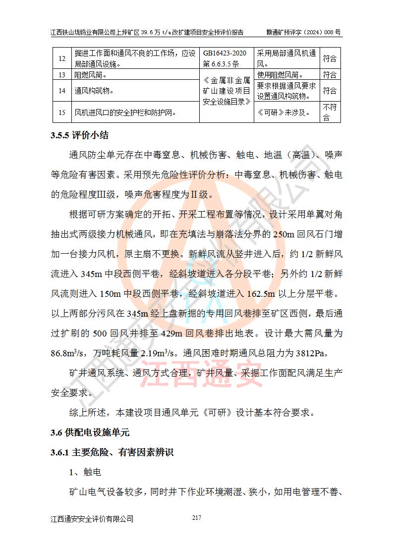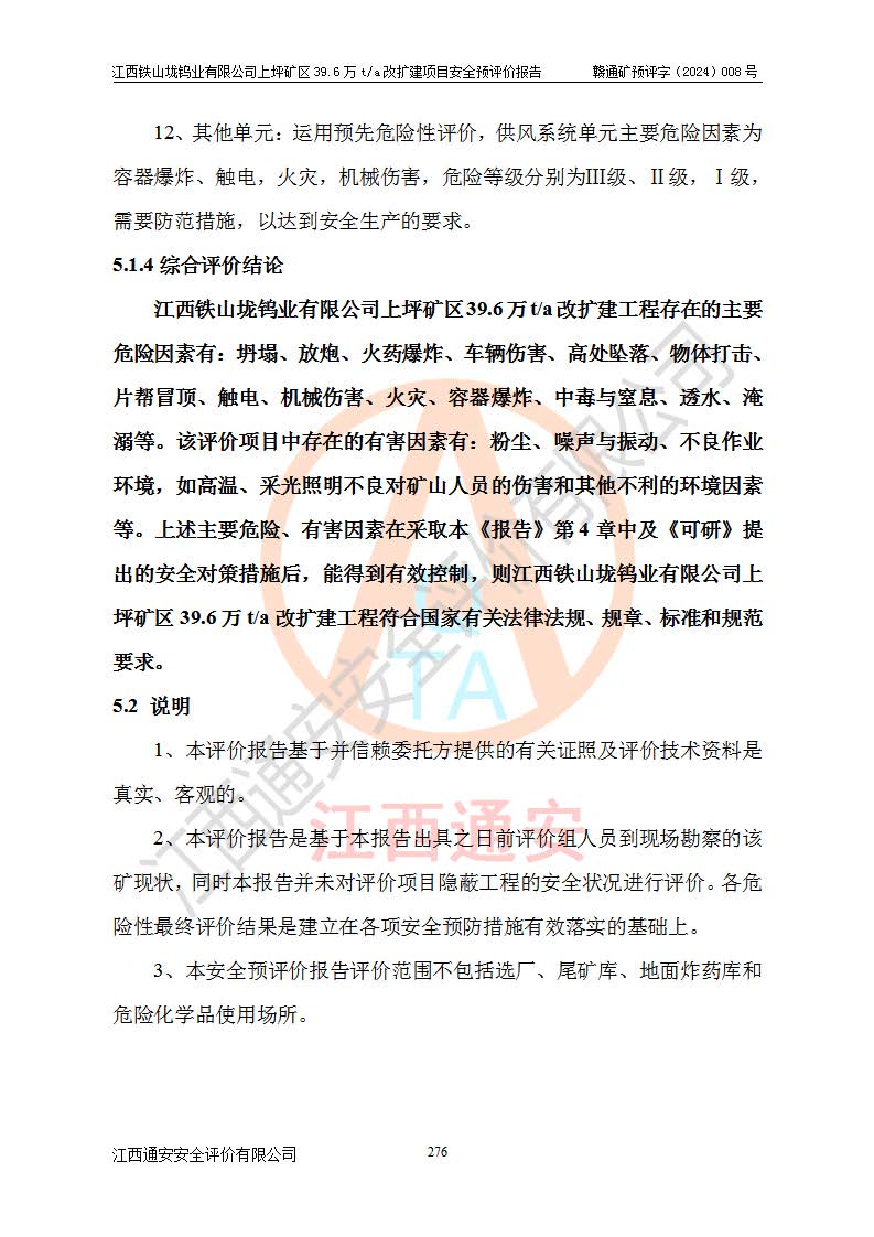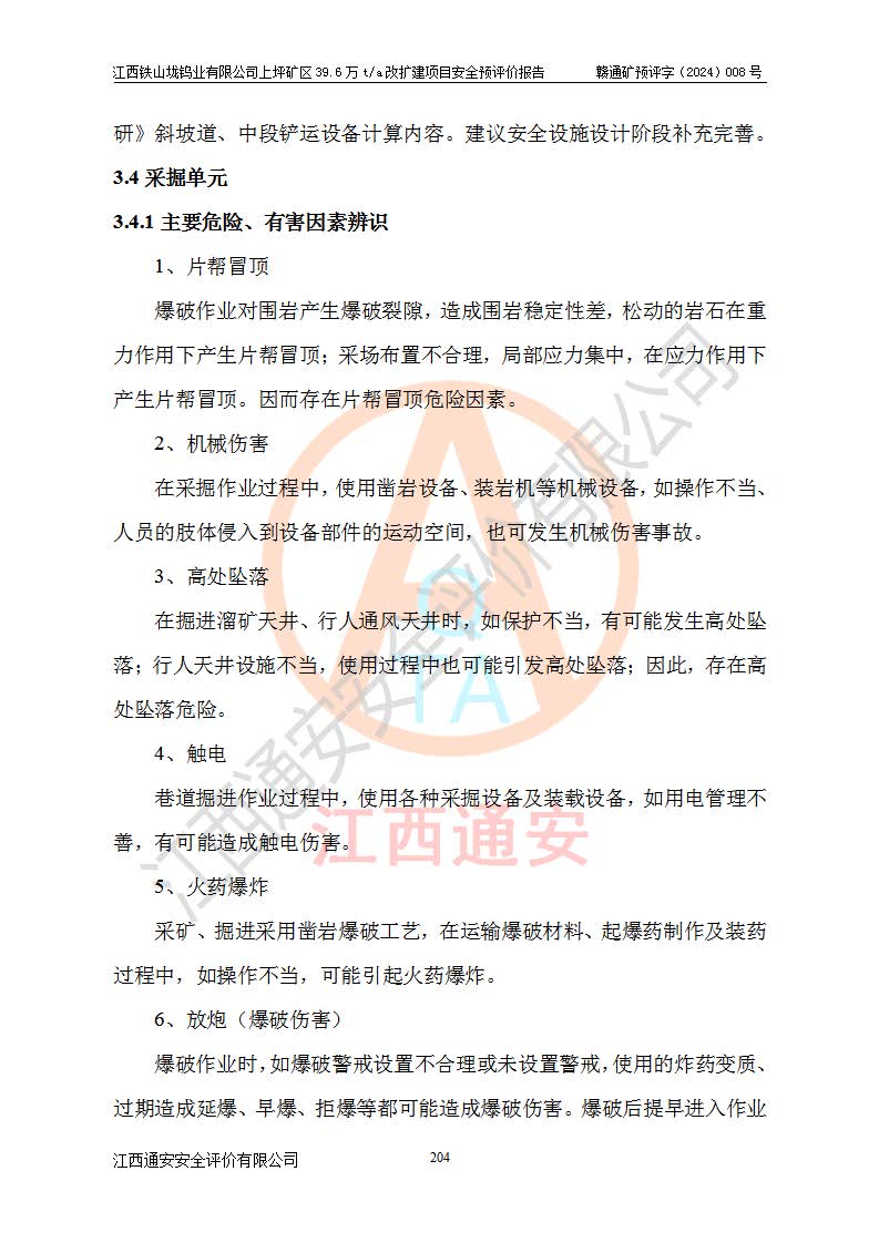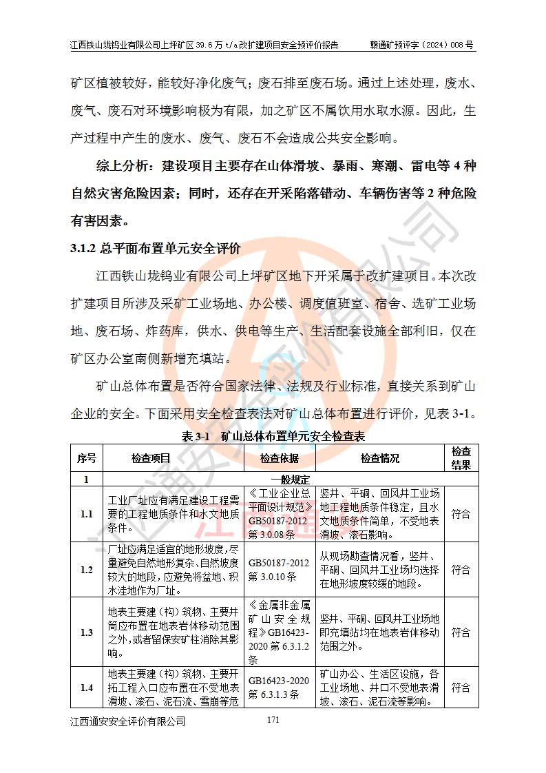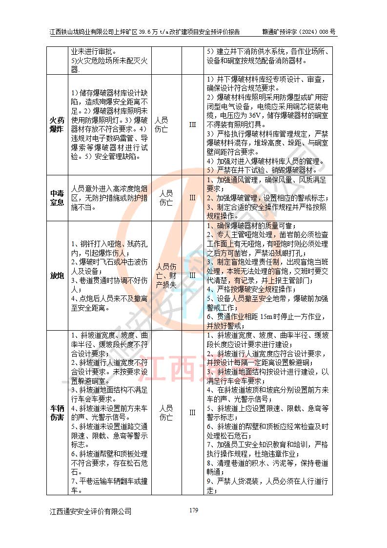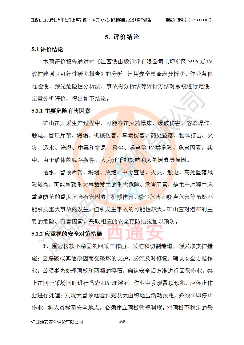 其它 | 江西铁山垅钨业有限公司上坪矿区39.6万t/a改扩建工程存在的主要危险因素有:坍塌、放炮、火药爆炸、**伤害、高处坠落、物体打击、片帮冒顶、触电、机械伤害、火灾、容器爆炸、中毒与窒息、透水、淹溺等。该评价项目中存在的有害因素有:粉尘、噪声与振动、不良作业环境,如高温、采光照明不良对矿山人员的伤害和其他不利的环境因素等。上述主要危险、有害因素在采取本《报告》第4章中及《可研》提出的安全对策措施后,能得到**控制,则江西铁山垅钨业有限公司上坪矿区39.6万t/a改扩建工程符合**有关法律法规、规章、标准和规范要求。 | ||||