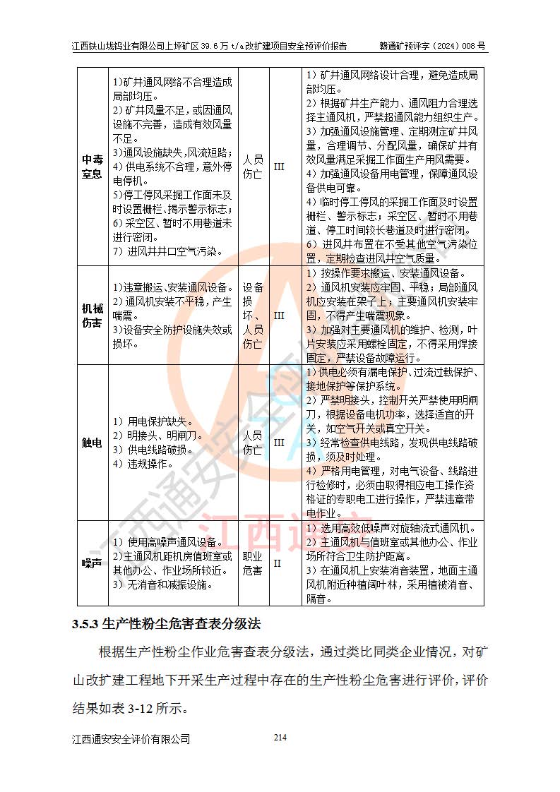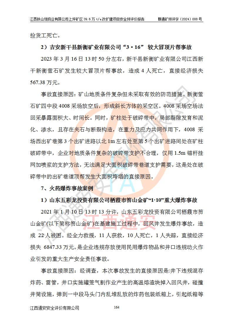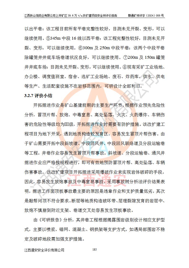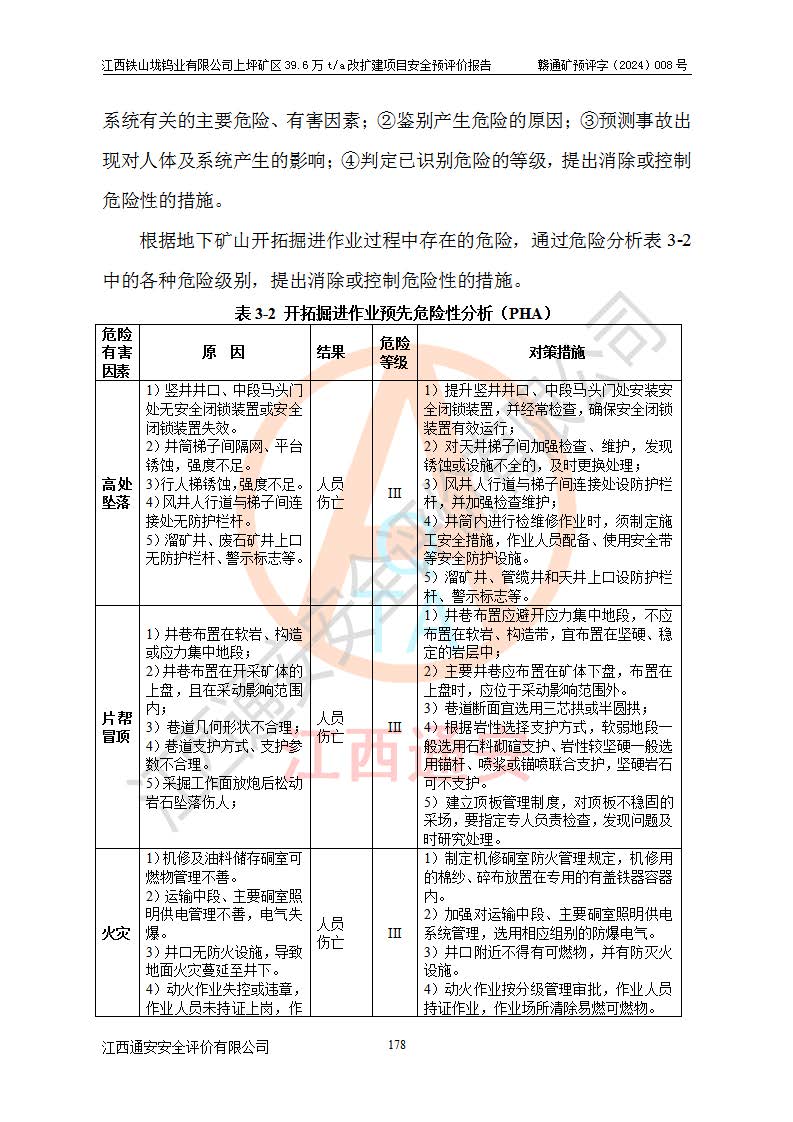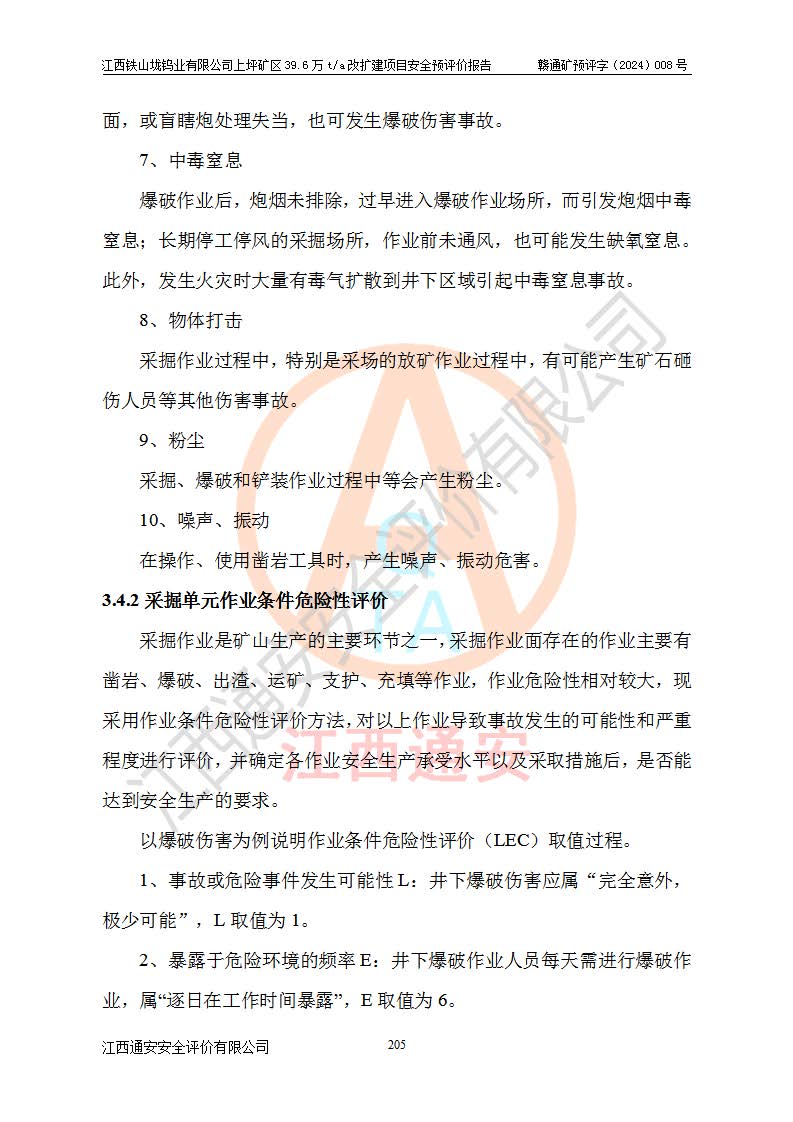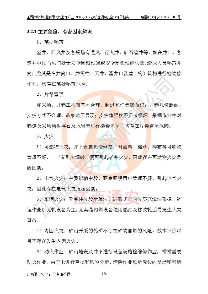 其它 | 江西铁山垅钨业有限公司上坪矿区39.6万t/a改扩建工程存在的主要危险因素有:坍塌、放炮、火药爆炸、**伤害、高处坠落、物体打击、片帮冒顶、触电、机械伤害、火灾、容器爆炸、中毒与窒息、透水、淹溺等。该评价项目中存在的有害因素有:粉尘、噪声与振动、不良作业环境,如高温、采光照明不良对矿山人员的伤害和其他不利的环境因素等。上述主要危险、有害因素在采取本《报告》第4章中及《可研》提出的安全对策措施后,能得到**控制,则江西铁山垅钨业有限公司上坪矿区39.6万t/a改扩建工程符合**有关法律法规、规章、标准和规范要求。 | ||||