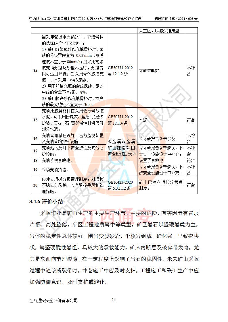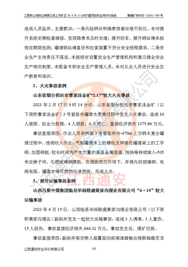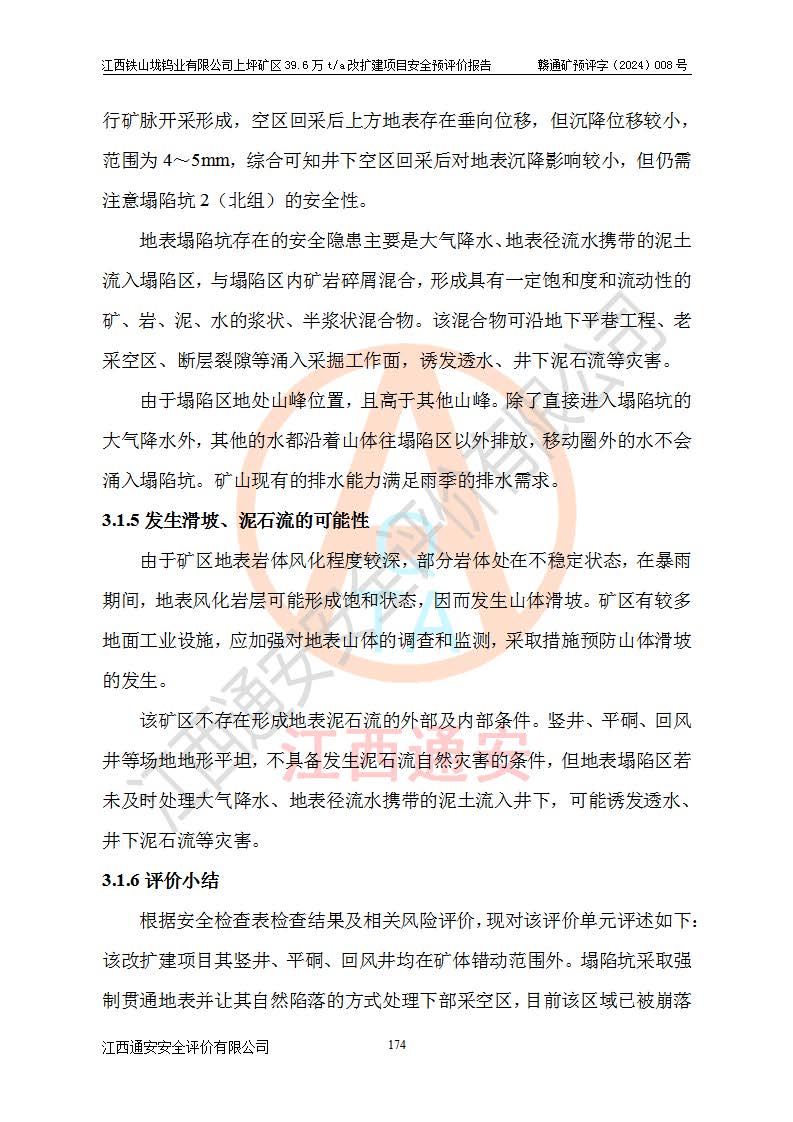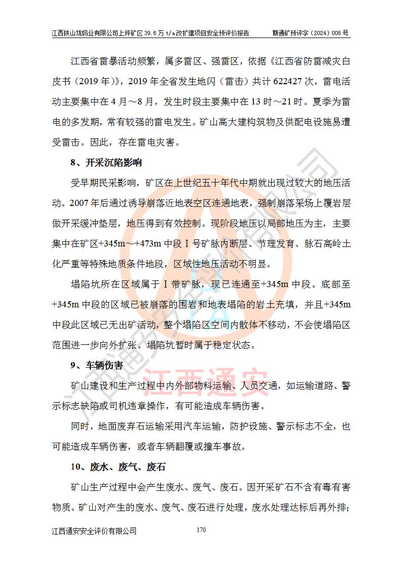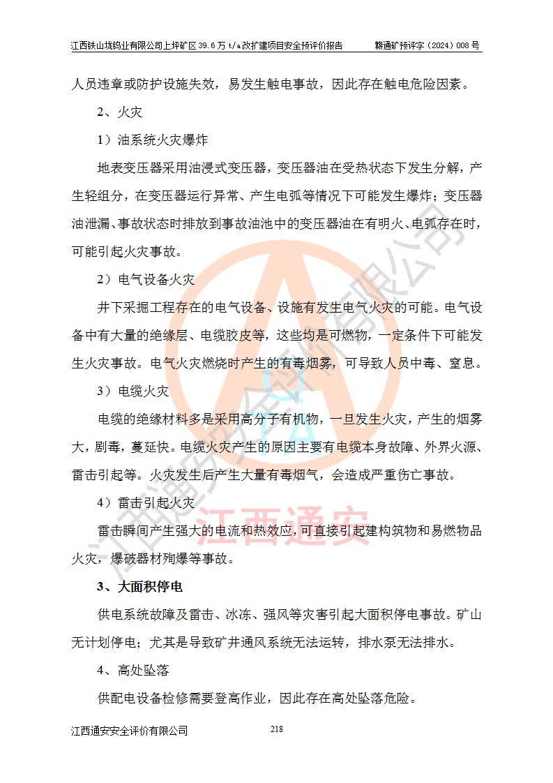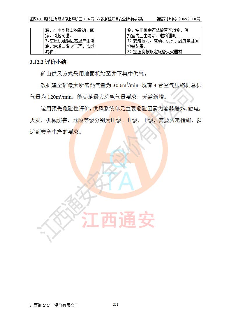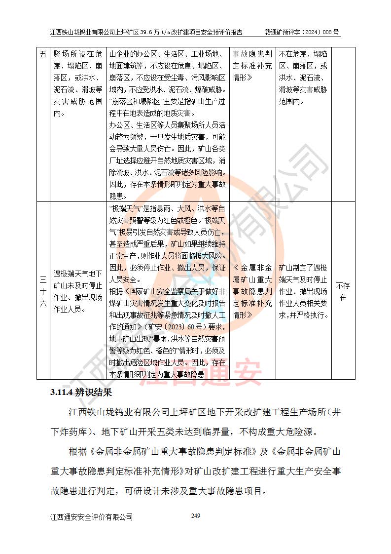其它 | 江西铁山垅钨业有限公司上坪矿区39.6万t/a改扩建工程存在的主要危险因素有:坍塌、放炮、火药爆炸、**伤害、高处坠落、物体打击、片帮冒顶、触电、机械伤害、火灾、容器爆炸、中毒与窒息、透水、淹溺等。该评价项目中存在的有害因素有:粉尘、噪声与振动、不良作业环境,如高温、采光照明不良对矿山人员的伤害和其他不利的环境因素等。上述主要危险、有害因素在采取本《报告》第4章中及《可研》提出的安全对策措施后,能得到**控制,则江西铁山垅钨业有限公司上坪矿区39.6万t/a改扩建工程符合**有关法律法规、规章、标准和规范要求。 | ||||