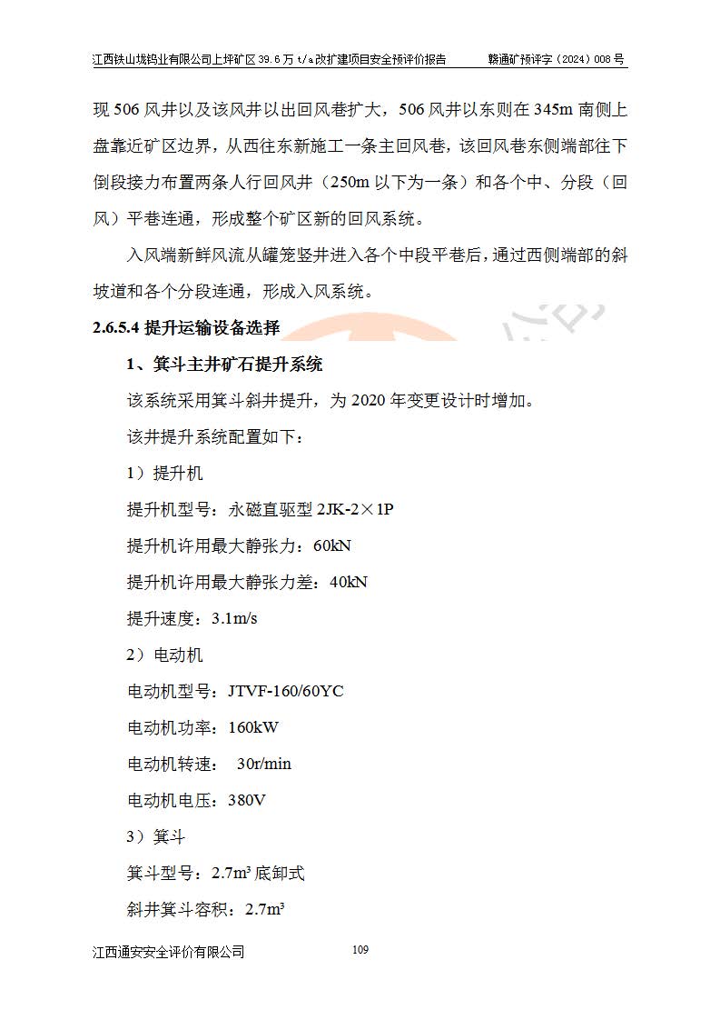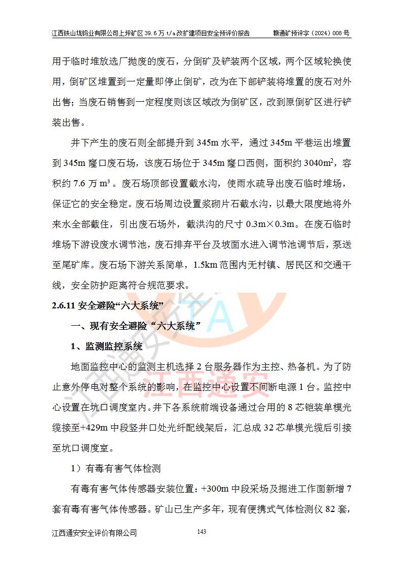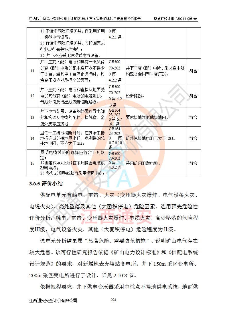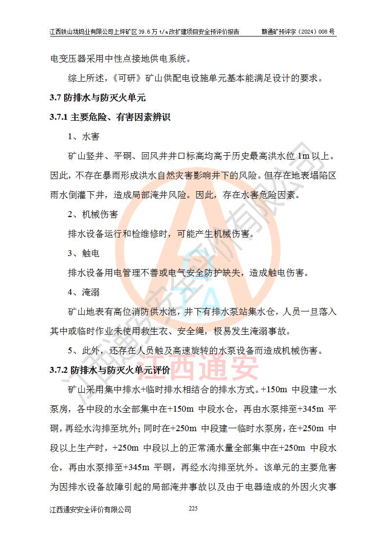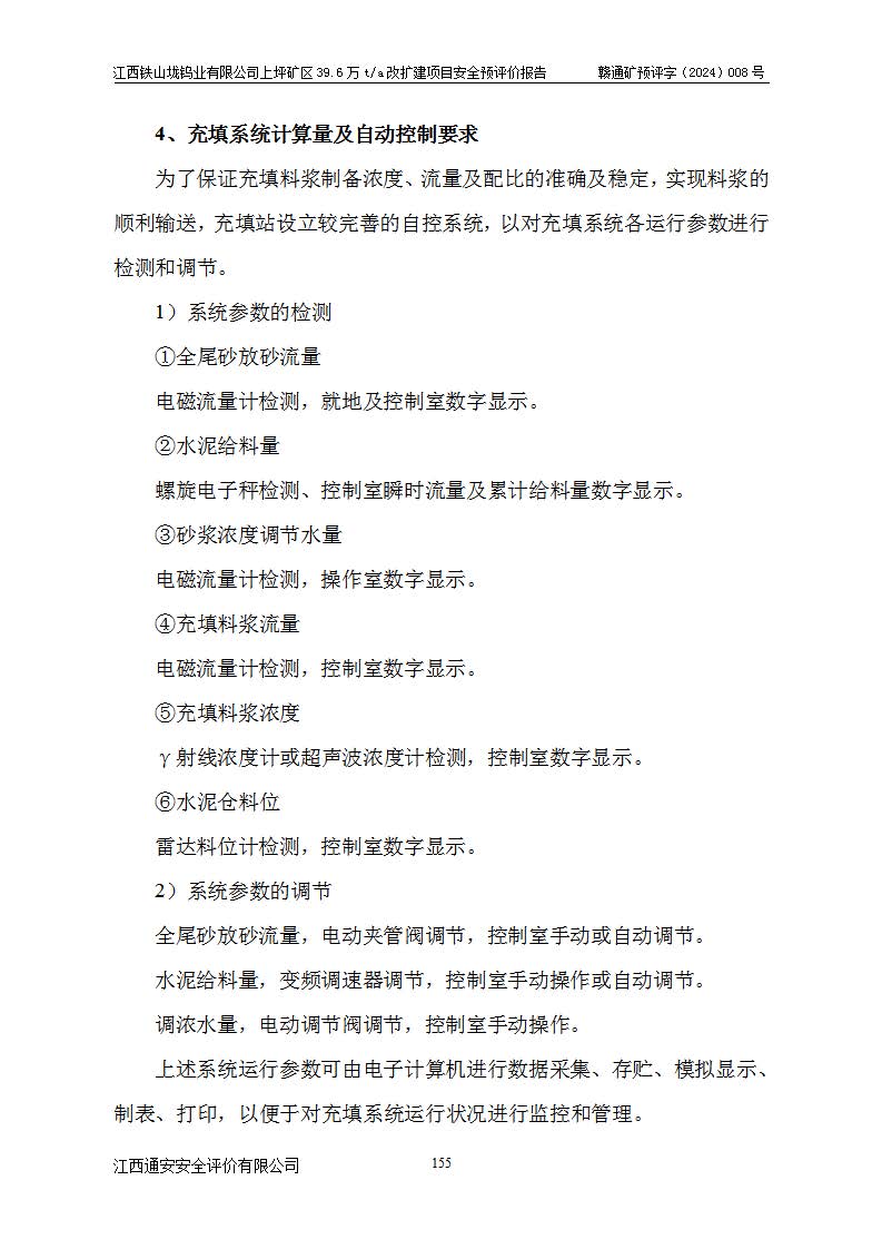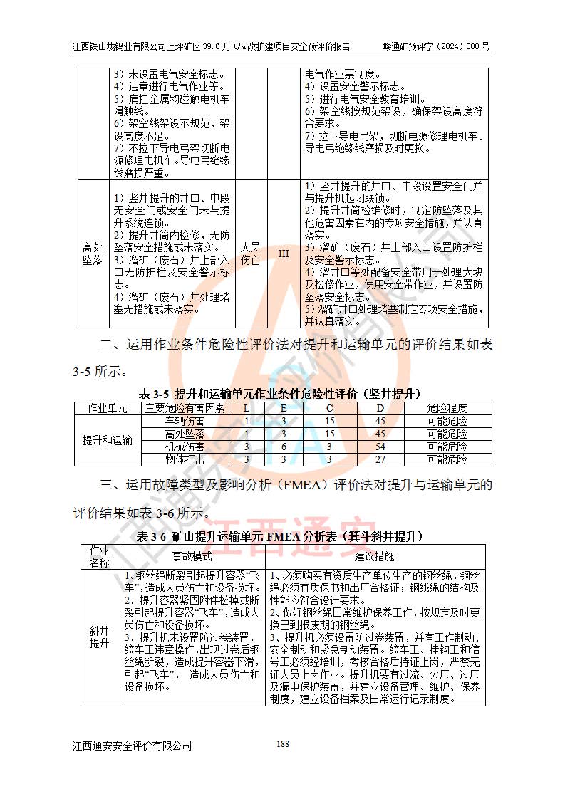 其它 | 江西铁山垅钨业有限公司上坪矿区39.6万t/a改扩建工程存在的主要危险因素有:坍塌、放炮、火药爆炸、**伤害、高处坠落、物体打击、片帮冒顶、触电、机械伤害、火灾、容器爆炸、中毒与窒息、透水、淹溺等。该评价项目中存在的有害因素有:粉尘、噪声与振动、不良作业环境,如高温、采光照明不良对矿山人员的伤害和其他不利的环境因素等。上述主要危险、有害因素在采取本《报告》第4章中及《可研》提出的安全对策措施后,能得到**控制,则江西铁山垅钨业有限公司上坪矿区39.6万t/a改扩建工程符合**有关法律法规、规章、标准和规范要求。 | ||||